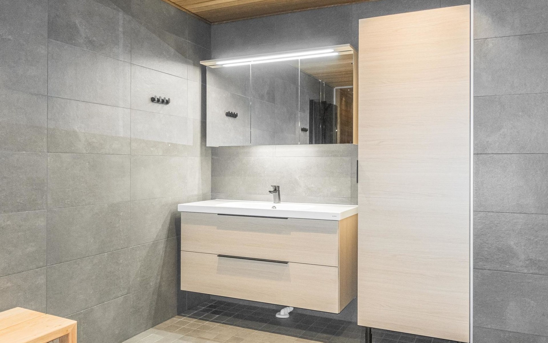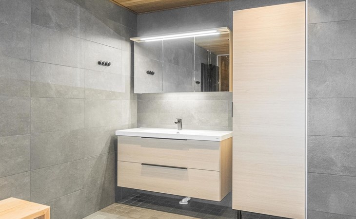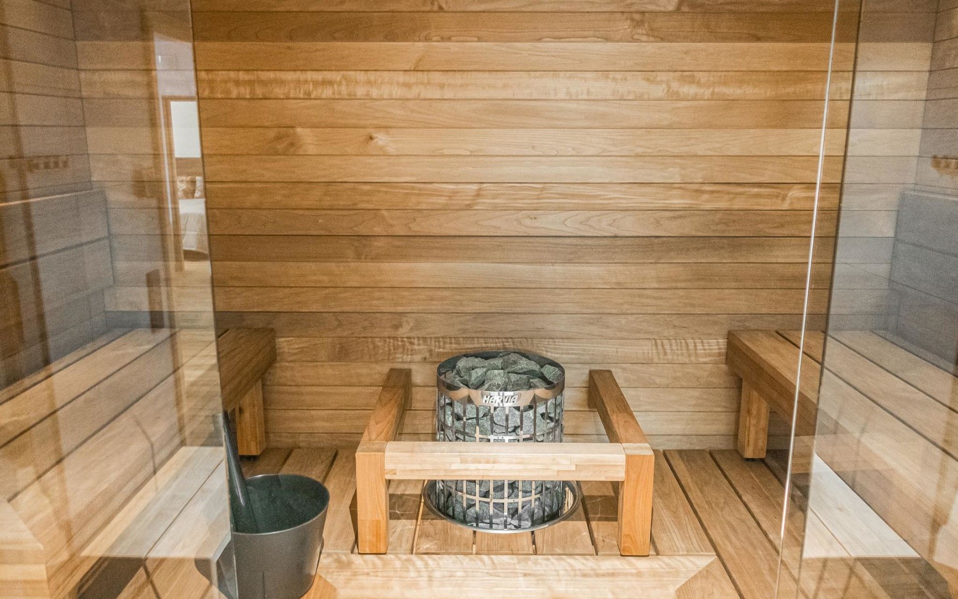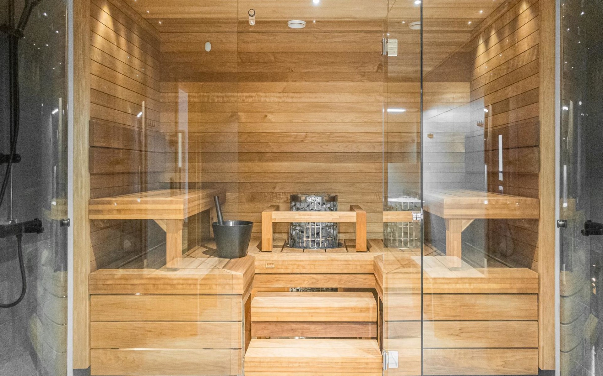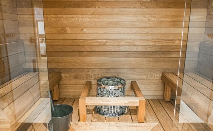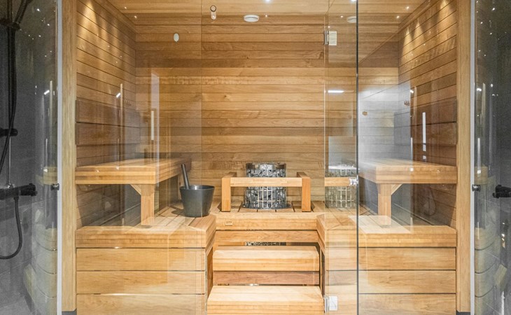 The spacious bathroom with cooling benches and a large sauna creates an opportunity for relaxation and pampering after an active day.