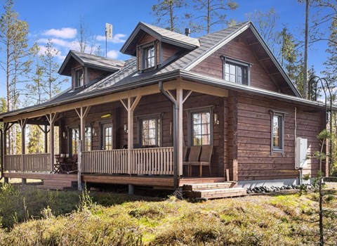The living area and open-plan kitchen are cozy, with the atmosphere enhanced by a fireplace. The kitchen is well-equipped, and the dining table can be extended. The upstairs living area includes a workstation, so remote work is possible. The bathroom and sauna provide a great space for relaxation.