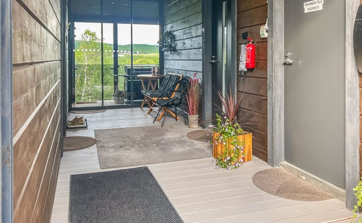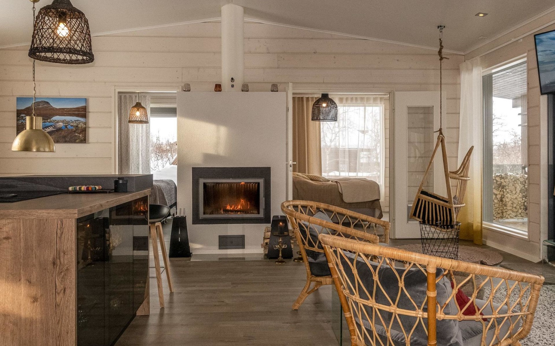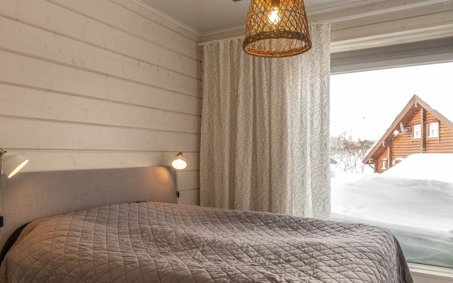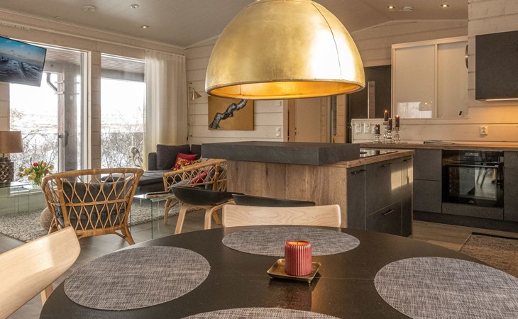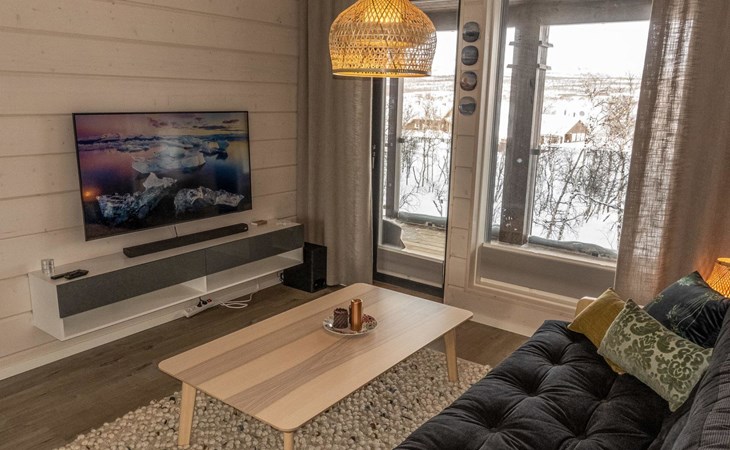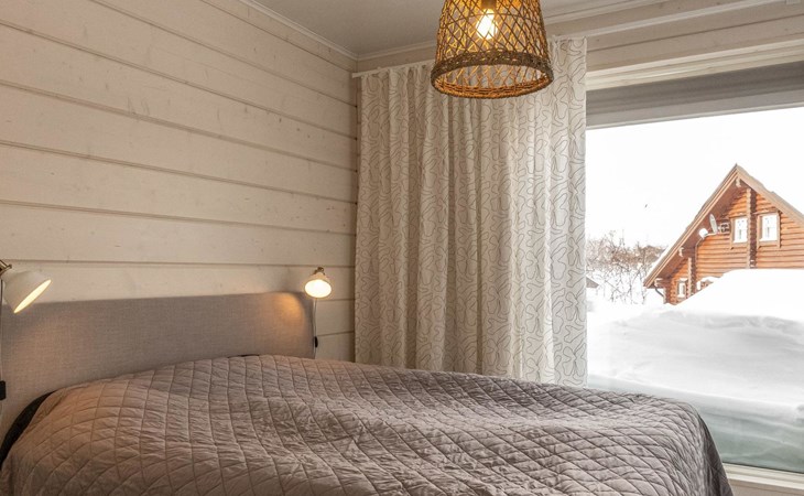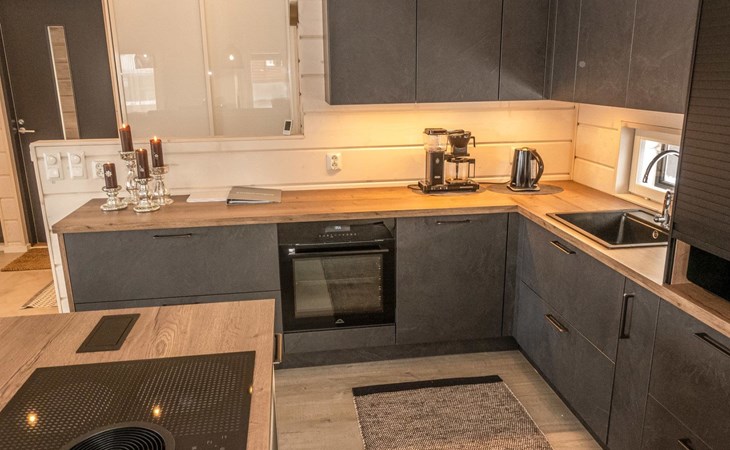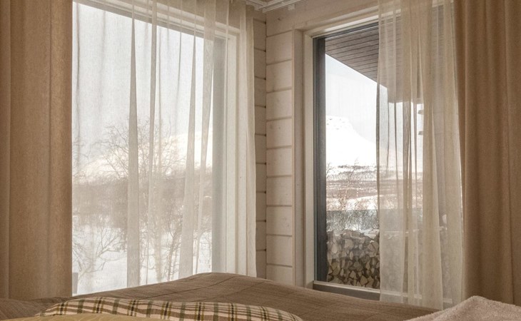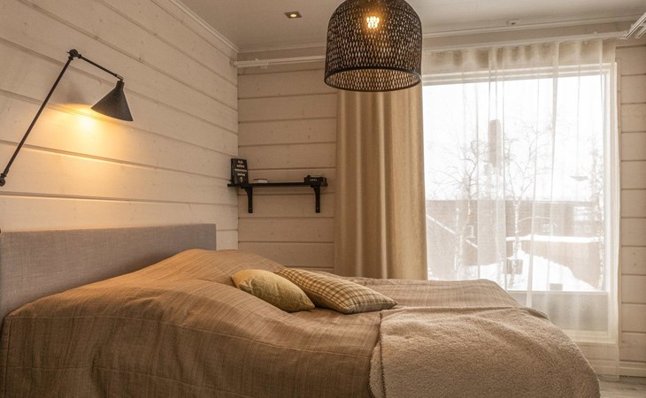 Thermal log villa, built in 2022. Large and bright living room / kitchen, 200 cm wide motorized double bed in the bedroom, view of the fell Saanatunturi from the bedroom, 160 cm wide double bed in the another bedroom. Separate WC with shower, utility room.