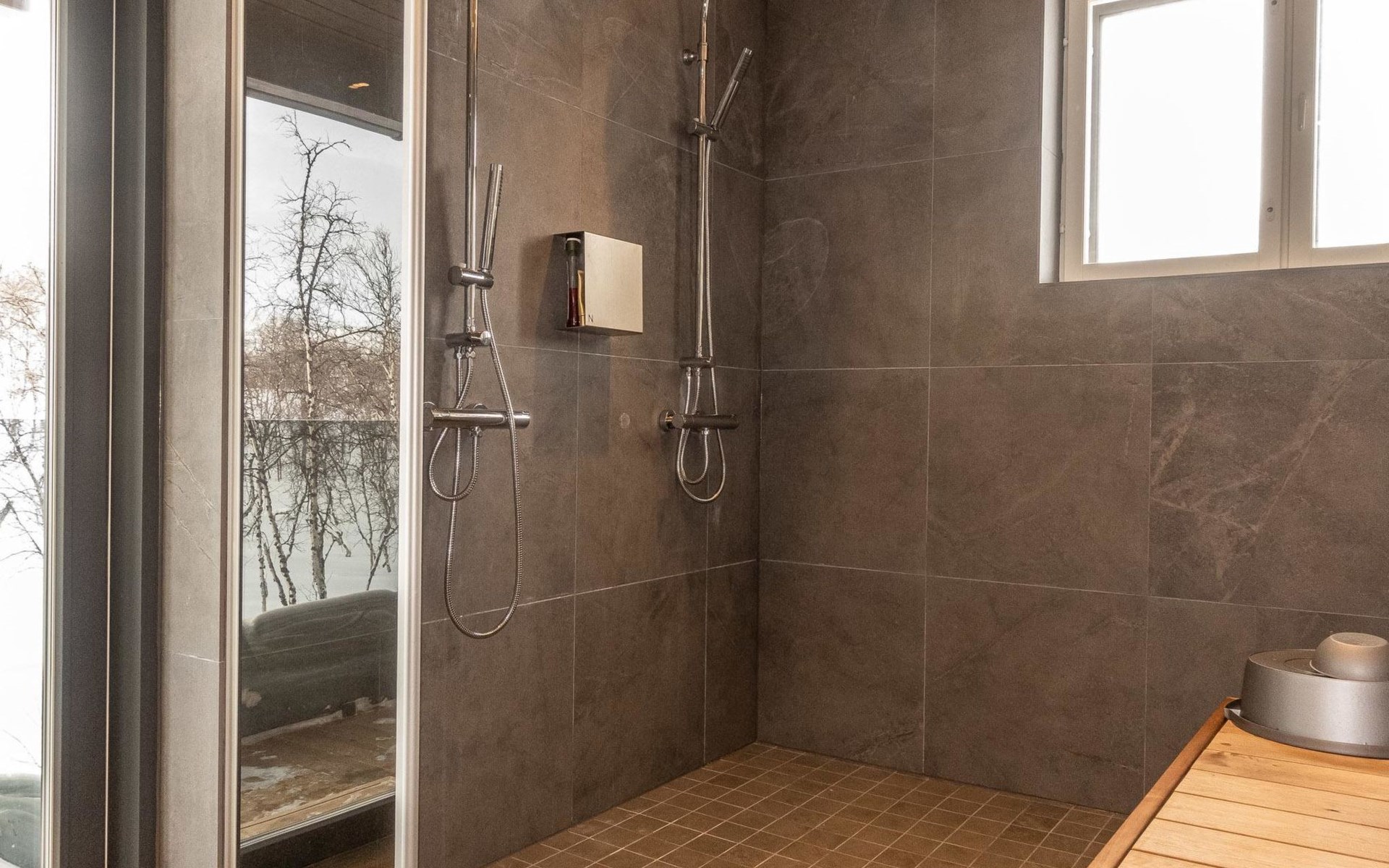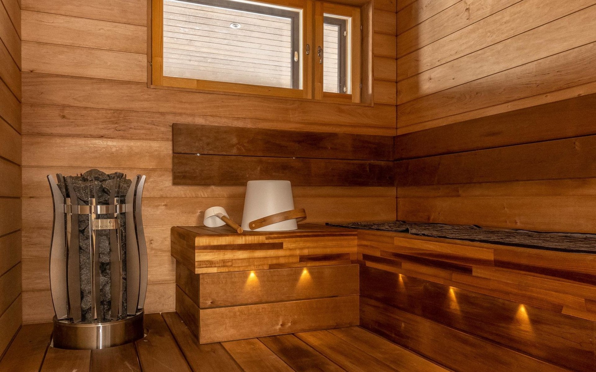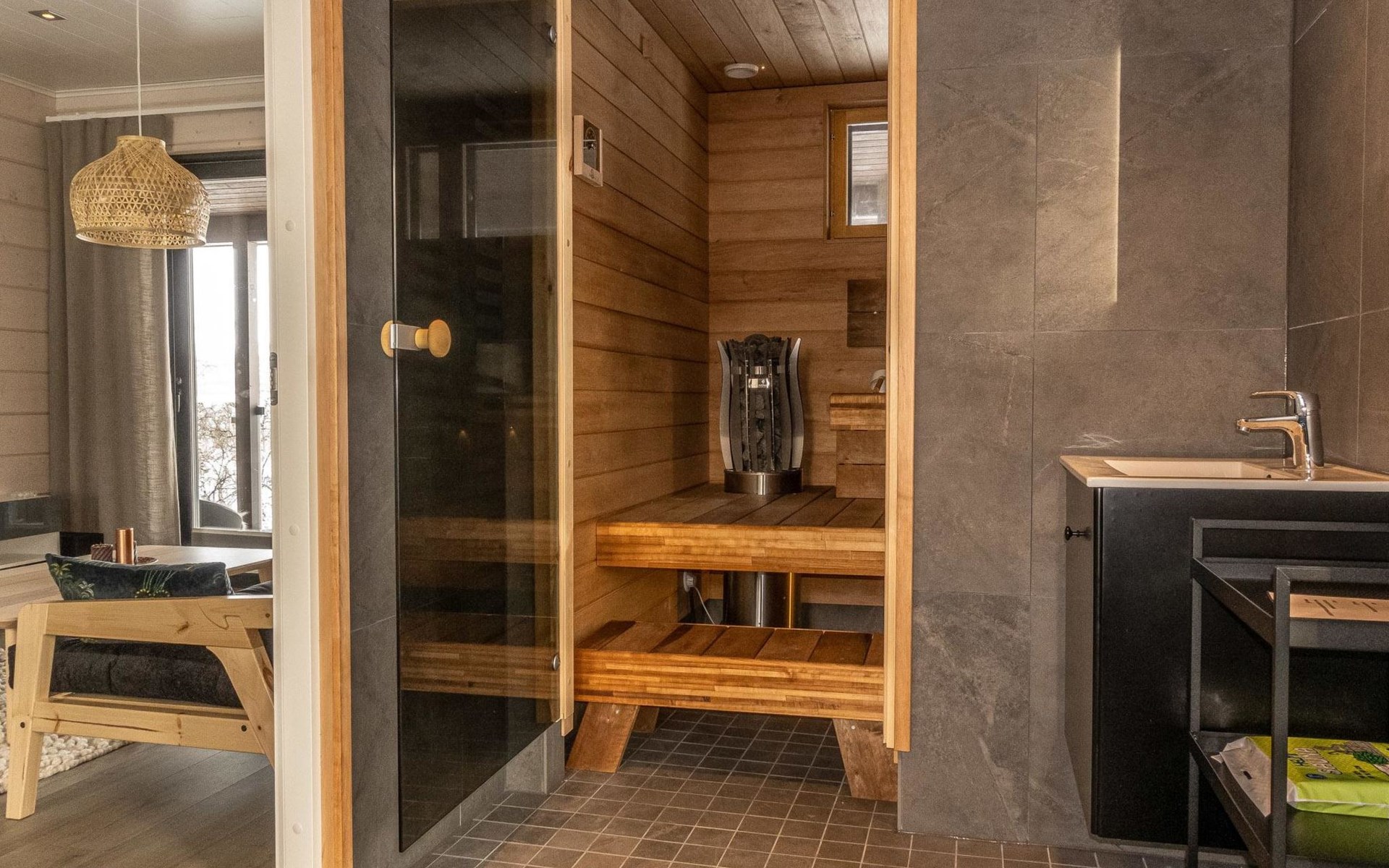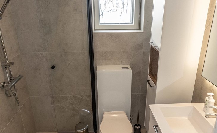 Sauna compartment with sauna room, washroom, living area and WC. In the living area there is sofa bed and smart TV 55", two showers in the washroom. Access to the sauna compartment is from a covered terrace.