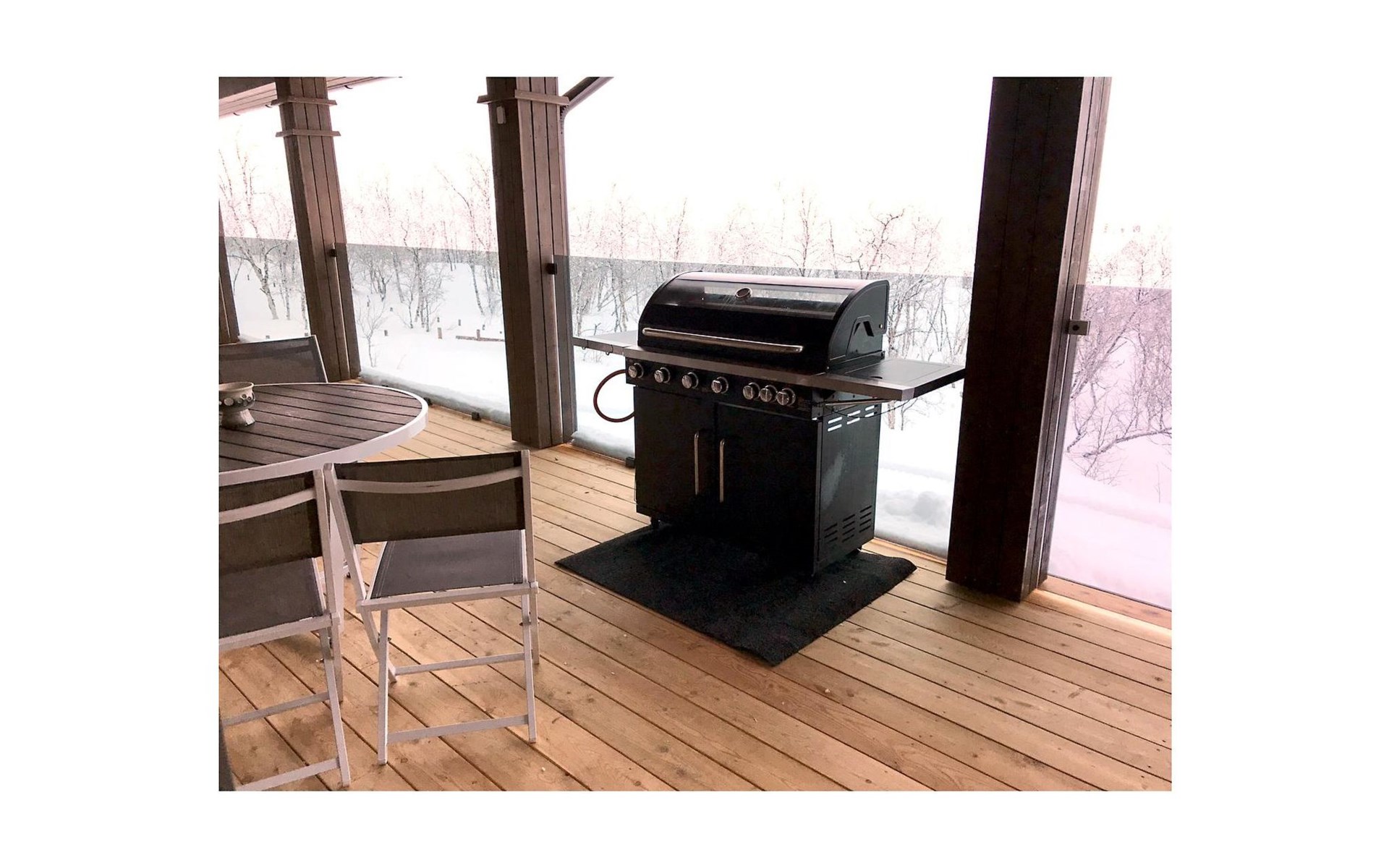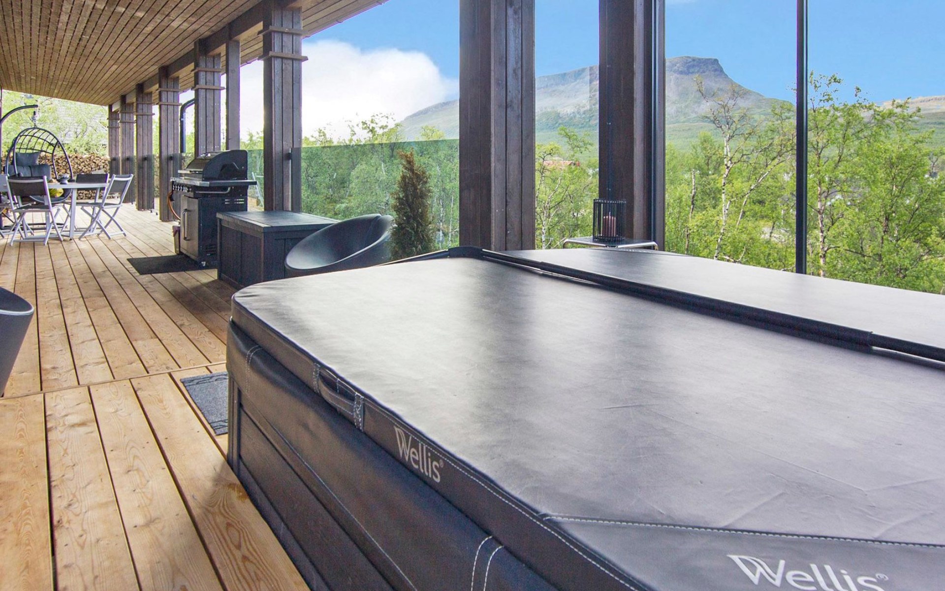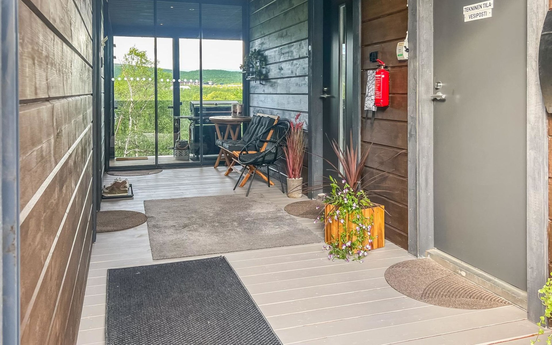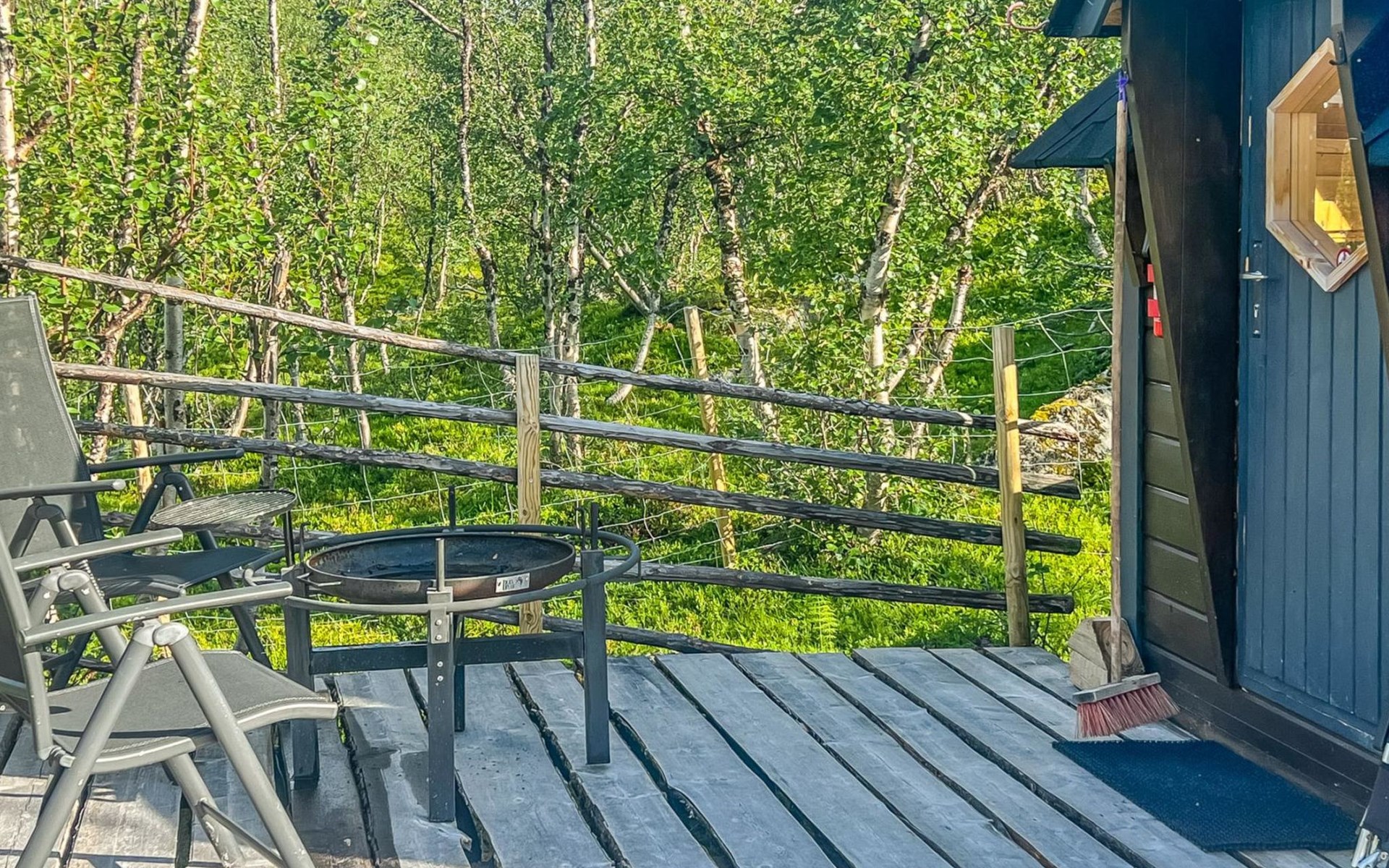 Sauna compartment with sauna room, washroom, living area and WC. In the living area there is sofa bed and smart TV 55", two showers in the washroom. Access to the sauna compartment is from a covered terrace.
