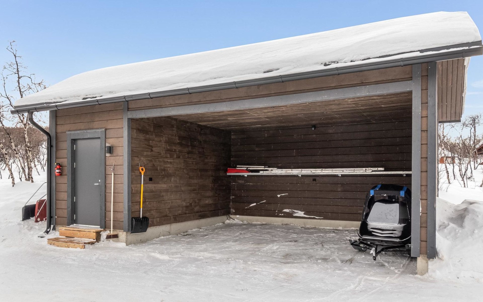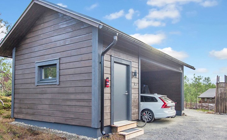Car shelter for two cars and storage. Barbeque hut with window in the roof.