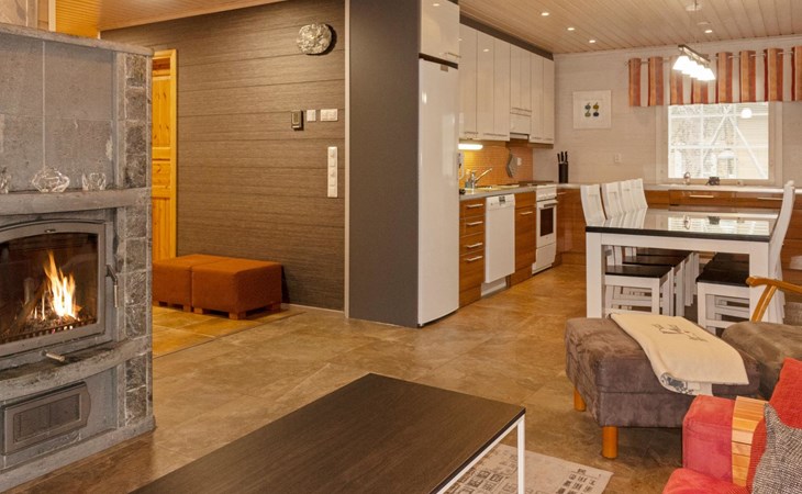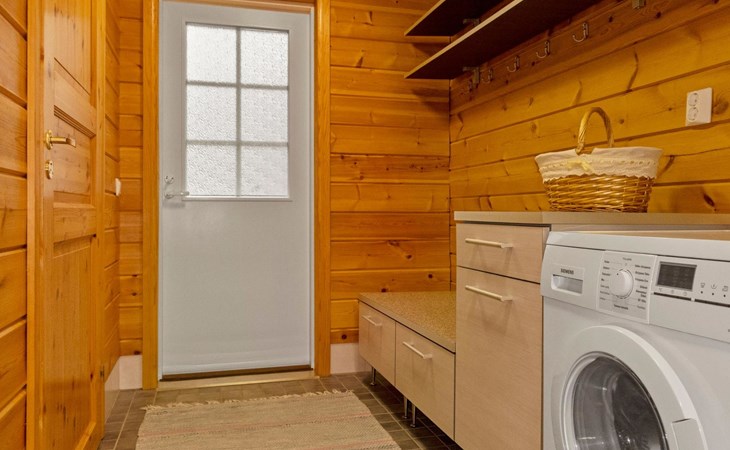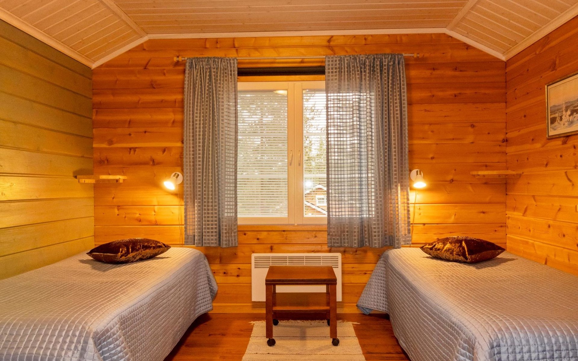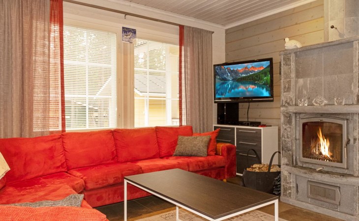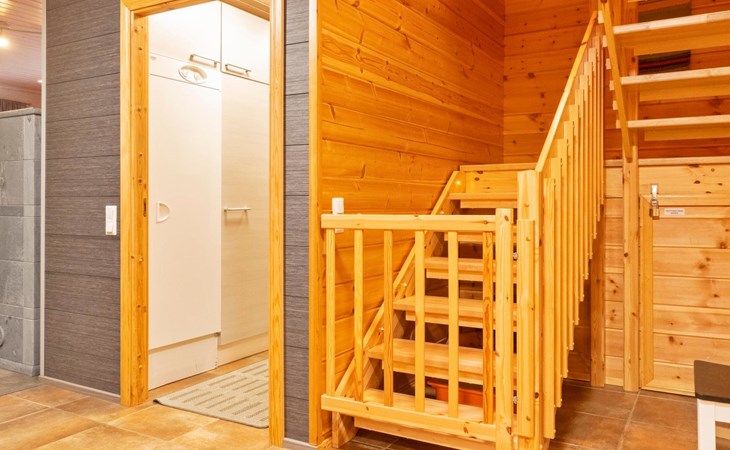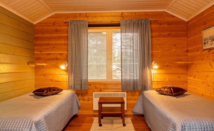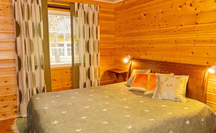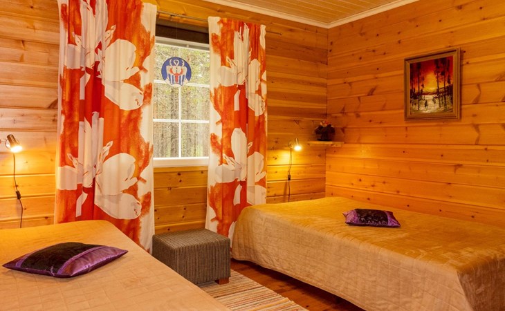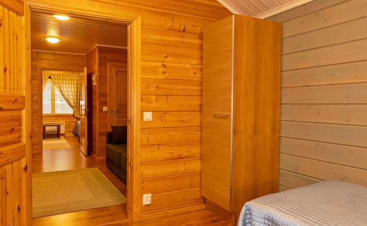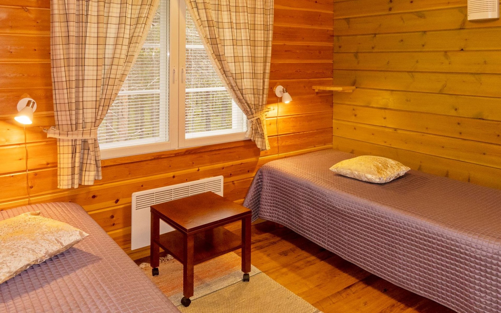 Log cabin on two floors, built in 2007. Ground floor: living room/kitchen, bedroom with double bed, second bedroom with two single beds (width of one of them 120 cm ), electric sauna, washroom 2 showers, dressing room / utility room, downstairs 2 separate toilets, third toilet upstairs, open porch. Upstairs: 2 bedrooms, each with 2 single beds, convertible sofa in the lounge area, toilet. In addition, two drop-down matresses.