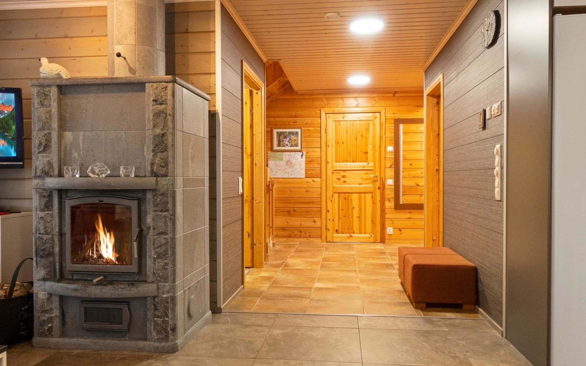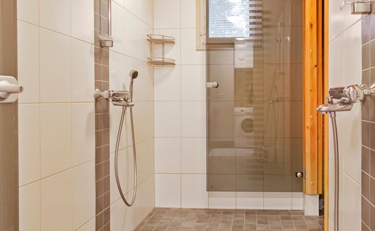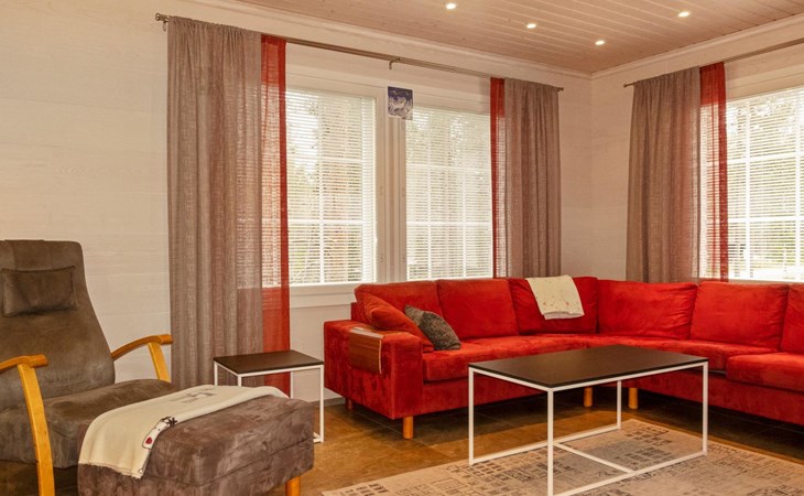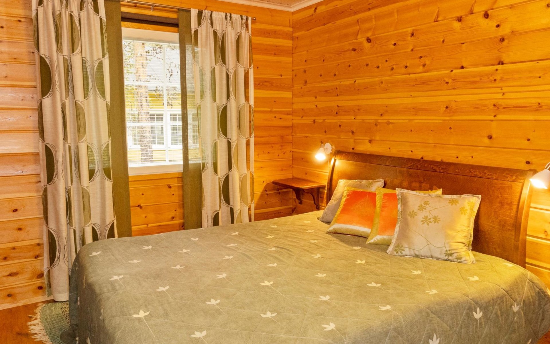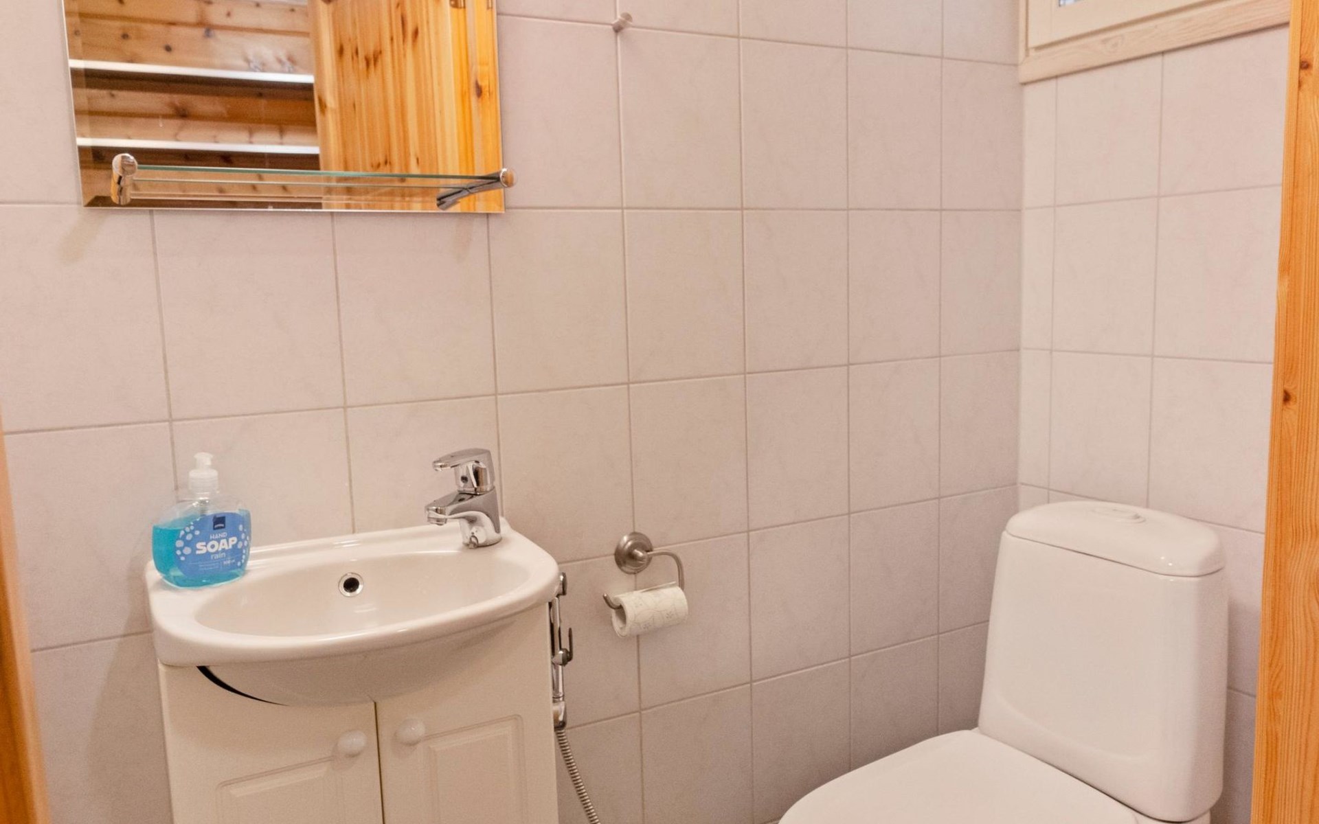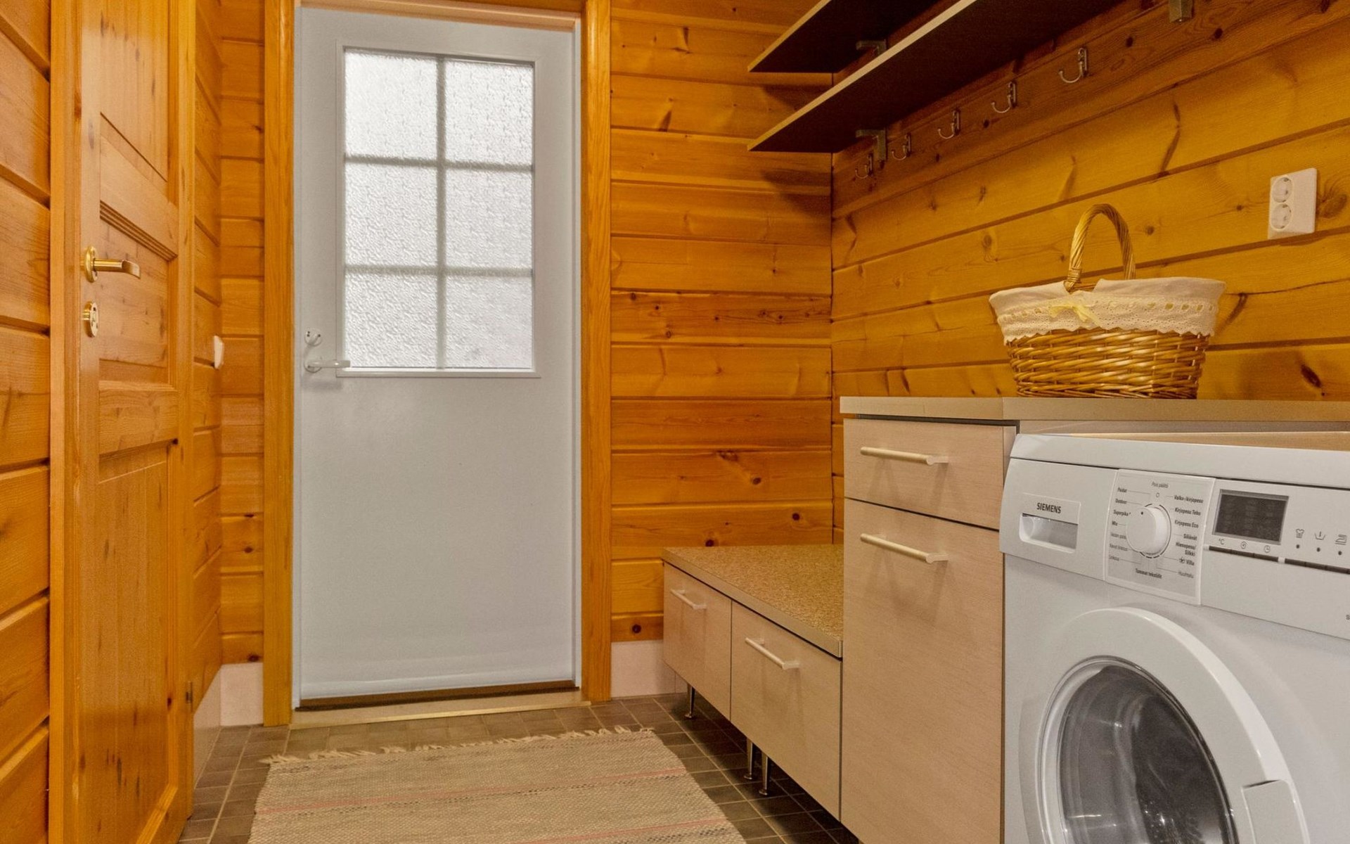 Log cabin on two floors, built in 2007. Ground floor: living room/kitchen, bedroom with double bed, second bedroom with two single beds (width of one of them 120 cm ), electric sauna, washroom 2 showers, dressing room / utility room, downstairs 2 separate toilets, third toilet upstairs, open porch. Upstairs: 2 bedrooms, each with 2 single beds, convertible sofa in the lounge area, toilet. In addition, two drop-down matresses.