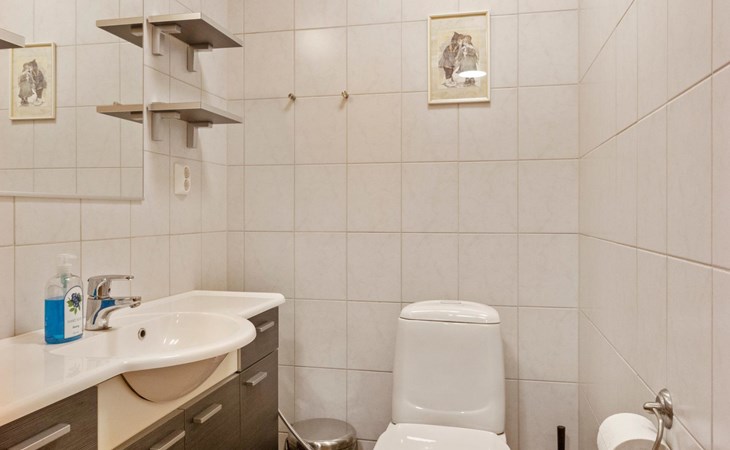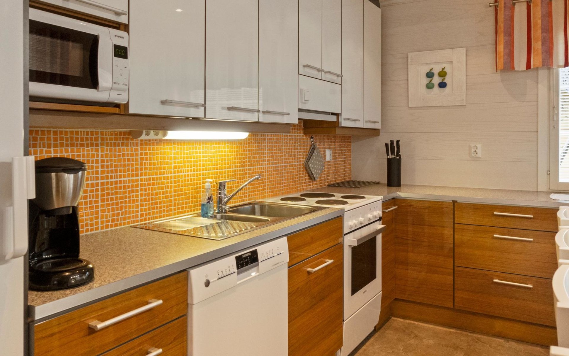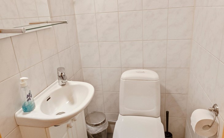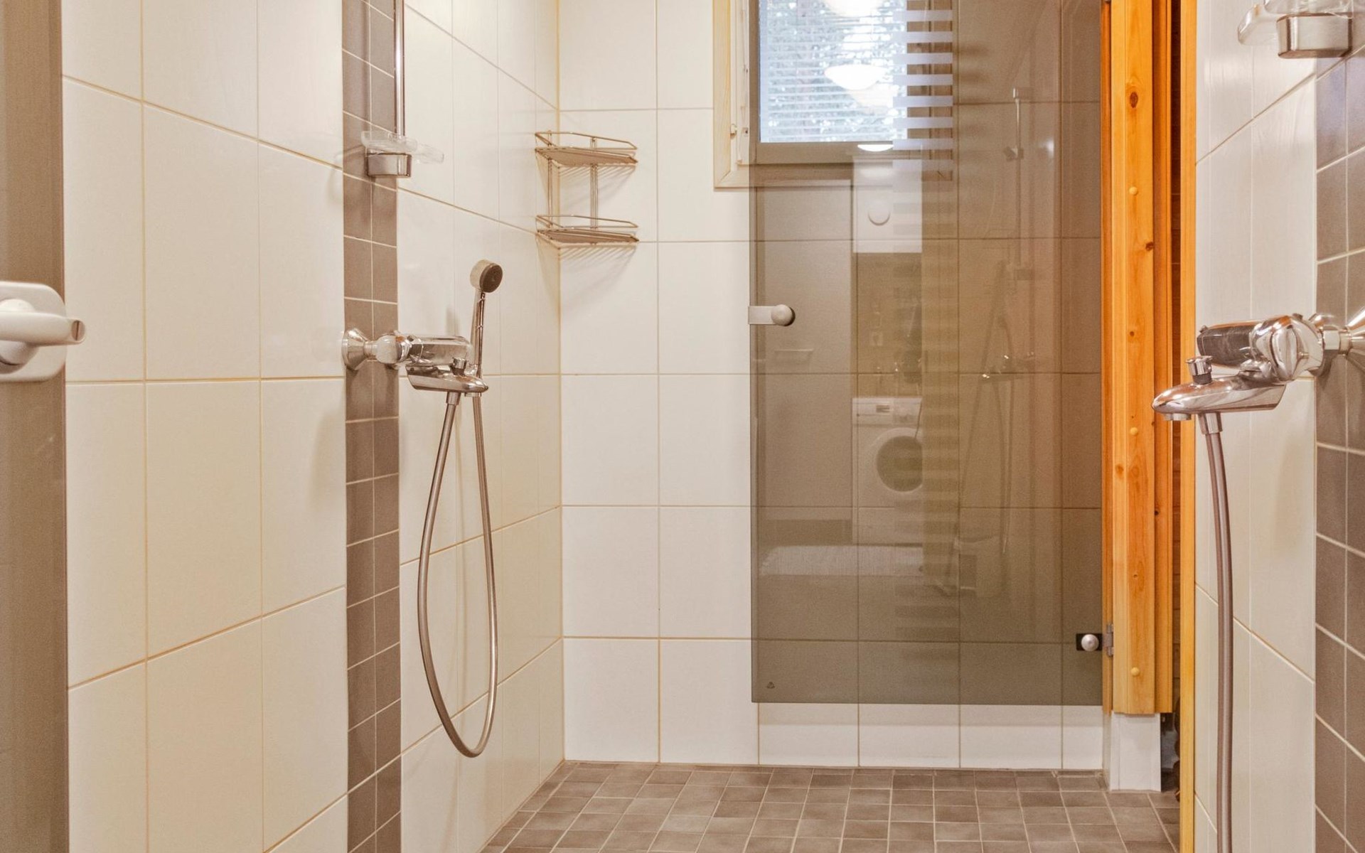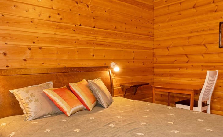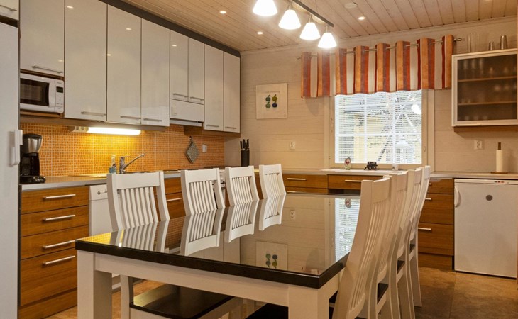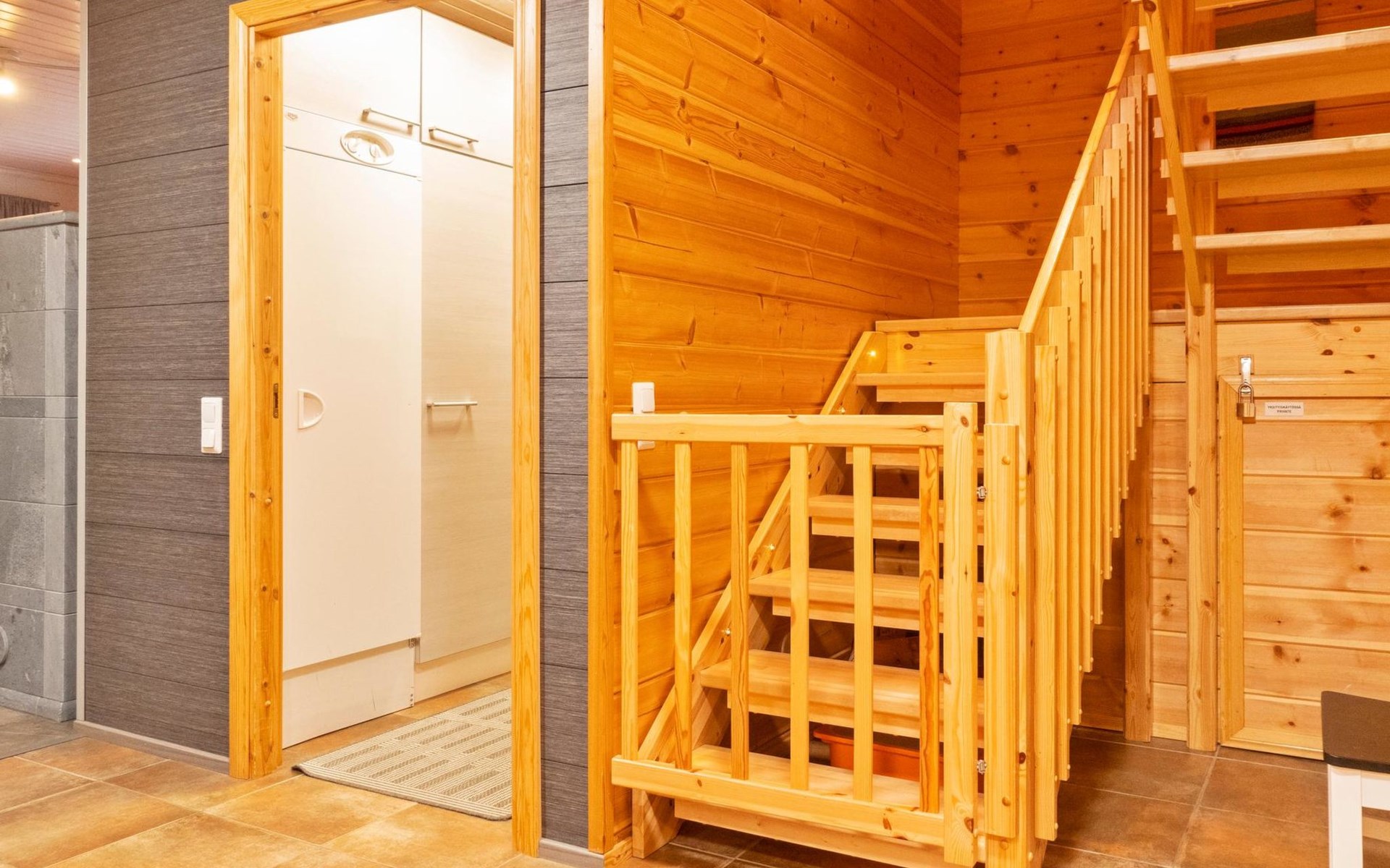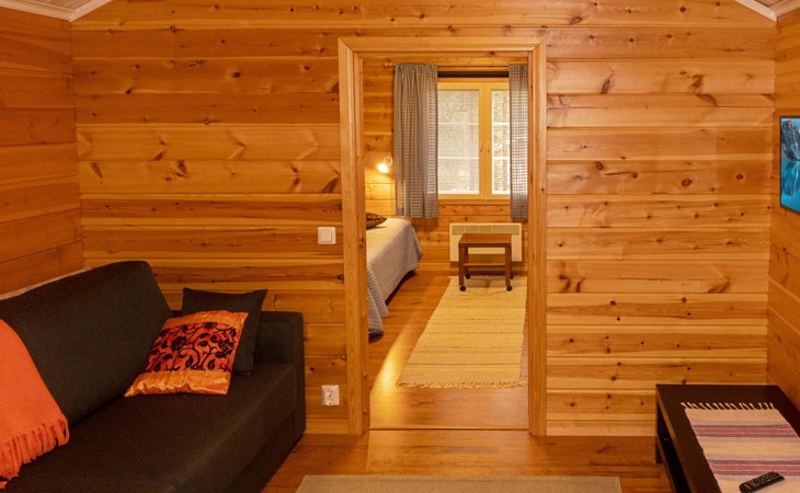 Log cabin on two floors, built in 2007. Ground floor: living room/kitchen, bedroom with double bed, second bedroom with two single beds (width of one of them 120 cm ), electric sauna, washroom 2 showers, dressing room / utility room, downstairs 2 separate toilets, third toilet upstairs, open porch. Upstairs: 2 bedrooms, each with 2 single beds, convertible sofa in the lounge area, toilet. In addition, two drop-down matresses.