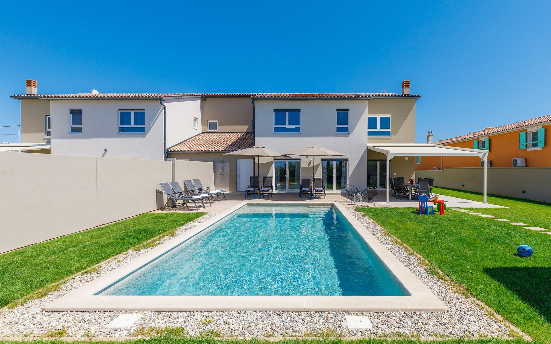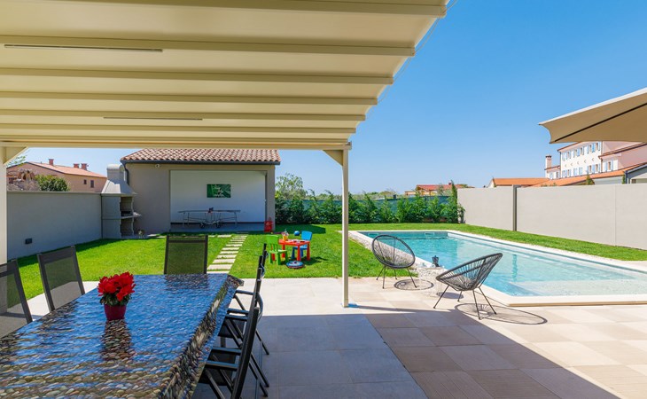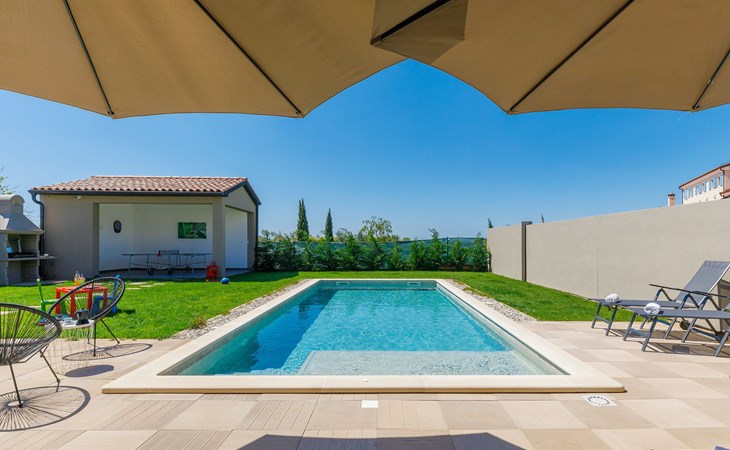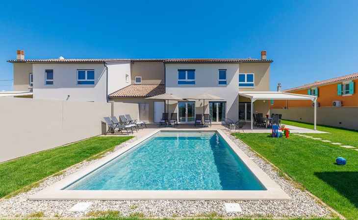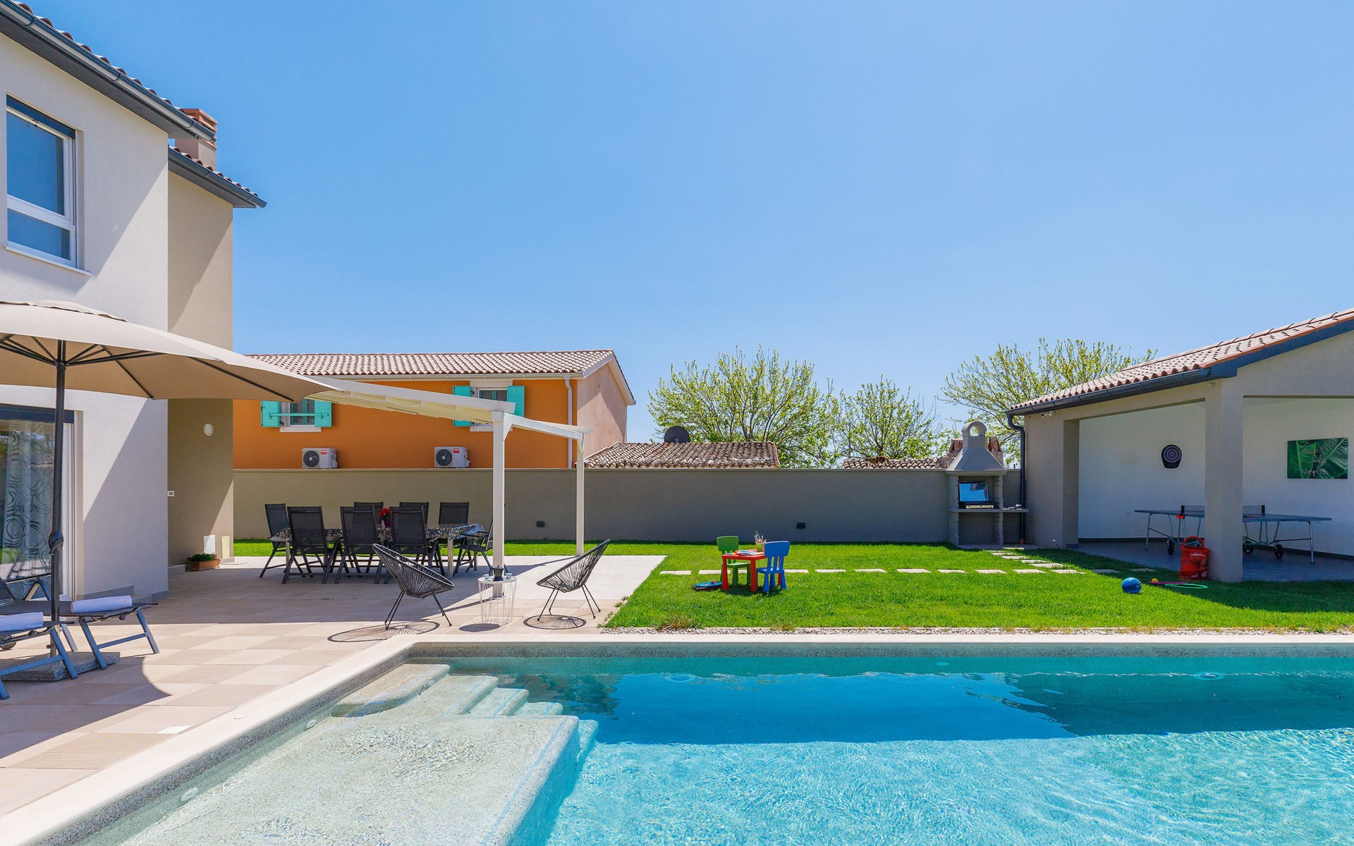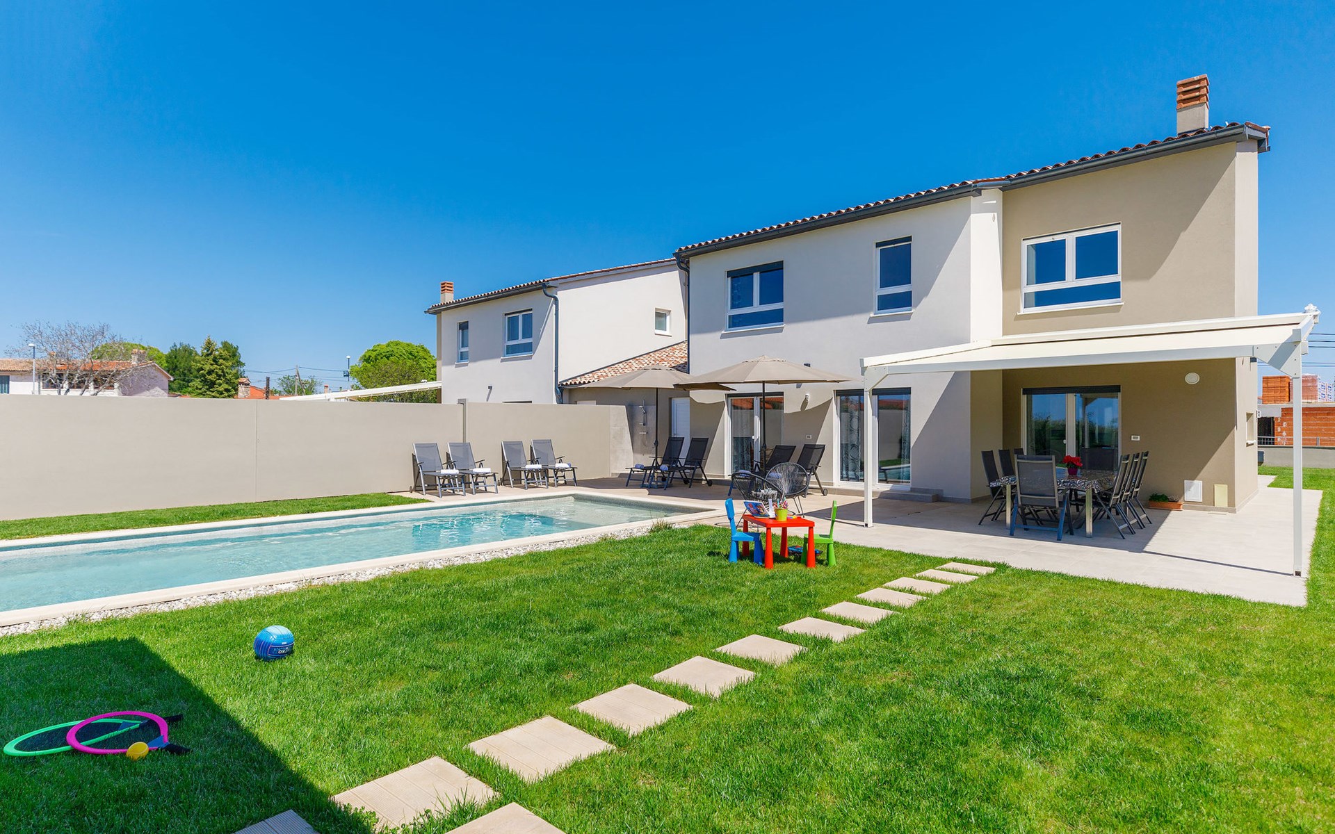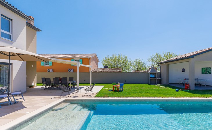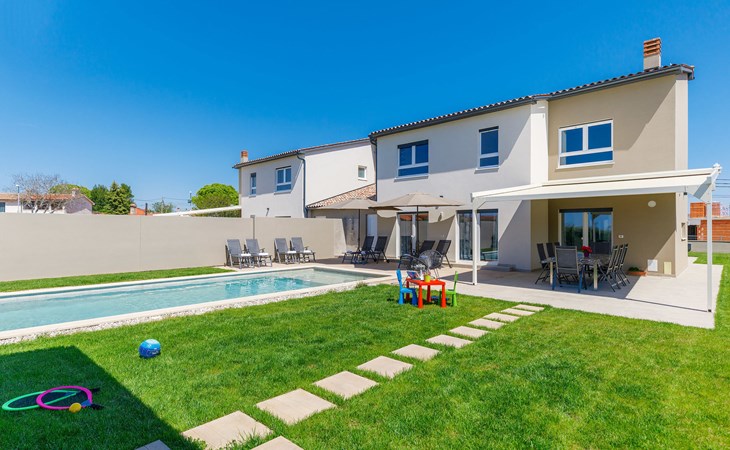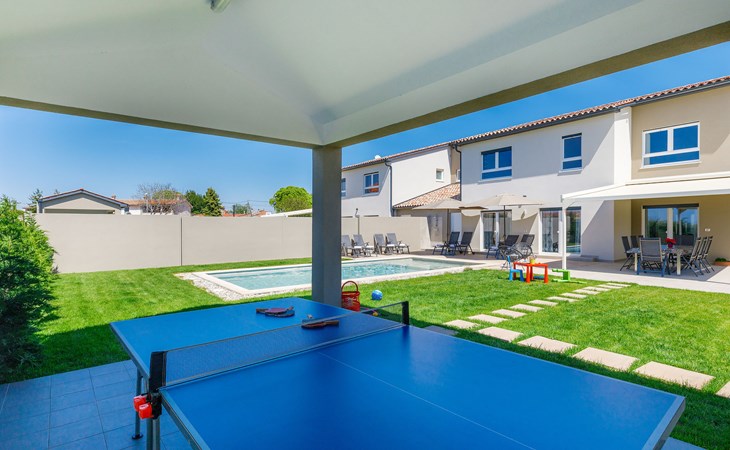 Šišan 4 km from Medulin: Modern, beautiful semi-detached house "Villa Edi", 2 storeys, built in 2021. 300 m from the centre of Šišan, 2 km from the centre of Ližnjan, 7 km from the centre of Pula, 3 km from the sea, 3 km from the beach. Private: property 700 m2 (fenced) with lawn 200 m2, swimming pool angular (45 m2, depth 135 cm, seasonal availability: 03.Apr. - 06.Nov.) with internal staircase and salt-electrolysis pool-cleaning system. Outdoor shower, table tennis, badminton, barbecue, barbecue house, pool maintenance by the owner/gardener. In the house: internet access, central heating system, air conditioning, burglar alarm system, washing machine, tumble dryer. Parking (for 2 cars) at the house on the premises. Shop 300 m, supermarket 4 km, restaurant 50 m, café 300 m, bus stop 20 m, pebble beach 3 km, shingle beach 3 km, rocky beach 3 km. Marina 4 km, surf school 4 km, sailing school 4 km, tennis 2 km, children's playground 800 m. Groups of teenagers on request only. Please note: airfield 10 km from the property. Swimming pool with hydromassage.