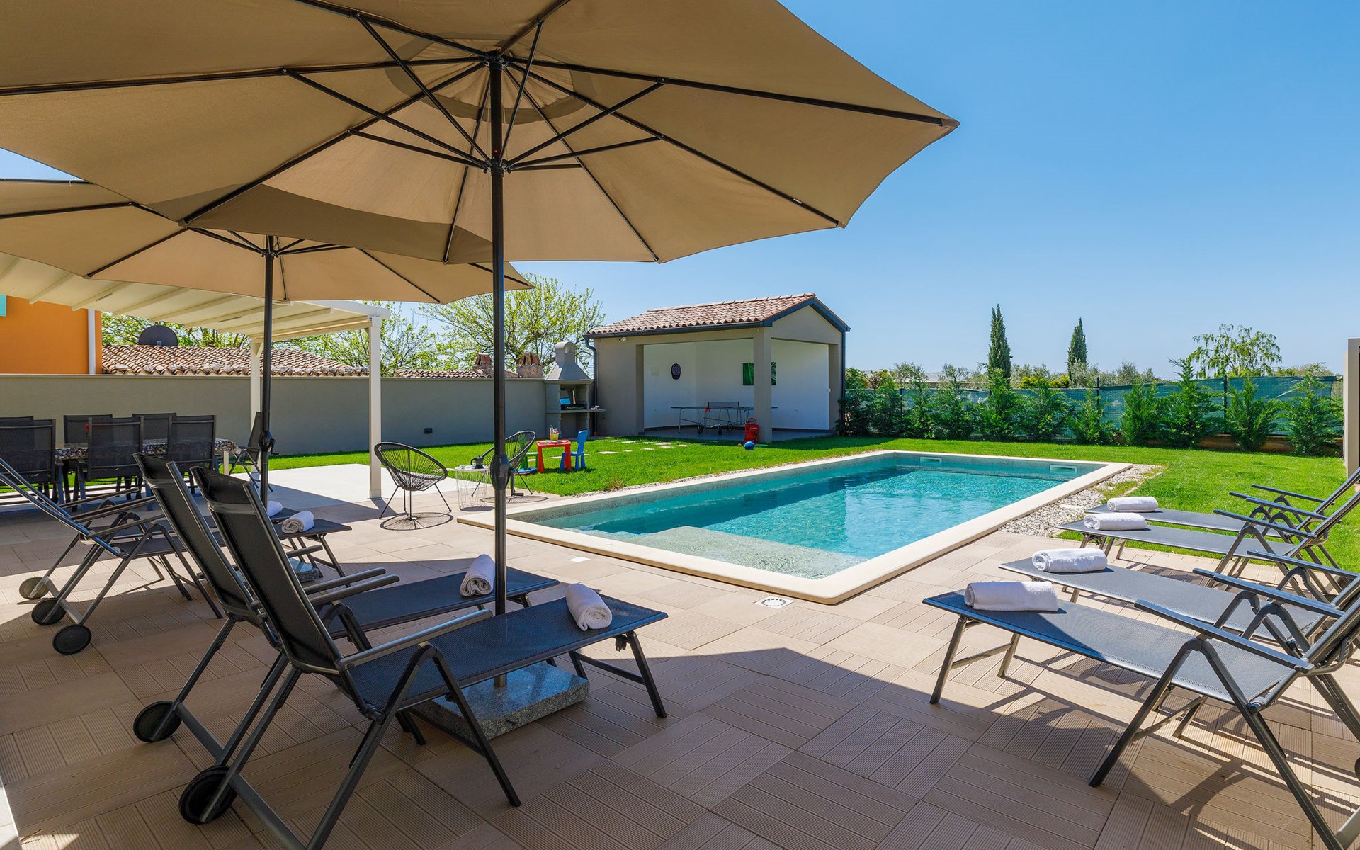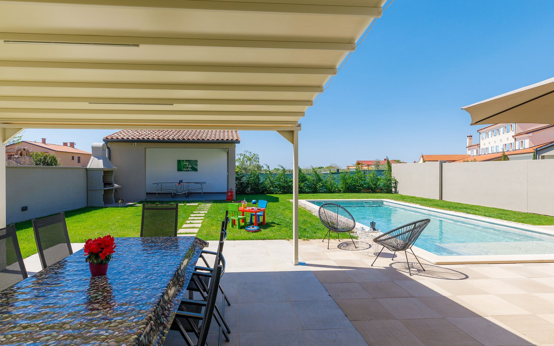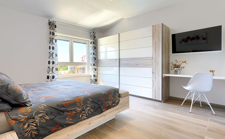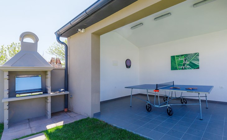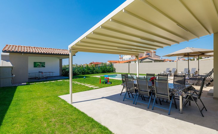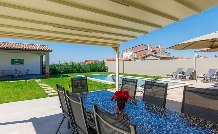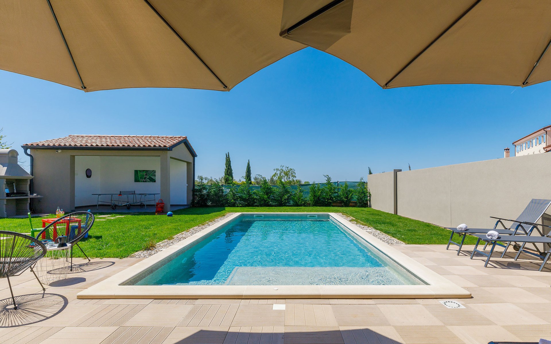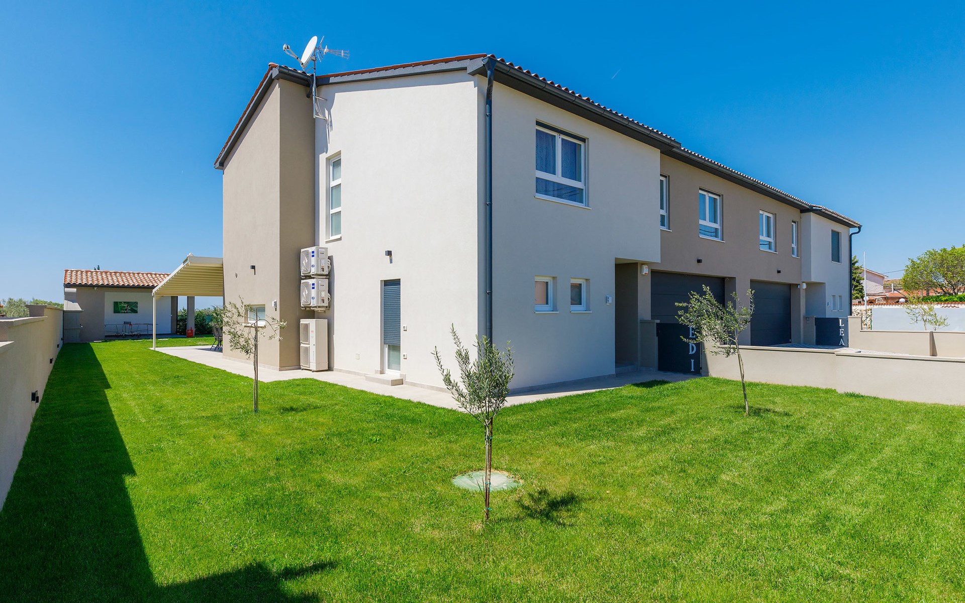 Šišan 4 km from Medulin: Modern, beautiful semi-detached house "Villa Edi", 2 storeys, built in 2021. 300 m from the centre of Šišan, 2 km from the centre of Ližnjan, 7 km from the centre of Pula, 3 km from the sea, 3 km from the beach. Private: property 700 m2 (fenced) with lawn 200 m2, swimming pool angular (45 m2, depth 135 cm, seasonal availability: 03.Apr. - 06.Nov.) with internal staircase and salt-electrolysis pool-cleaning system. Outdoor shower, table tennis, badminton, barbecue, barbecue house, pool maintenance by the owner/gardener. In the house: internet access, central heating system, air conditioning, burglar alarm system, washing machine, tumble dryer. Parking (for 2 cars) at the house on the premises. Shop 300 m, supermarket 4 km, restaurant 50 m, café 300 m, bus stop 20 m, pebble beach 3 km, shingle beach 3 km, rocky beach 3 km. Marina 4 km, surf school 4 km, sailing school 4 km, tennis 2 km, children's playground 800 m. Groups of teenagers on request only. Please note: airfield 10 km from the property. Swimming pool with hydromassage.