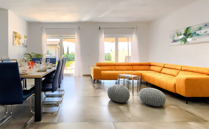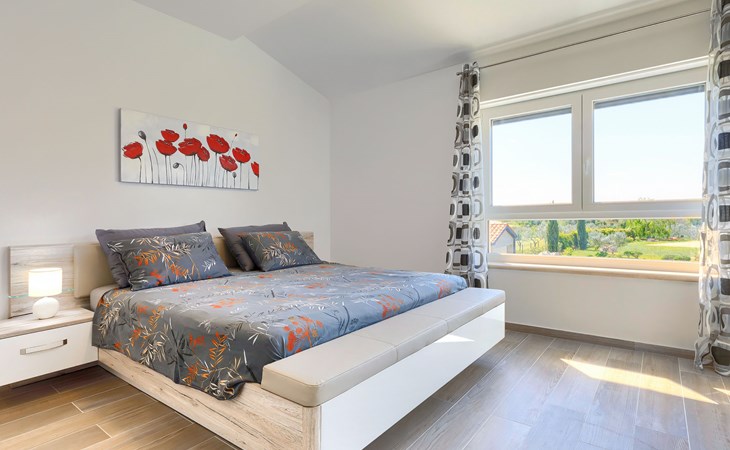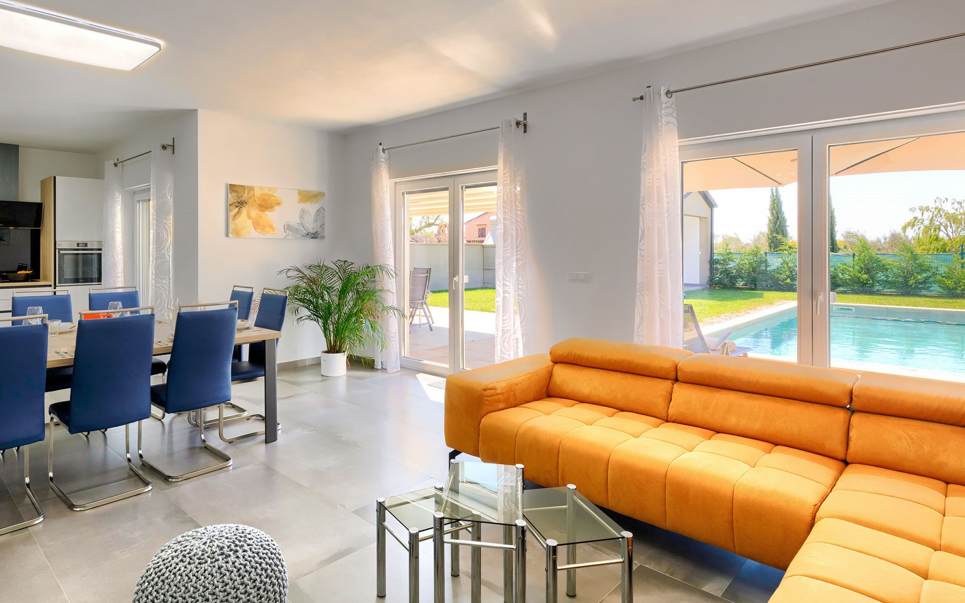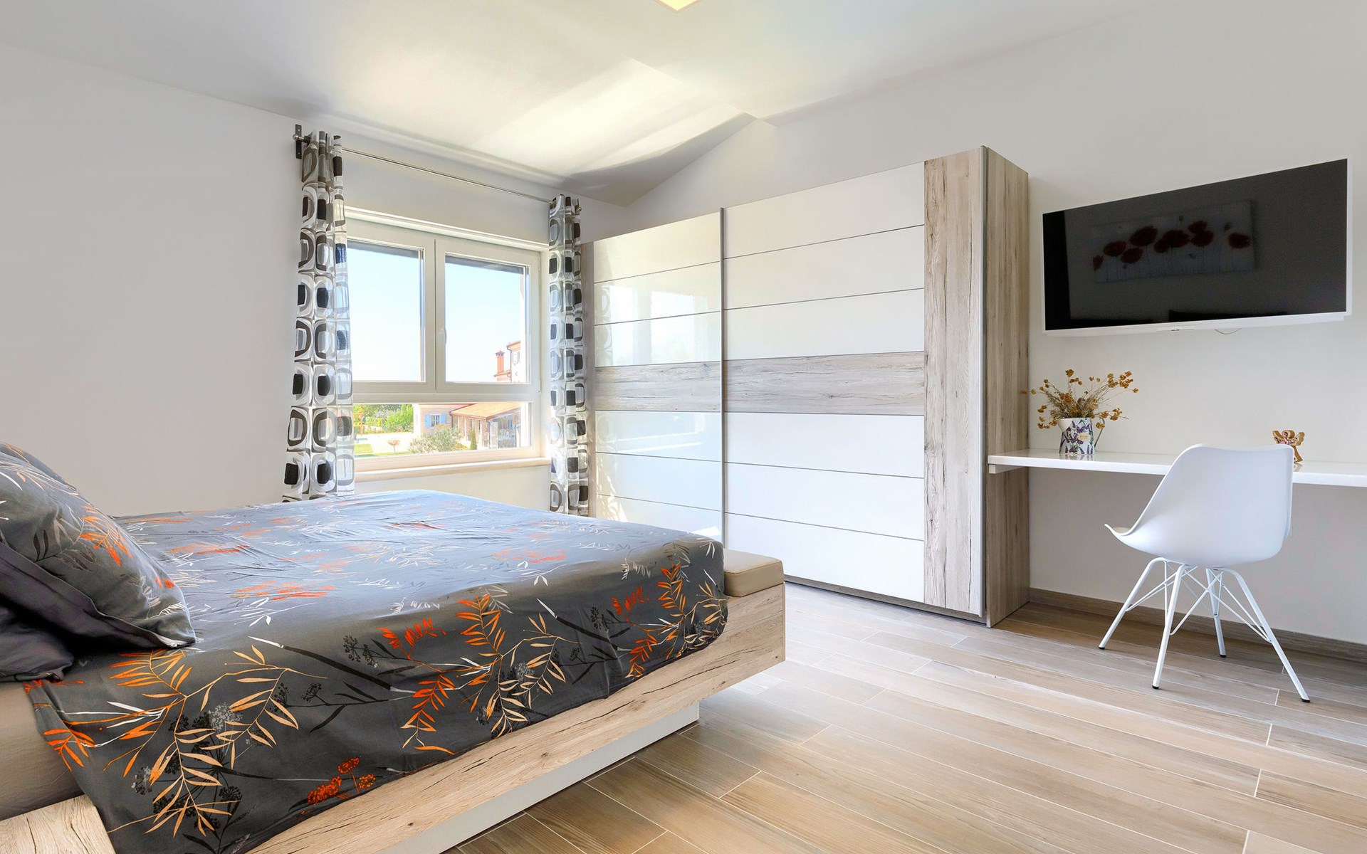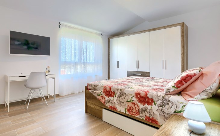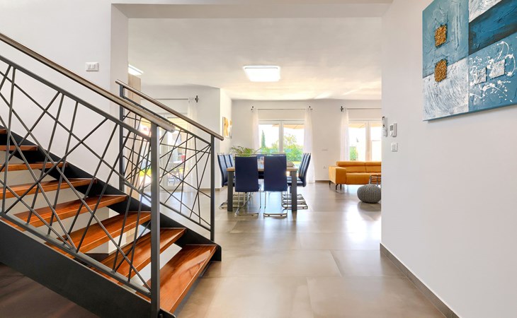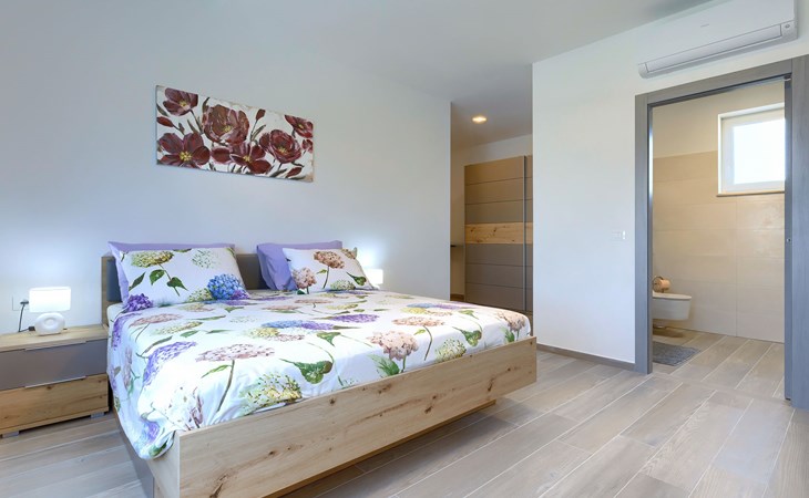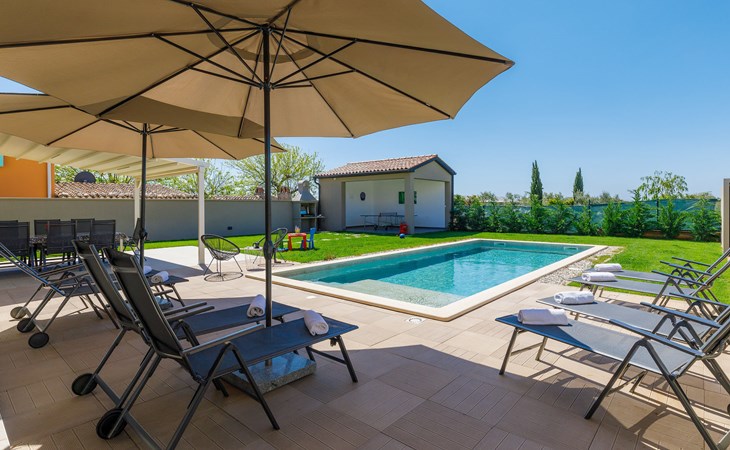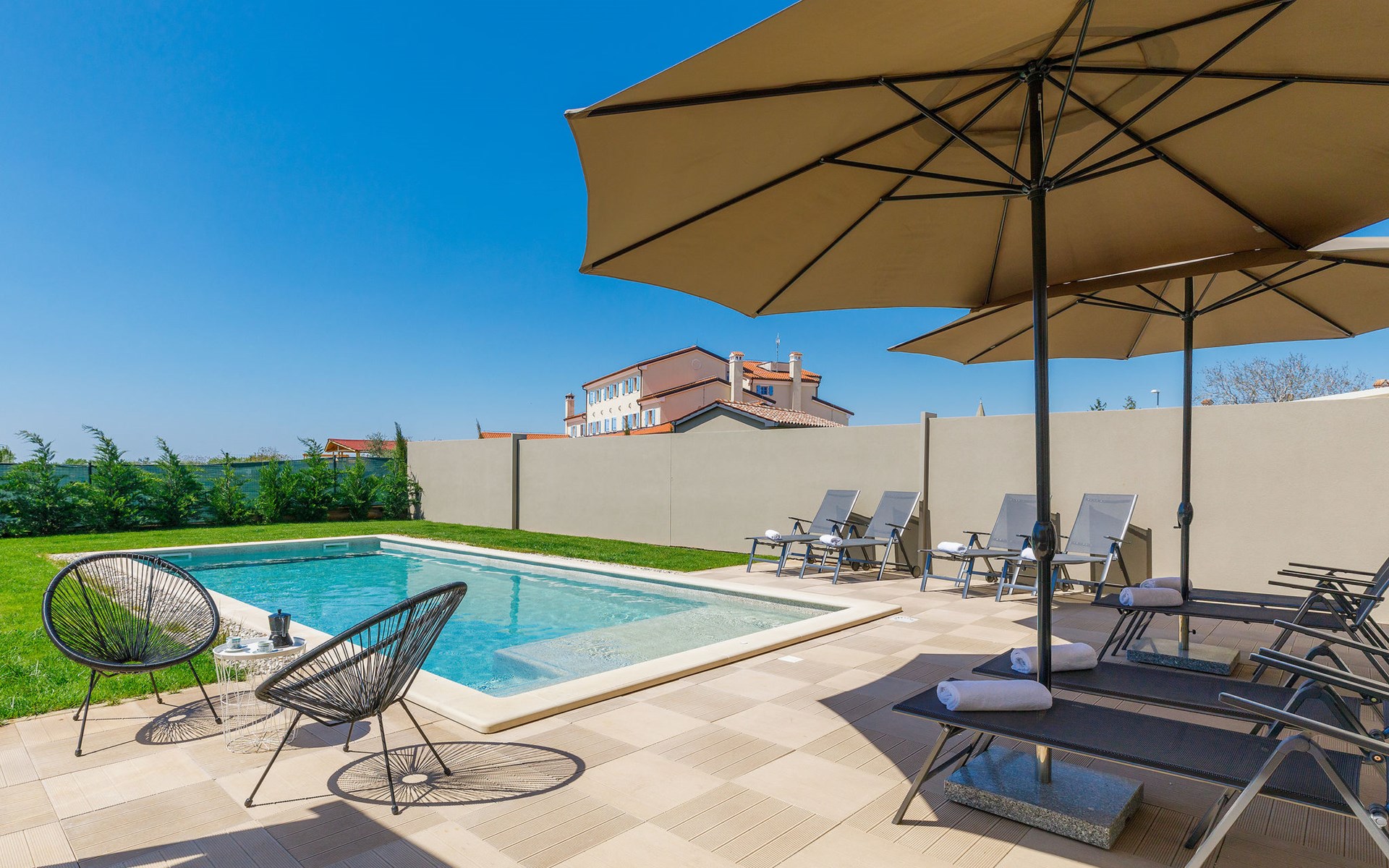 Šišan 4 km from Medulin: Modern, beautiful semi-detached house "Villa Edi", 2 storeys, built in 2021. 300 m from the centre of Šišan, 2 km from the centre of Ližnjan, 7 km from the centre of Pula, 3 km from the sea, 3 km from the beach. Private: property 700 m2 (fenced) with lawn 200 m2, swimming pool angular (45 m2, depth 135 cm, seasonal availability: 03.Apr. - 06.Nov.) with internal staircase and salt-electrolysis pool-cleaning system. Outdoor shower, table tennis, badminton, barbecue, barbecue house, pool maintenance by the owner/gardener. In the house: internet access, central heating system, air conditioning, burglar alarm system, washing machine, tumble dryer. Parking (for 2 cars) at the house on the premises. Shop 300 m, supermarket 4 km, restaurant 50 m, café 300 m, bus stop 20 m, pebble beach 3 km, shingle beach 3 km, rocky beach 3 km. Marina 4 km, surf school 4 km, sailing school 4 km, tennis 2 km, children's playground 800 m. Groups of teenagers on request only. Please note: airfield 10 km from the property. Swimming pool with hydromassage.