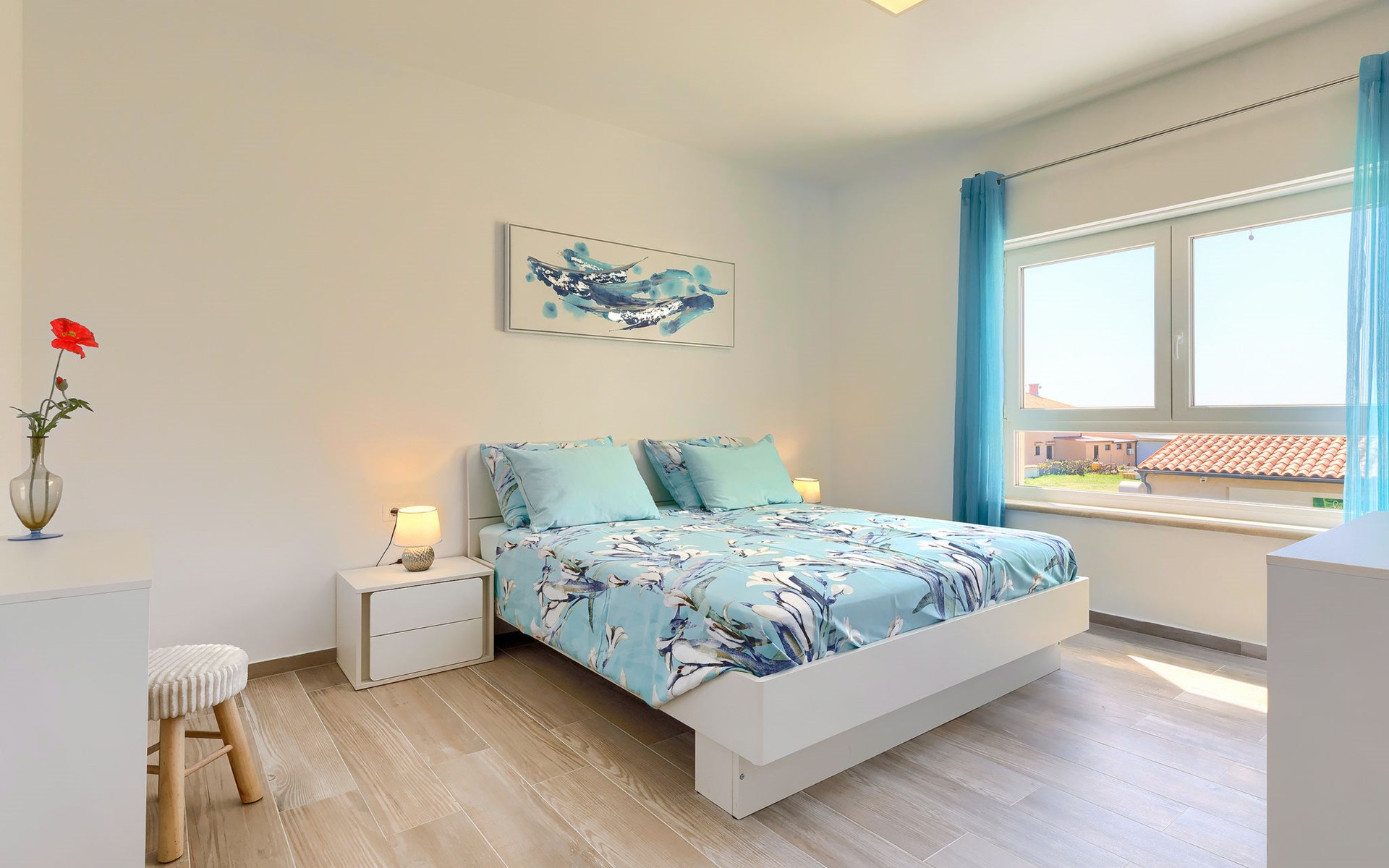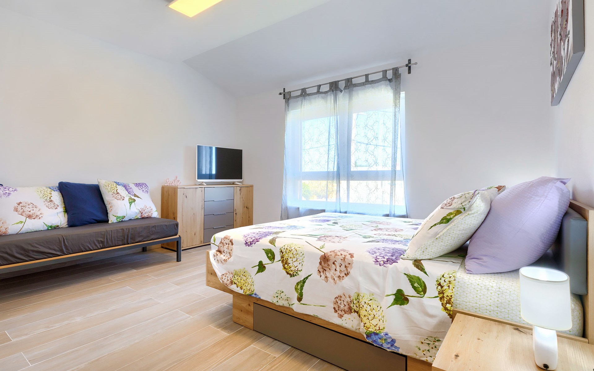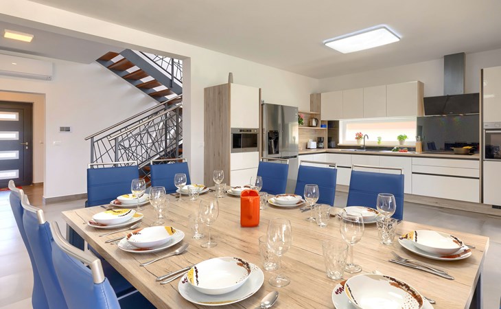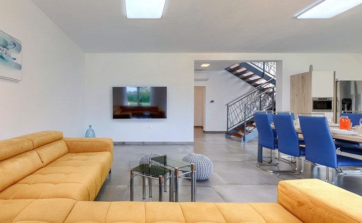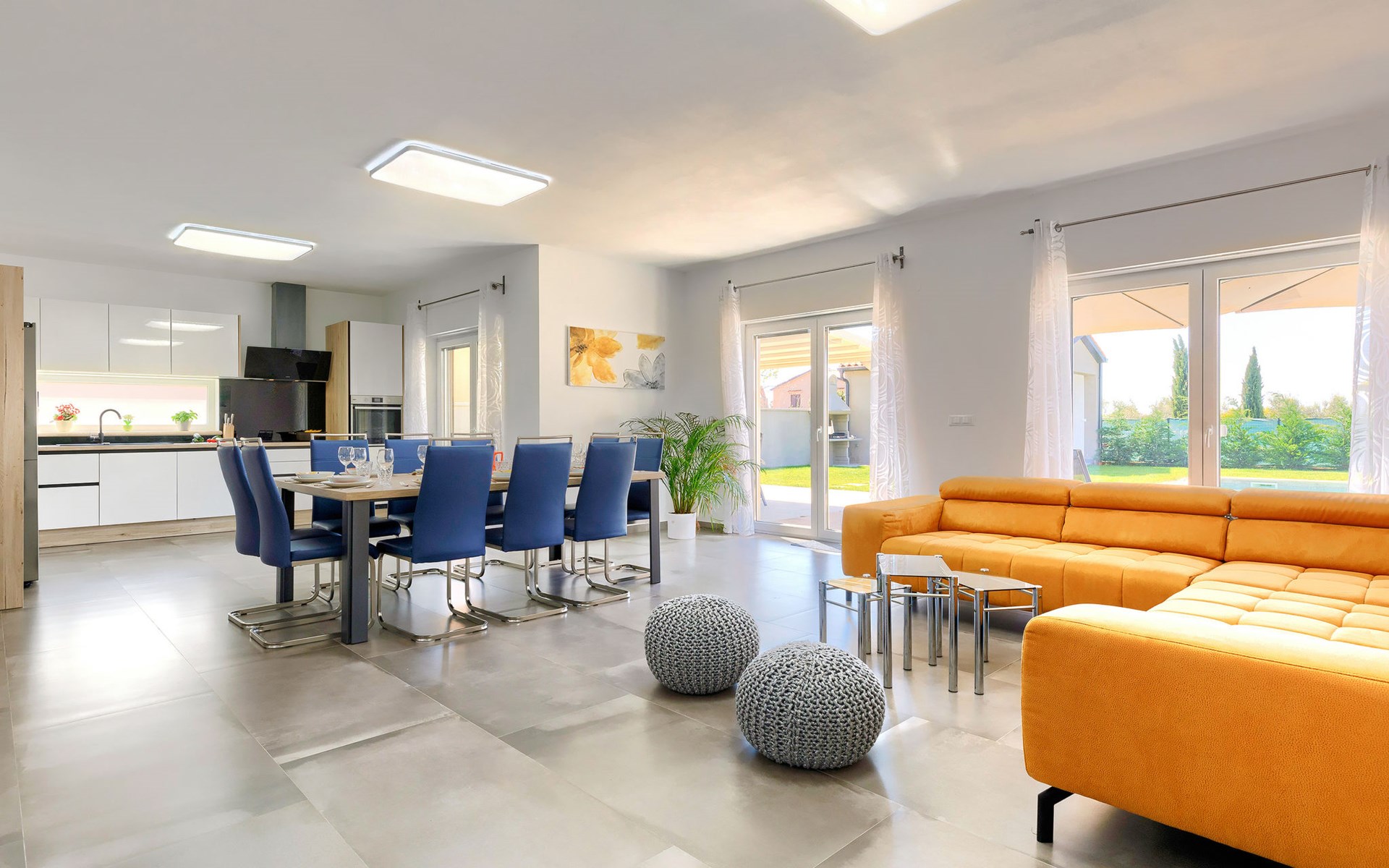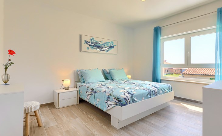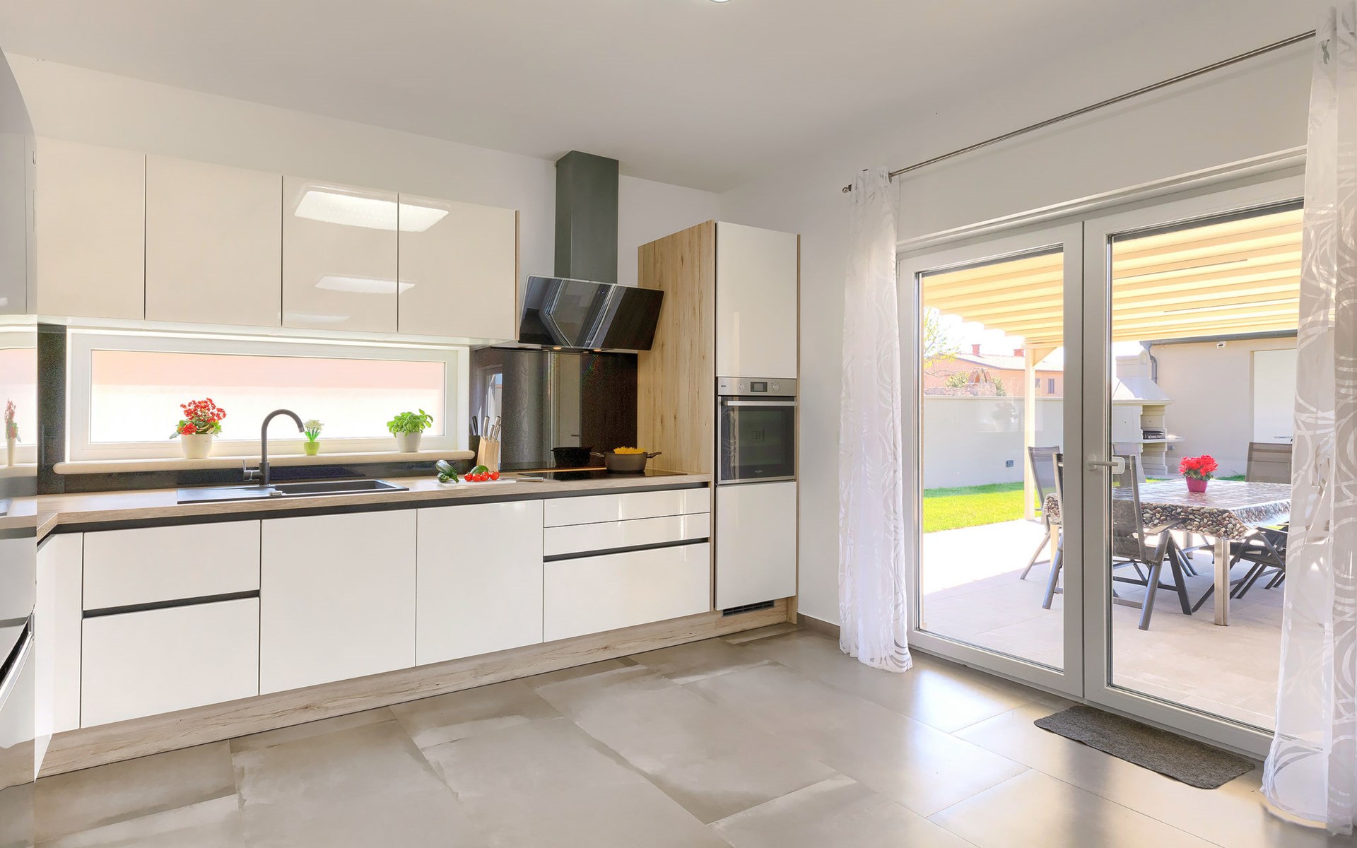 Šišan 4 km from Medulin: Modern, beautiful semi-detached house "Villa Edi", 2 storeys, built in 2021. 300 m from the centre of Šišan, 2 km from the centre of Ližnjan, 7 km from the centre of Pula, 3 km from the sea, 3 km from the beach. Private: property 700 m2 (fenced) with lawn 200 m2, swimming pool angular (45 m2, depth 135 cm, seasonal availability: 03.Apr. - 06.Nov.) with internal staircase and salt-electrolysis pool-cleaning system. Outdoor shower, table tennis, badminton, barbecue, barbecue house, pool maintenance by the owner/gardener. In the house: internet access, central heating system, air conditioning, burglar alarm system, washing machine, tumble dryer. Parking (for 2 cars) at the house on the premises. Shop 300 m, supermarket 4 km, restaurant 50 m, café 300 m, bus stop 20 m, pebble beach 3 km, shingle beach 3 km, rocky beach 3 km. Marina 4 km, surf school 4 km, sailing school 4 km, tennis 2 km, children's playground 800 m. Groups of teenagers on request only. Please note: airfield 10 km from the property. Swimming pool with hydromassage.