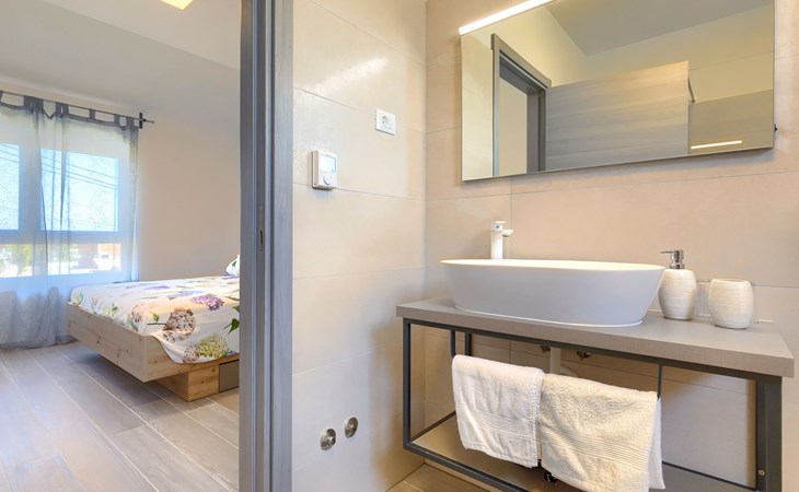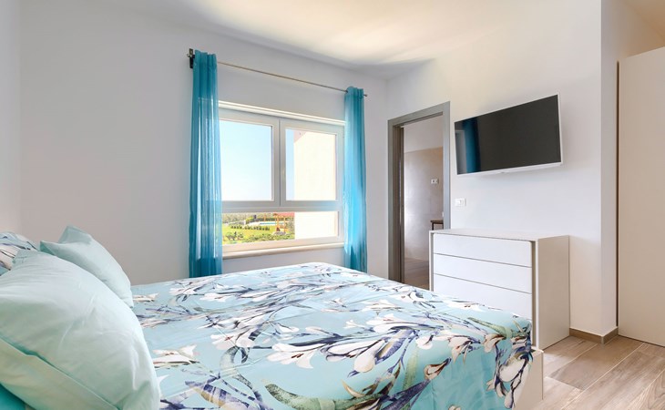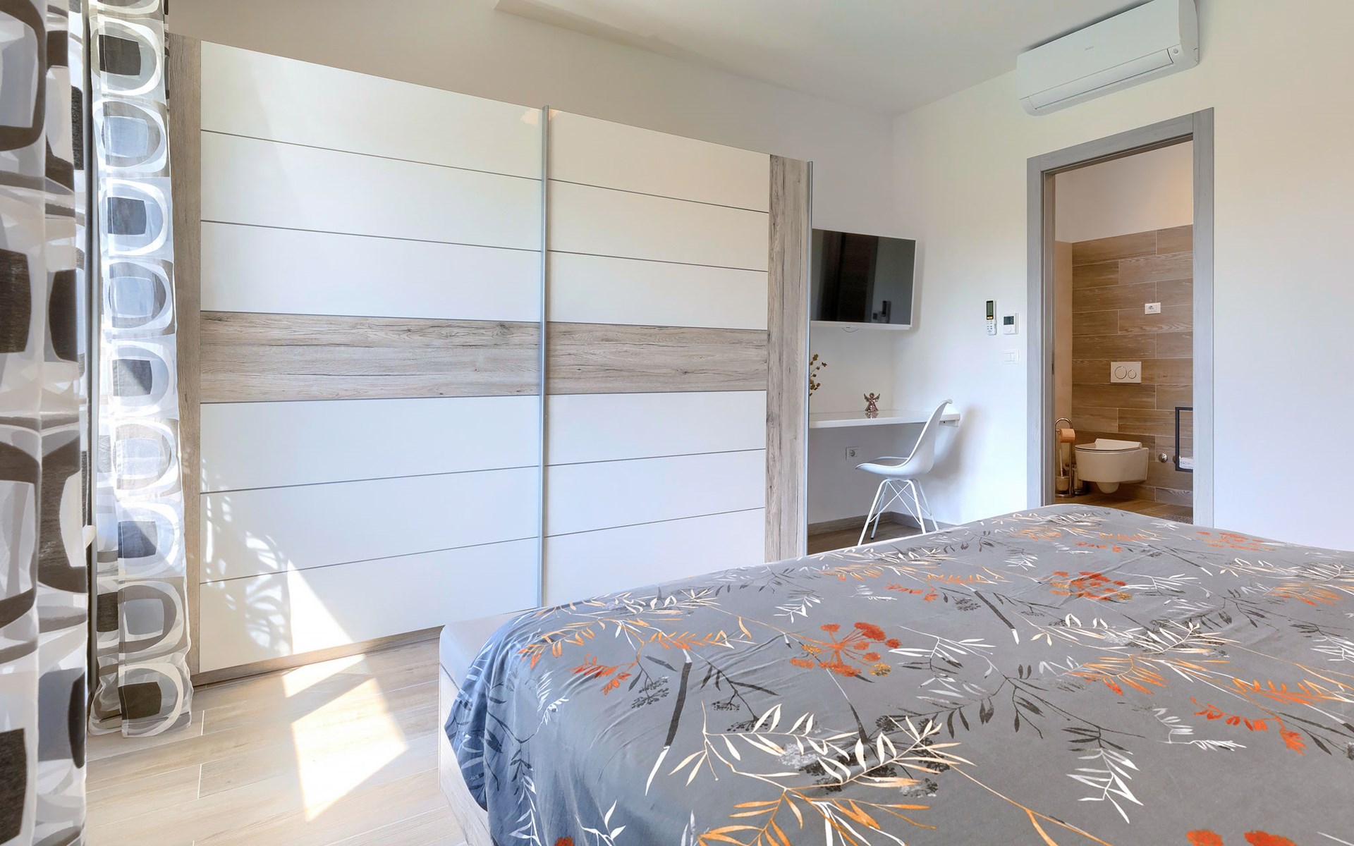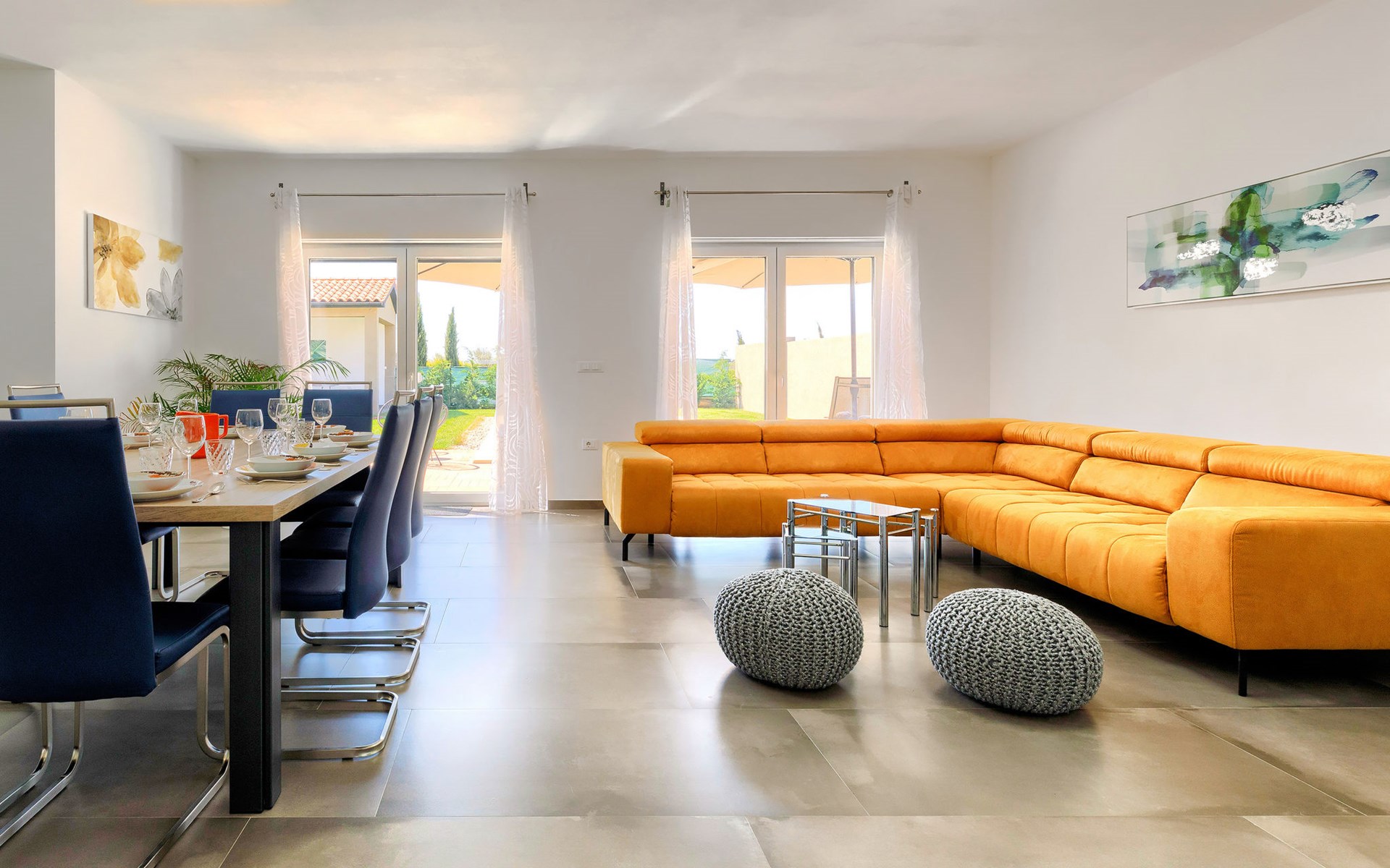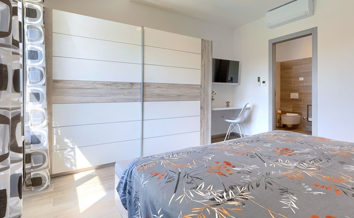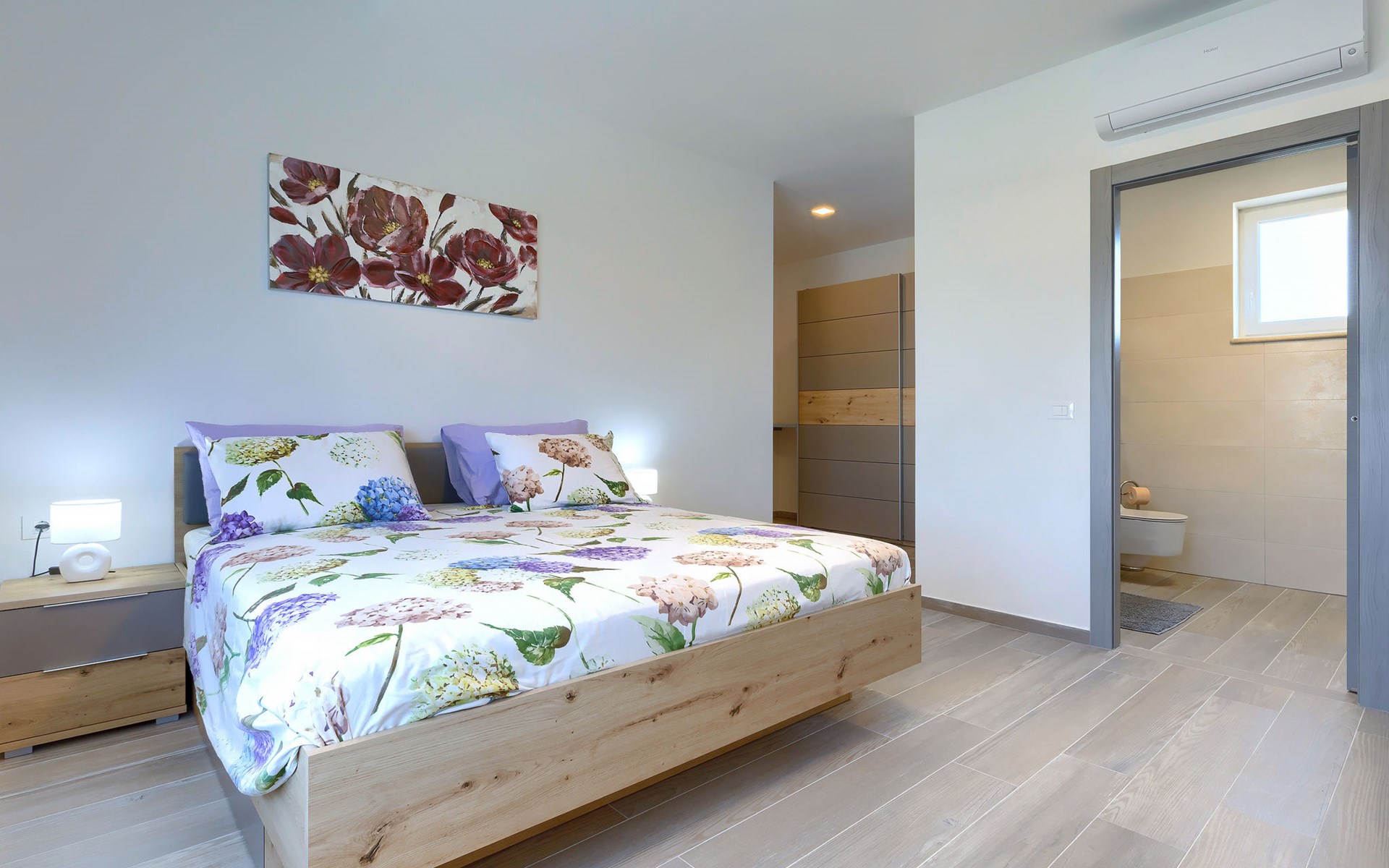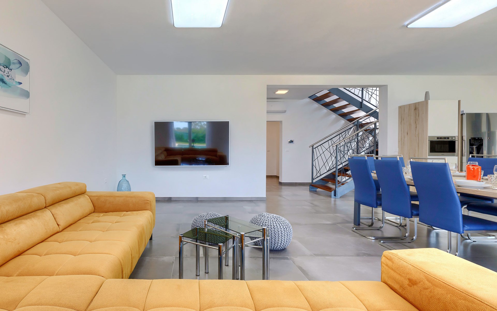 Šišan 4 km from Medulin: Modern, beautiful semi-detached house "Villa Edi", 2 storeys, built in 2021. 300 m from the centre of Šišan, 2 km from the centre of Ližnjan, 7 km from the centre of Pula, 3 km from the sea, 3 km from the beach. Private: property 700 m2 (fenced) with lawn 200 m2, swimming pool angular (45 m2, depth 135 cm, seasonal availability: 03.Apr. - 06.Nov.) with internal staircase and salt-electrolysis pool-cleaning system. Outdoor shower, table tennis, badminton, barbecue, barbecue house, pool maintenance by the owner/gardener. In the house: internet access, central heating system, air conditioning, burglar alarm system, washing machine, tumble dryer. Parking (for 2 cars) at the house on the premises. Shop 300 m, supermarket 4 km, restaurant 50 m, café 300 m, bus stop 20 m, pebble beach 3 km, shingle beach 3 km, rocky beach 3 km. Marina 4 km, surf school 4 km, sailing school 4 km, tennis 2 km, children's playground 800 m. Groups of teenagers on request only. Please note: airfield 10 km from the property. Swimming pool with hydromassage.