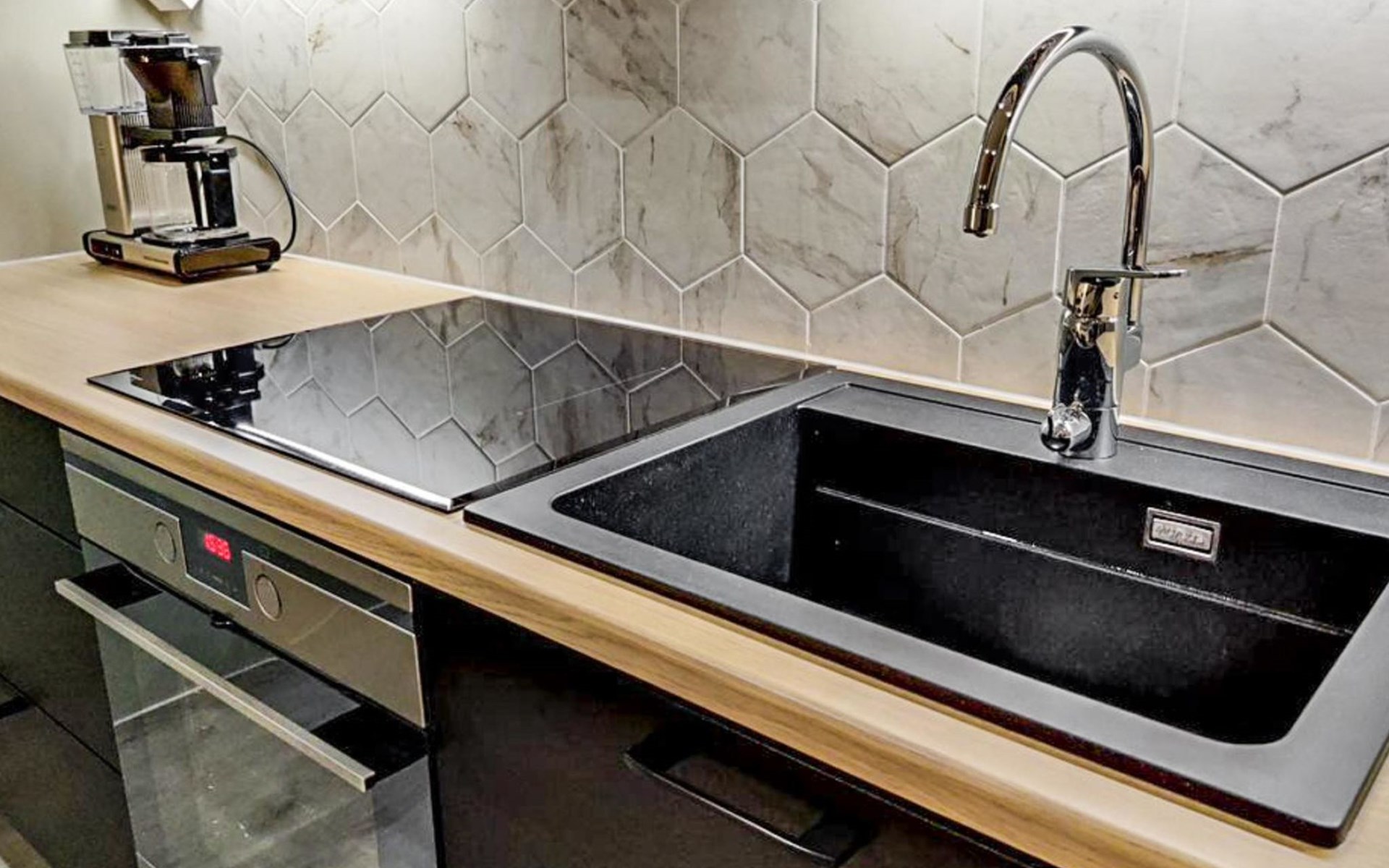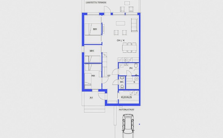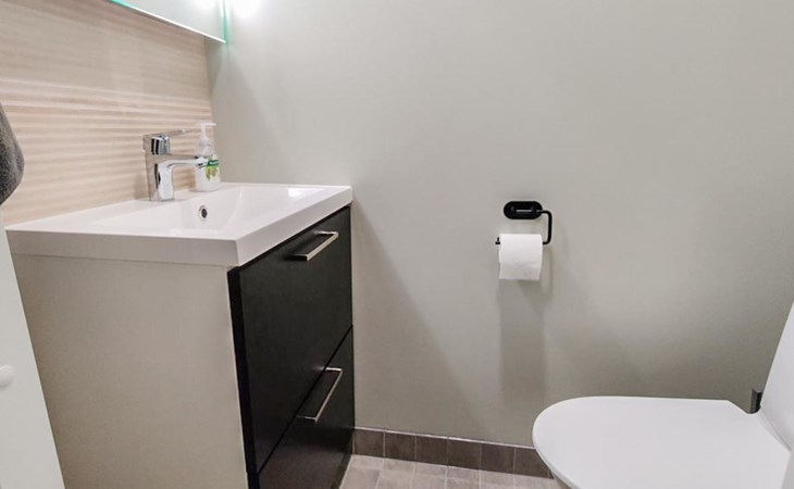 High-quality gable apartment in three-apartment row house, built in November 2021. Location is ideal; close to Vuokatti ski slopes and area's services. Total area is 71 m², on one floor. A wonderful view to the pond from the spacious living room/kitchen, high windows and glazed 18 m² terrace. Kitchen / dining and living area, three bedrooms with sliding doors, 9 m² bedroom with double bed, 7 m² bedroom with two single beds and 5 m² bedroom with bunk bed (extra bed underneath the bunk bed). Drying room, sauna (electric sauna stove), washroom/WC and separate toilet.
