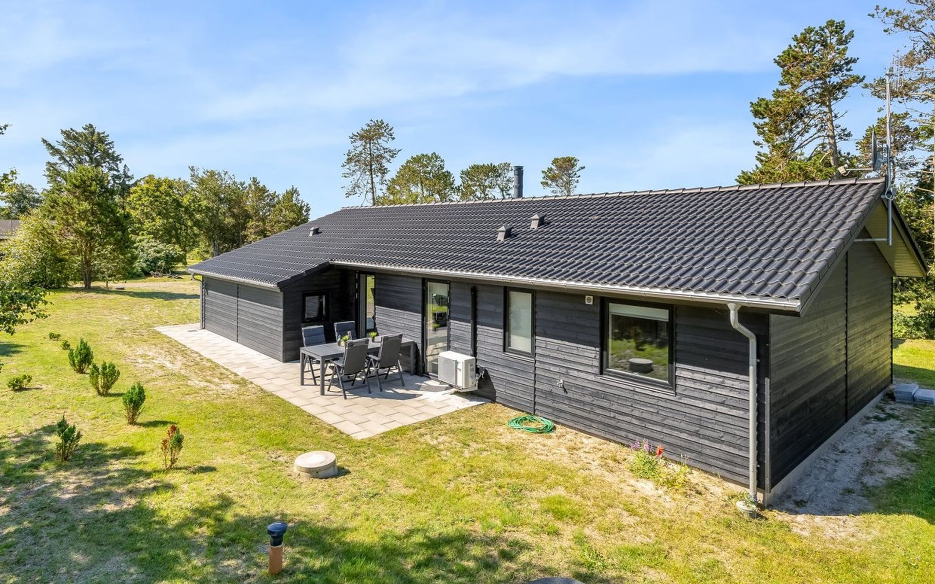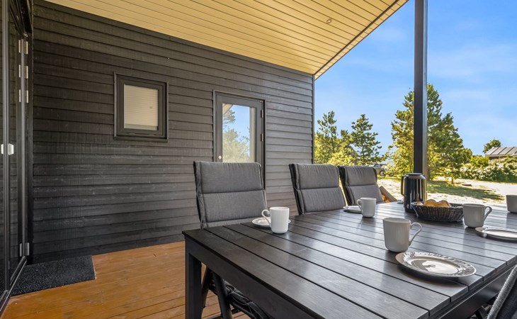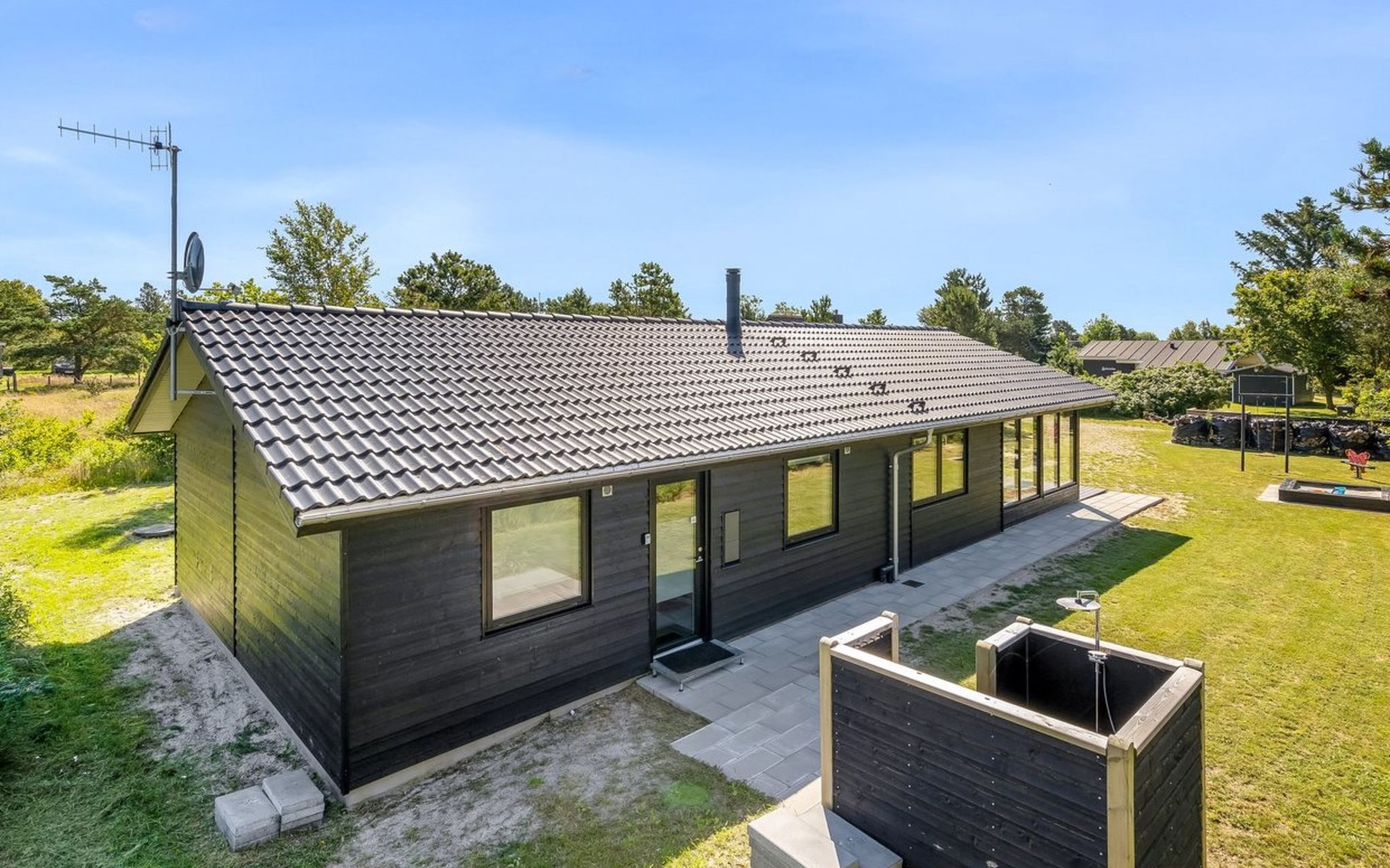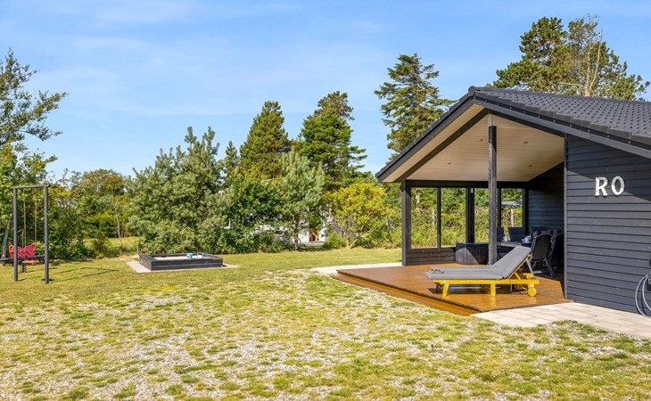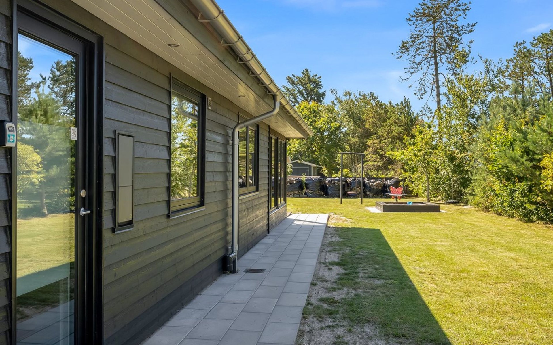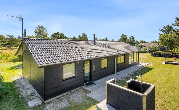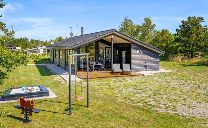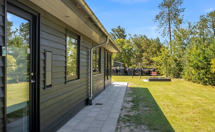 Single-family house, built in 2022. 225 m from the sea. Private: natural state property 835 m2. Outdoor shower, barbecue, children's playground (swing). In the house: washing machine, tumble dryer. Parking at the house. E-charging station. Grocery 5 km. The owner does not accept any youth groups.