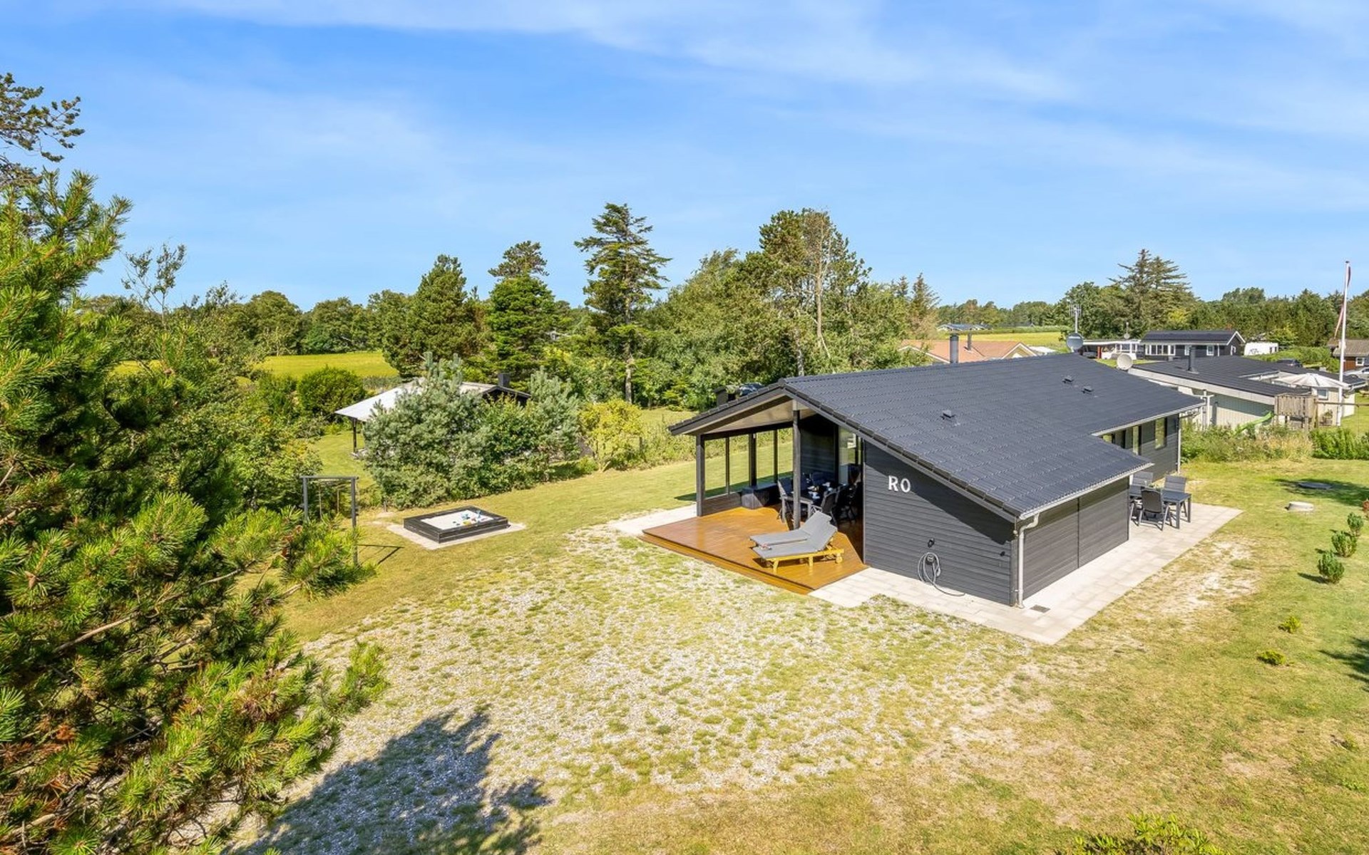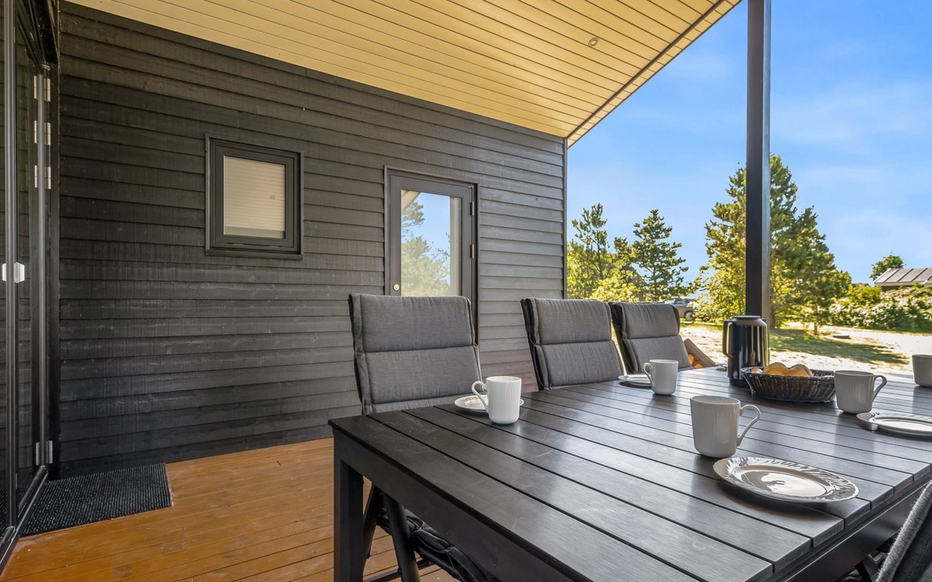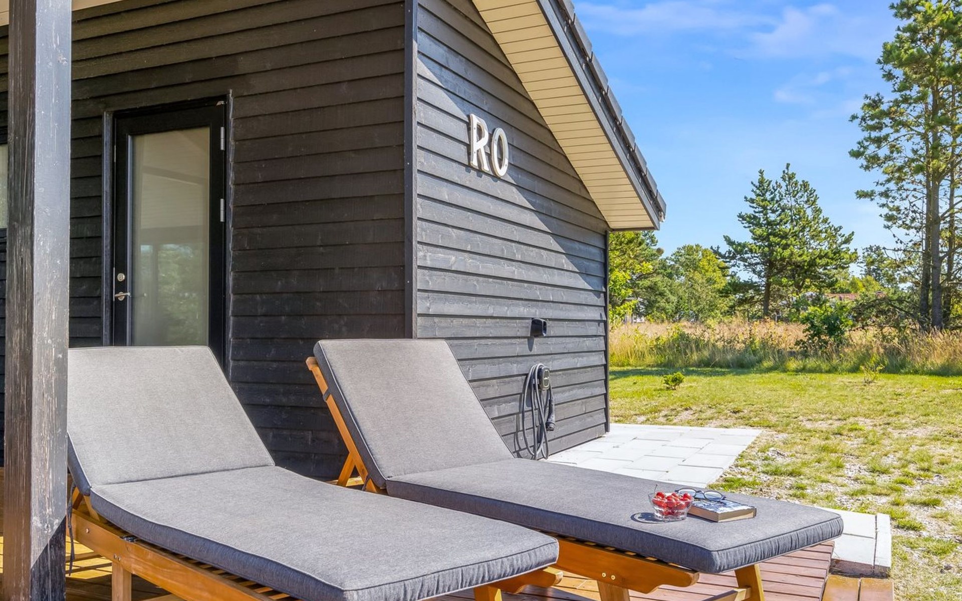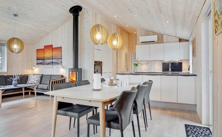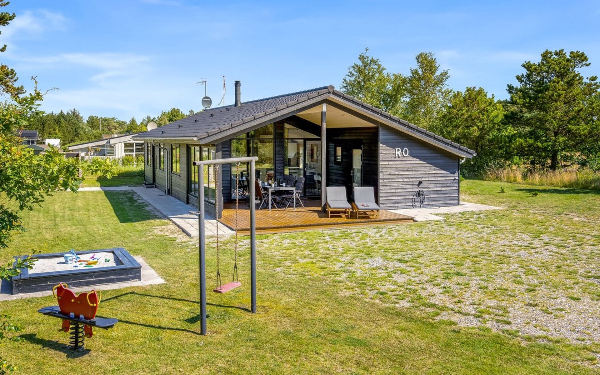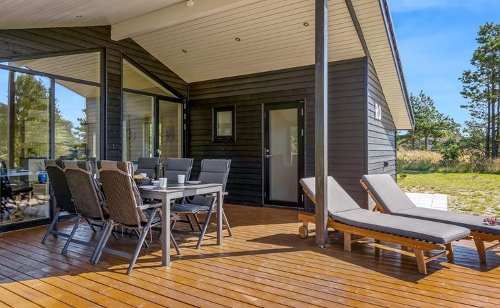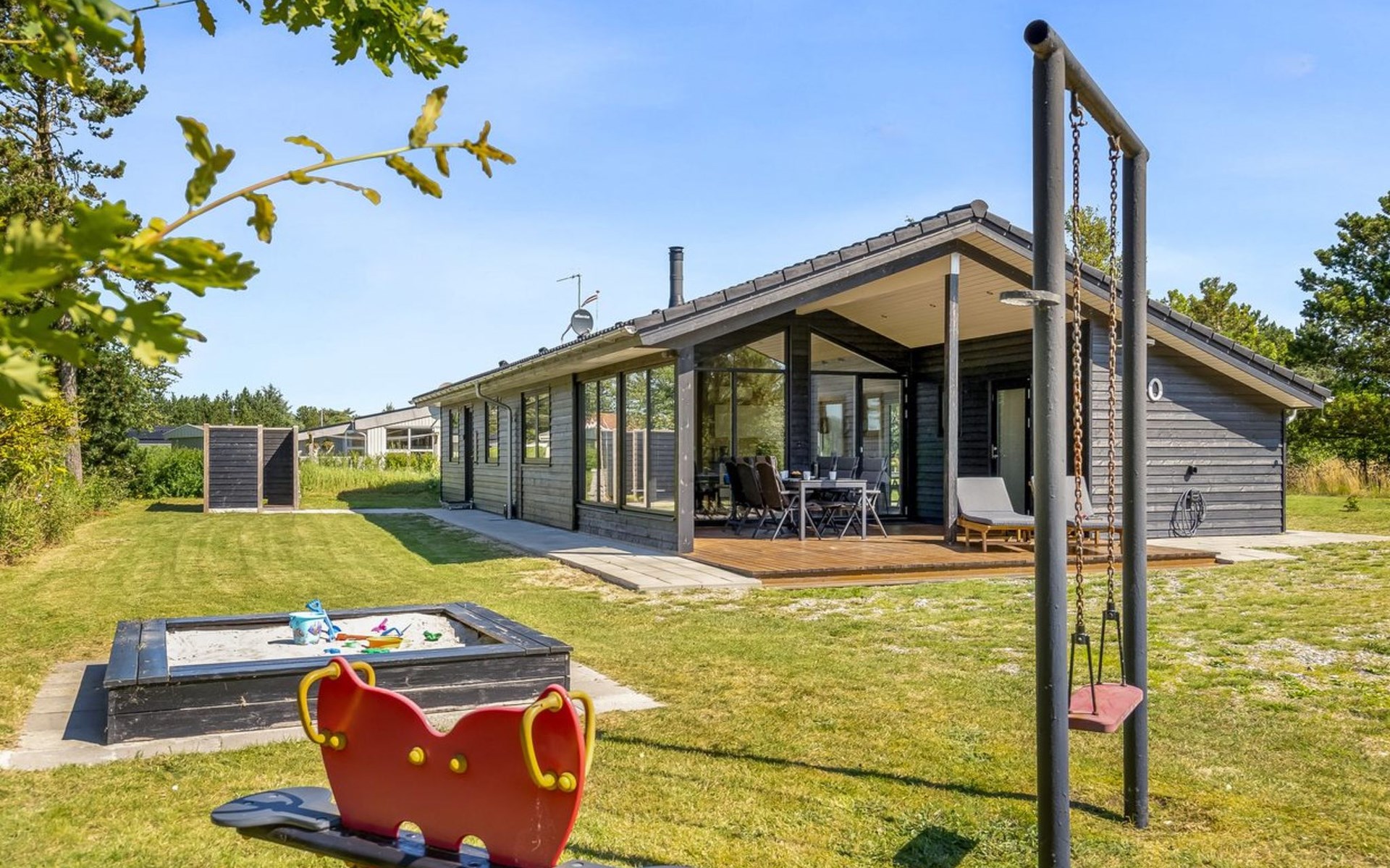 Single-family house, built in 2022. 225 m from the sea. Private: natural state property 835 m2. Outdoor shower, barbecue, children's playground (swing). In the house: washing machine, tumble dryer. Parking at the house. E-charging station. Grocery 5 km. The owner does not accept any youth groups.