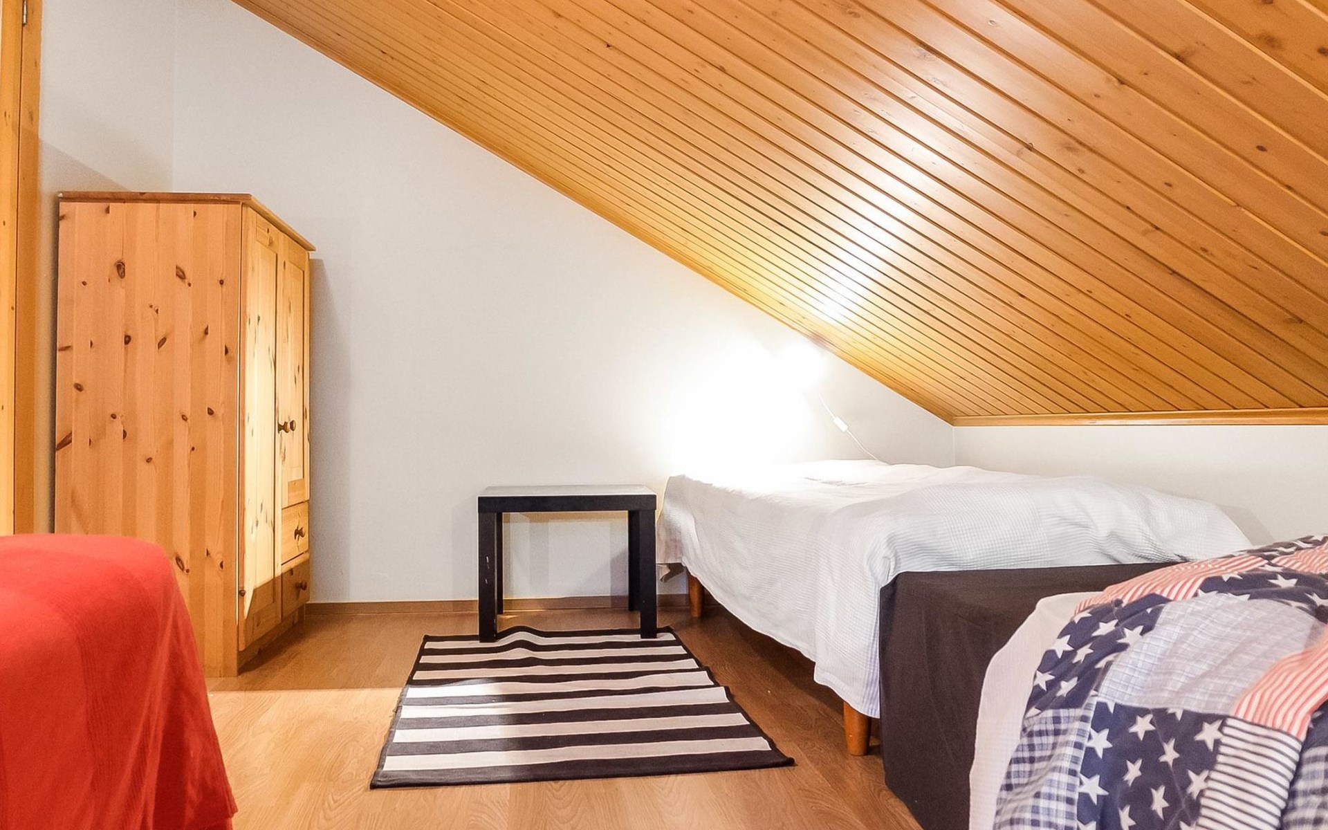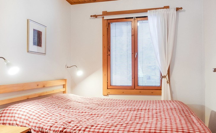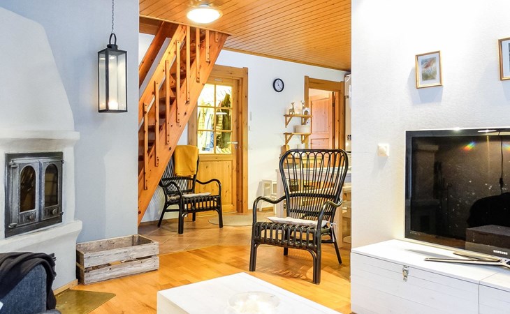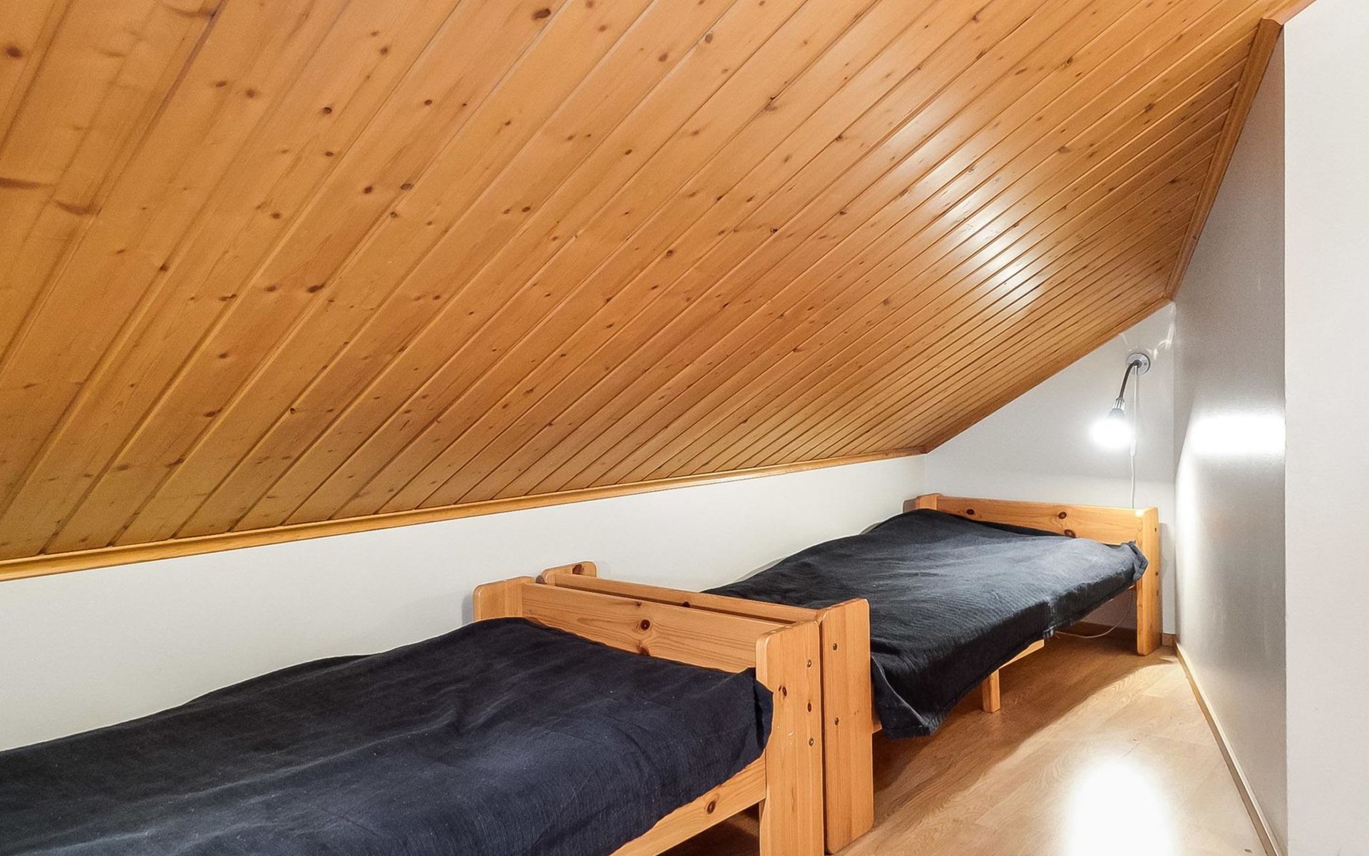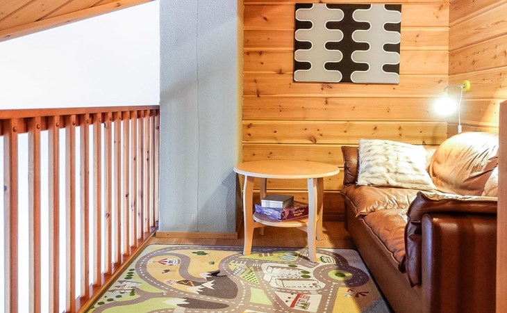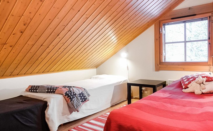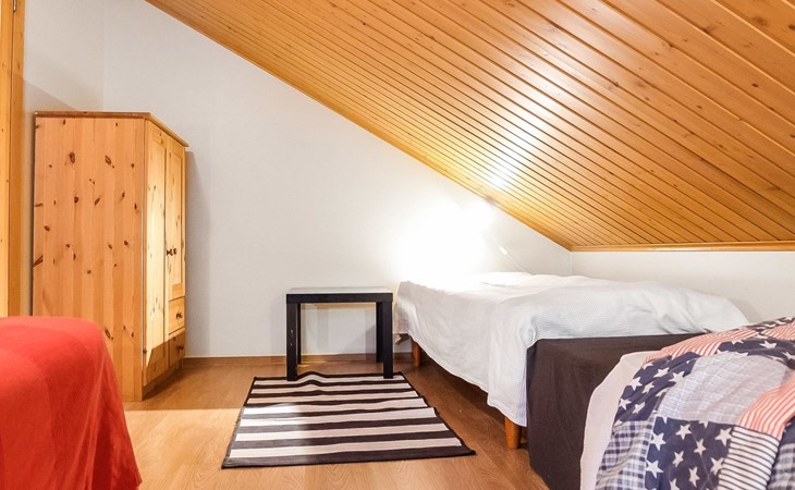 Living room/kitchen, one bedroom on the ground floor with double bed, two bedrooms in the upper floor, one with 2 beds and another with 3 beds, steep stairs lead to the upper floor, sloping ceilings in the bedrooms, spreadable sofa in the upstairs lobby. Sauna, washroom, separate WC, hall, and small covered terrace.