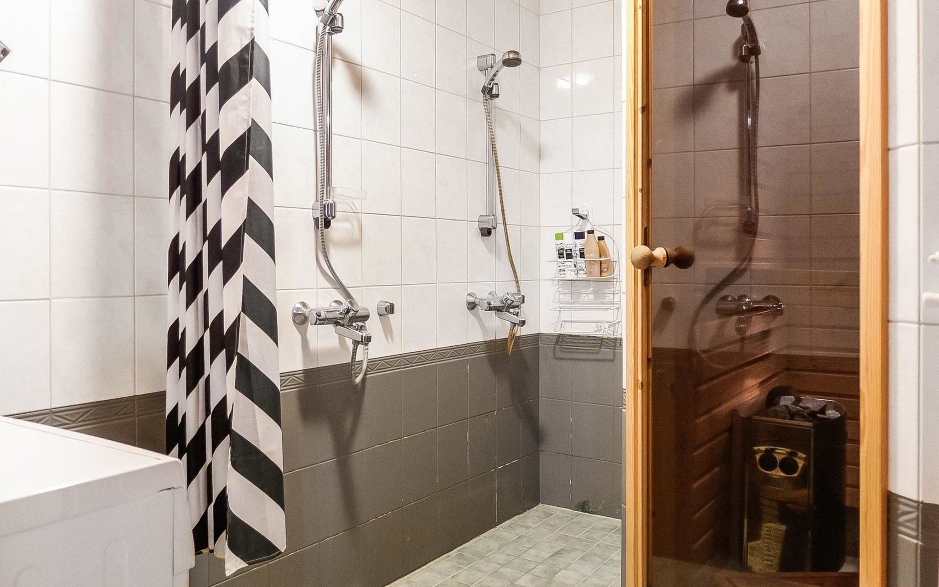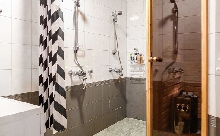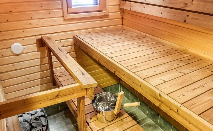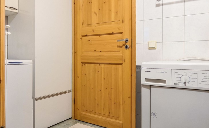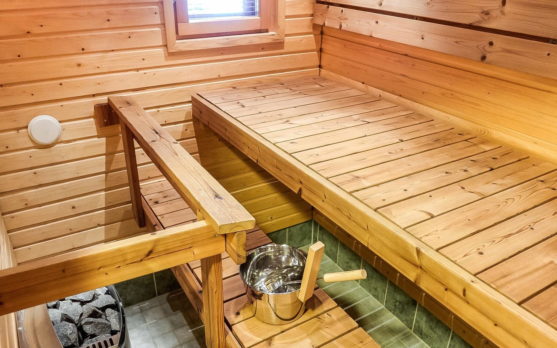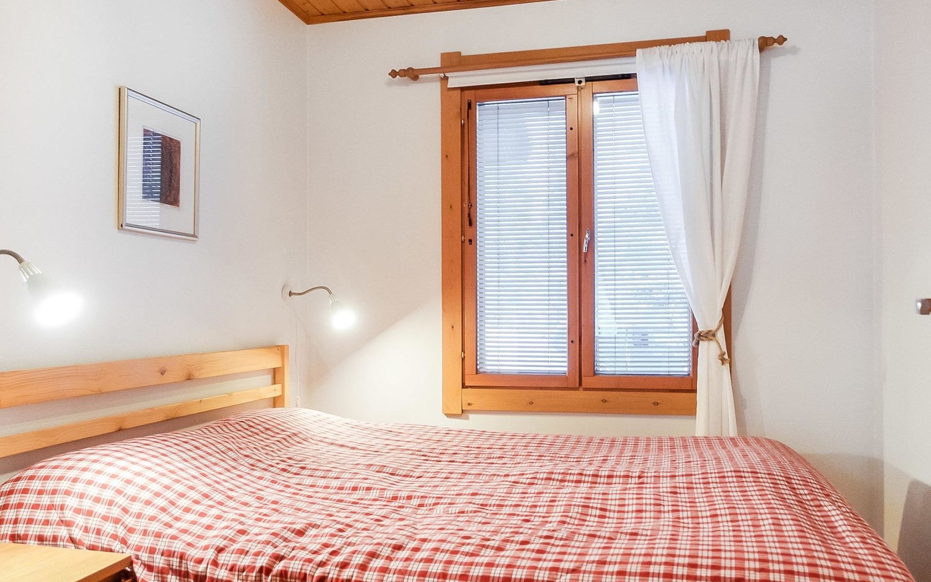 Living room/kitchen, one bedroom on the ground floor with double bed, two bedrooms in the upper floor, one with 2 beds and another with 3 beds, steep stairs lead to the upper floor, sloping ceilings in the bedrooms, spreadable sofa in the upstairs lobby. Sauna, washroom, separate WC, hall, and small covered terrace.