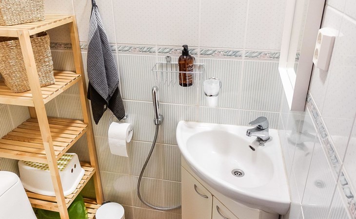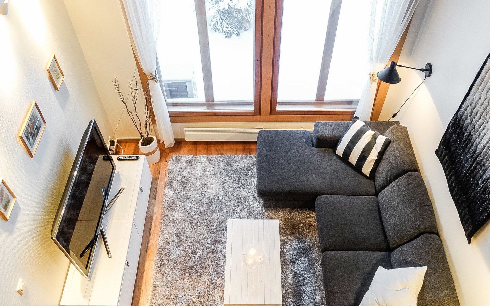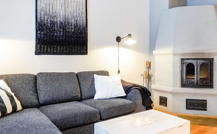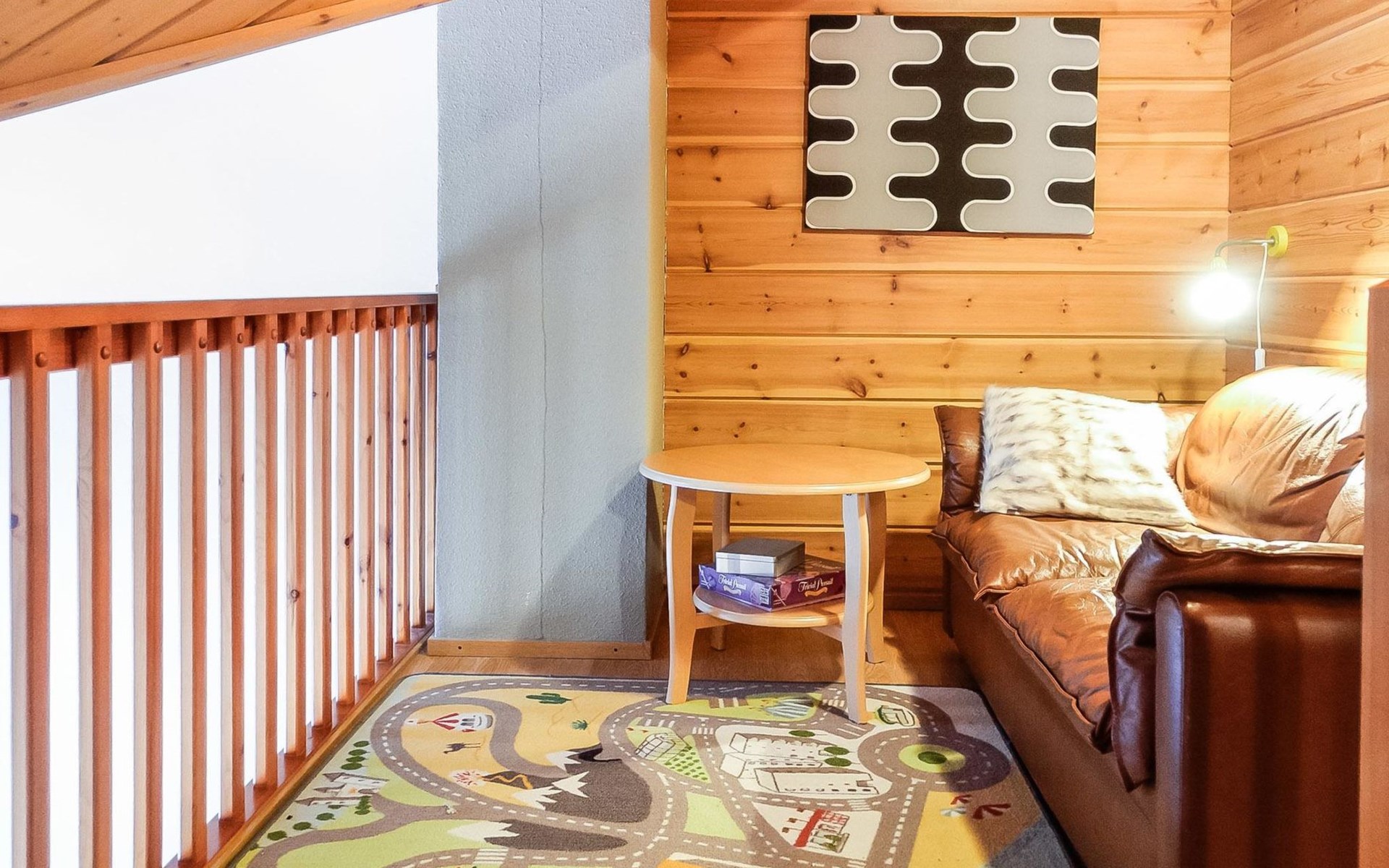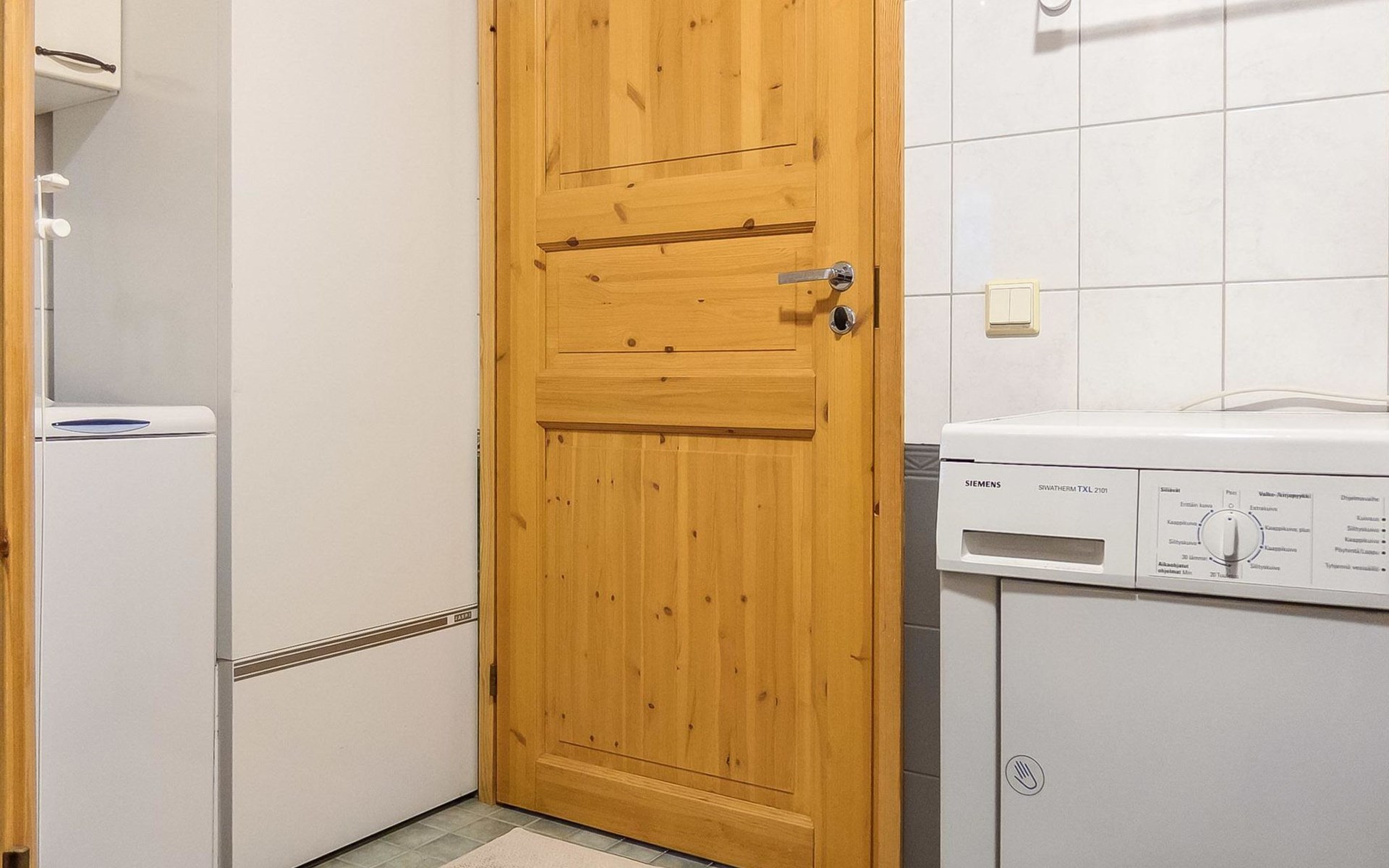Living room/kitchen, one bedroom on the ground floor with double bed, two bedrooms in the upper floor, one with 2 beds and another with 3 beds, steep stairs lead to the upper floor, sloping ceilings in the bedrooms, spreadable sofa in the upstairs lobby. Sauna, washroom, separate WC, hall, and small covered terrace.