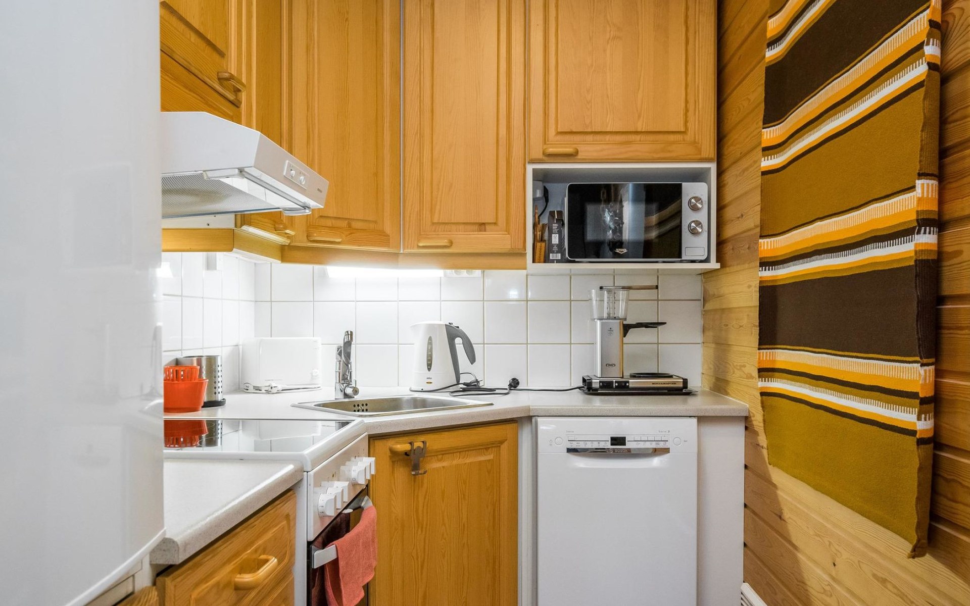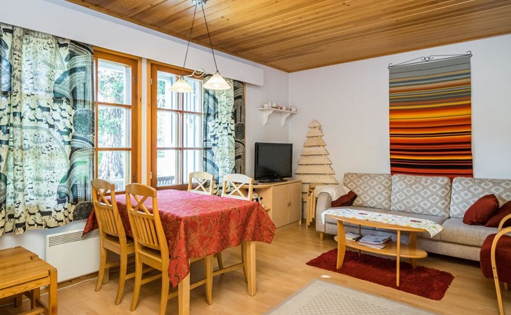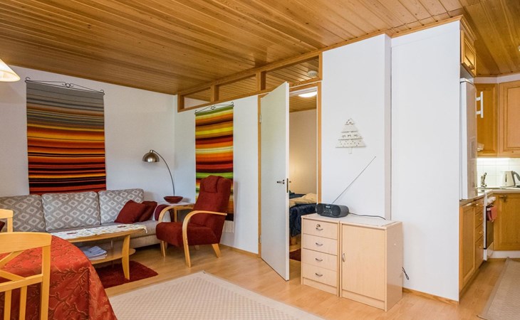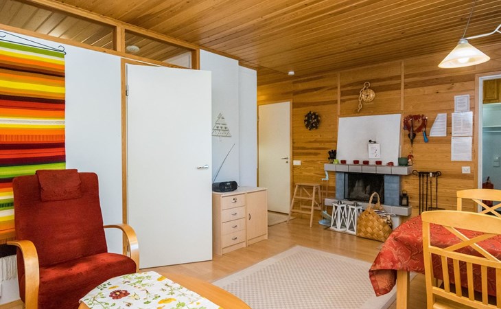 The kitchenette has its own corner with all the necessary utensils and equipment for cooking. The fireplace in the living room creates a cosy atmosphere for socialising and gathering. The apartment has its own terrace.