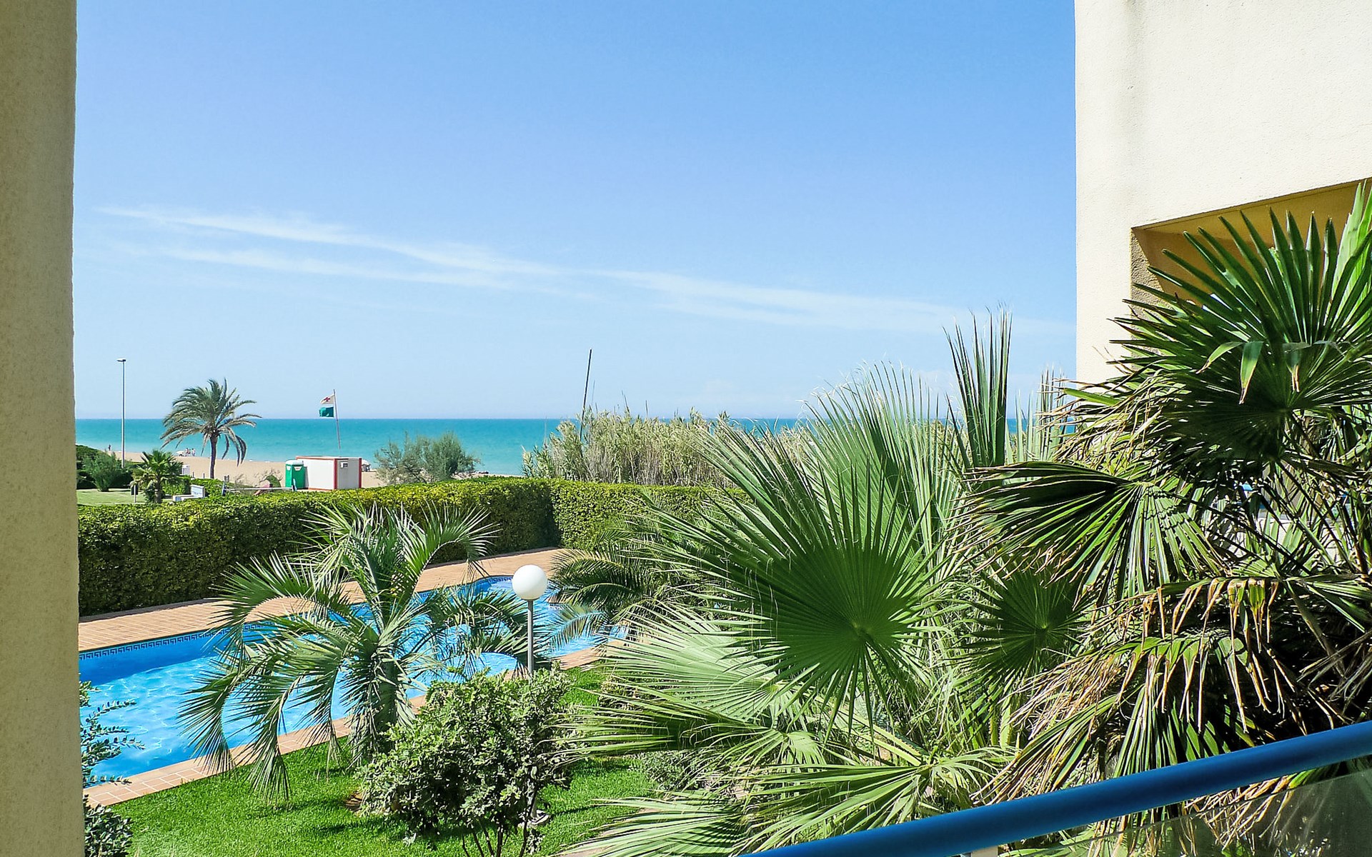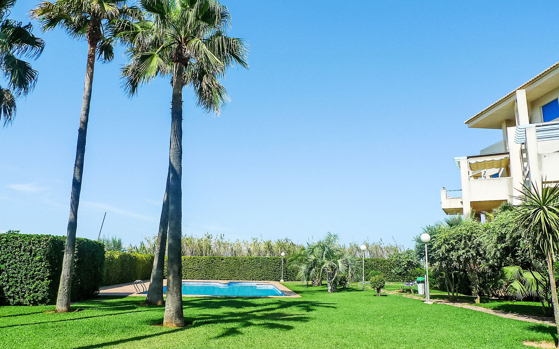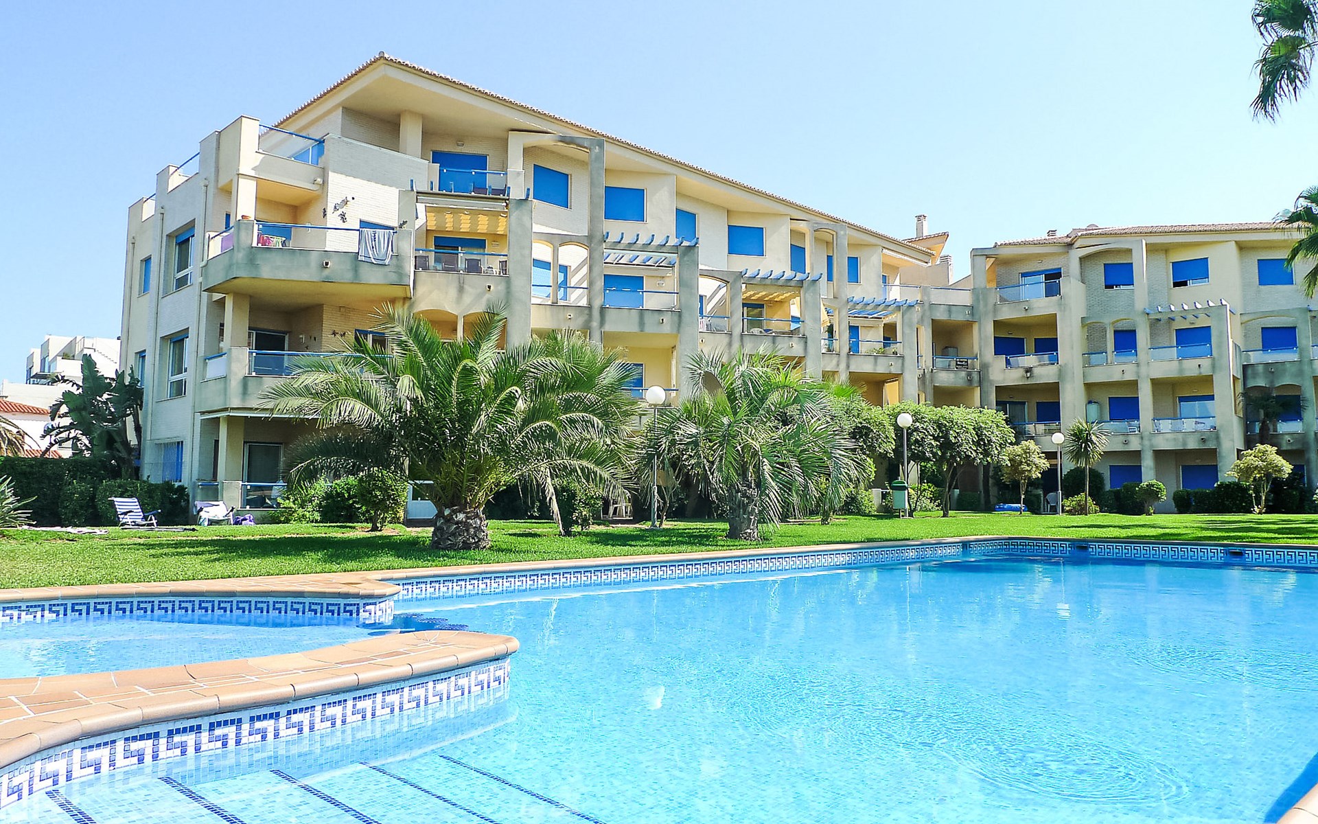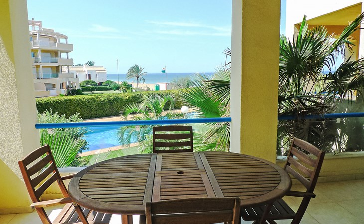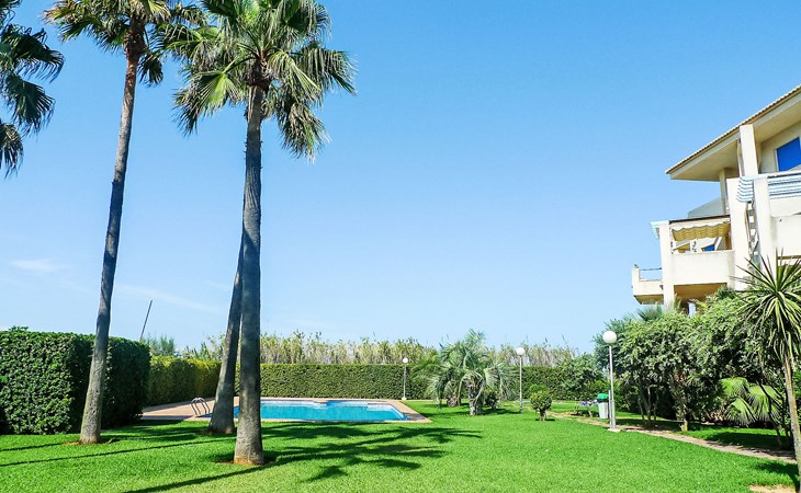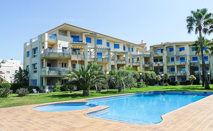 Apartment block "Las Dunas". 7 km from the centre of Dénia, 20 m from the sea, on the beach. For shared use: well-kept garden with lawn, swimming pool (9 x 16 m, seasonal availability: 01.Jan. - 31.Dec.) with internal staircase. In the house: lift. Parking on the premises. Supermarket 200 m, restaurant 300 m, bus stop 100 m, sandy beach 20 m. The owner does not accept any youth groups.