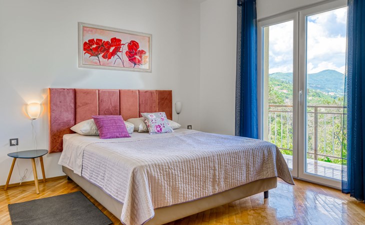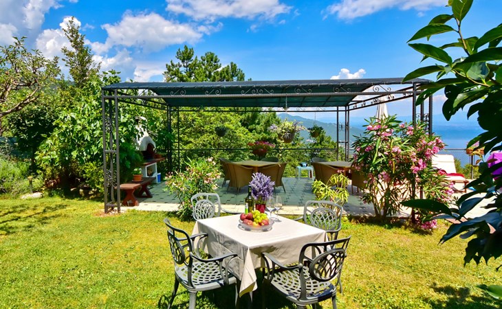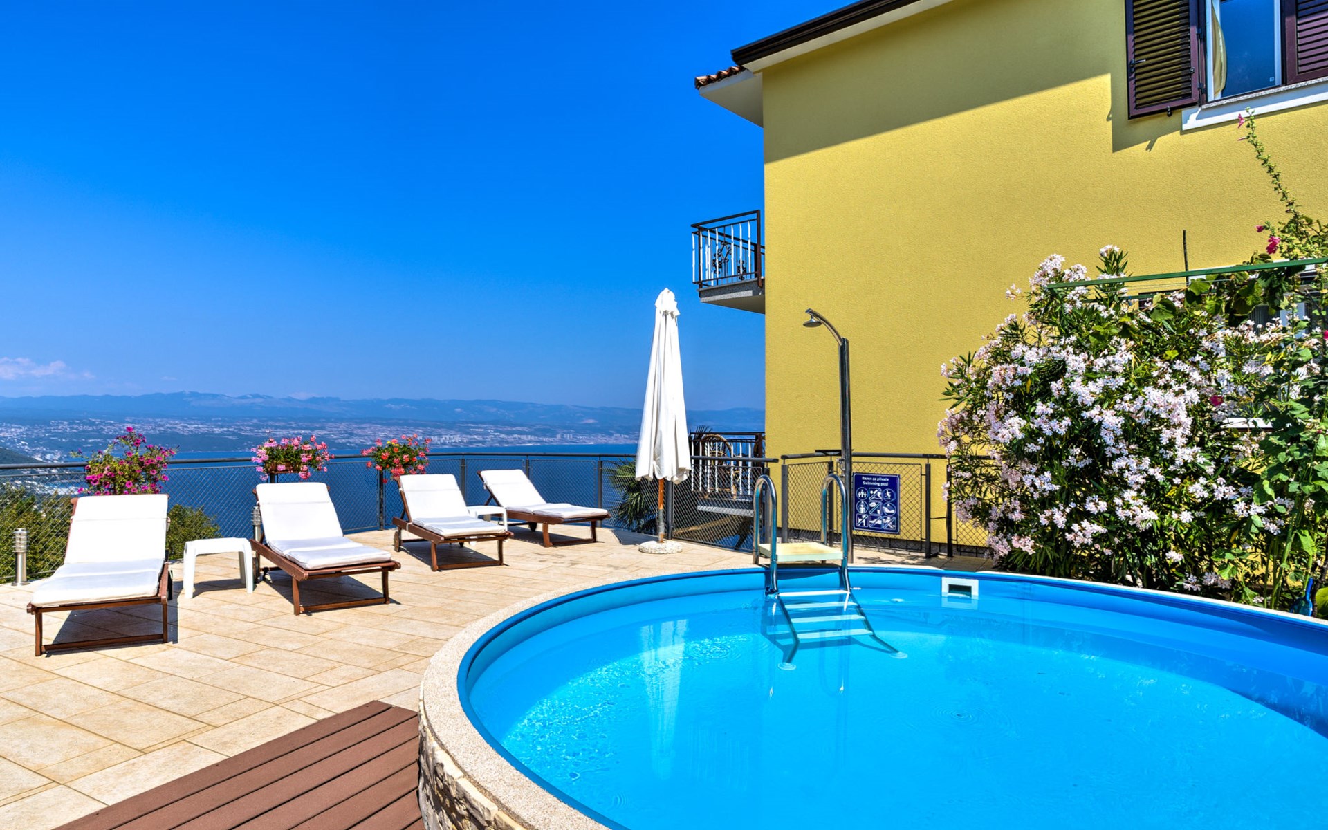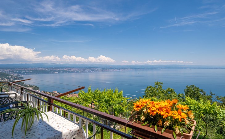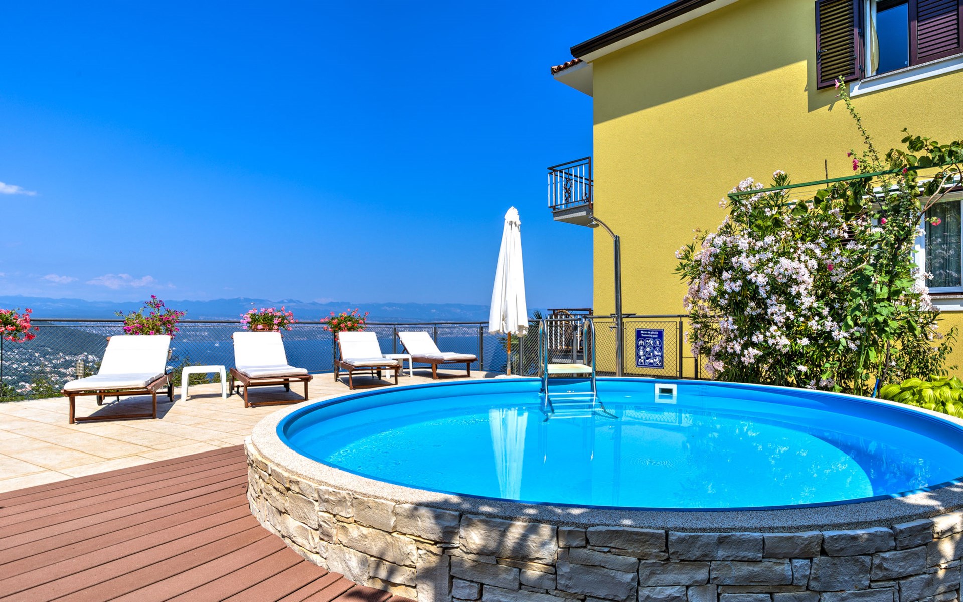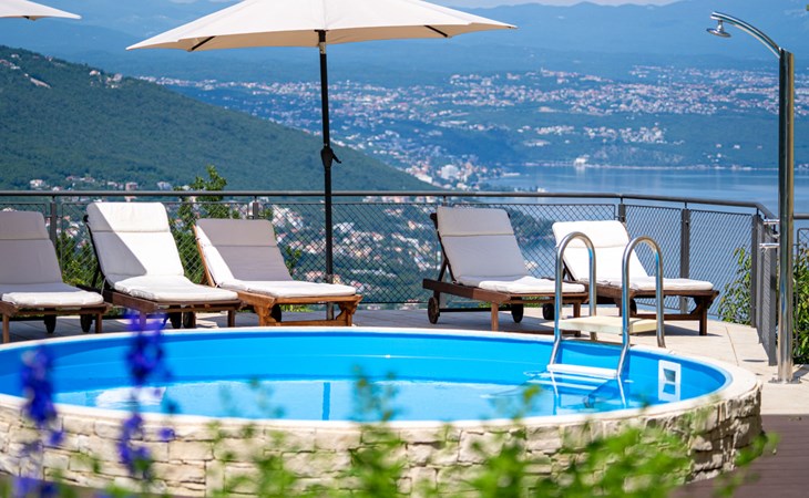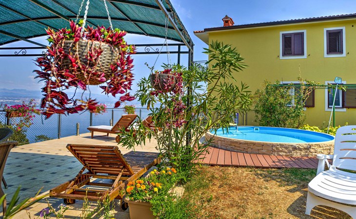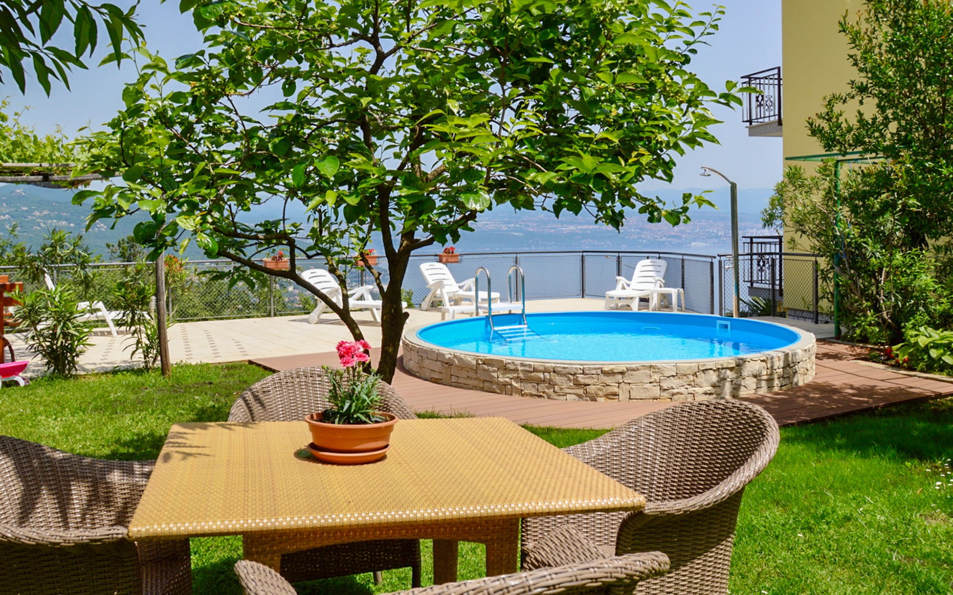 Tuliševica 5 km from Lovran: Apartment house "Laurus". Above Lovran, in the hamlet Tuliševica 8 km from the centre of Opatija, in a quiet, sunny position on a slope, 6 km from the sea, 6 km from the beach, in a cul-de-sac, in the countryside. For shared use: property 1'100 m2, lawn 200 m2, trees, swimming pool round (4 m diameter, depth 120 cm, seasonal availability: 01.May. - 15.Oct.). Terrace (30 m2), garden furniture, barbecue, children's playground (slide, swing). In the house: internet access, central heating system. Parking at the house on the premises. Shop 500 m, restaurant 1 km, bus stop 550 m, pebble beach 6 km, rocky beach 6 km, public bathing area 6 km. Tennis 6 km.