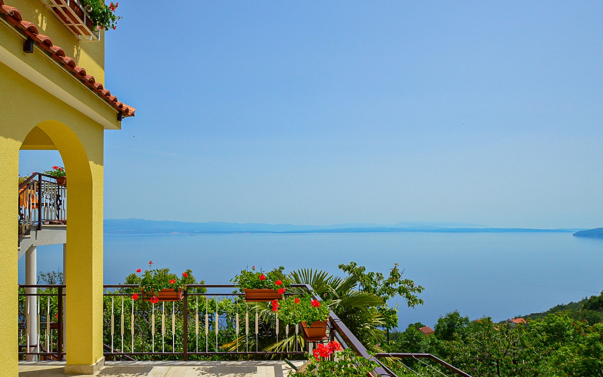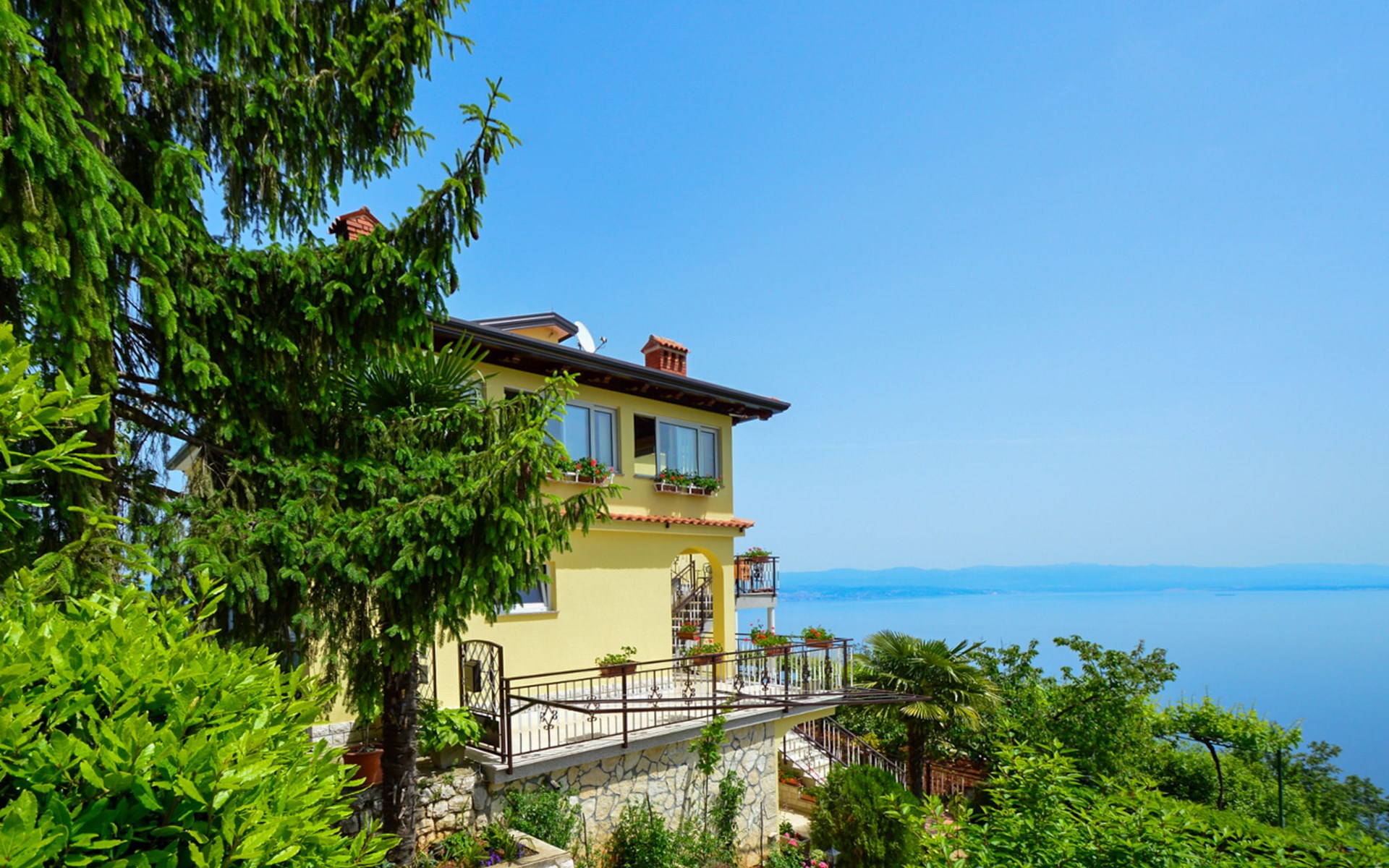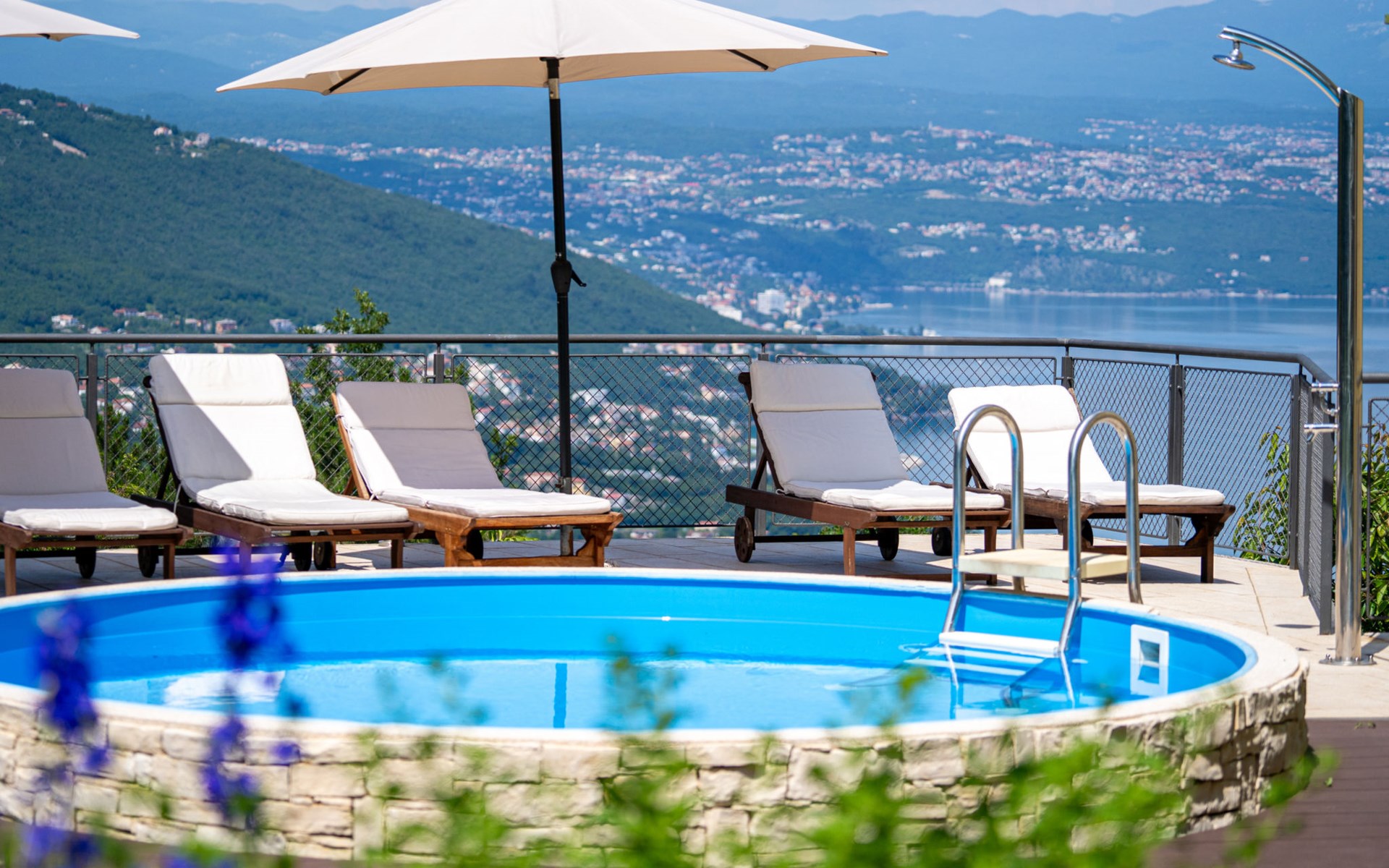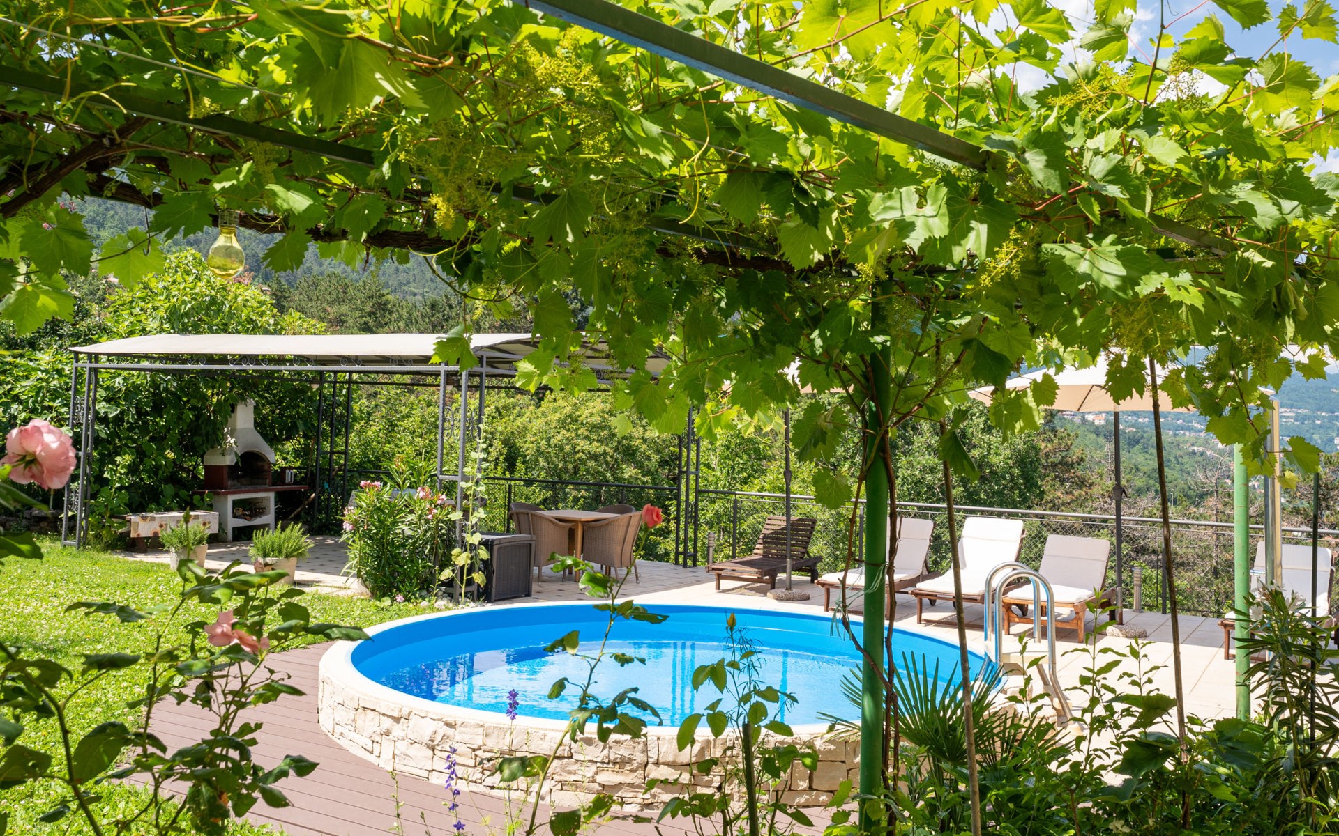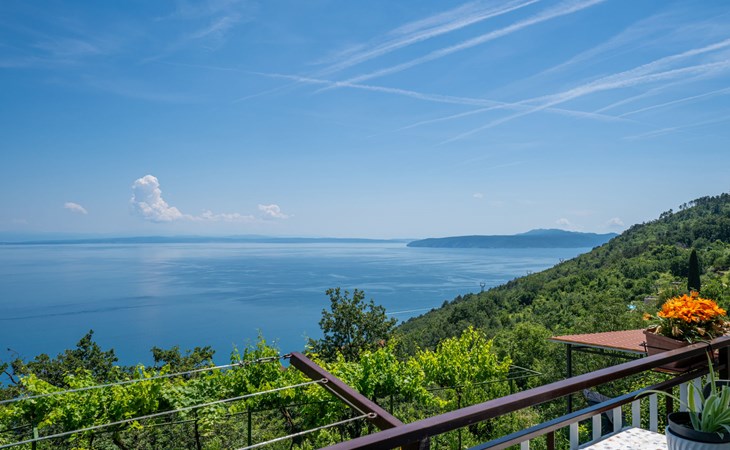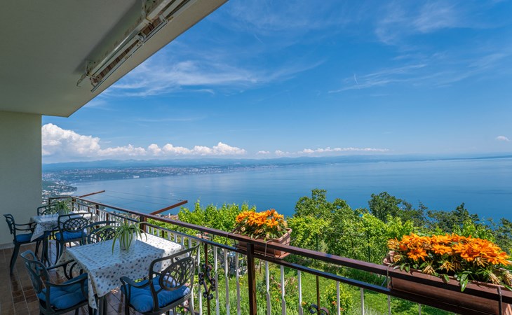 Tuliševica 5 km from Lovran: Apartment house "Laurus". Above Lovran, in the hamlet Tuliševica 8 km from the centre of Opatija, in a quiet, sunny position on a slope, 6 km from the sea, 6 km from the beach, in a cul-de-sac, in the countryside. For shared use: property 1'100 m2, lawn 200 m2, trees, swimming pool round (4 m diameter, depth 120 cm, seasonal availability: 01.May. - 15.Oct.). Terrace (30 m2), garden furniture, barbecue, children's playground (slide, swing). In the house: internet access, central heating system. Parking at the house on the premises. Shop 500 m, restaurant 1 km, bus stop 550 m, pebble beach 6 km, rocky beach 6 km, public bathing area 6 km. Tennis 6 km.