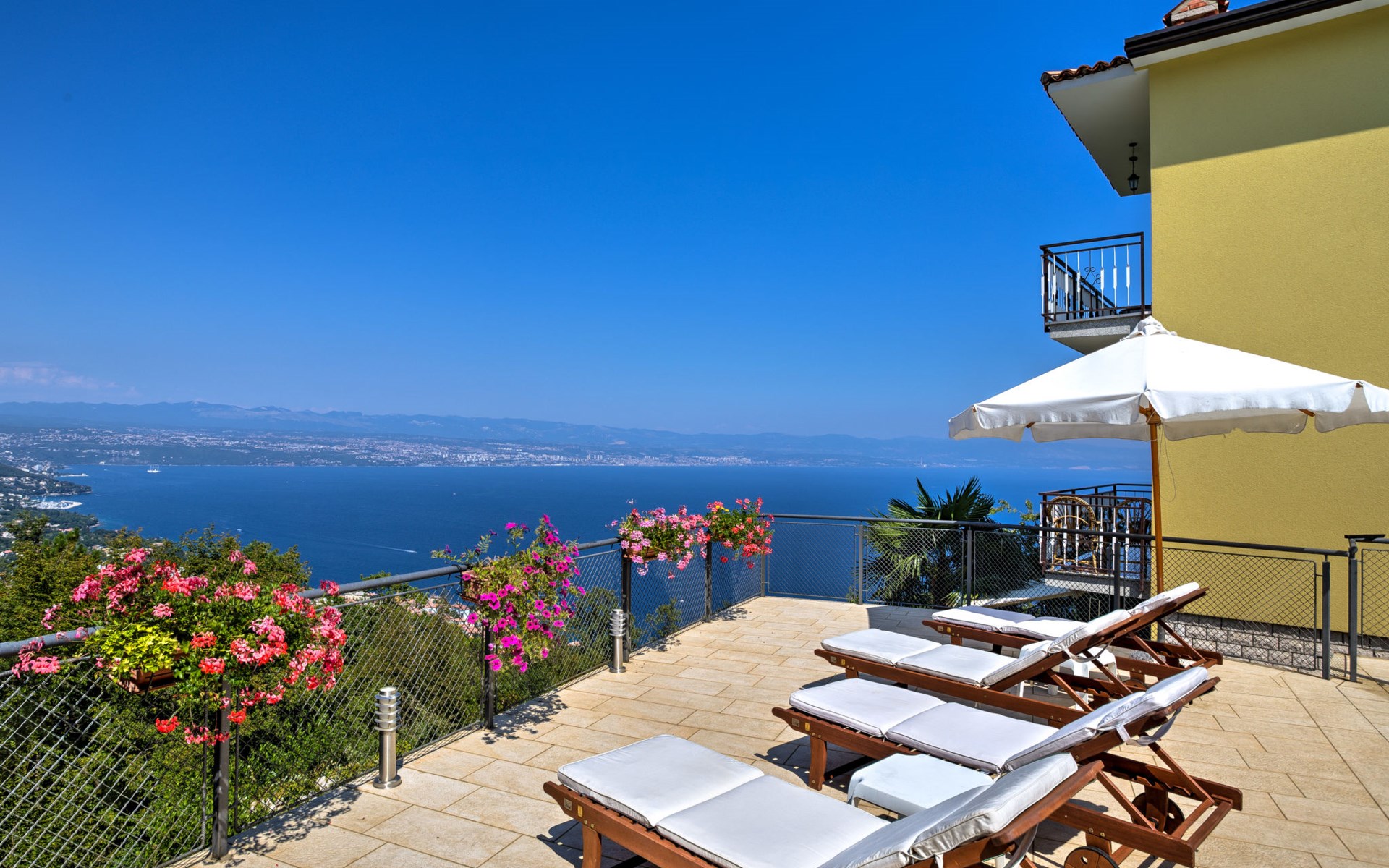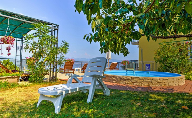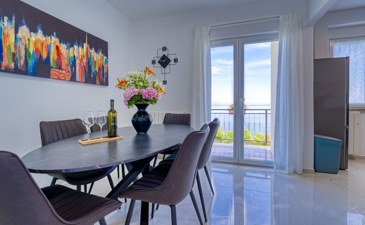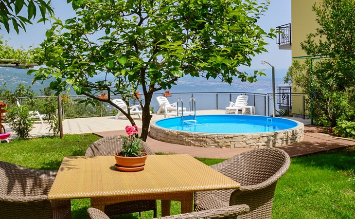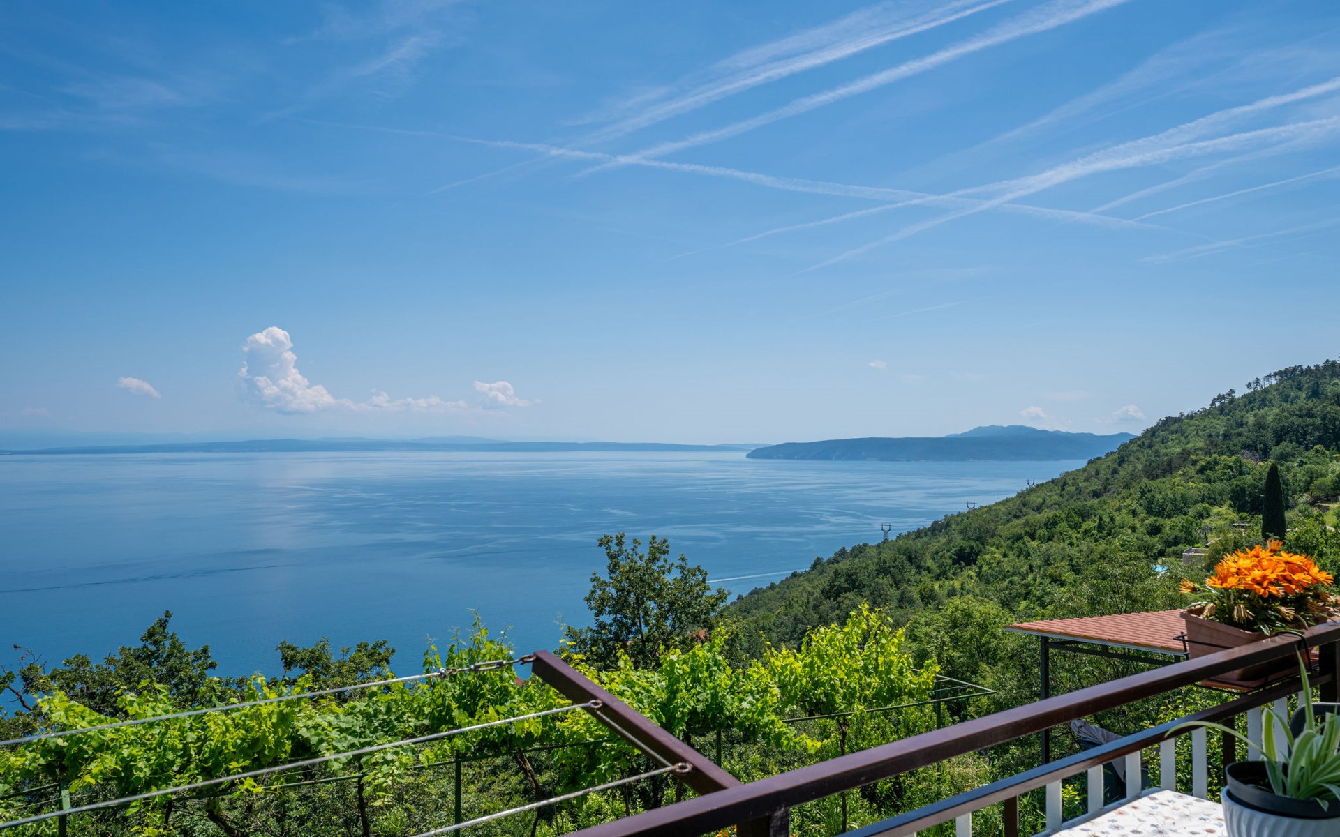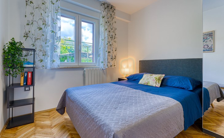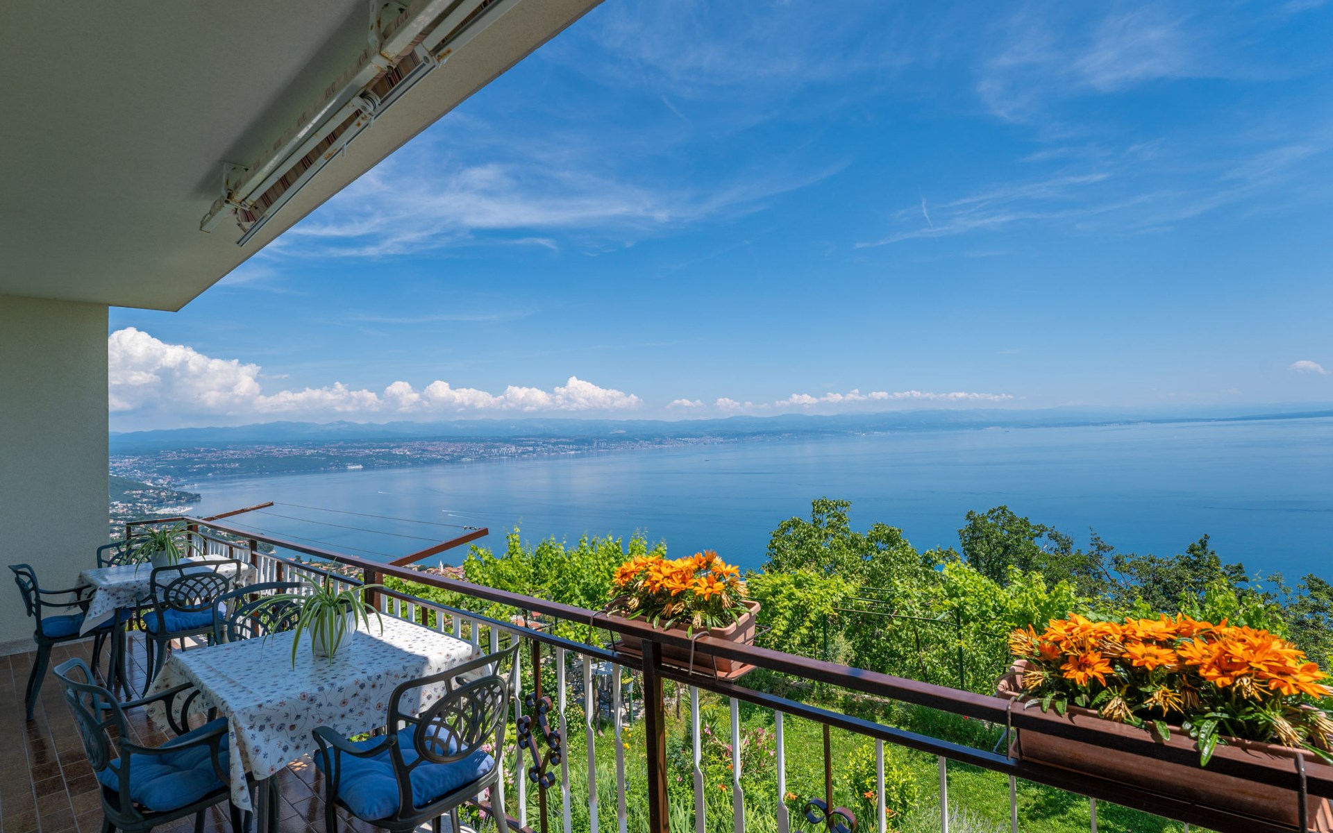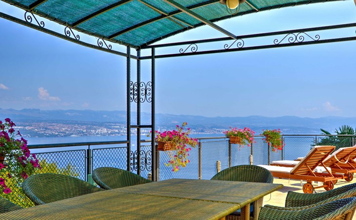 Tuliševica 5 km from Lovran: Apartment house "Laurus". Above Lovran, in the hamlet Tuliševica 8 km from the centre of Opatija, in a quiet, sunny position on a slope, 6 km from the sea, 6 km from the beach, in a cul-de-sac, in the countryside. For shared use: property 1'100 m2, lawn 200 m2, trees, swimming pool round (4 m diameter, depth 120 cm, seasonal availability: 01.May. - 15.Oct.). Terrace (30 m2), garden furniture, barbecue, children's playground (slide, swing). In the house: internet access, central heating system. Parking at the house on the premises. Shop 500 m, restaurant 1 km, bus stop 550 m, pebble beach 6 km, rocky beach 6 km, public bathing area 6 km. Tennis 6 km.