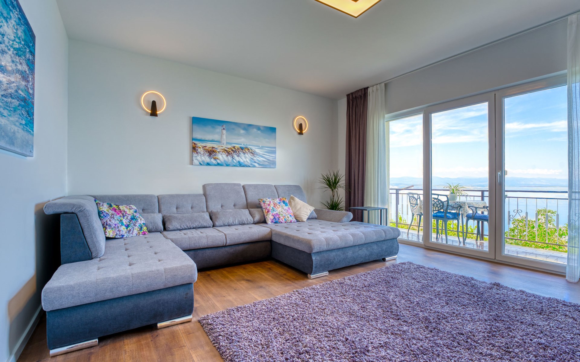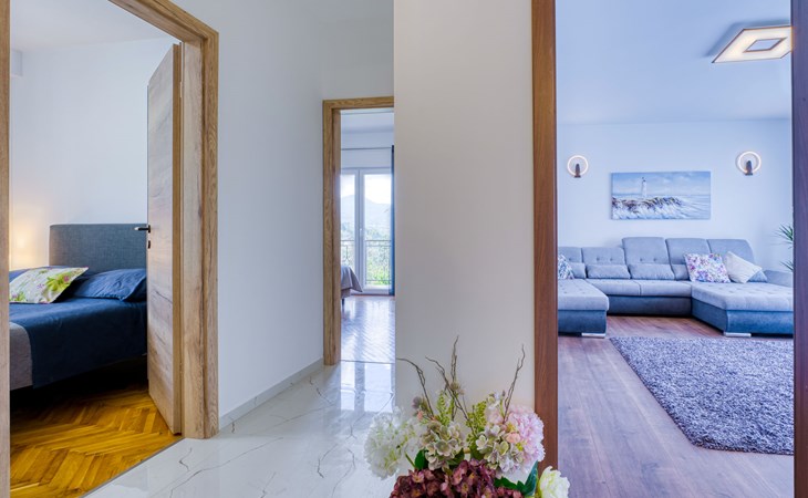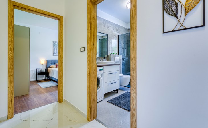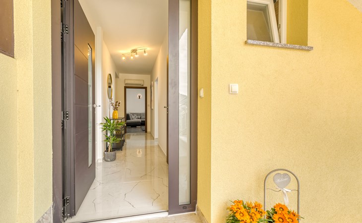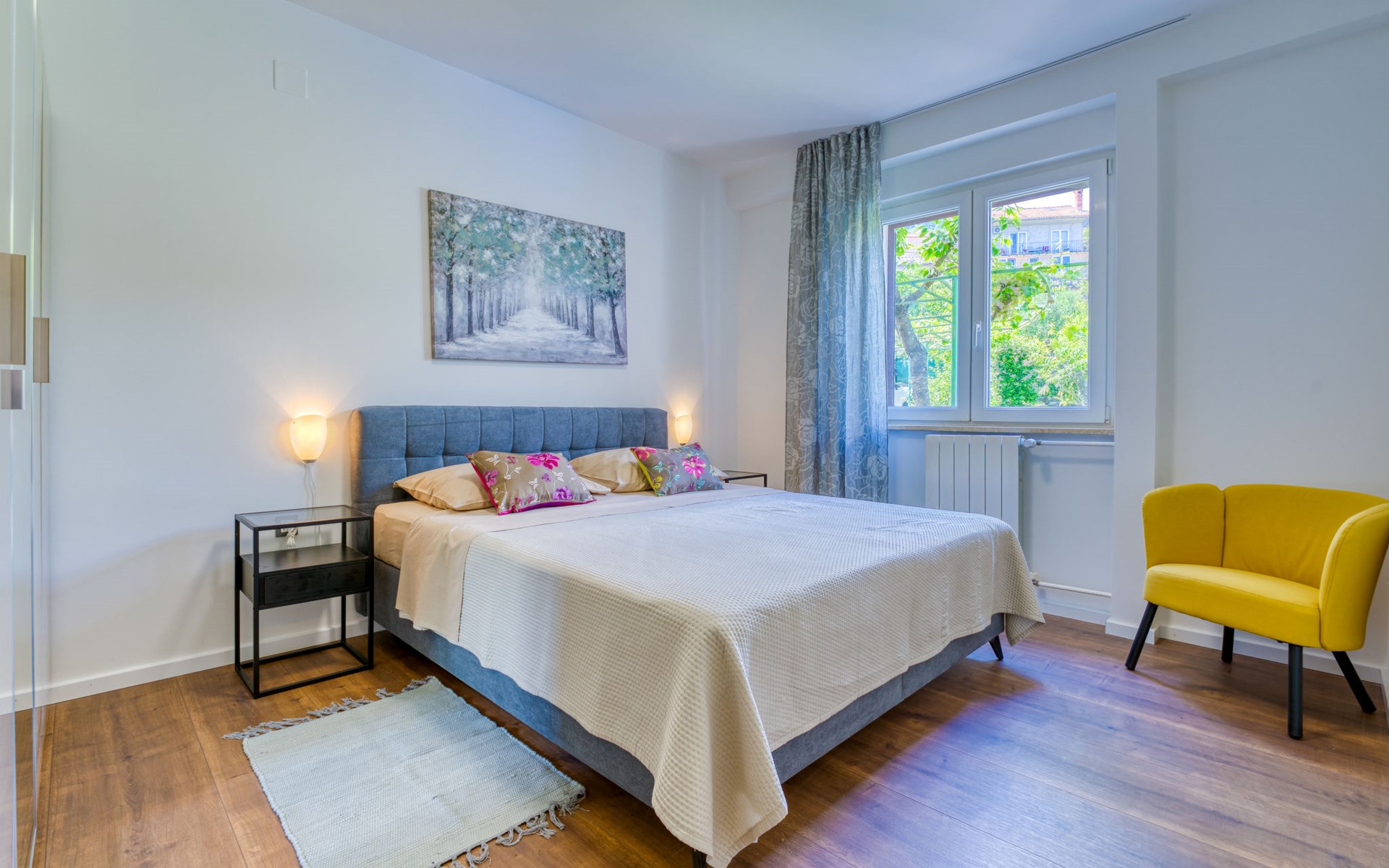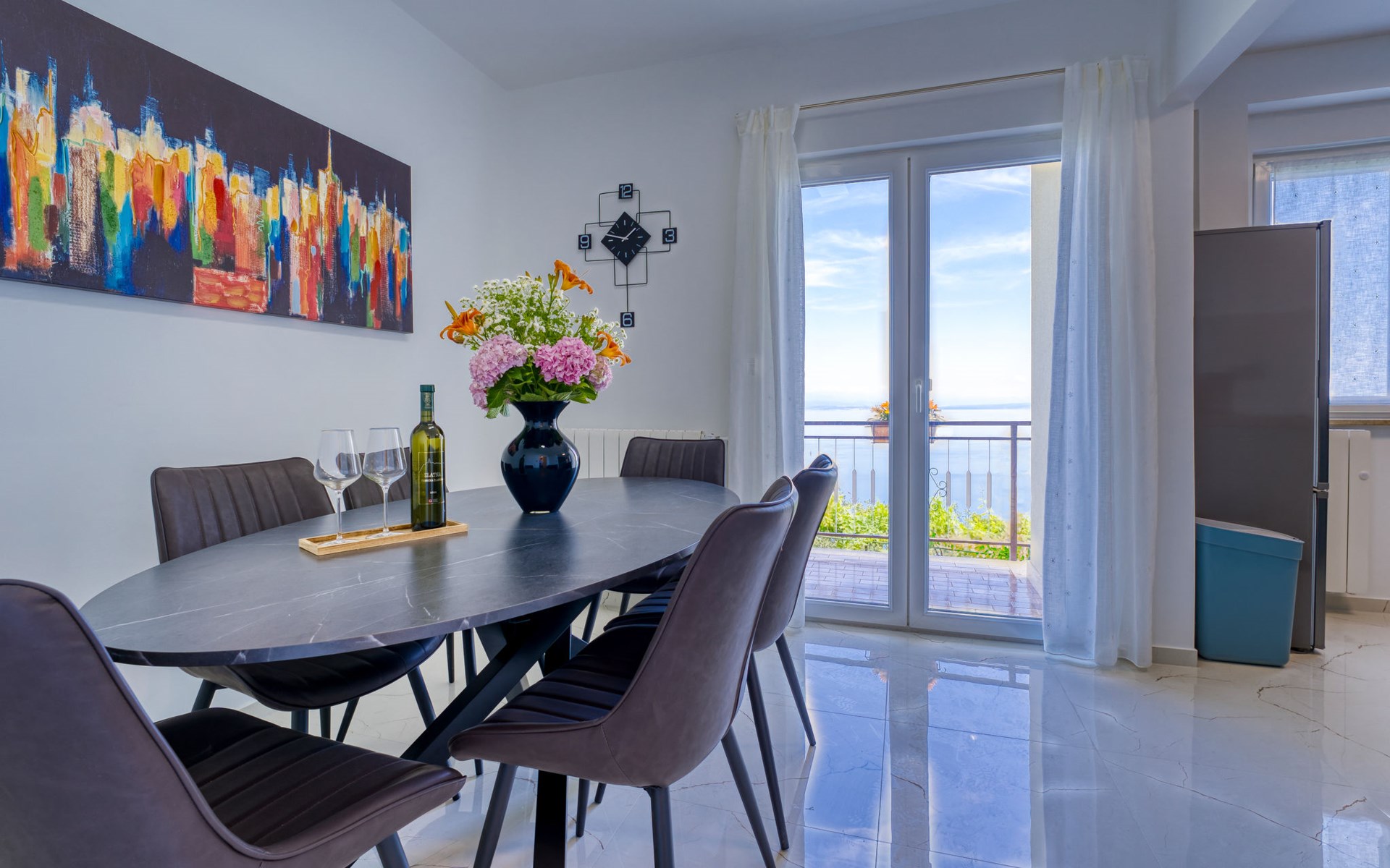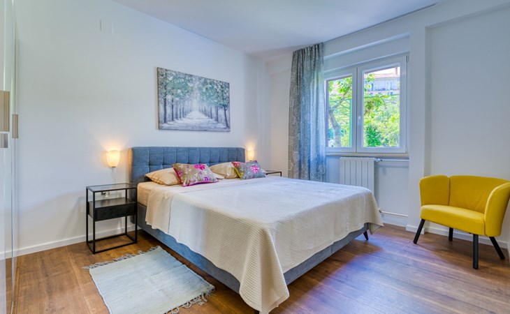 Tuliševica 5 km from Lovran: Apartment house "Laurus". Above Lovran, in the hamlet Tuliševica 8 km from the centre of Opatija, in a quiet, sunny position on a slope, 6 km from the sea, 6 km from the beach, in a cul-de-sac, in the countryside. For shared use: property 1'100 m2, lawn 200 m2, trees, swimming pool round (4 m diameter, depth 120 cm, seasonal availability: 01.May. - 15.Oct.). Terrace (30 m2), garden furniture, barbecue, children's playground (slide, swing). In the house: internet access, central heating system. Parking at the house on the premises. Shop 500 m, restaurant 1 km, bus stop 550 m, pebble beach 6 km, rocky beach 6 km, public bathing area 6 km. Tennis 6 km.