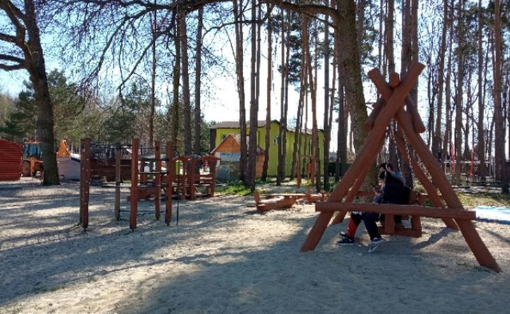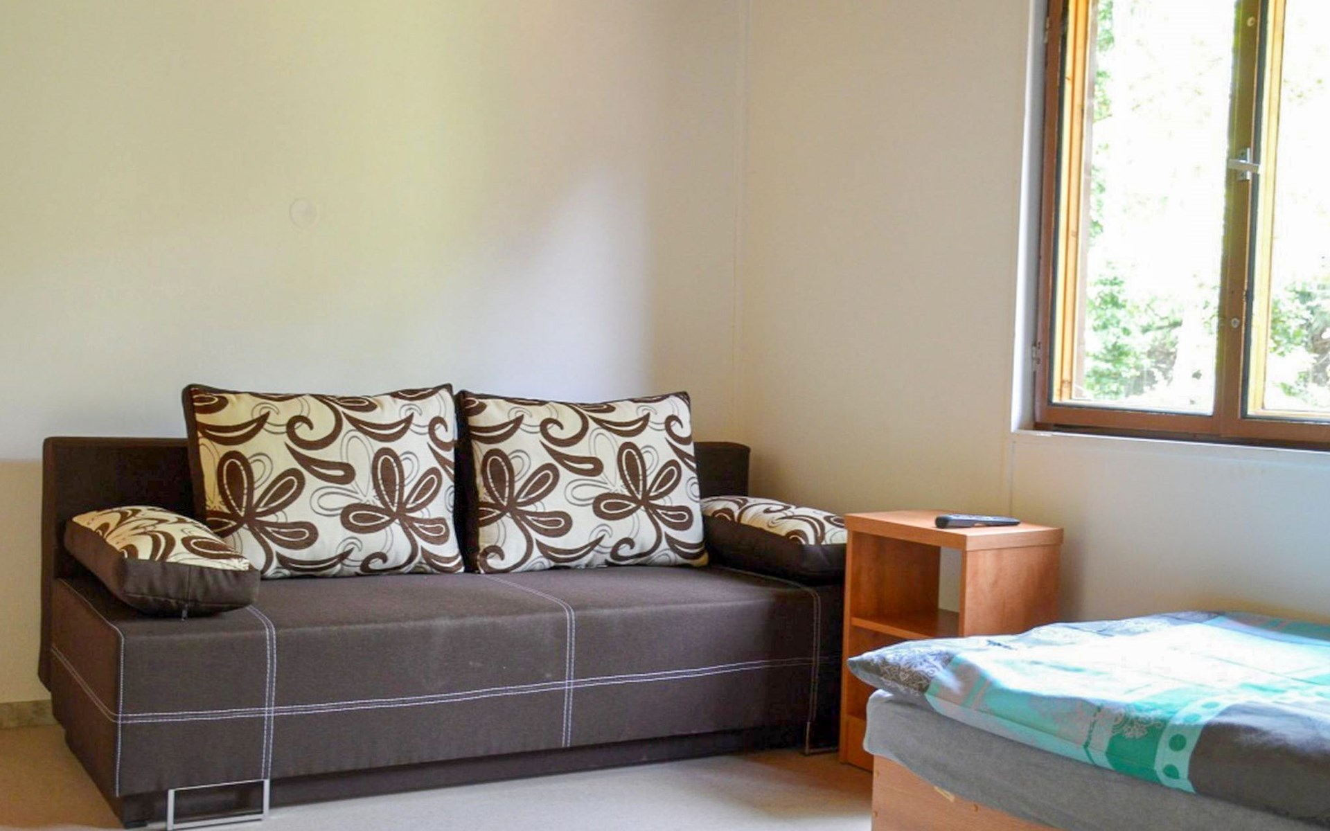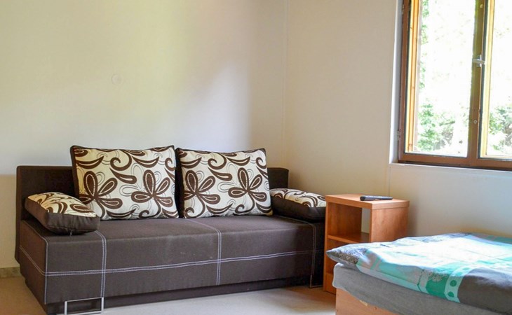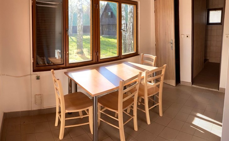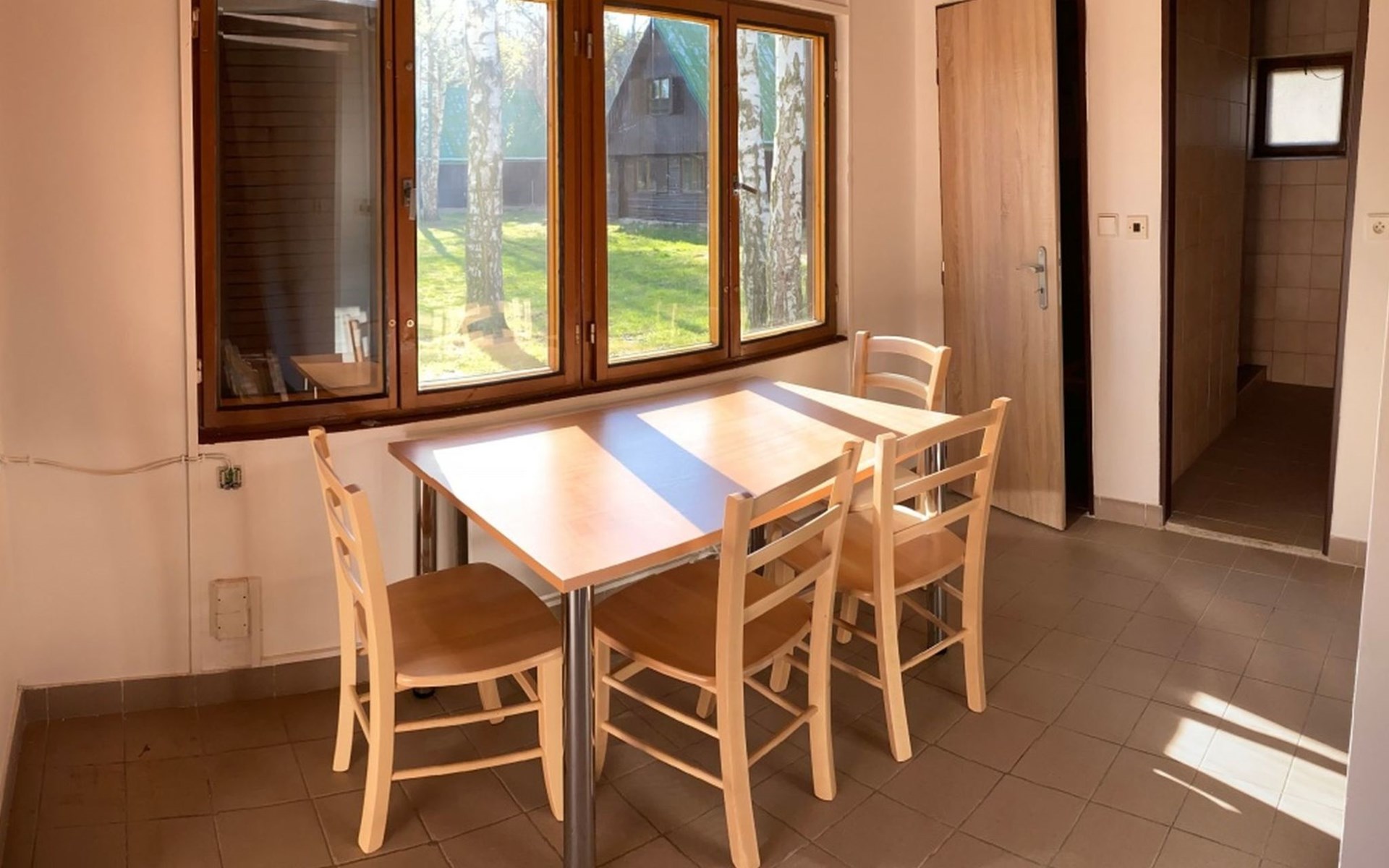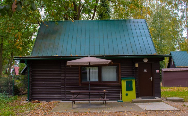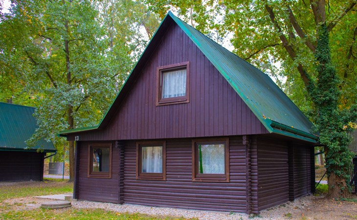 Child friendly holiday village "Kemp Stříbrný rybník". 25 houses in the resort. In the district of Malšova Lhota, 5 km from the centre of Hradec Králové, along the wooded area, on the lake. For shared use: property. Table tennis, boccia (extra), beach volleyball, arbour, barbecue, fireplace, children's playground, bathing jetty. In the complex: reception, restaurant, bar, bistro, playroom, washing machine (for shared use, extra), bicycle rental. Parking on the premises. Bus stop "Stříbrný rybník" 700 m, railway station "Blešno" 5 km, sandy beach, bathing lake 50 m. Sports harbour, minigolf, sports centre, walking paths from the house, cycle lane, fishing possibilities 50 m. Nearby attractions: Adventure park Firmsport, Gladiator race arena, letní kino, tutistický vláček do lesa, Stezka siluet, Rytířské hradiště 3 km, Park Na Větvi 3 km, Obory se zvěří 4.2 km, Obří akvárium, Botanická zahrada 4.7 km. Hiking paths: Pohádková, Vodnická stezka 6 km, Planetárium, planetární stezka 8.4 km, Zoopark Stěžery, Rozhledna Milíř 15 km. Please note: entertainment in the season. Suitable for families. Fishing [permit required]. The photograph shows a typical example.