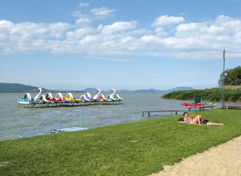 Balatonmáriafürdő: Modern, cosy apartment block. In a sunny position, 70 m from the lake. For shared use: well-kept garden 500 m2 (fenced), lawn for sunbathing, swimming pool angular (7 x 4 m, depth 120 cm, seasonal availability: 01.May. - 01.Oct.) with internal staircase. Pergola, garden furniture, barbecue (swing). In the house: WiFi, air conditioning (extra). Grocery 1 km, restaurant 180 m, grass beach 70 m. Please note: Additional accommodations can be booked.