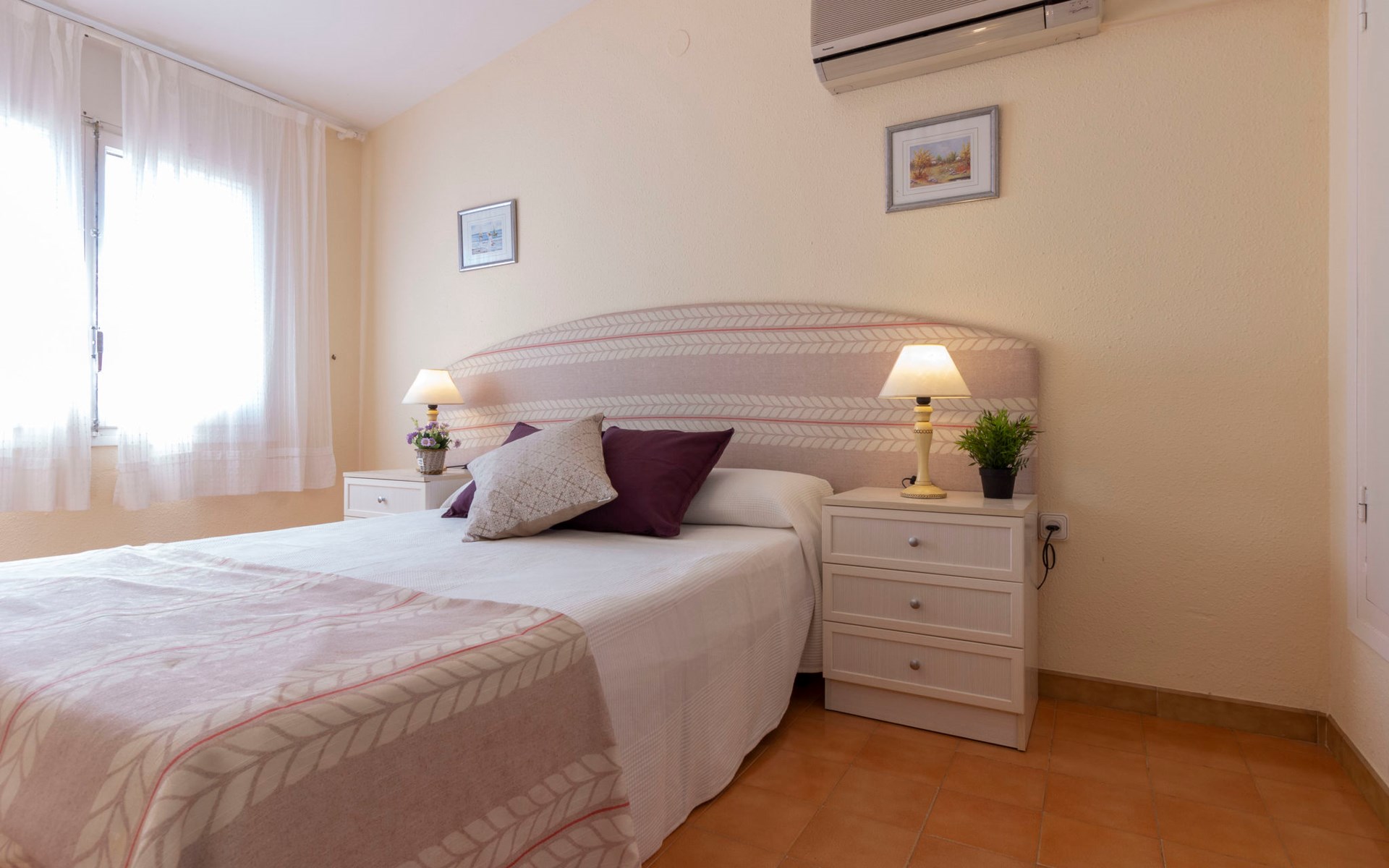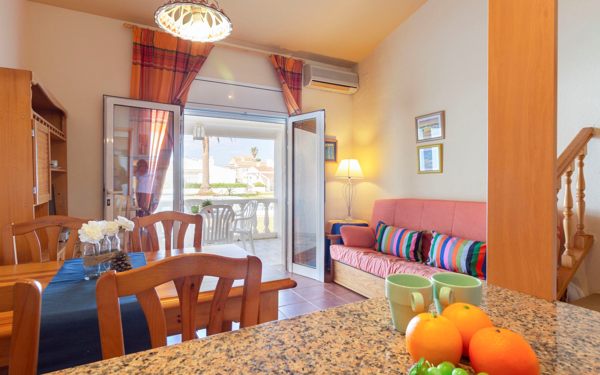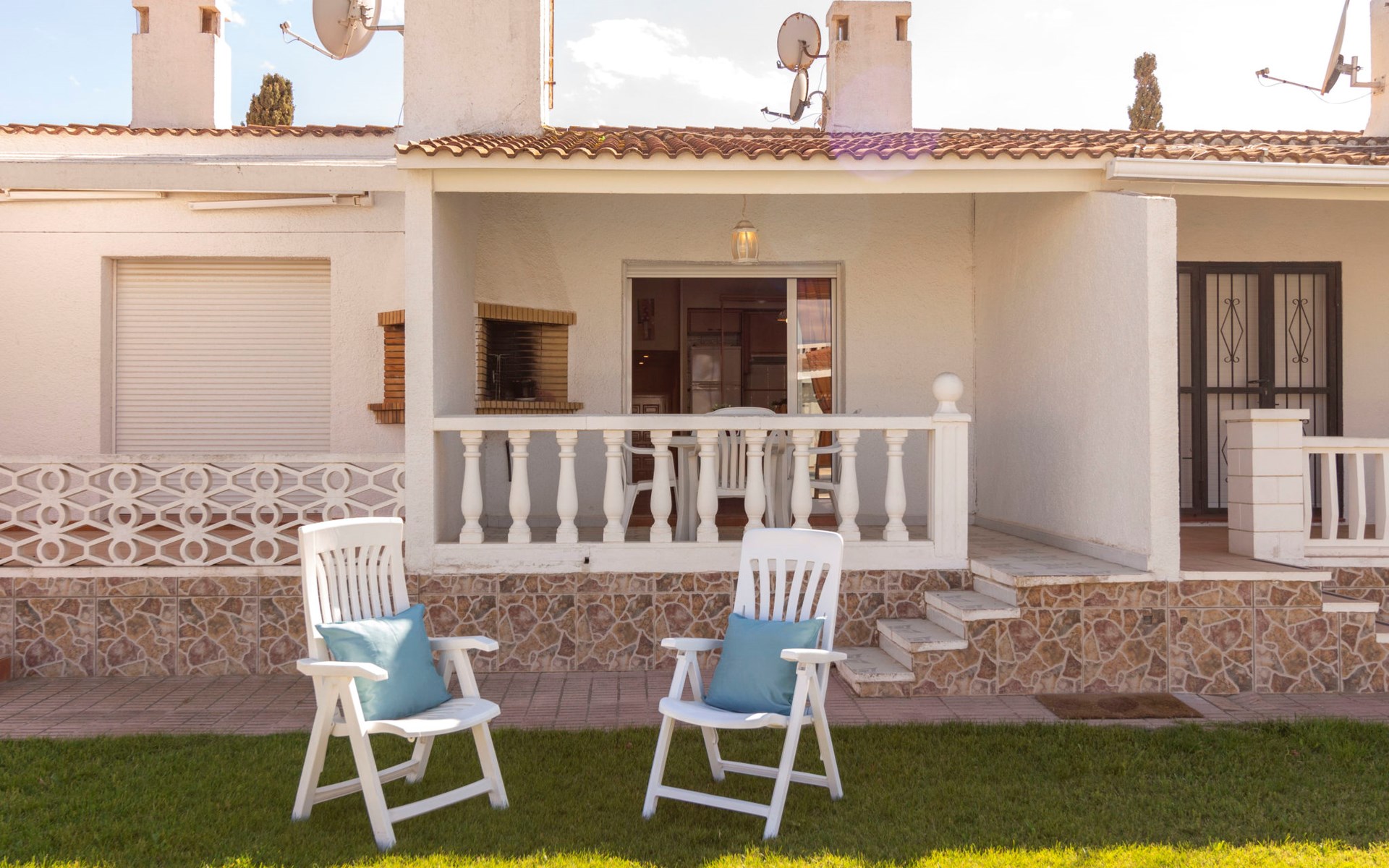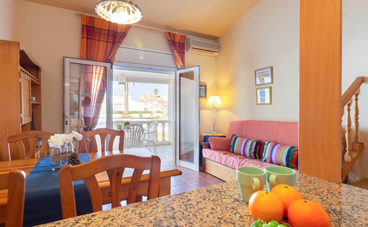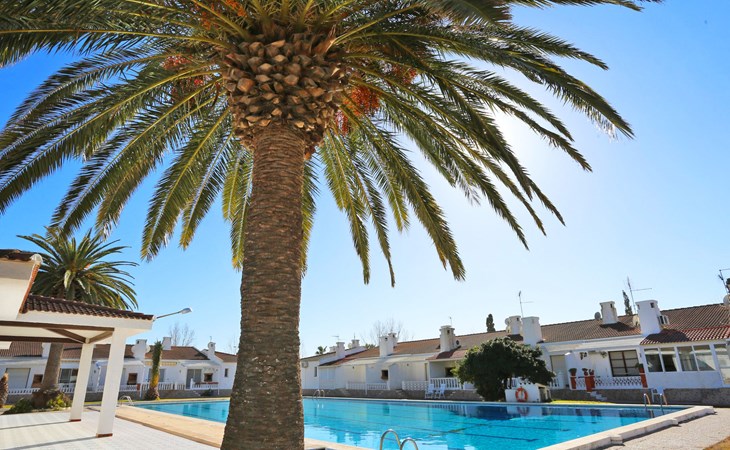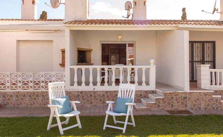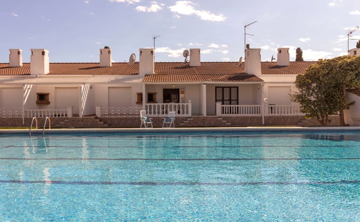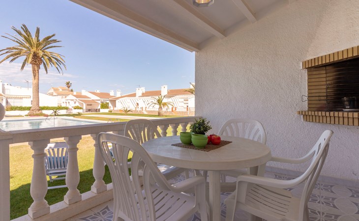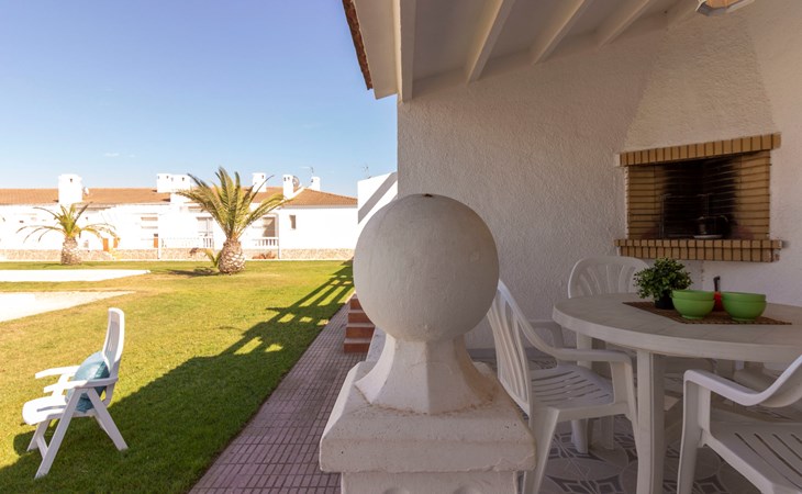 Riumar 10 km from Deltebre: Simple, comfortable terraced house "Salvagina 53", 2 storeys. In a quiet, sunny position, 300 m from the sea, 300 m from the beach. For shared use: large garden with lawn, swimming pool angular (25 x 12 m, depth 80 - 220 cm, seasonal availability: 01.Apr. - 31.Oct.). WC in the pool area, outdoor shower, boccia. Private: pergola, terrace, barbecue. In the complex: bar, internet café, WiFi, air conditioning, washing machine. Parking at the house. Supermarket 500 m, restaurant, bar 300 m, bakery 700 m, bus stop "Riumar" 650 m, railway station "Aldea- Amposta" 25 km, sandy beach "Riumar" 300 m. Sports harbour 1 km. Nearby attractions: Parque natural Delta del Ebro 2 km, Tortosa 35 km, Playa el Trabucador 29 km, Barcelona 190 km, Port Aventura 70 km. Hiking paths: Parque natural Puerto Tortosa Beseit 52 km, GR 92 15 km. Please note: car recommended. Suitable for families.
