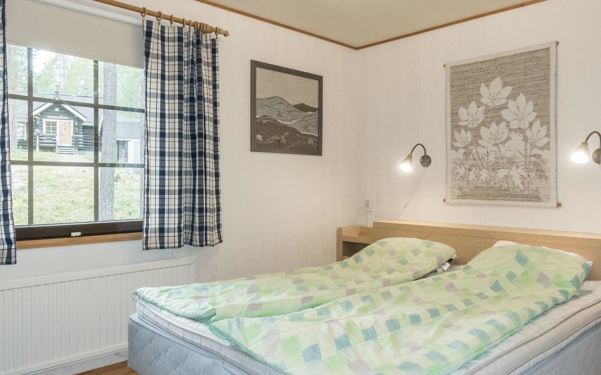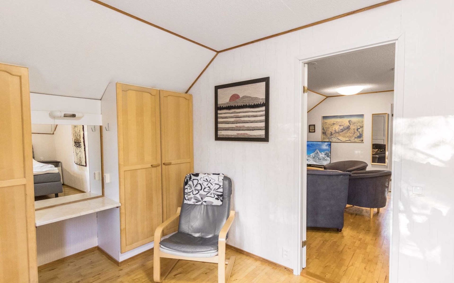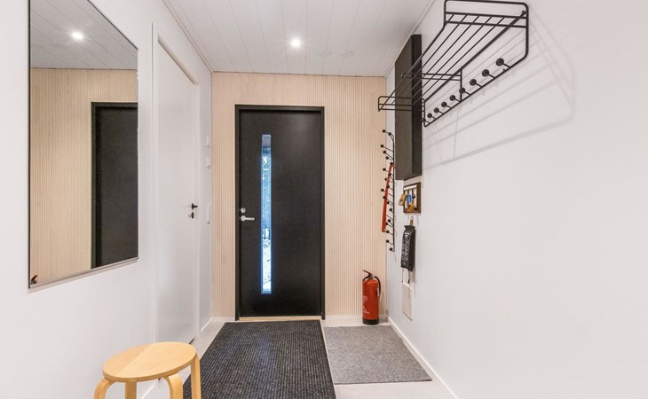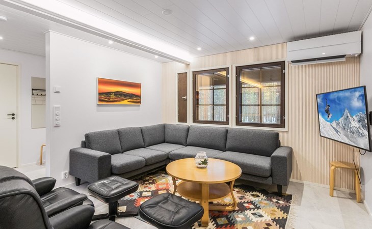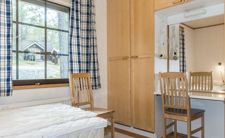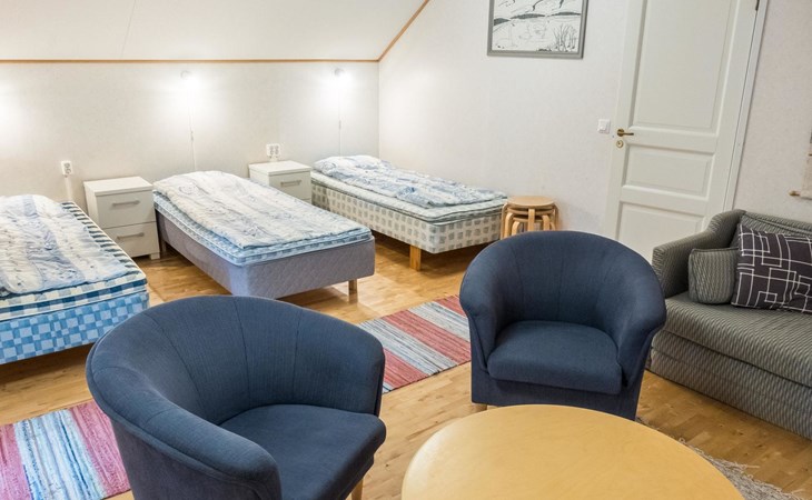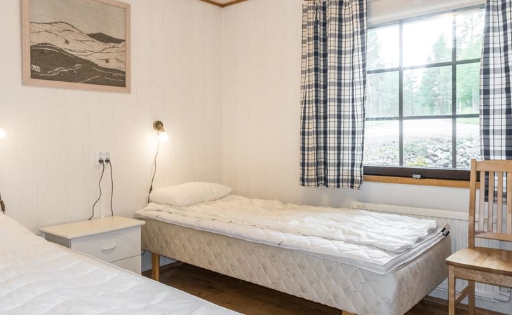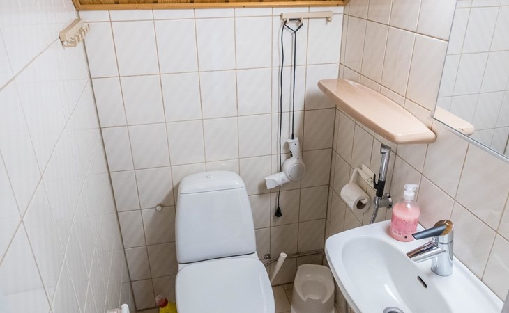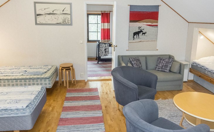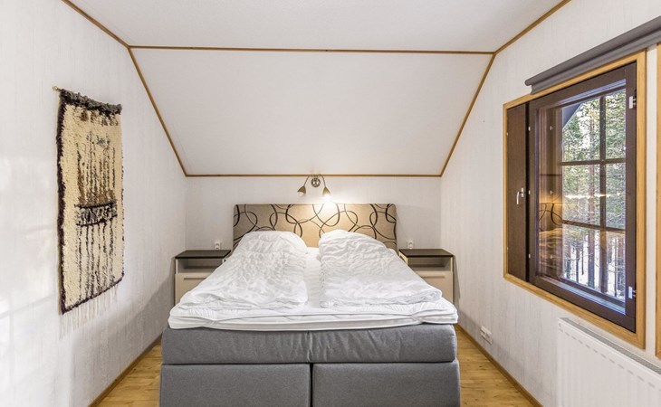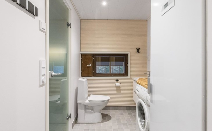 On the ground floor living room/kitchen, bedroom with two beds, another bedroom with double bed (2 beds made into a double bed with common mattress pad). Sauna, washroom and separate toilet, as well as a utility room with a toilet seat.