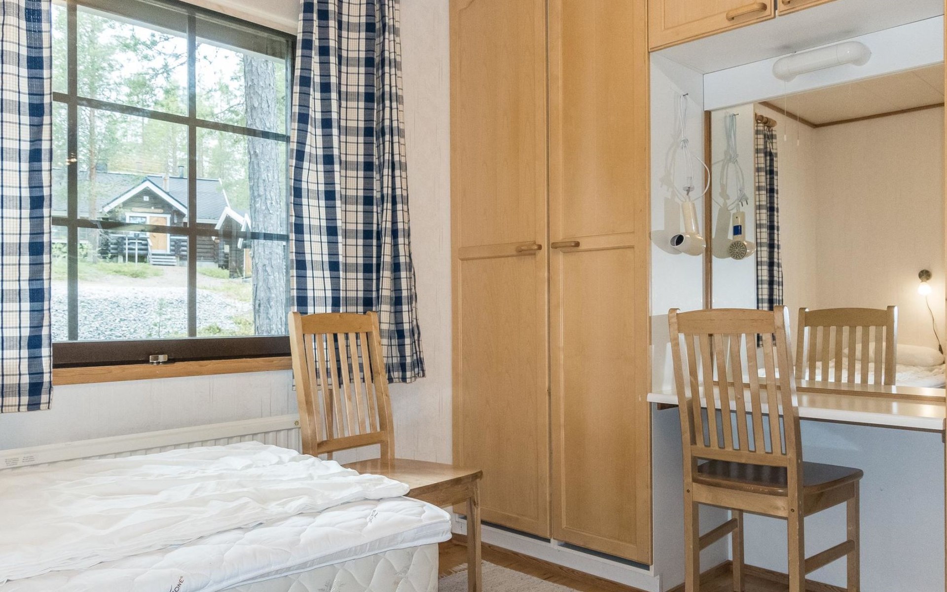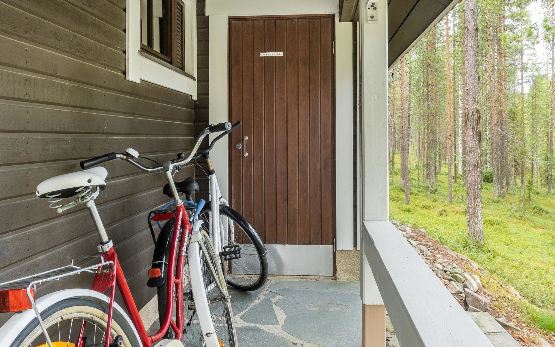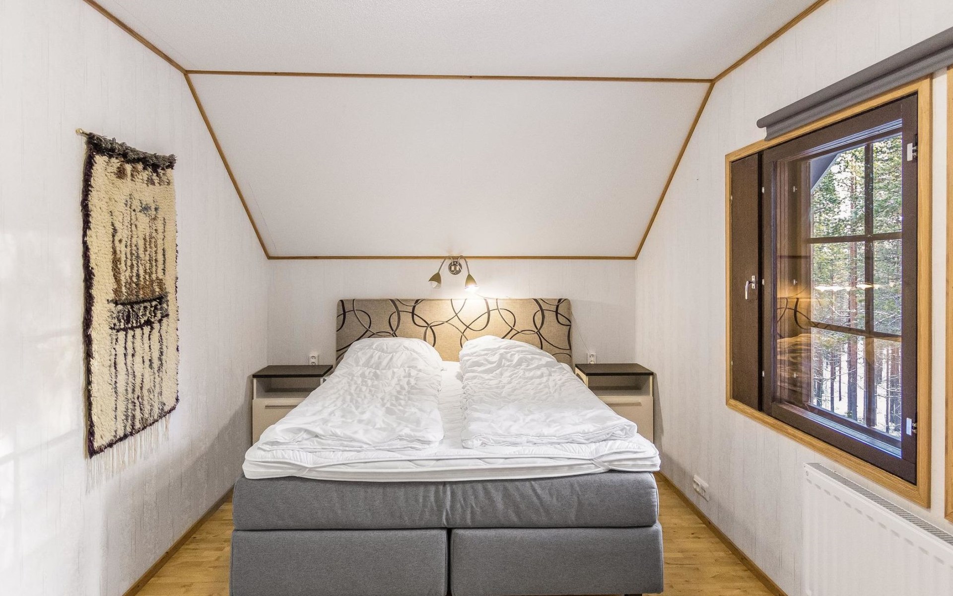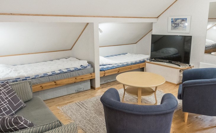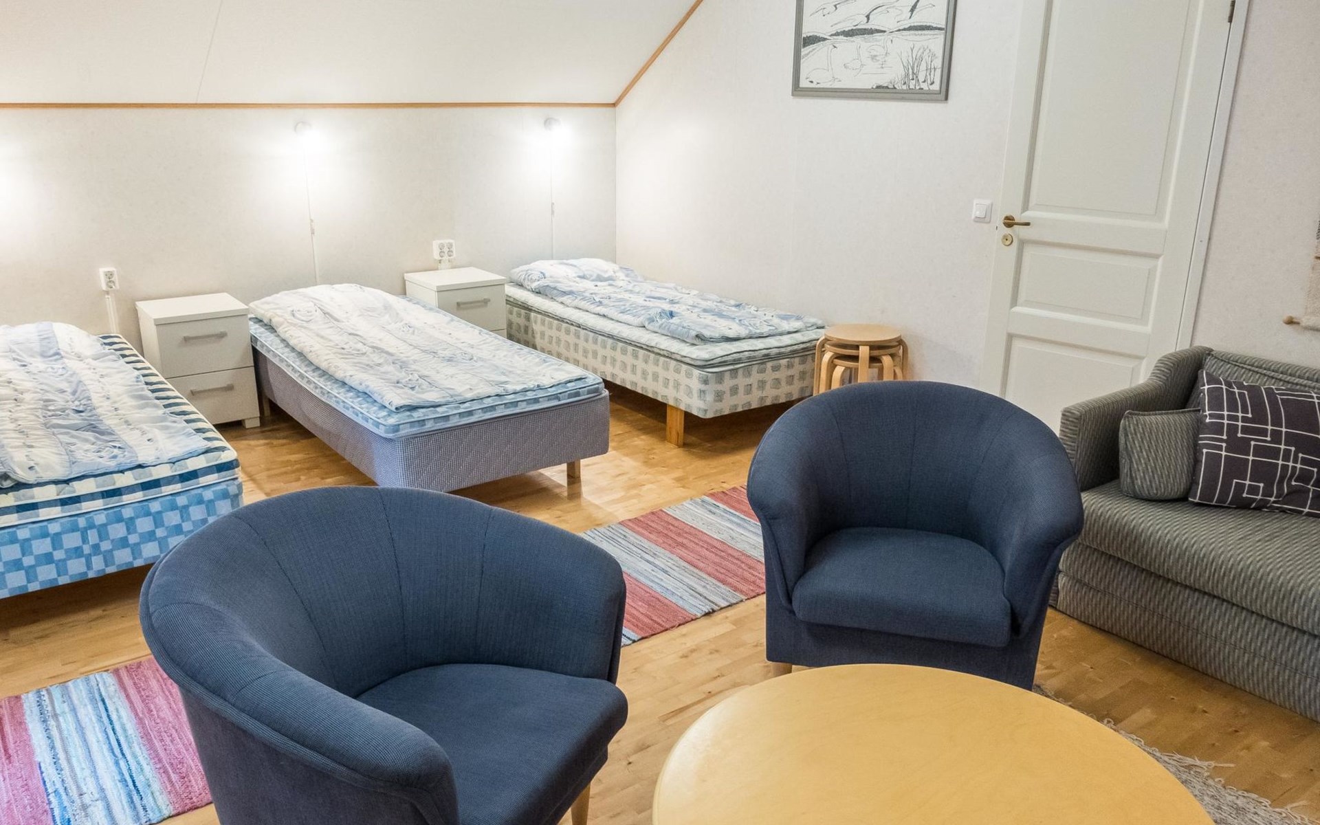 On the ground floor living room/kitchen, bedroom with two beds, another bedroom with double bed (2 beds made into a double bed with common mattress pad). Sauna, washroom and separate toilet, as well as a utility room with a toilet seat.