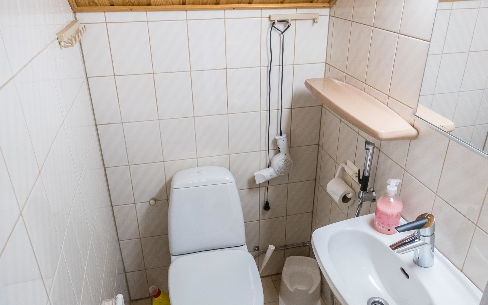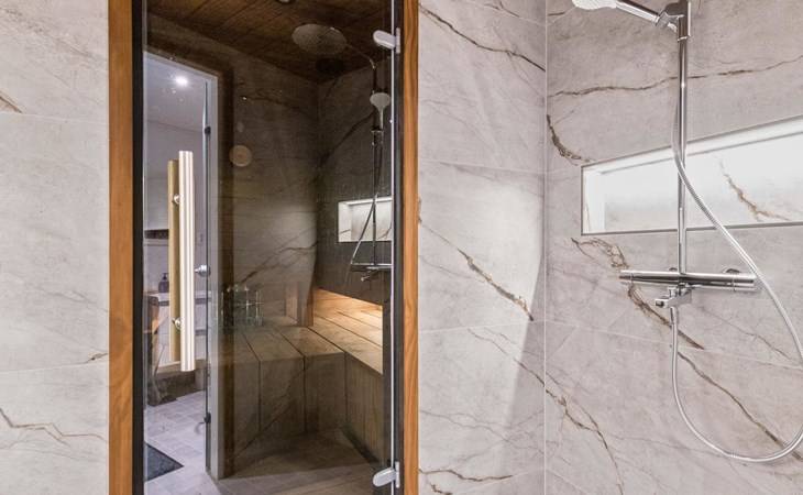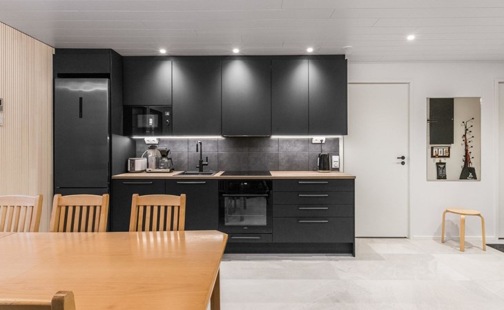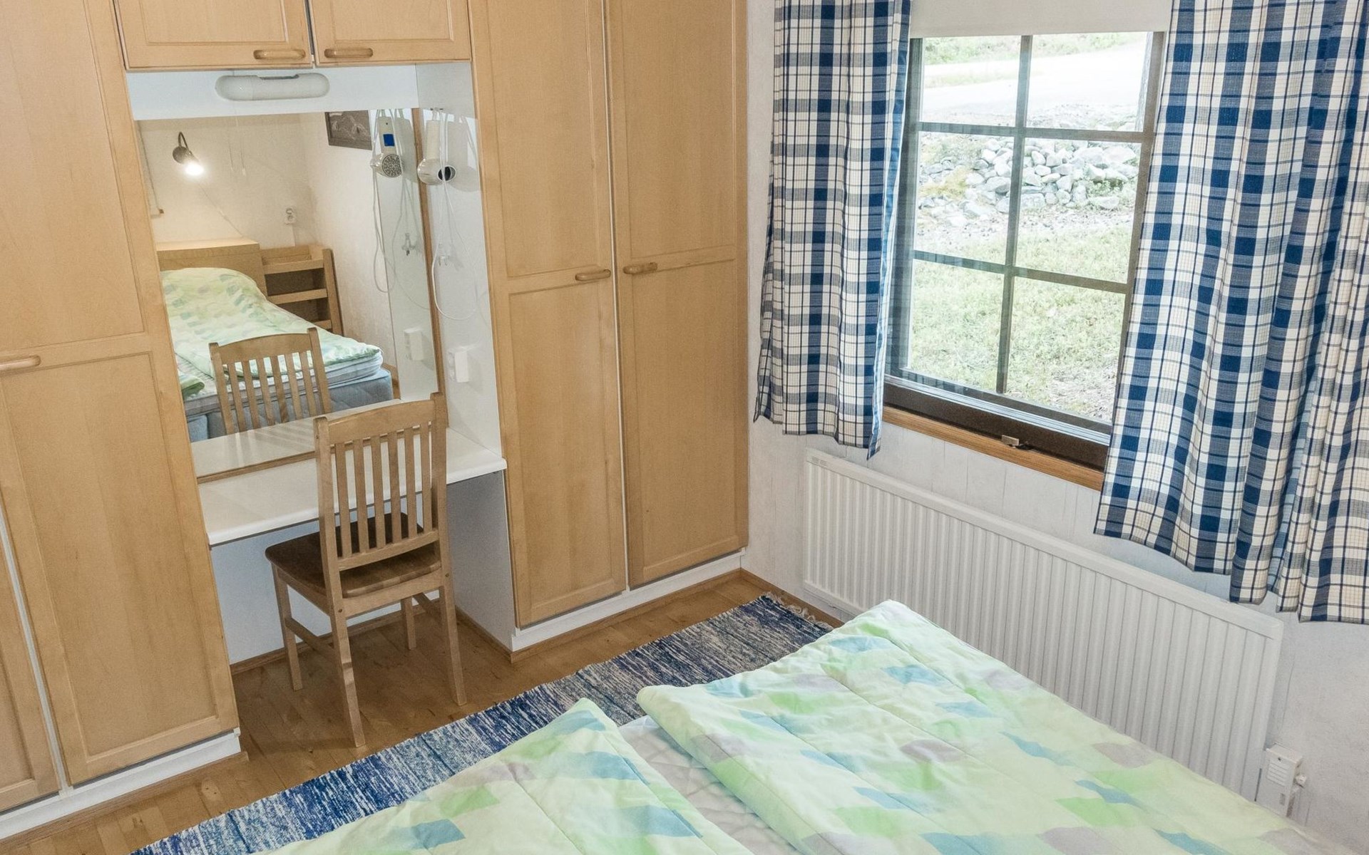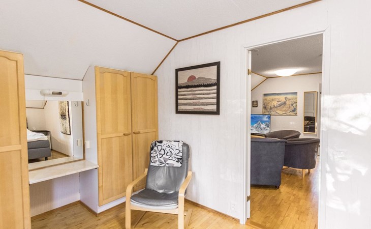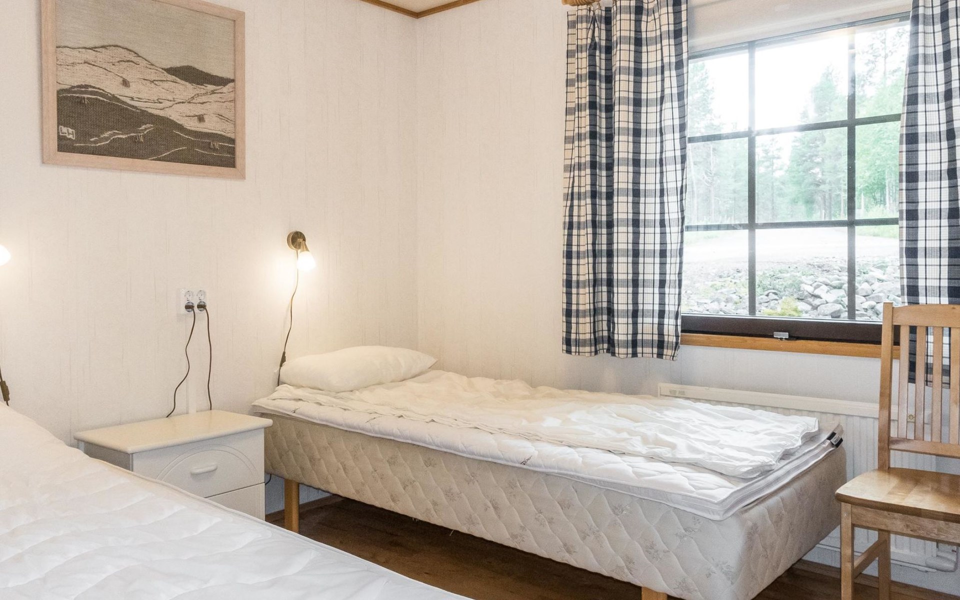 On the ground floor living room/kitchen, bedroom with two beds, another bedroom with double bed (2 beds made into a double bed with common mattress pad). Sauna, washroom and separate toilet, as well as a utility room with a toilet seat.