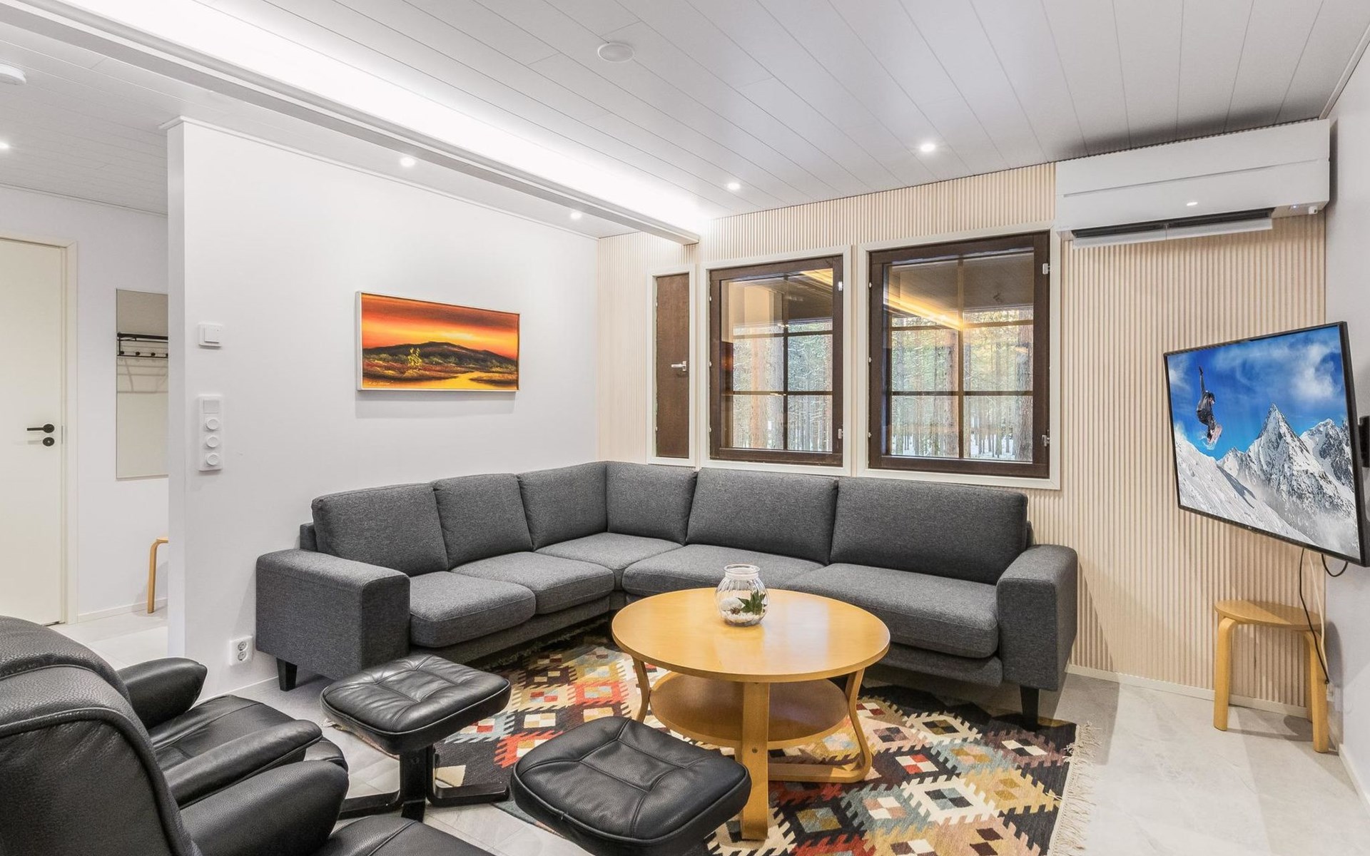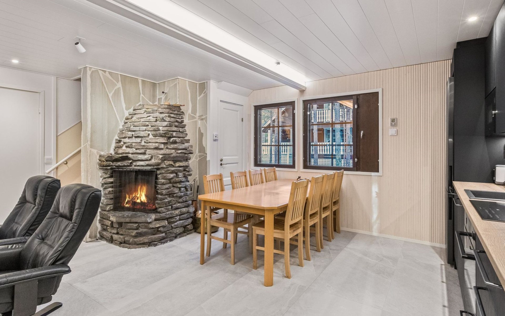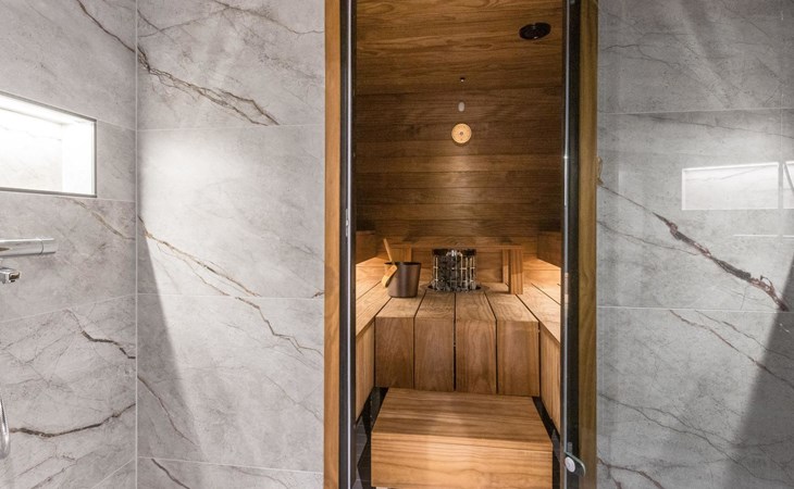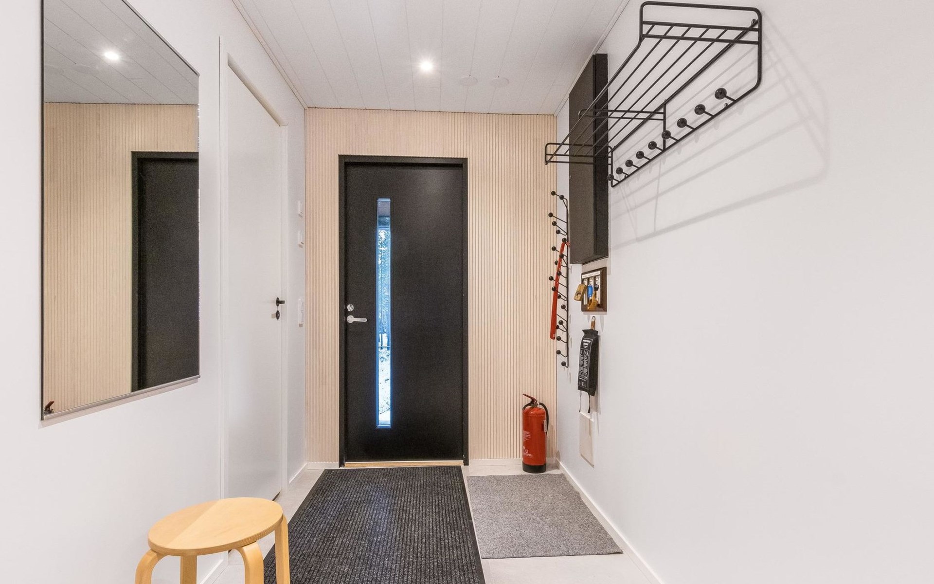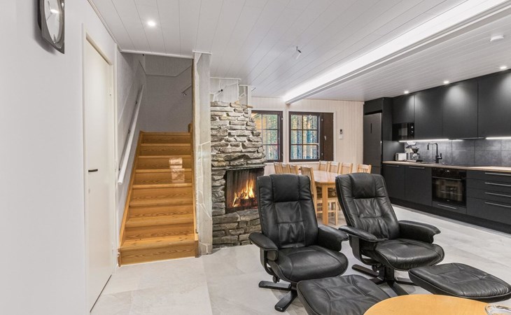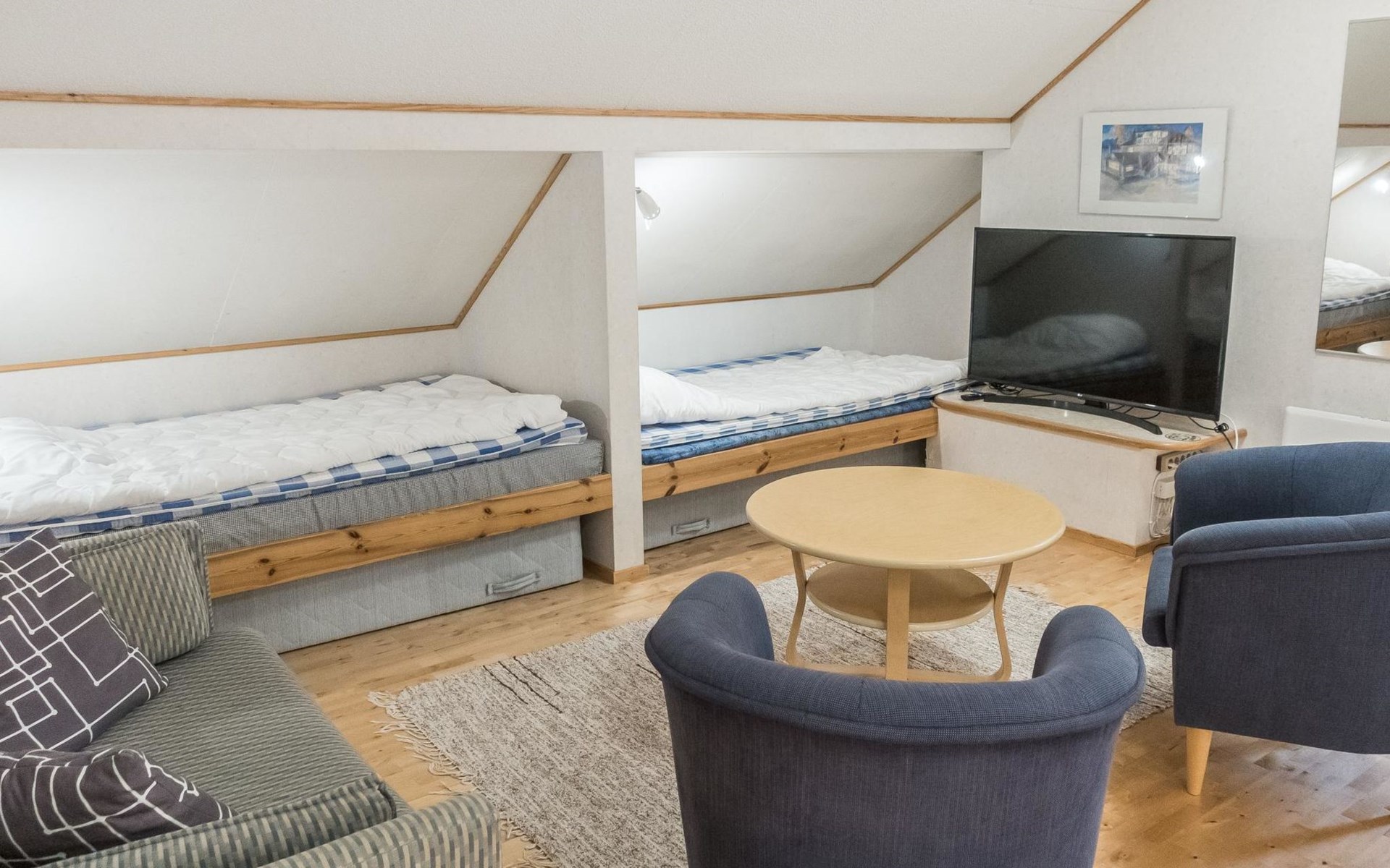 On the ground floor living room/kitchen, bedroom with two beds, another bedroom with double bed (2 beds made into a double bed with common mattress pad). Sauna, washroom and separate toilet, as well as a utility room with a toilet seat.