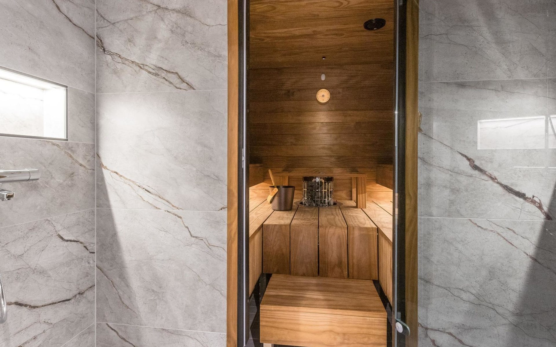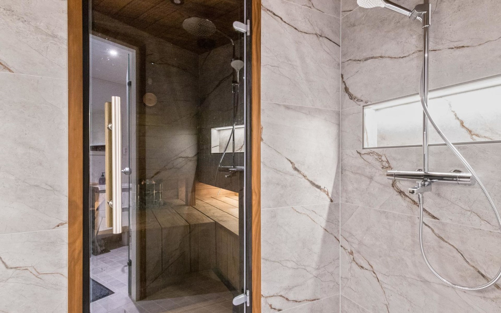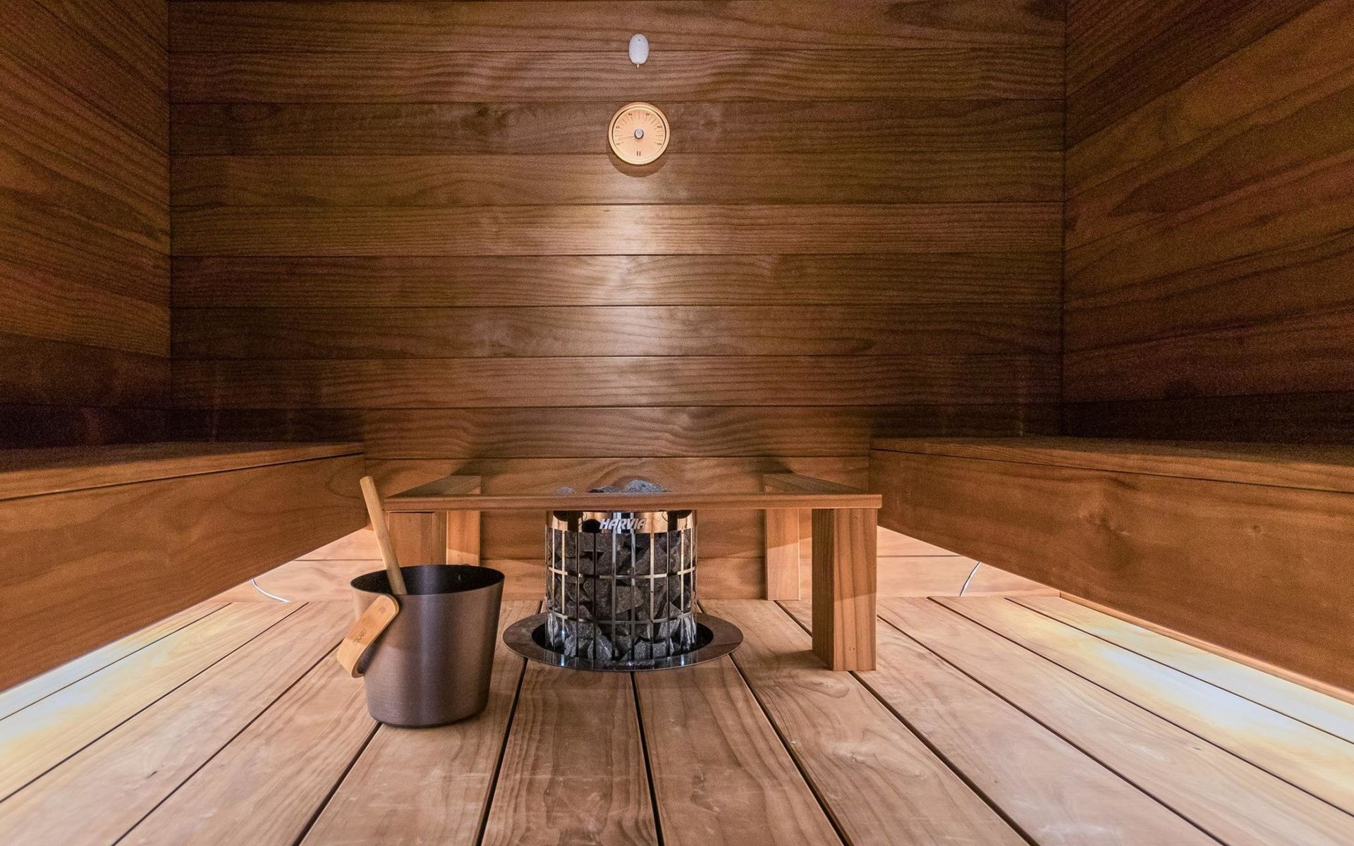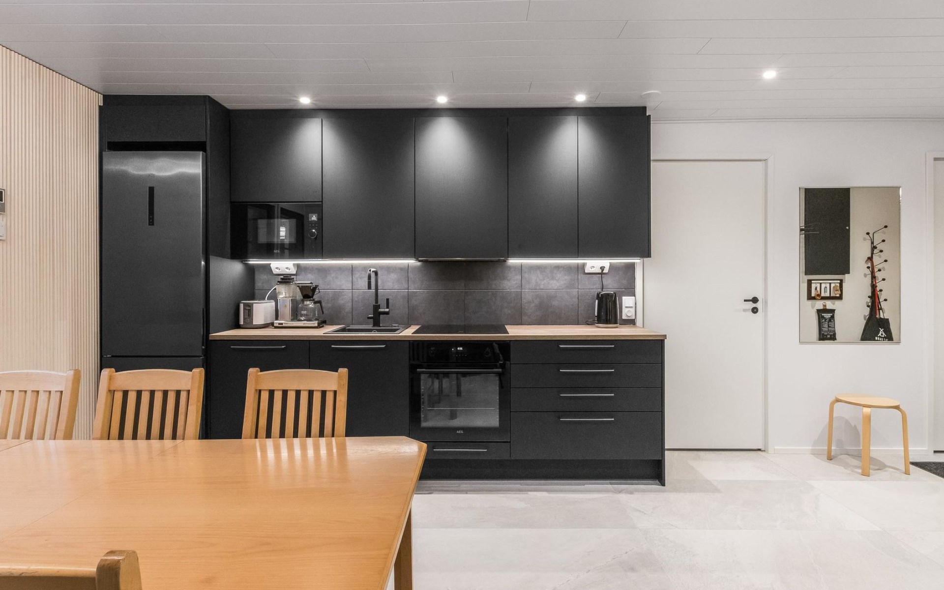 On the ground floor living room/kitchen, bedroom with two beds, another bedroom with double bed (2 beds made into a double bed with common mattress pad). Sauna, washroom and separate toilet, as well as a utility room with a toilet seat.