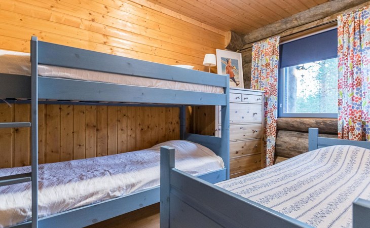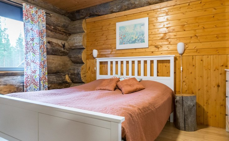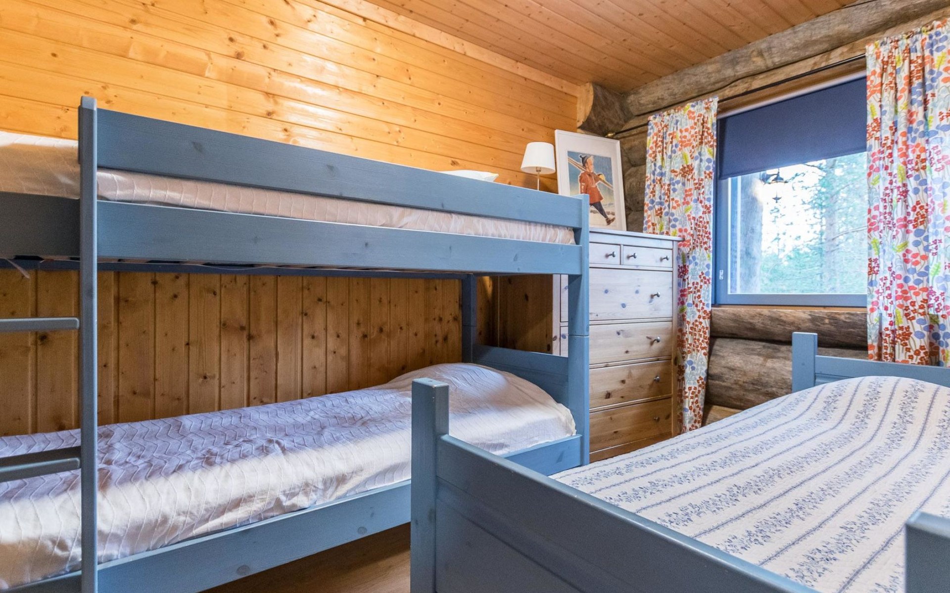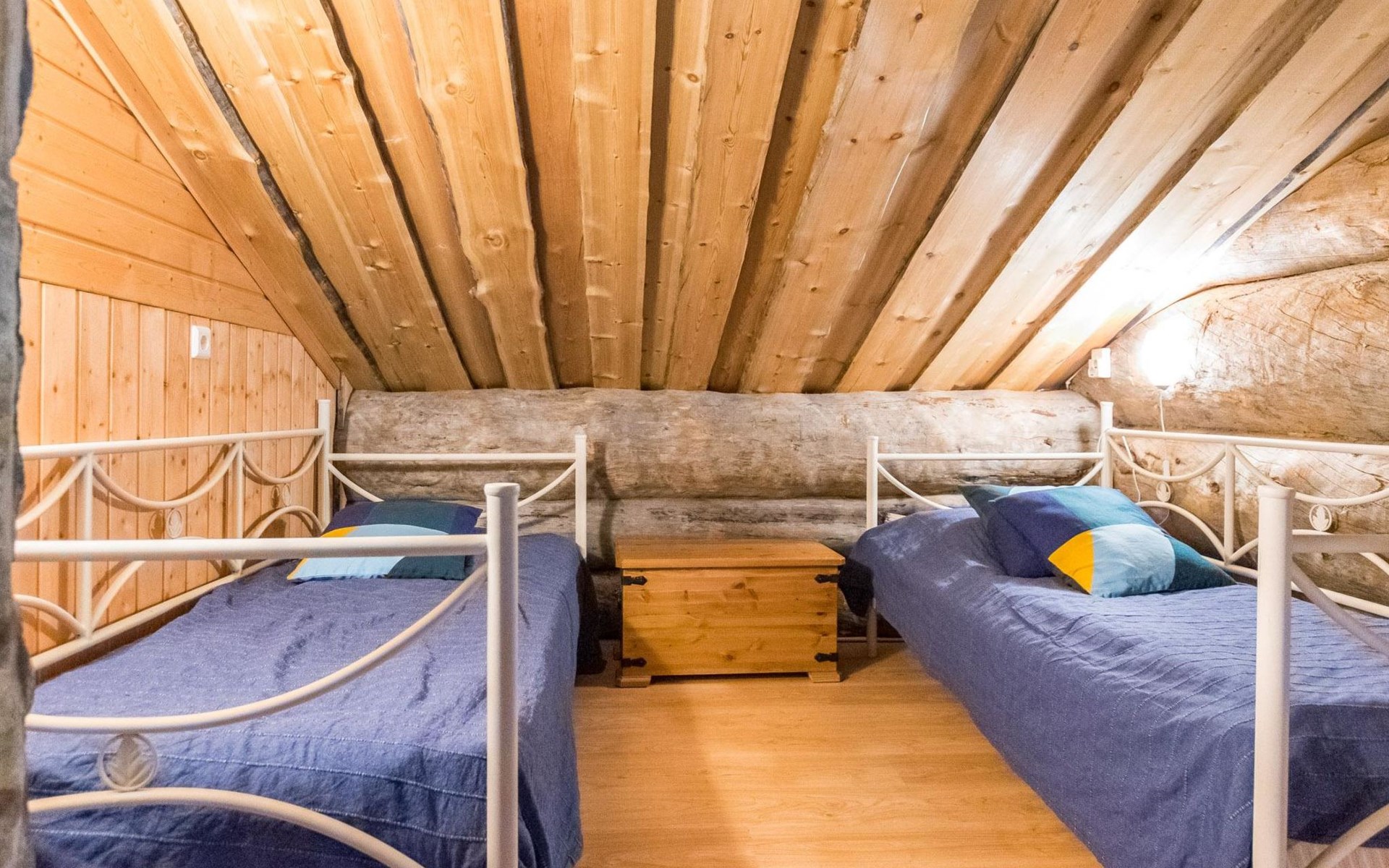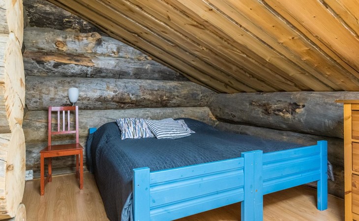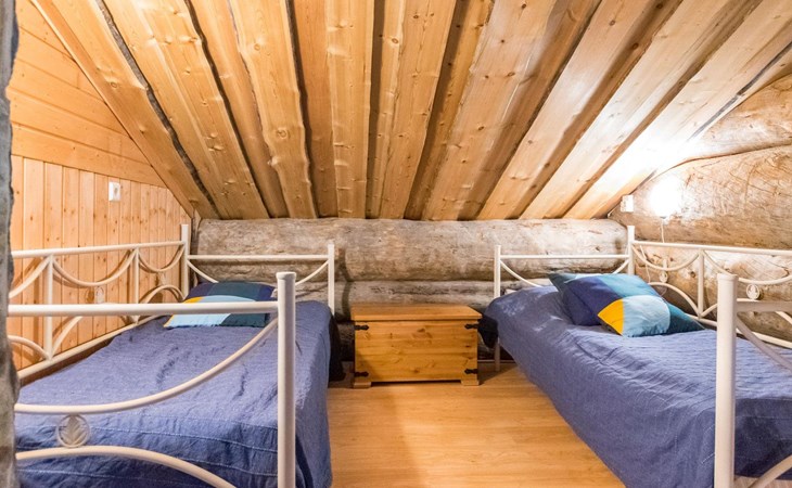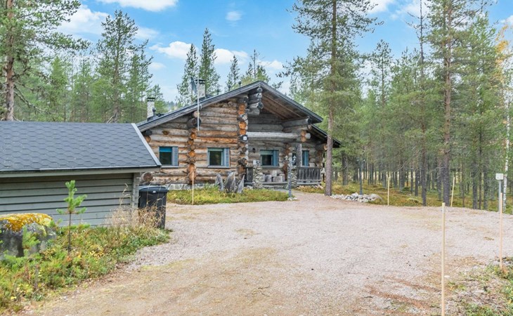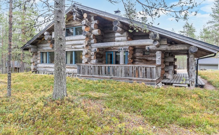 52 km north from Kemijärvi in Pyhätunturi tourist center. Silver log cabin built in 2007. Downstairs: living room/kitchen, bedroom with double bed, bedroom with bunk bed and one single bed, bedroom with bunk bed and one single bed, fireplace room, toilet + toilet seat in the washroom, sauna (wood heat and electric stove) and open porch. Upstairs: living room, bedroom with two single beds, sleeping loft with two beds and toilet.