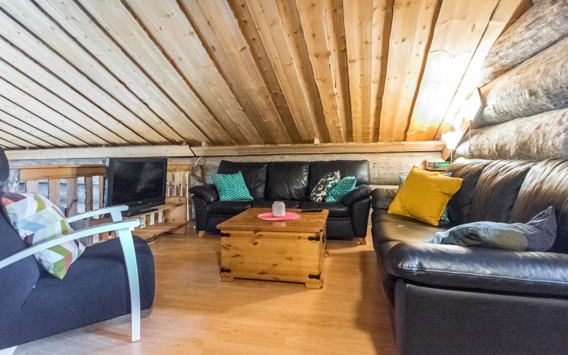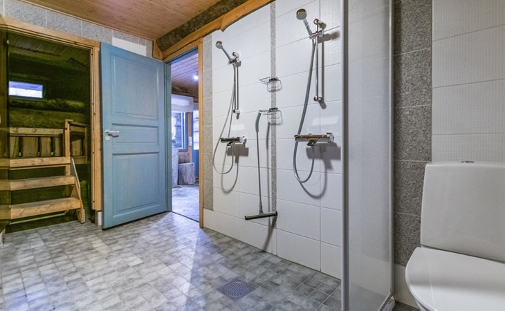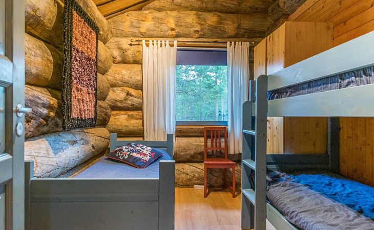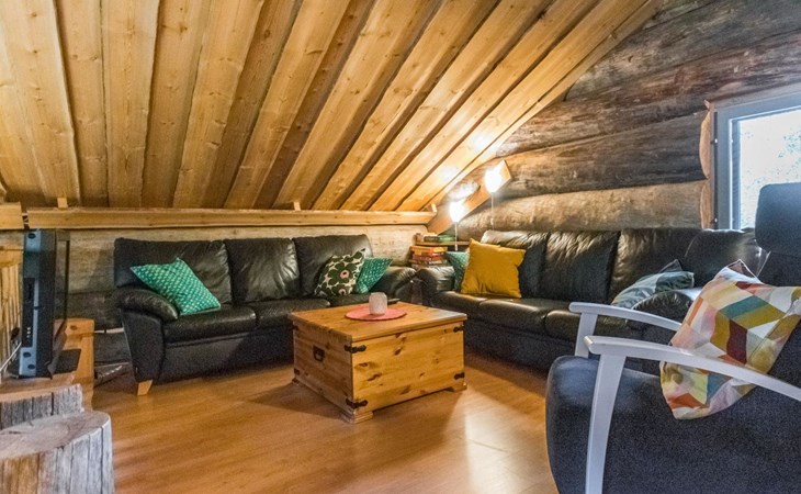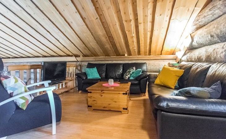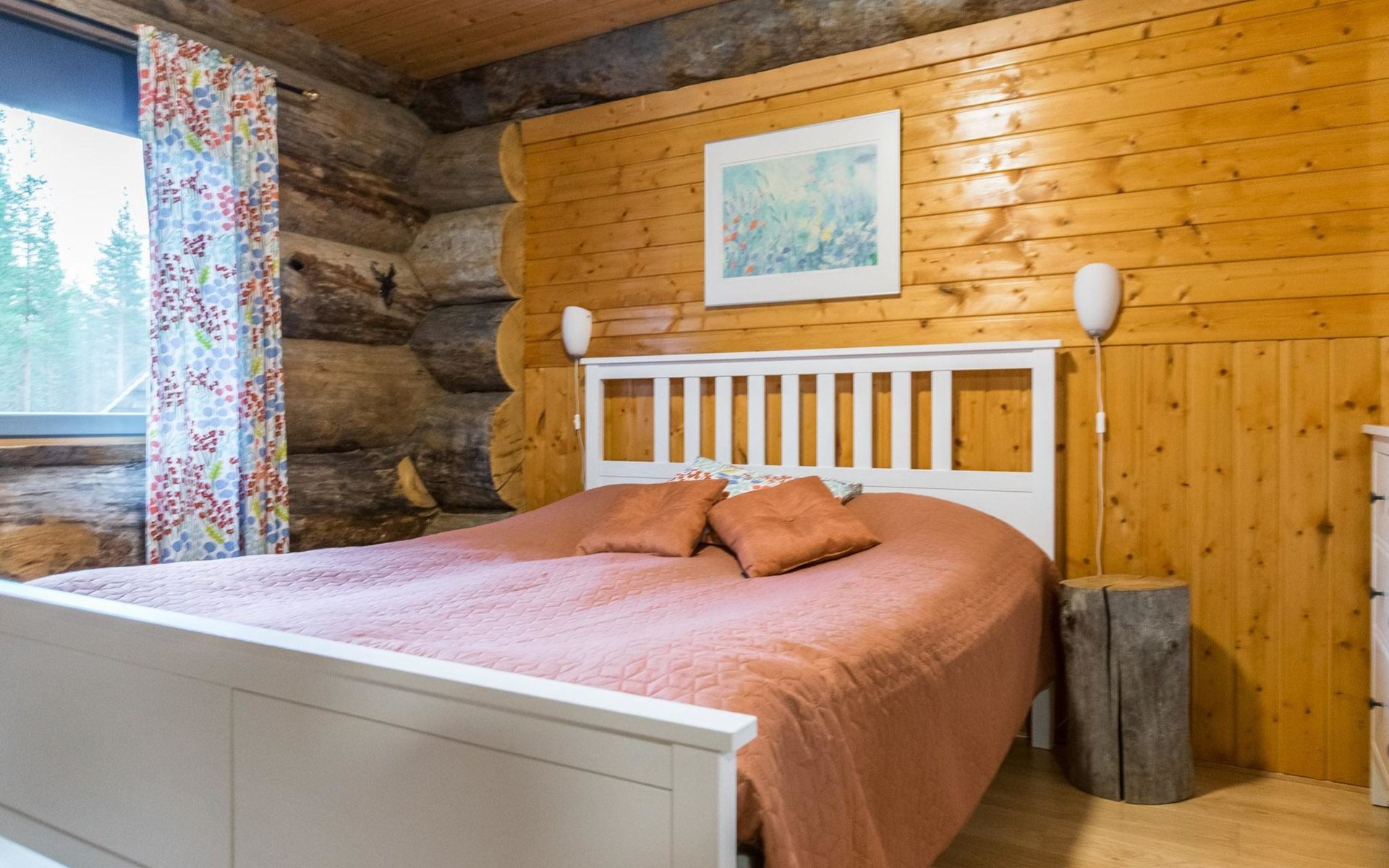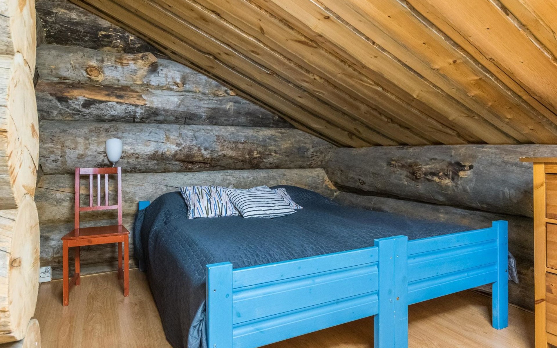 52 km north from Kemijärvi in Pyhätunturi tourist center. Silver log cabin built in 2007. Downstairs: living room/kitchen, bedroom with double bed, bedroom with bunk bed and one single bed, bedroom with bunk bed and one single bed, fireplace room, toilet + toilet seat in the washroom, sauna (wood heat and electric stove) and open porch. Upstairs: living room, bedroom with two single beds, sleeping loft with two beds and toilet.