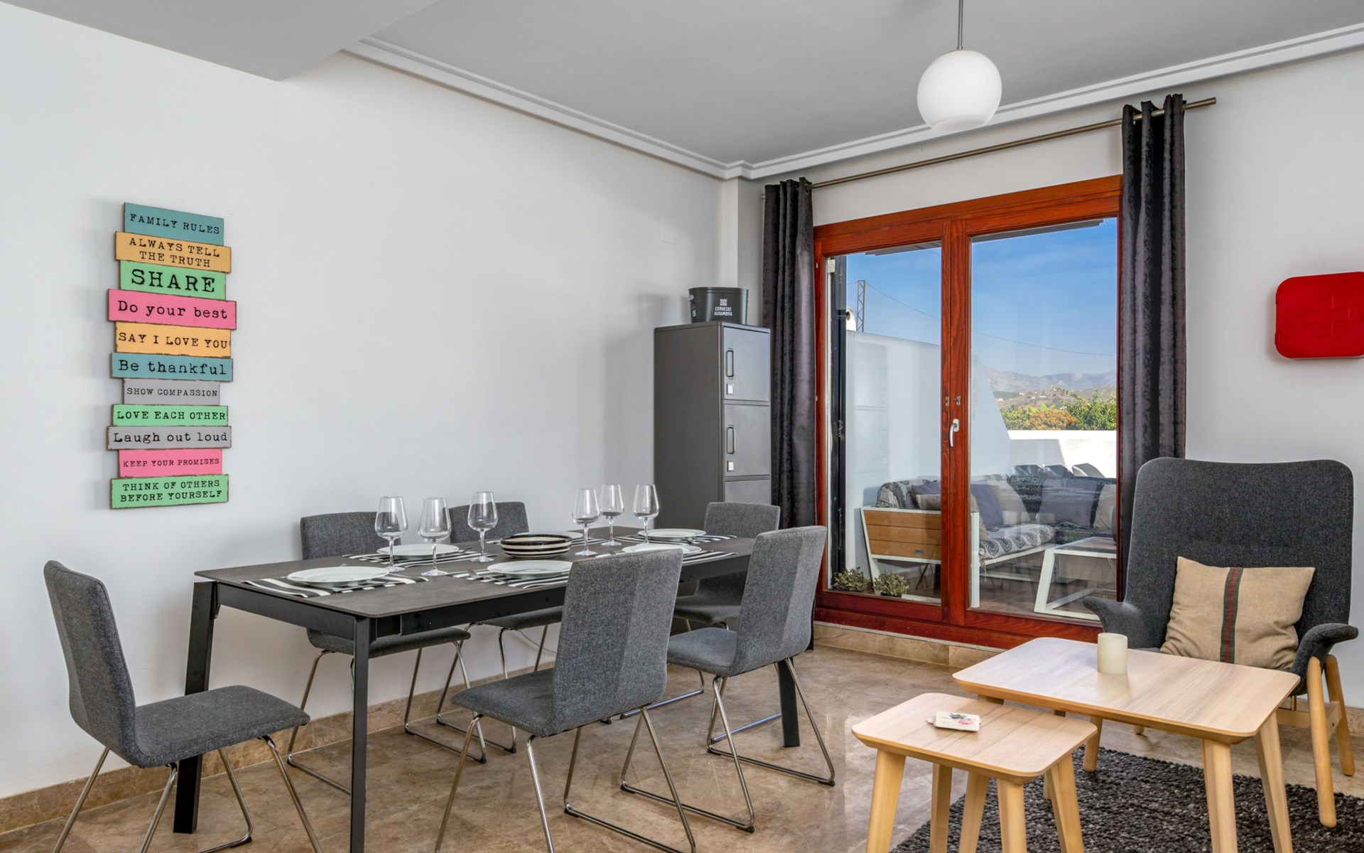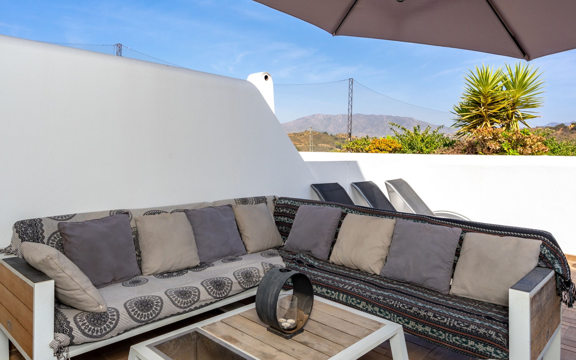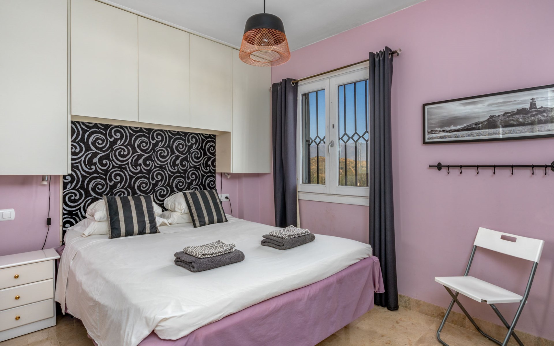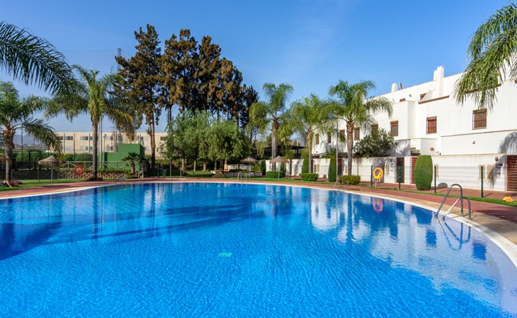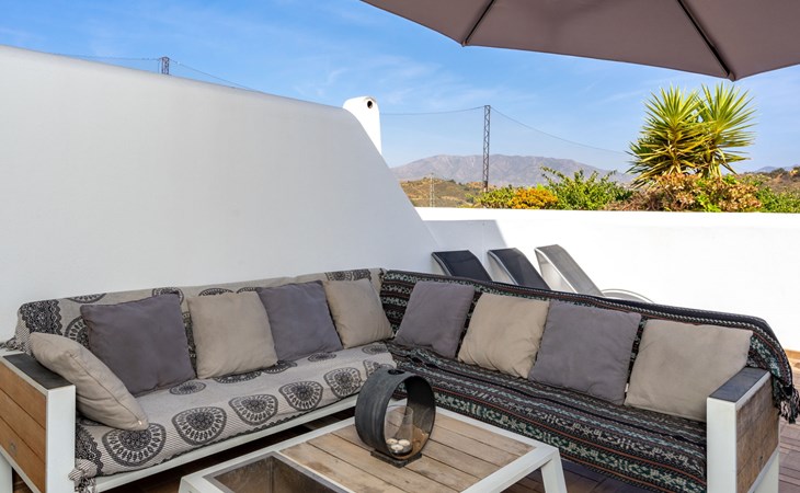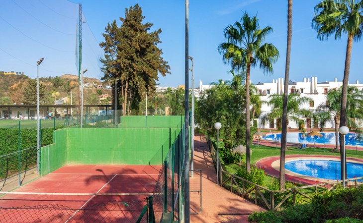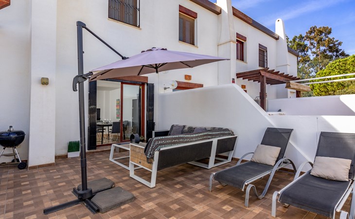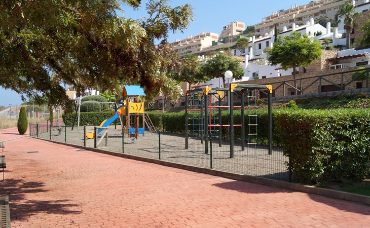 La cala de Mijas: Modern terraced house "Navigolf", built in 2005. On the outskirts, 1 km from the centre of La cala de Mijas, 1.5 km from the sea, 1.5 km from the beach, on the golf course. For shared use: garden with lawn, swimming pool (seasonal availability: 01.Jan. - 31.Dec.). Shower/WC in the pool area, children's pool, children's playground, parking at the house. Shop 1 km, supermarket 1 km, restaurant 800 m, café 1 km, bus stop "La Cala de Mijas" 1 km, sandy beach 1.5 km. Golf course (9 hole) 200 m. Please note: suitable for families. Object suitable for 4 adults + 4 children groups of teenagers on request only. Neighbourhood highly sensitive to noise. Quietness and good behaviour expected.