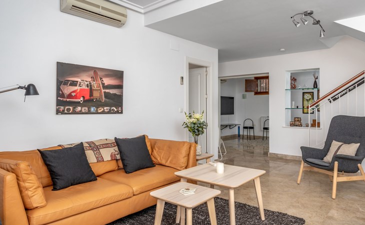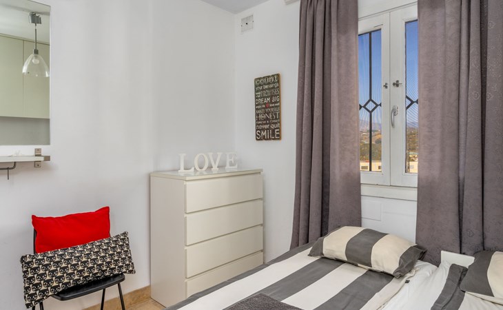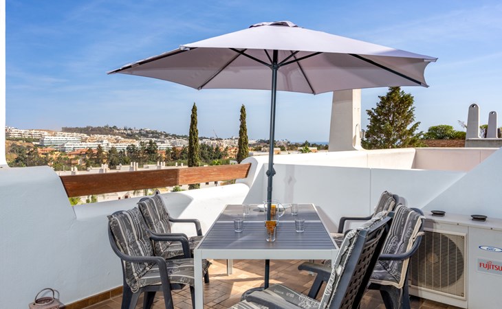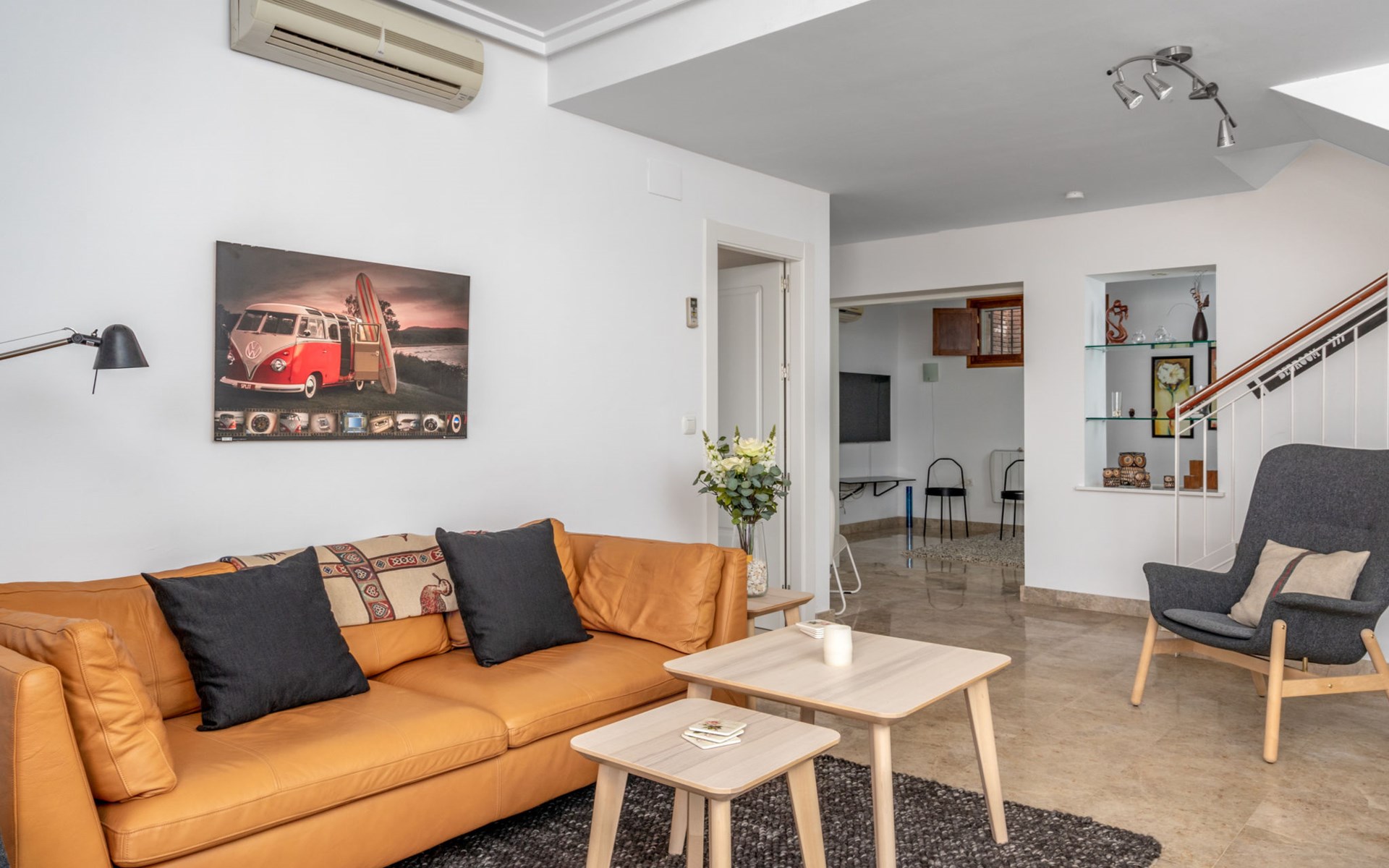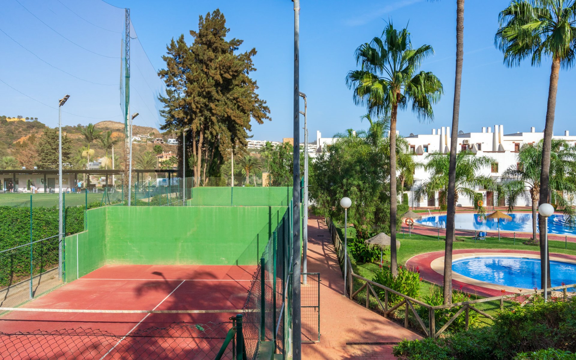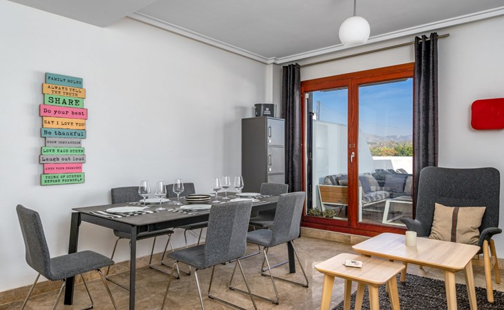 La cala de Mijas: Modern terraced house "Navigolf", built in 2005. On the outskirts, 1 km from the centre of La cala de Mijas, 1.5 km from the sea, 1.5 km from the beach, on the golf course. For shared use: garden with lawn, swimming pool (seasonal availability: 01.Jan. - 31.Dec.). Shower/WC in the pool area, children's pool, children's playground, parking at the house. Shop 1 km, supermarket 1 km, restaurant 800 m, café 1 km, bus stop "La Cala de Mijas" 1 km, sandy beach 1.5 km. Golf course (9 hole) 200 m. Please note: suitable for families. Object suitable for 4 adults + 4 children groups of teenagers on request only. Neighbourhood highly sensitive to noise. Quietness and good behaviour expected.