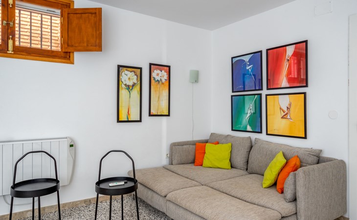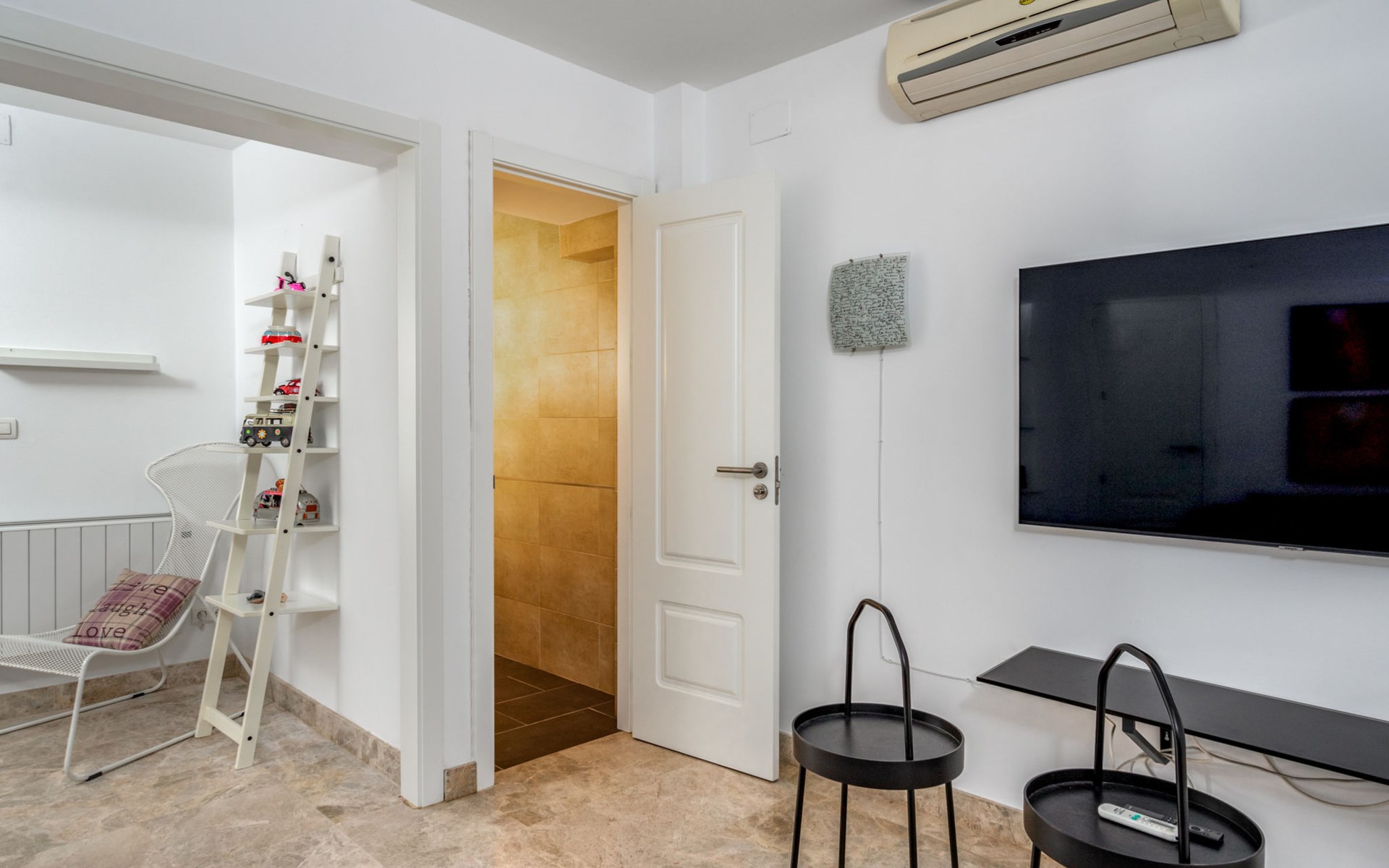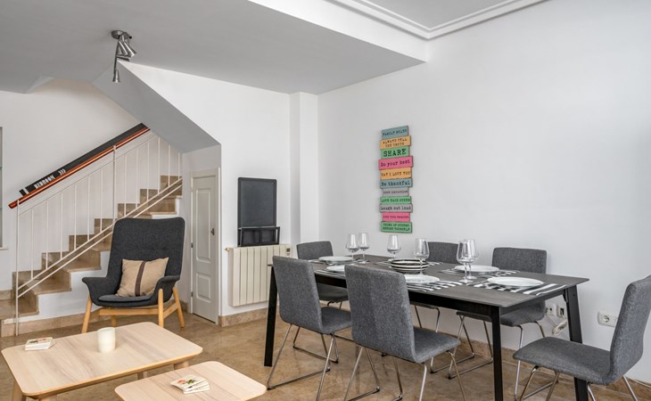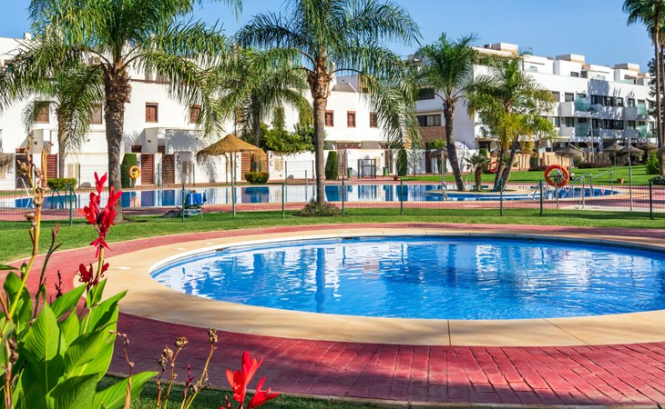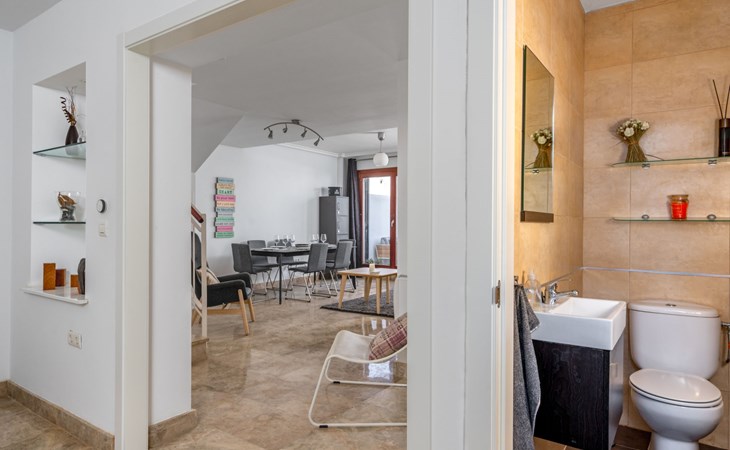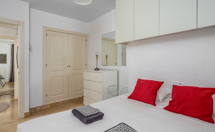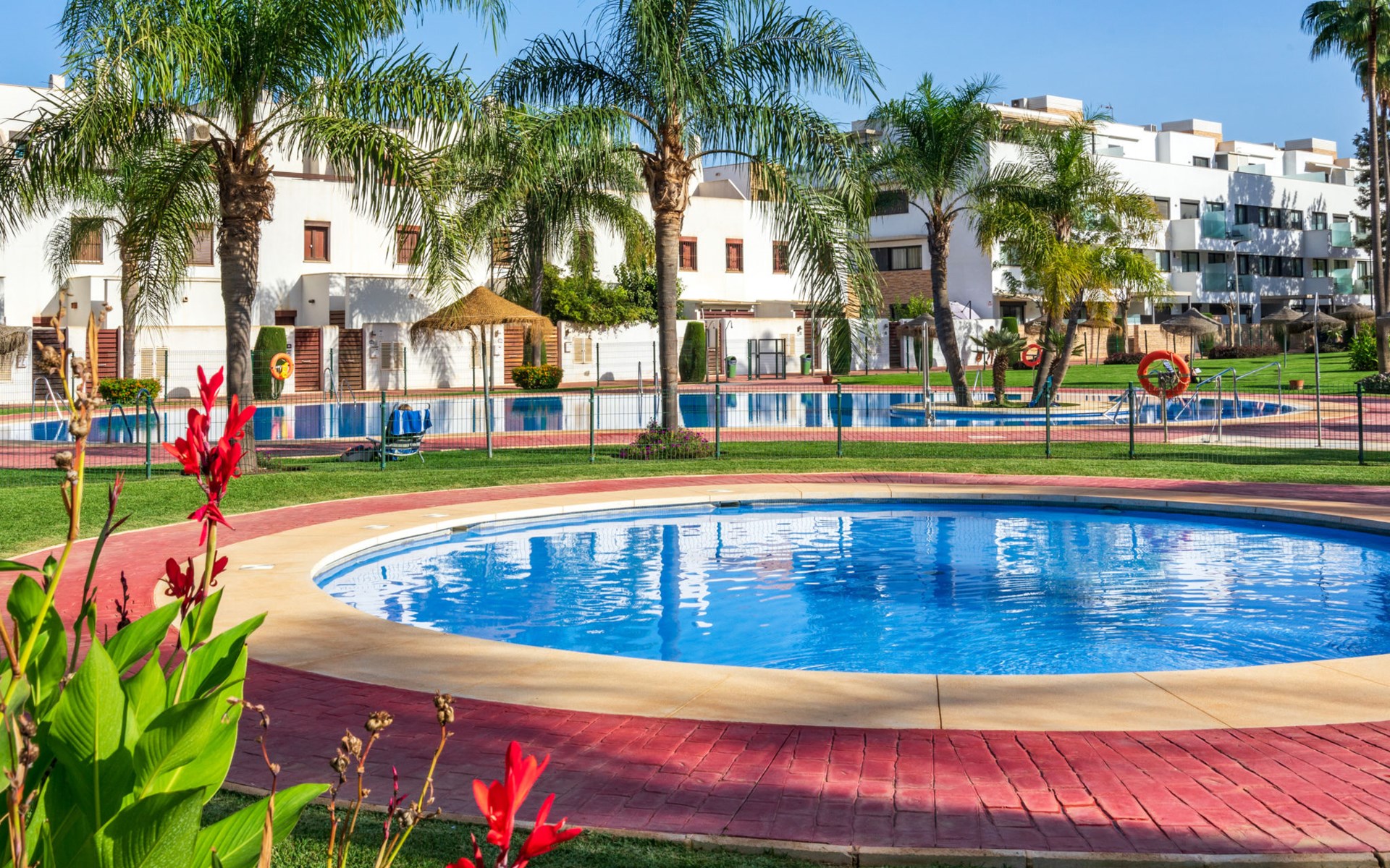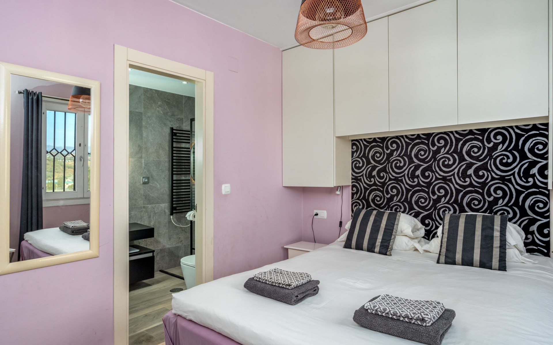 La cala de Mijas: Modern terraced house "Navigolf", built in 2005. On the outskirts, 1 km from the centre of La cala de Mijas, 1.5 km from the sea, 1.5 km from the beach, on the golf course. For shared use: garden with lawn, swimming pool (seasonal availability: 01.Jan. - 31.Dec.). Shower/WC in the pool area, children's pool, children's playground, parking at the house. Shop 1 km, supermarket 1 km, restaurant 800 m, café 1 km, bus stop "La Cala de Mijas" 1 km, sandy beach 1.5 km. Golf course (9 hole) 200 m. Please note: suitable for families. Object suitable for 4 adults + 4 children groups of teenagers on request only. Neighbourhood highly sensitive to noise. Quietness and good behaviour expected.