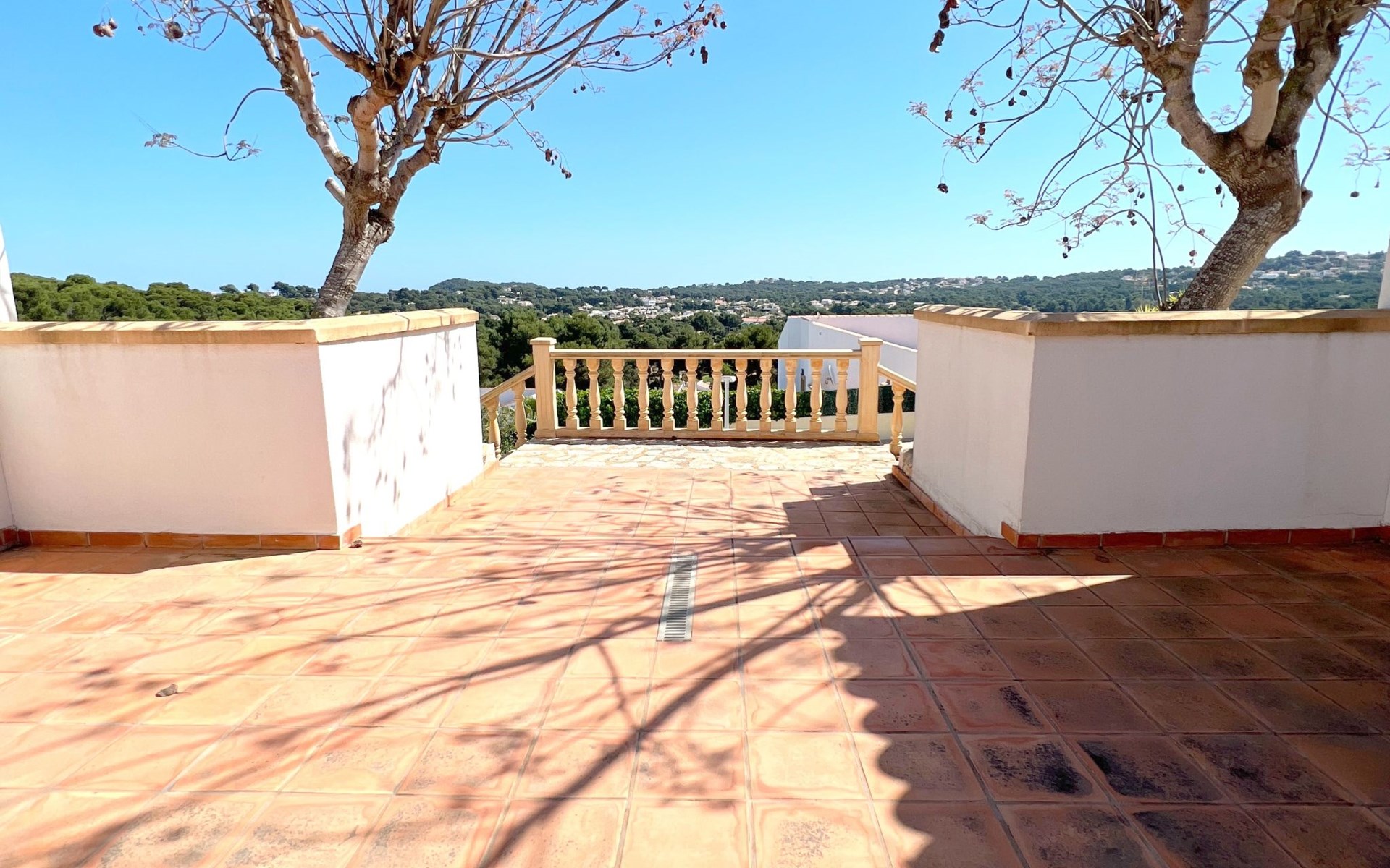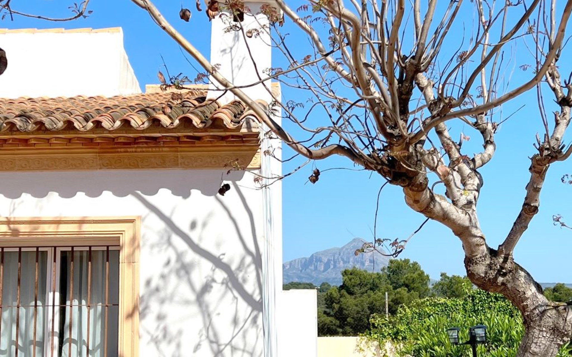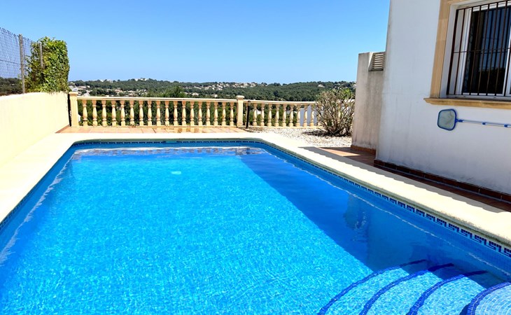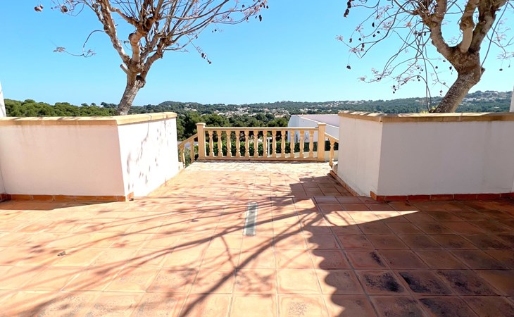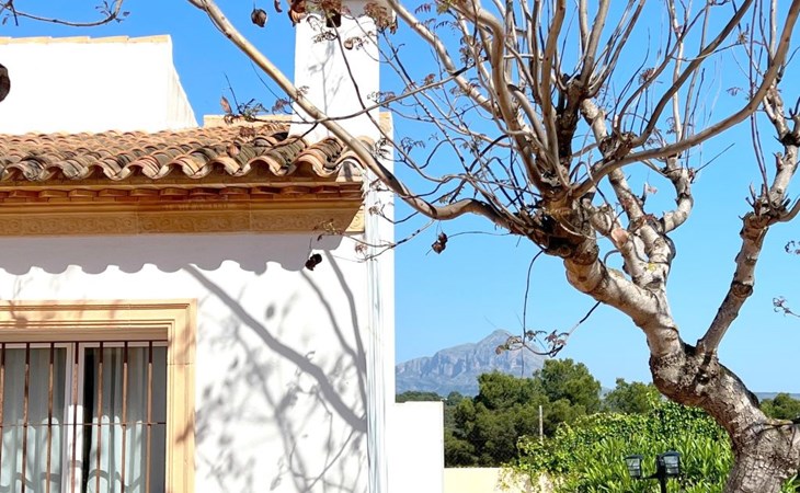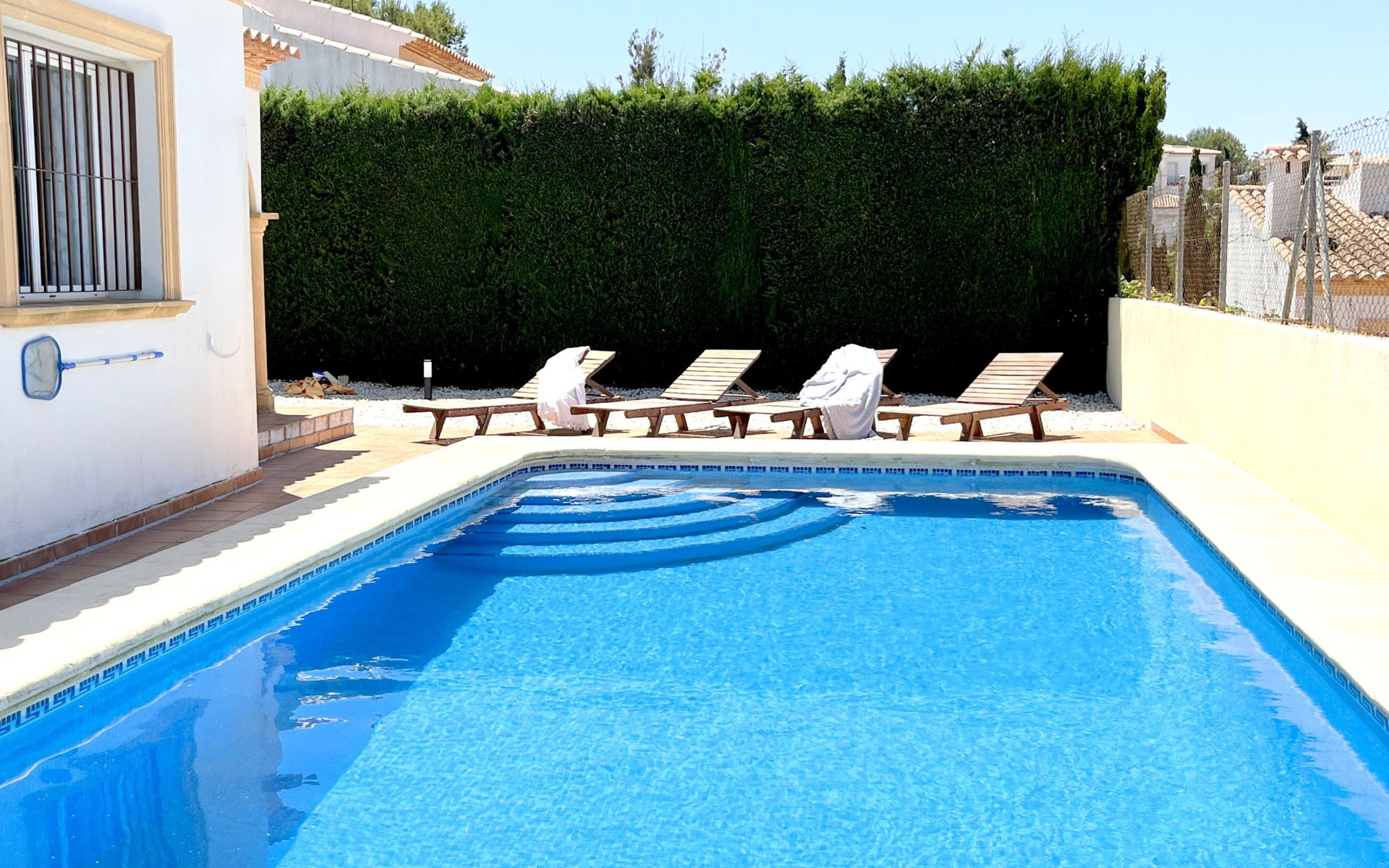 House. 24 houses in the residence. In the district of Monte Javea 5 km from the centre of Jávea-Arenal, on a slope, 3 km from the sea. Private: property (fenced) with wildlife garden and trees, swimming pool (8 x 4 m, depth 120 - 220 cm, seasonal availability: 01.Jan. - 31.Dec.). Public parking on the road. Shop 2.5 km, restaurant 1 km, bus stop "Calablanca" 3.6 km, sandy beach "Arenal" 5 km pebble beach "Granadella" 3 km. Tennis 1 km.
