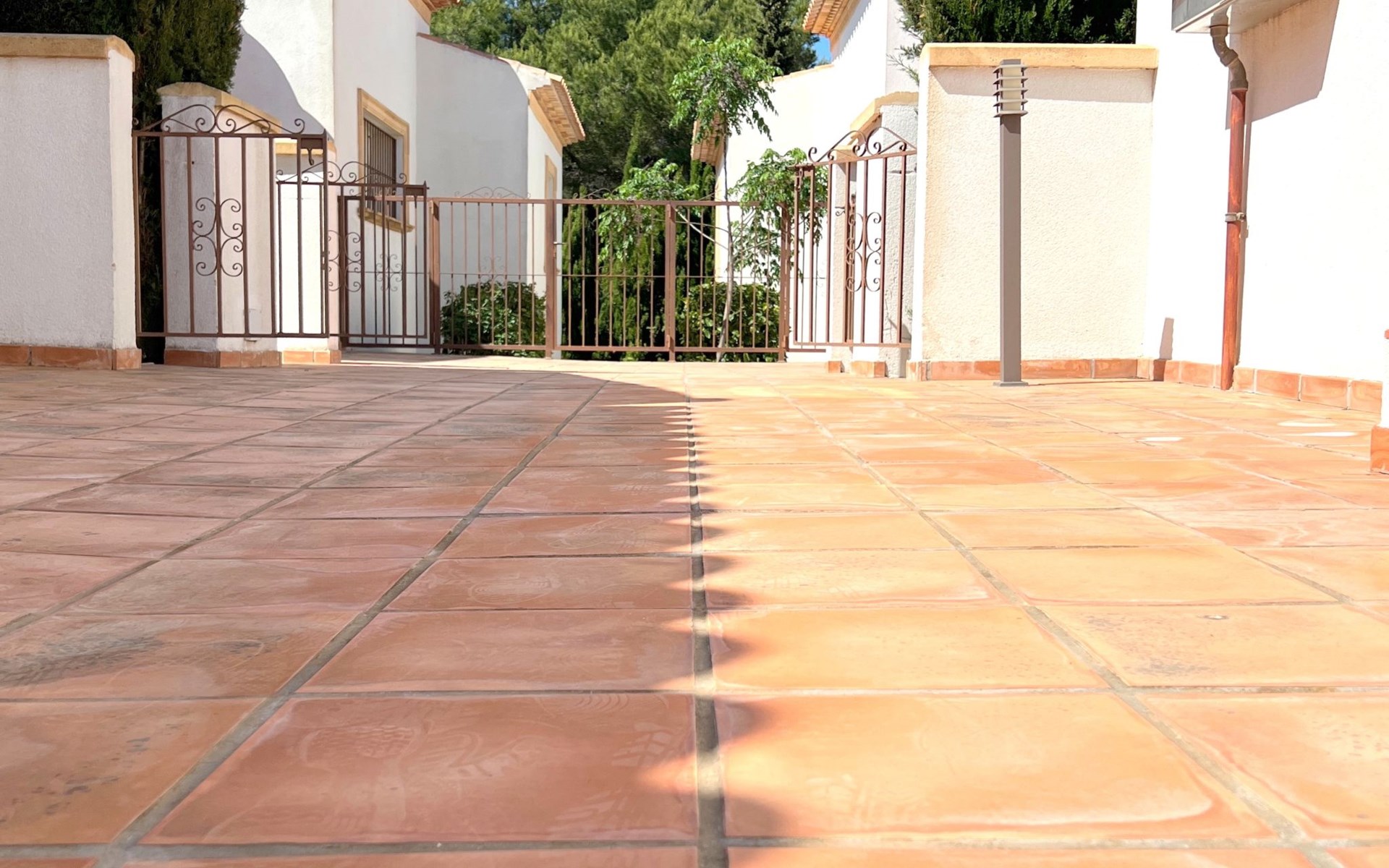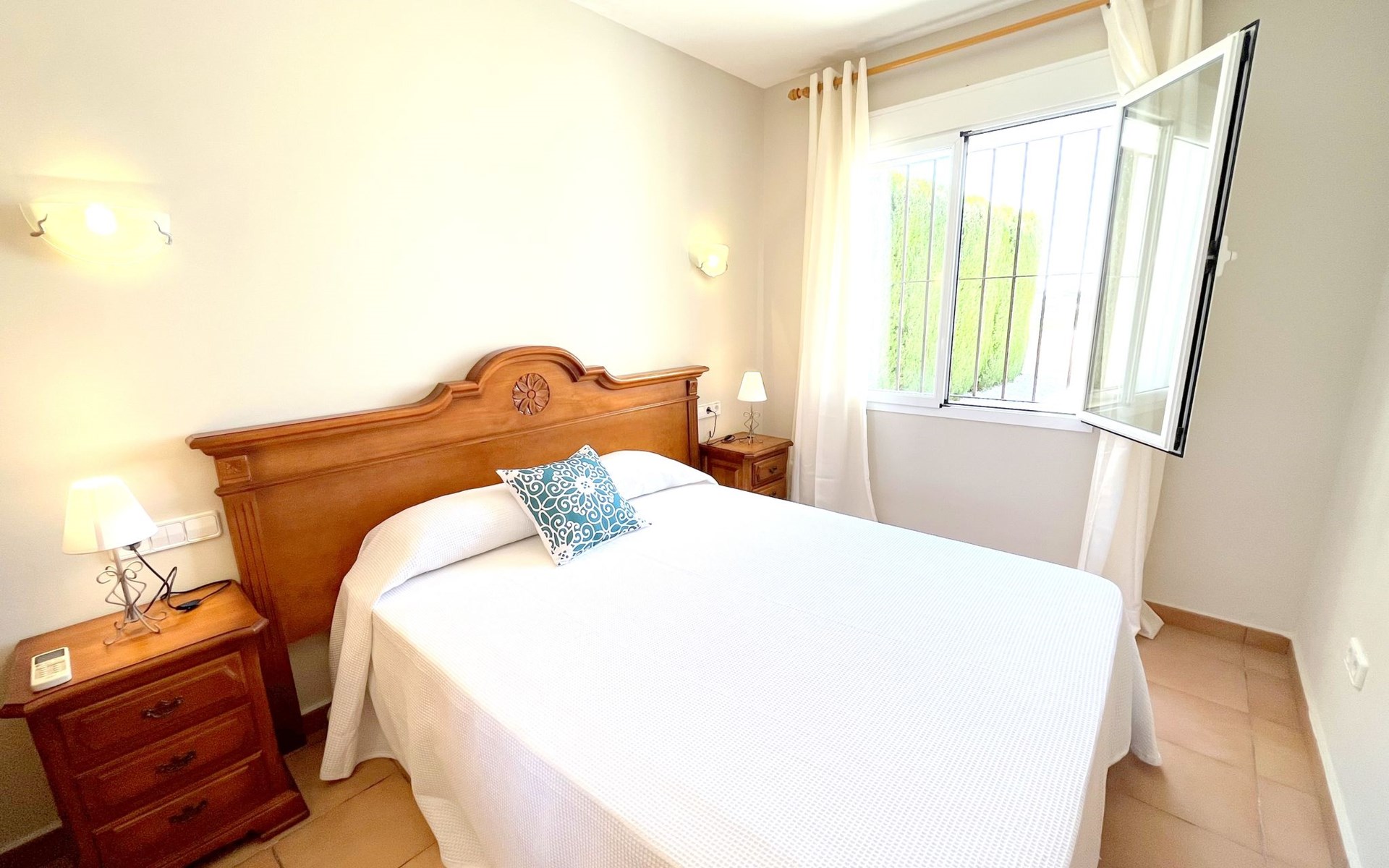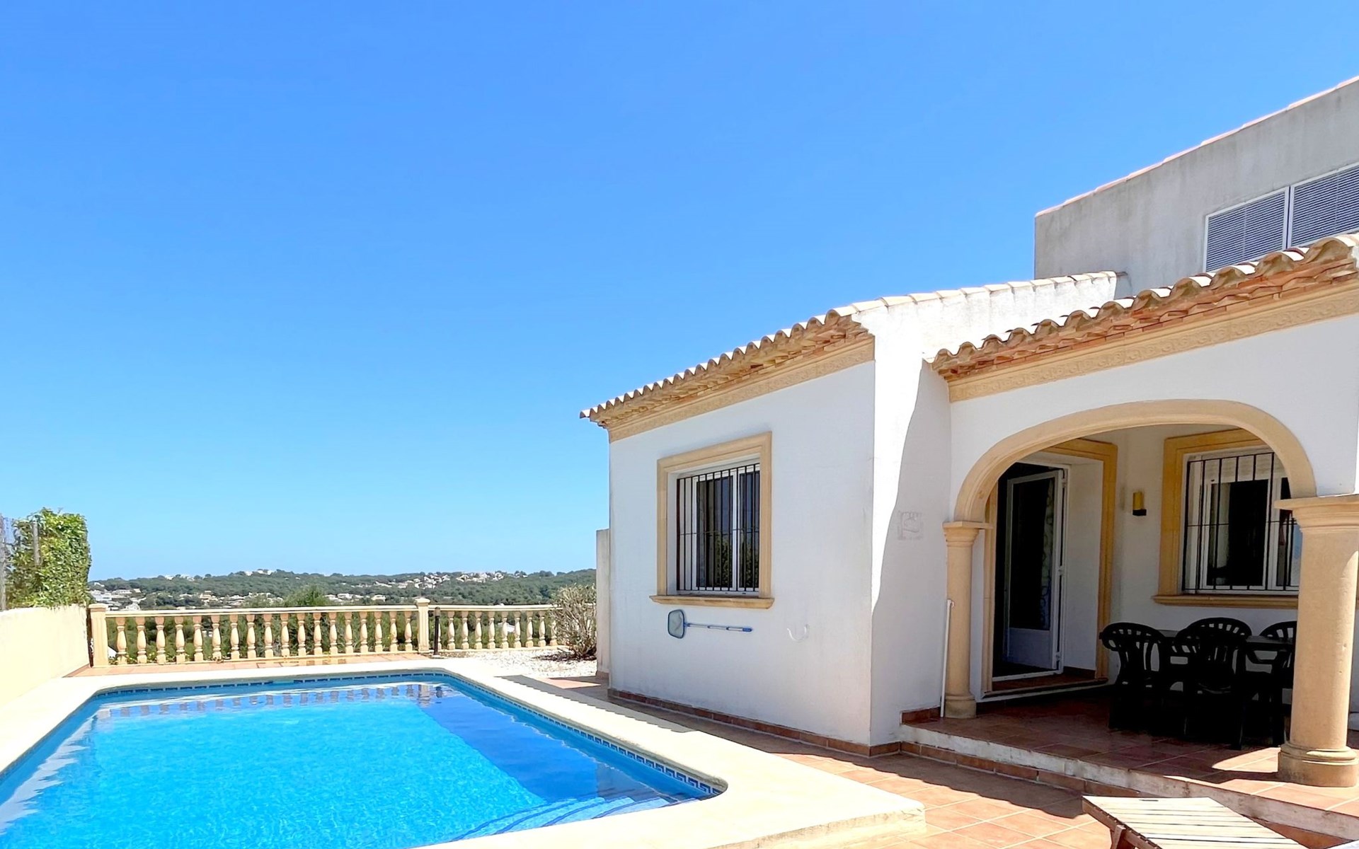 House. 24 houses in the residence. In the district of Monte Javea 5 km from the centre of Jávea-Arenal, on a slope, 3 km from the sea. Private: property (fenced) with wildlife garden and trees, swimming pool (8 x 4 m, depth 120 - 220 cm, seasonal availability: 01.Jan. - 31.Dec.). Public parking on the road. Shop 2.5 km, restaurant 1 km, bus stop "Calablanca" 3.6 km, sandy beach "Arenal" 5 km pebble beach "Granadella" 3 km. Tennis 1 km.