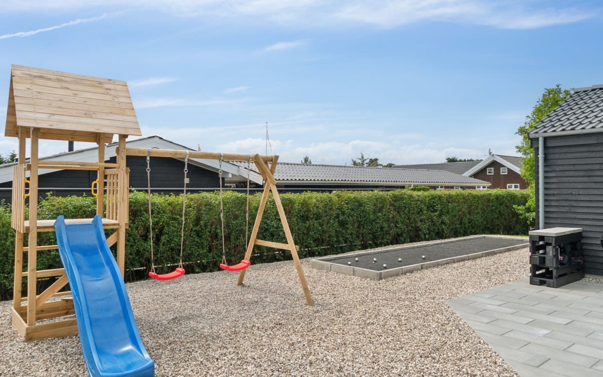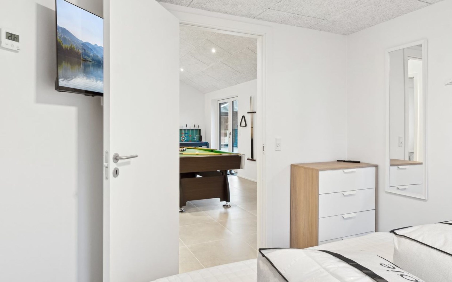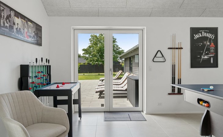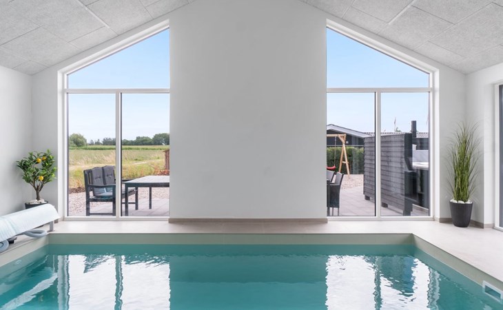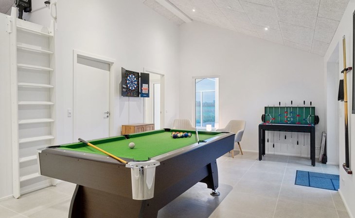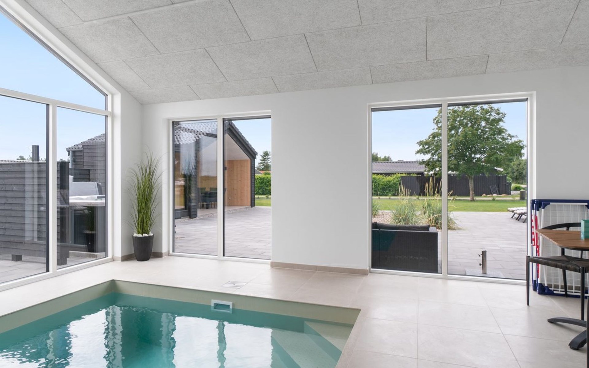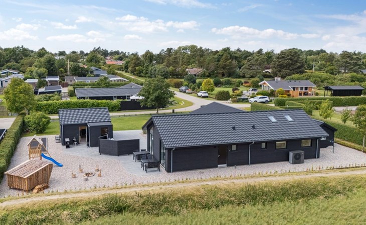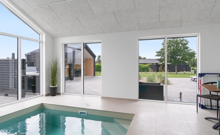 Single-family house, built in 2024. 600 m from the sea. Private: property 1'329 m2, well-kept garden, indoor pool (3 x 5 m, 15 m2, depth 145 - 145 cm). Outdoor shower, terrace (125 m2), barbecue, children's playground (slide, swing). In the house: table football, washing machine, tumble dryer. Parking at the house. E-charging station. Grocery 650 m. Golf course 12 km. The owner does not accept any youth groups.