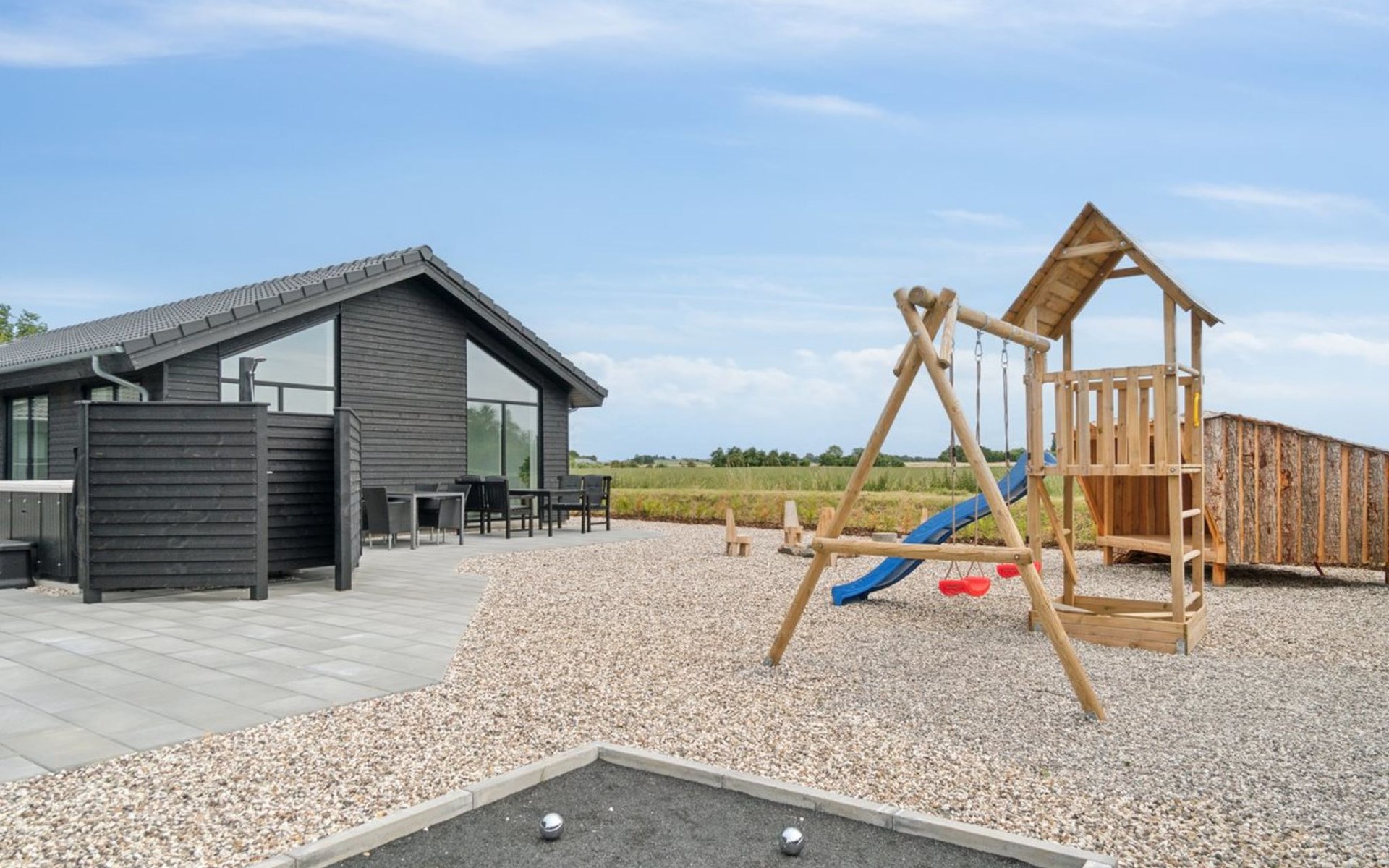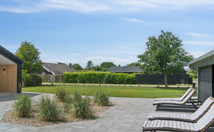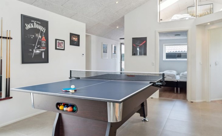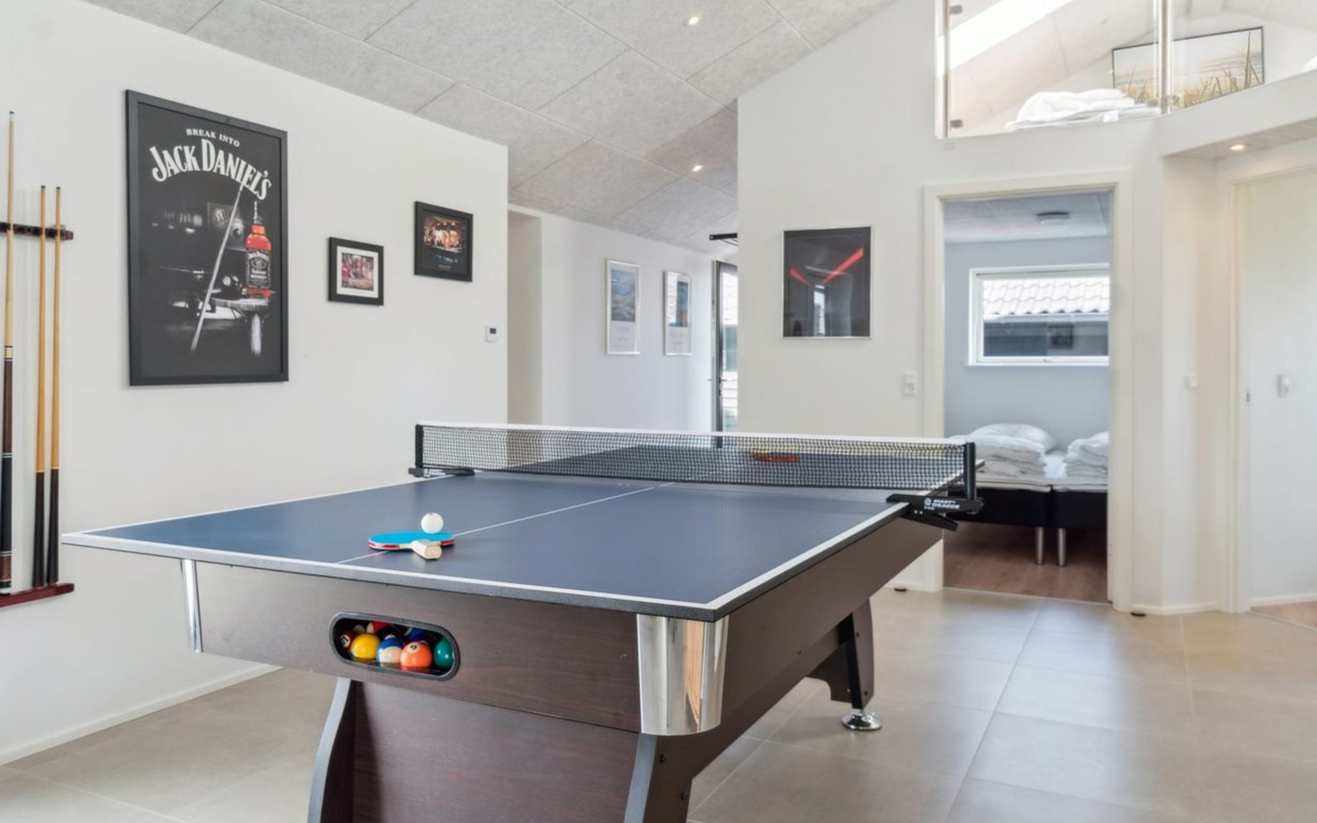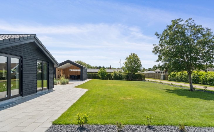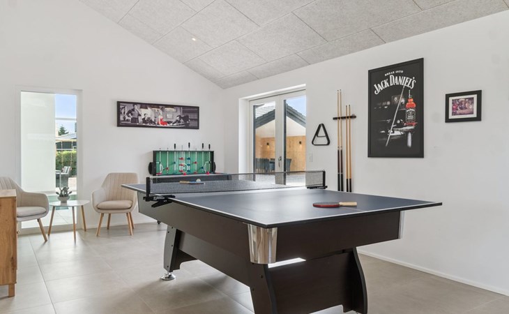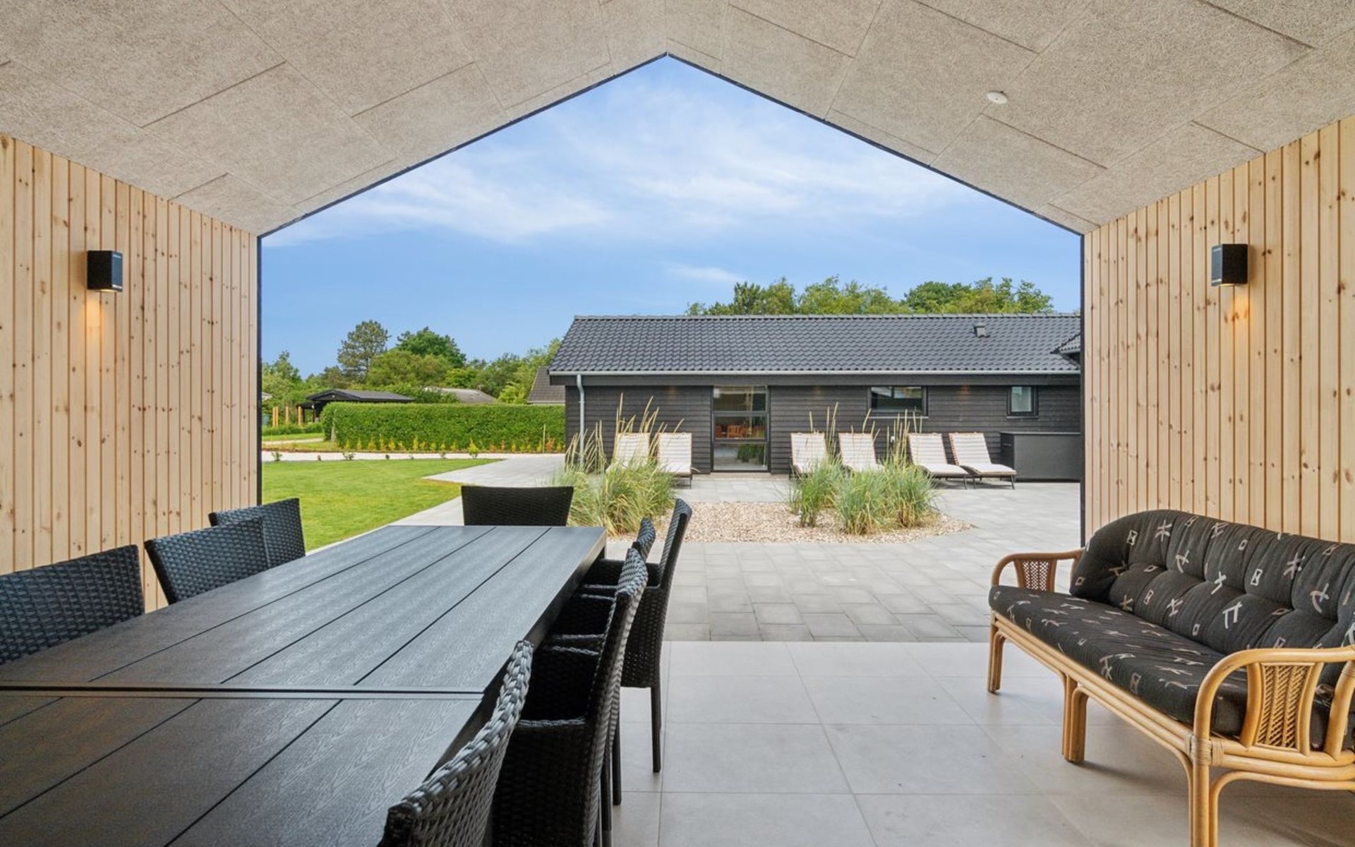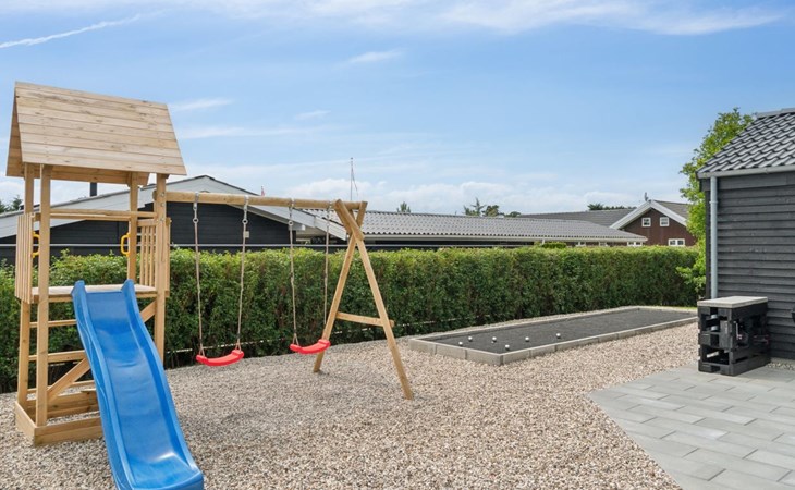 Single-family house, built in 2024. 600 m from the sea. Private: property 1'329 m2, well-kept garden, indoor pool (3 x 5 m, 15 m2, depth 145 - 145 cm). Outdoor shower, terrace (125 m2), barbecue, children's playground (slide, swing). In the house: table football, washing machine, tumble dryer. Parking at the house. E-charging station. Grocery 650 m. Golf course 12 km. The owner does not accept any youth groups.