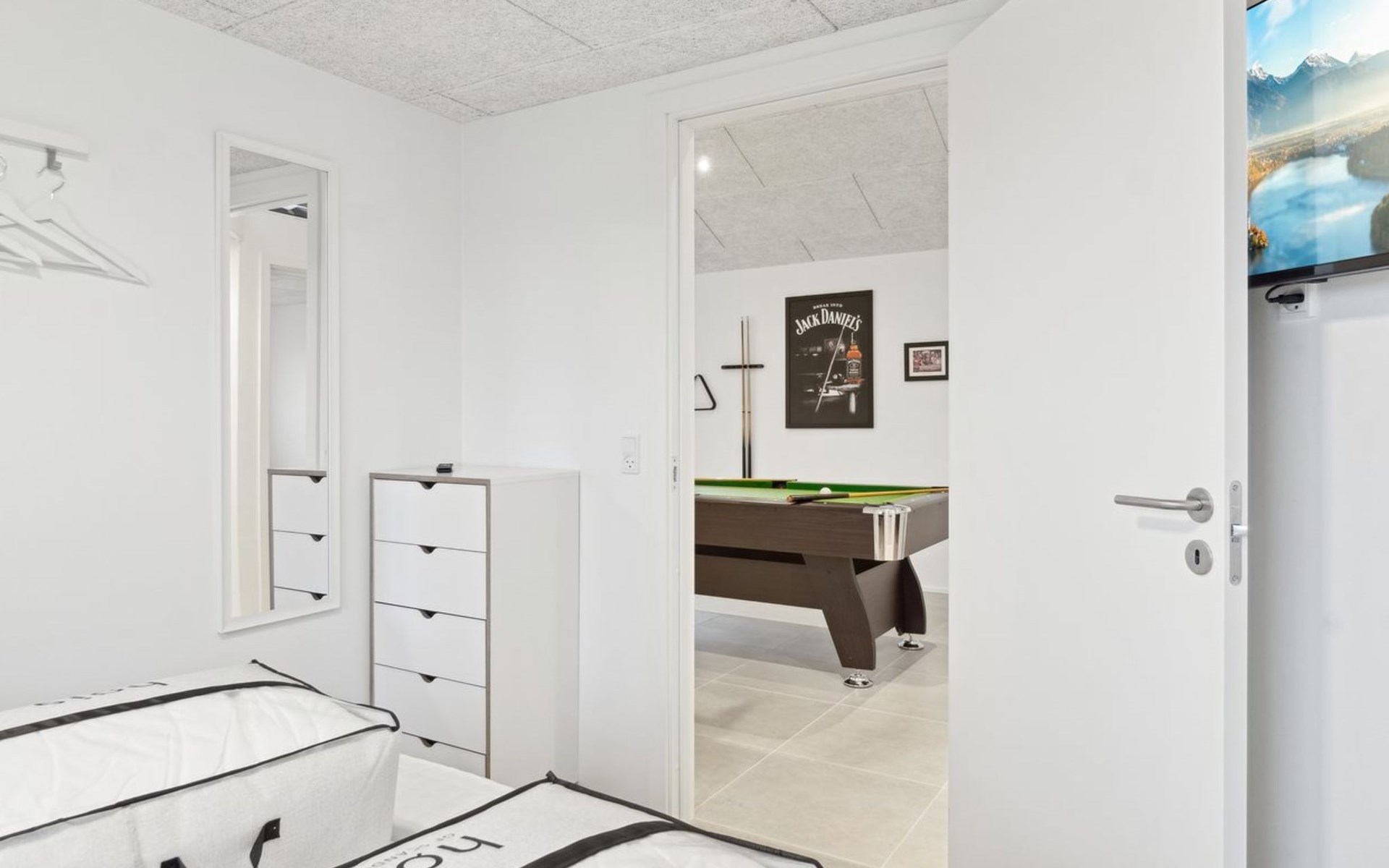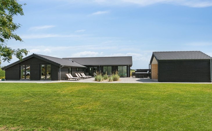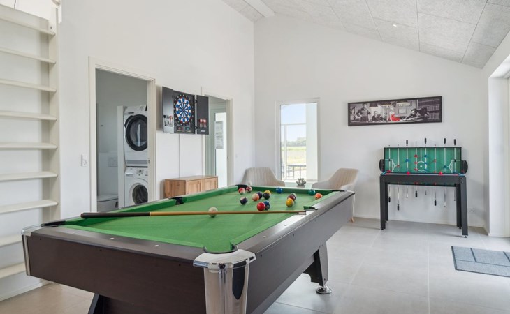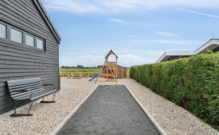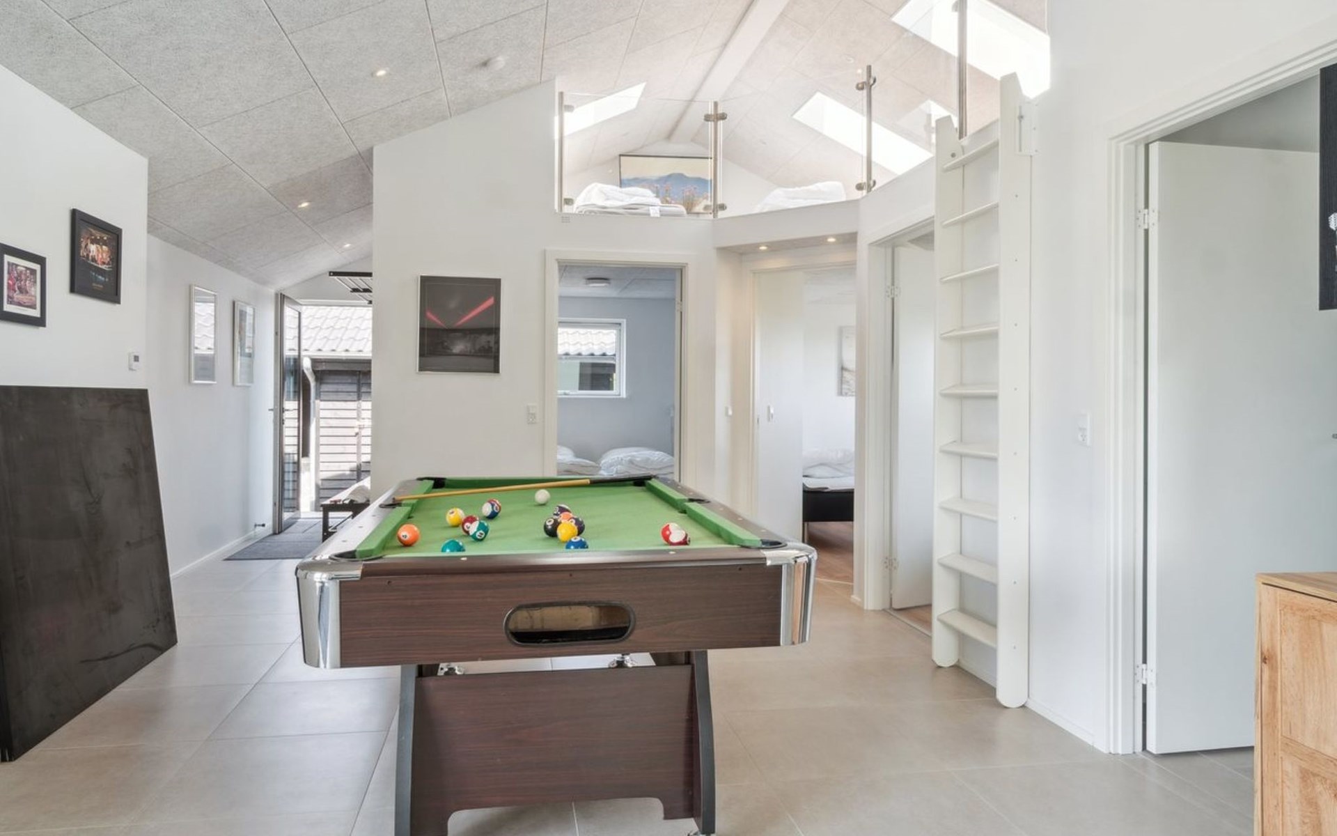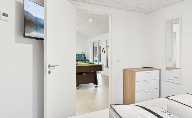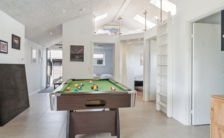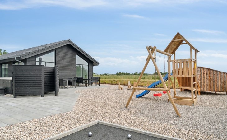 Single-family house, built in 2024. 600 m from the sea. Private: property 1'329 m2, well-kept garden, indoor pool (3 x 5 m, 15 m2, depth 145 - 145 cm). Outdoor shower, terrace (125 m2), barbecue, children's playground (slide, swing). In the house: table football, washing machine, tumble dryer. Parking at the house. E-charging station. Grocery 650 m. Golf course 12 km. The owner does not accept any youth groups.