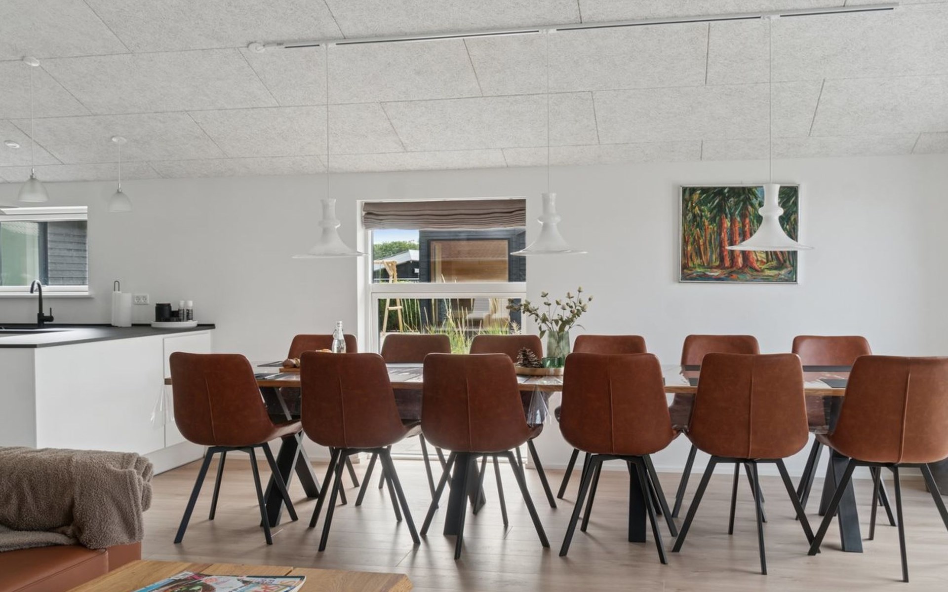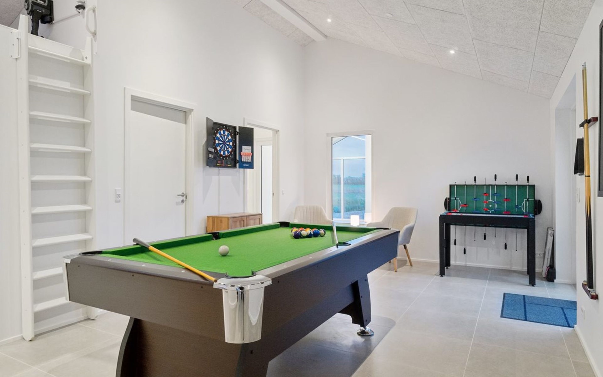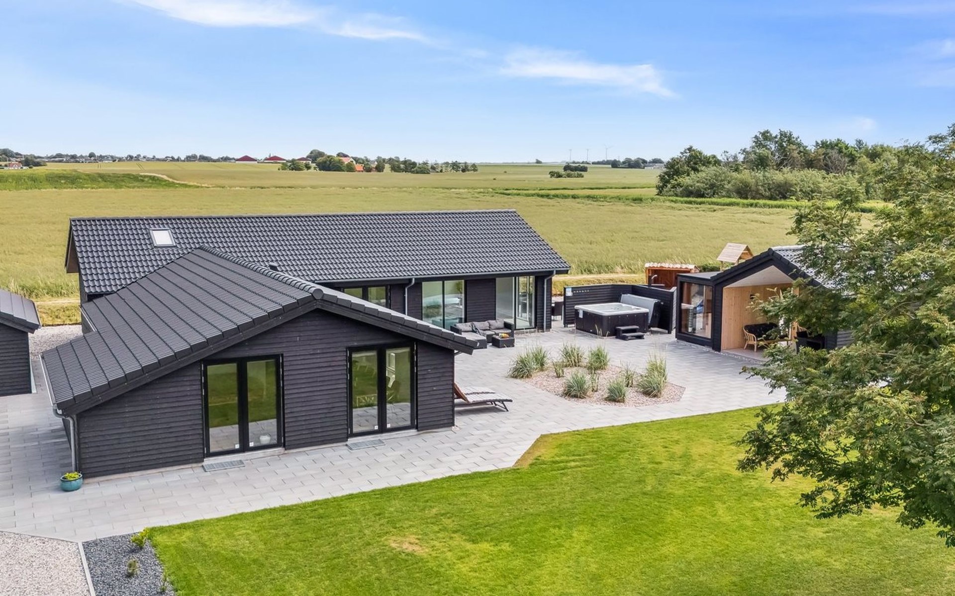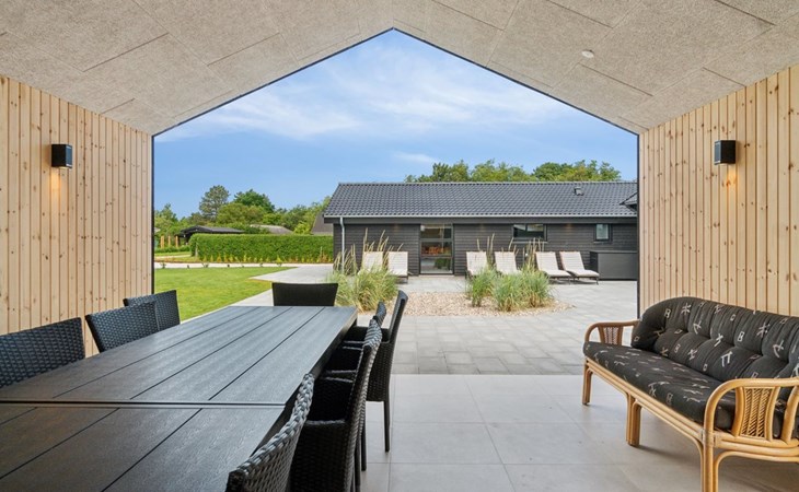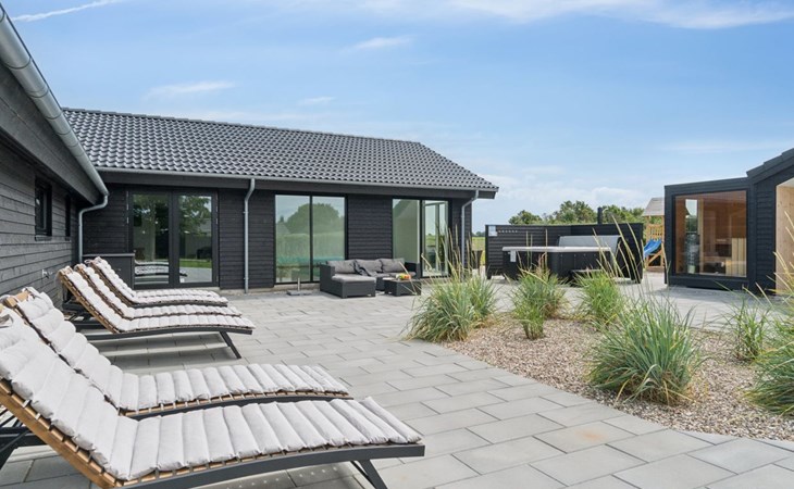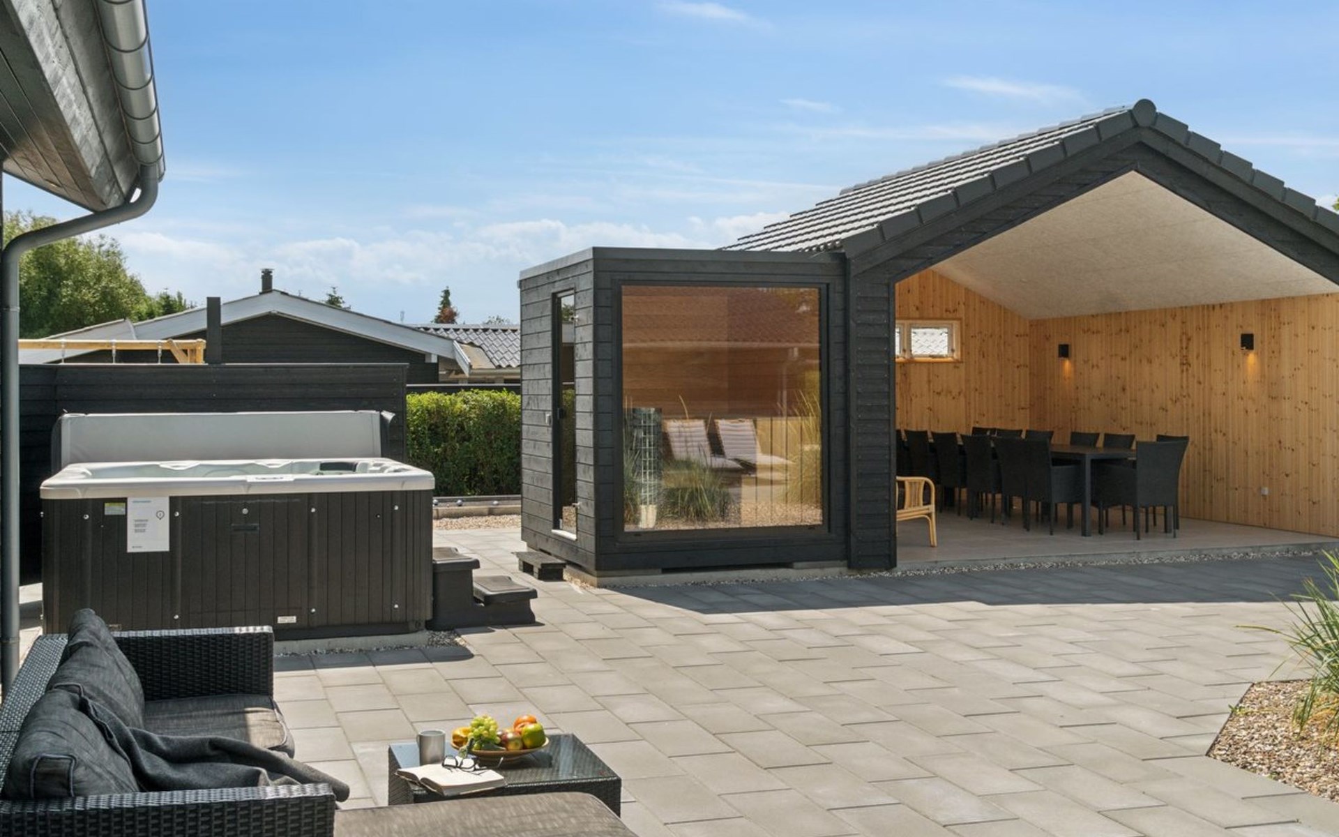 Single-family house, built in 2024. 600 m from the sea. Private: property 1'329 m2, well-kept garden, indoor pool (3 x 5 m, 15 m2, depth 145 - 145 cm). Outdoor shower, terrace (125 m2), barbecue, children's playground (slide, swing). In the house: table football, washing machine, tumble dryer. Parking at the house. E-charging station. Grocery 650 m. Golf course 12 km. The owner does not accept any youth groups.