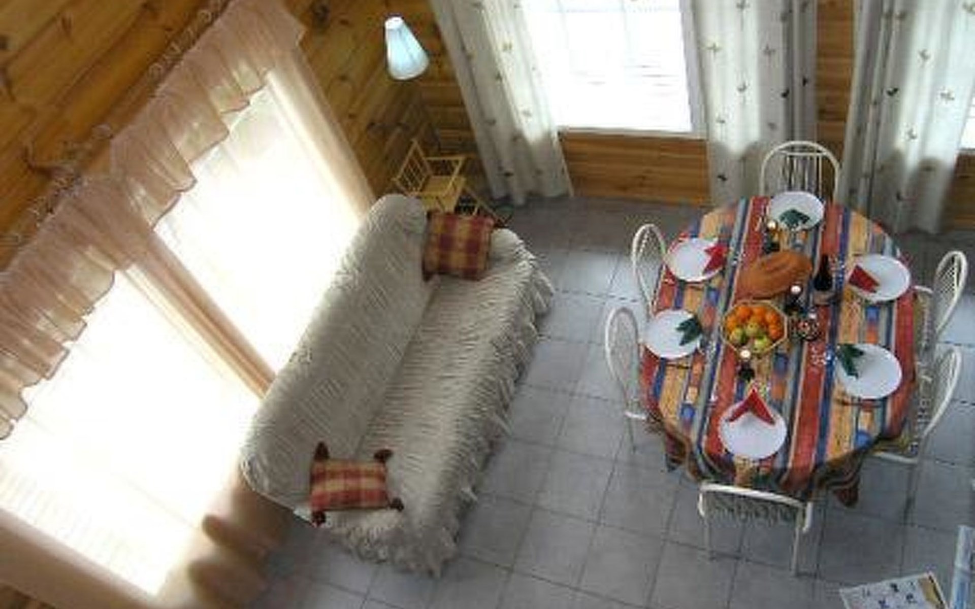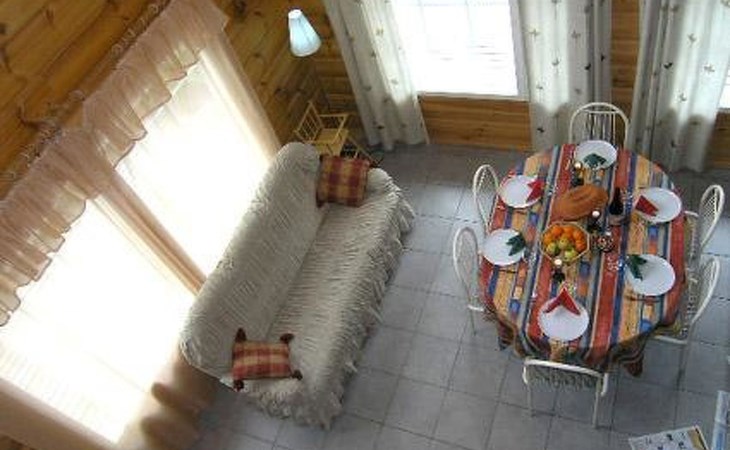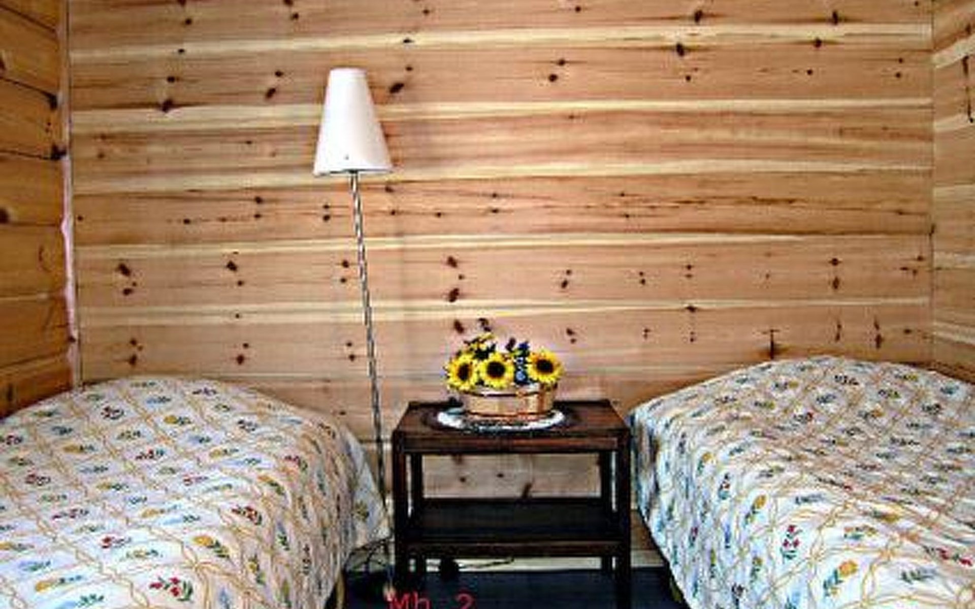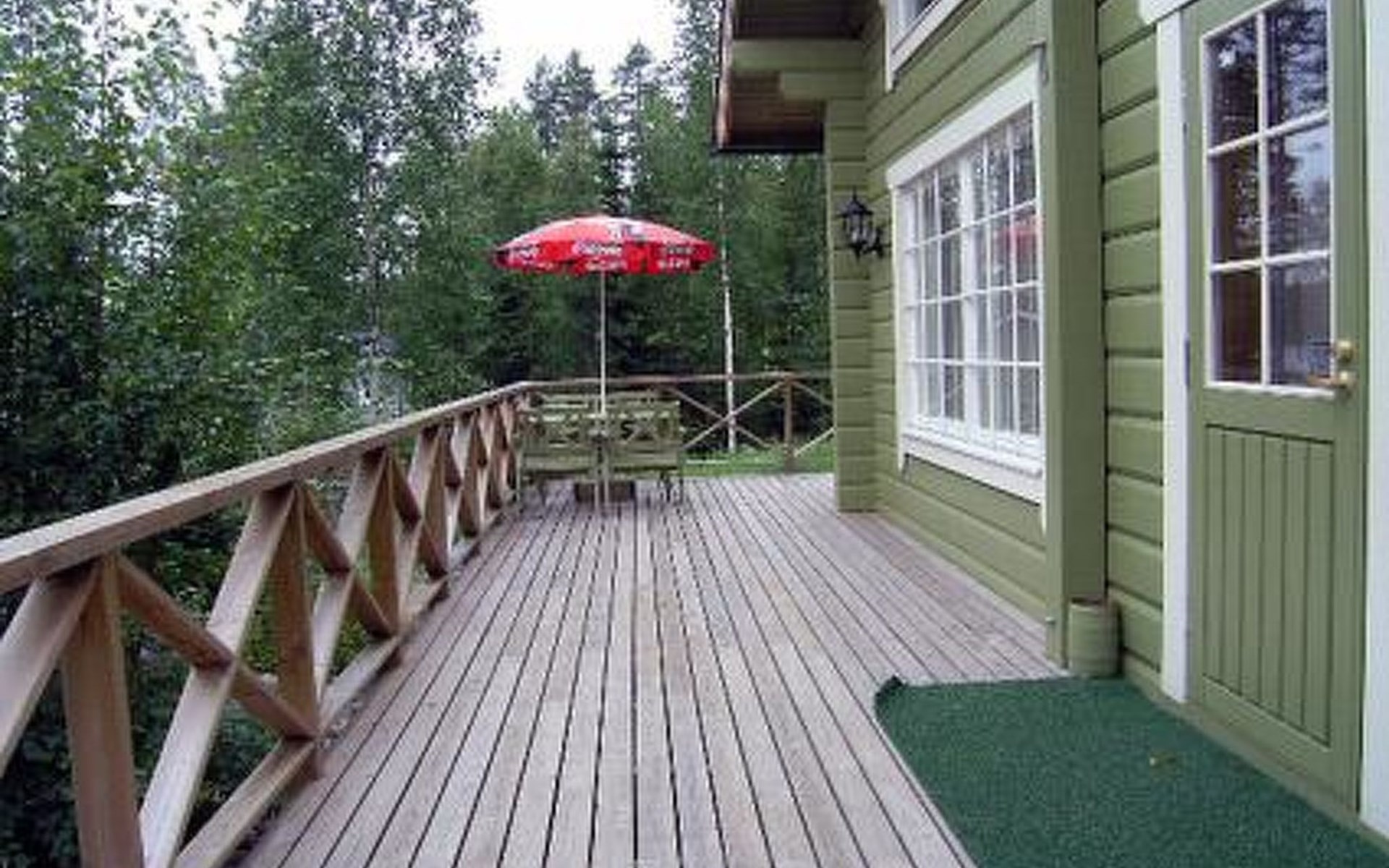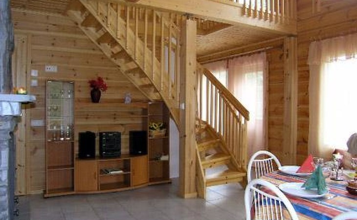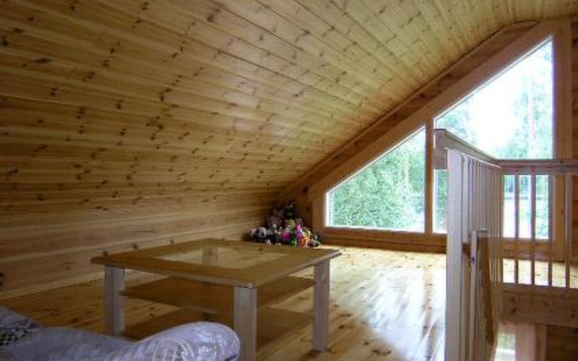 Laminated log house 2009, downstairs two bedrooms, 2 beds in each, living room extra bed for 2. Kitchen area, sauna, washroom, hall, large porch on two sides of house. Upstairs 2 bedrooms, 2 beds in each, separate WC and lounge with extra double bed.