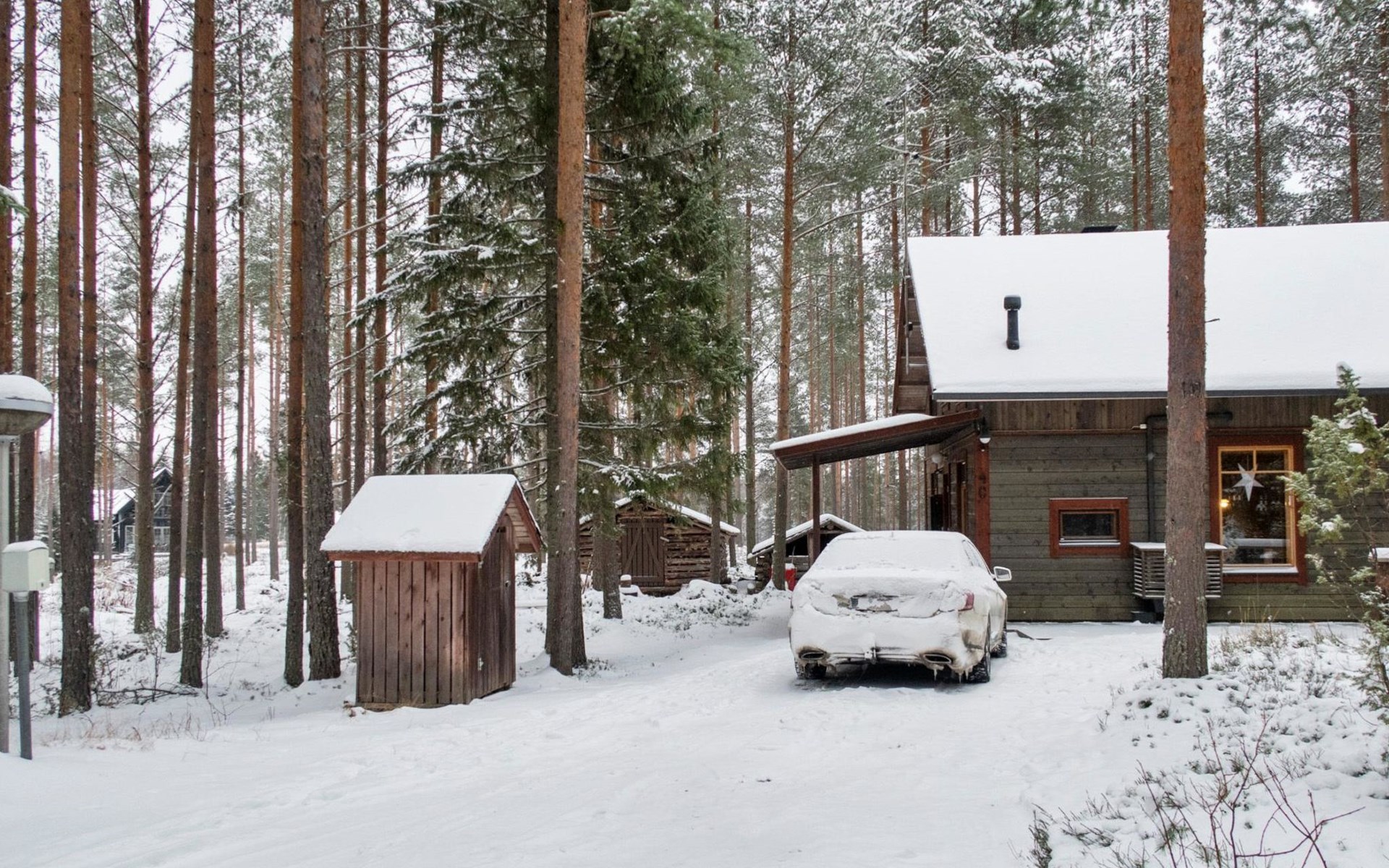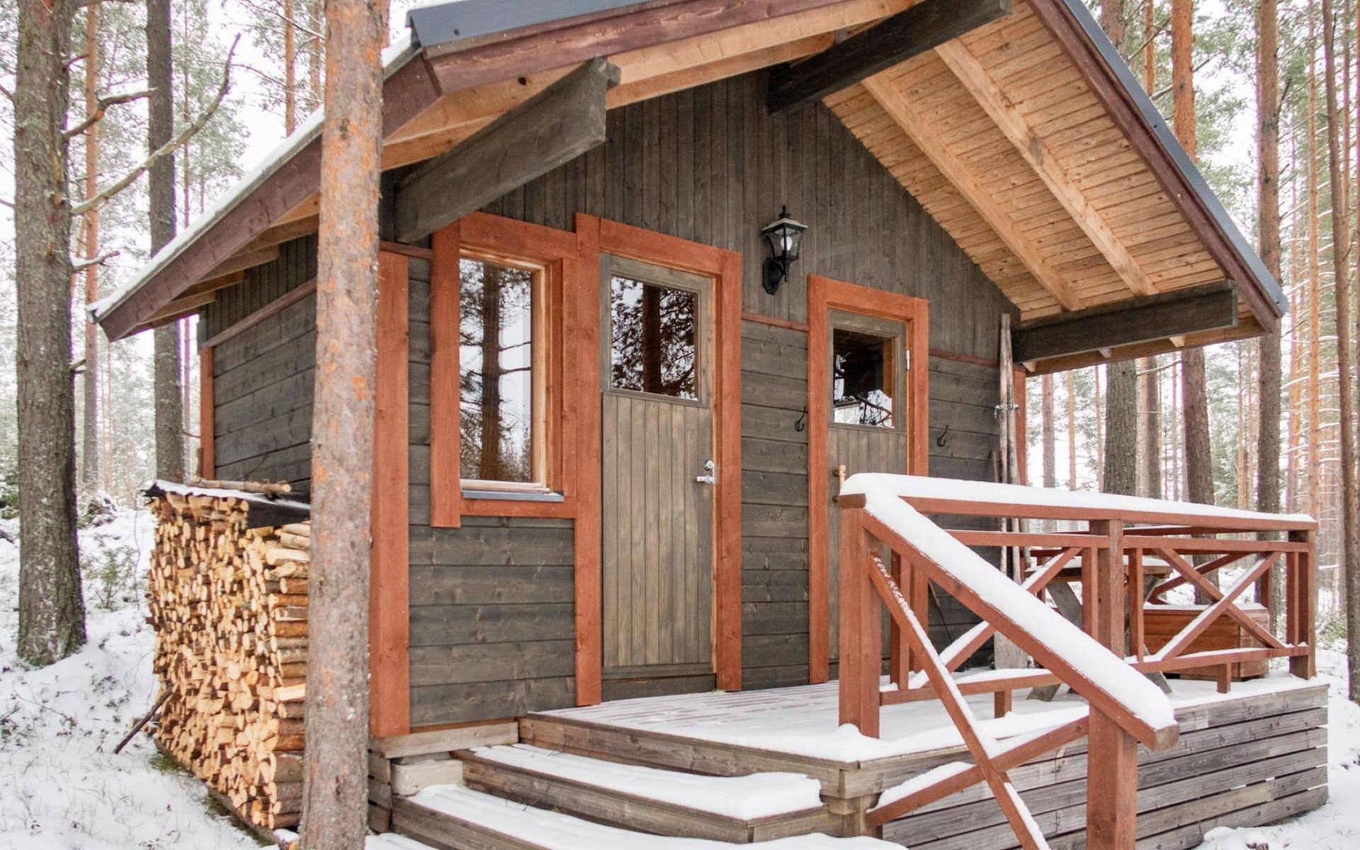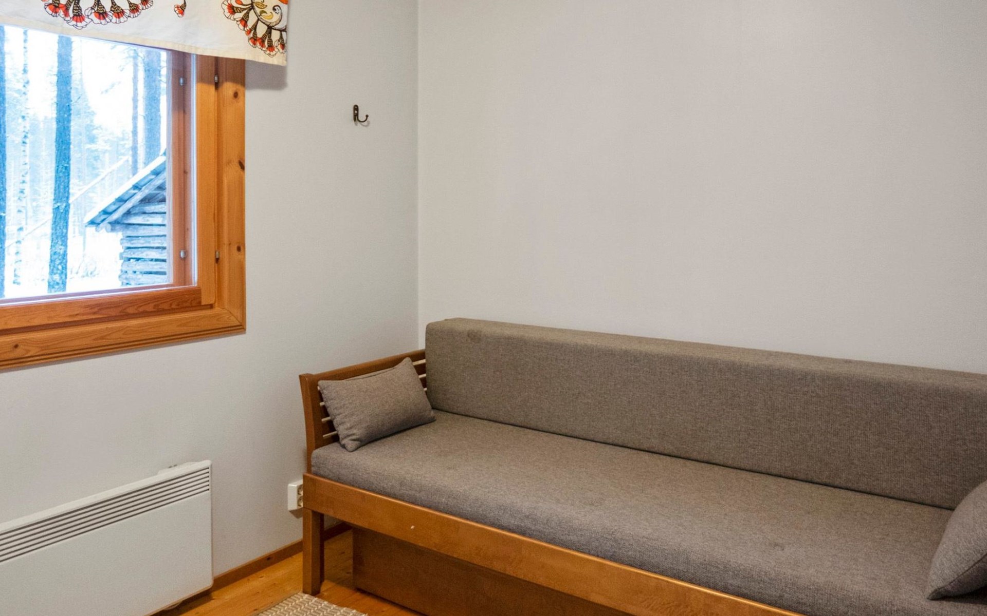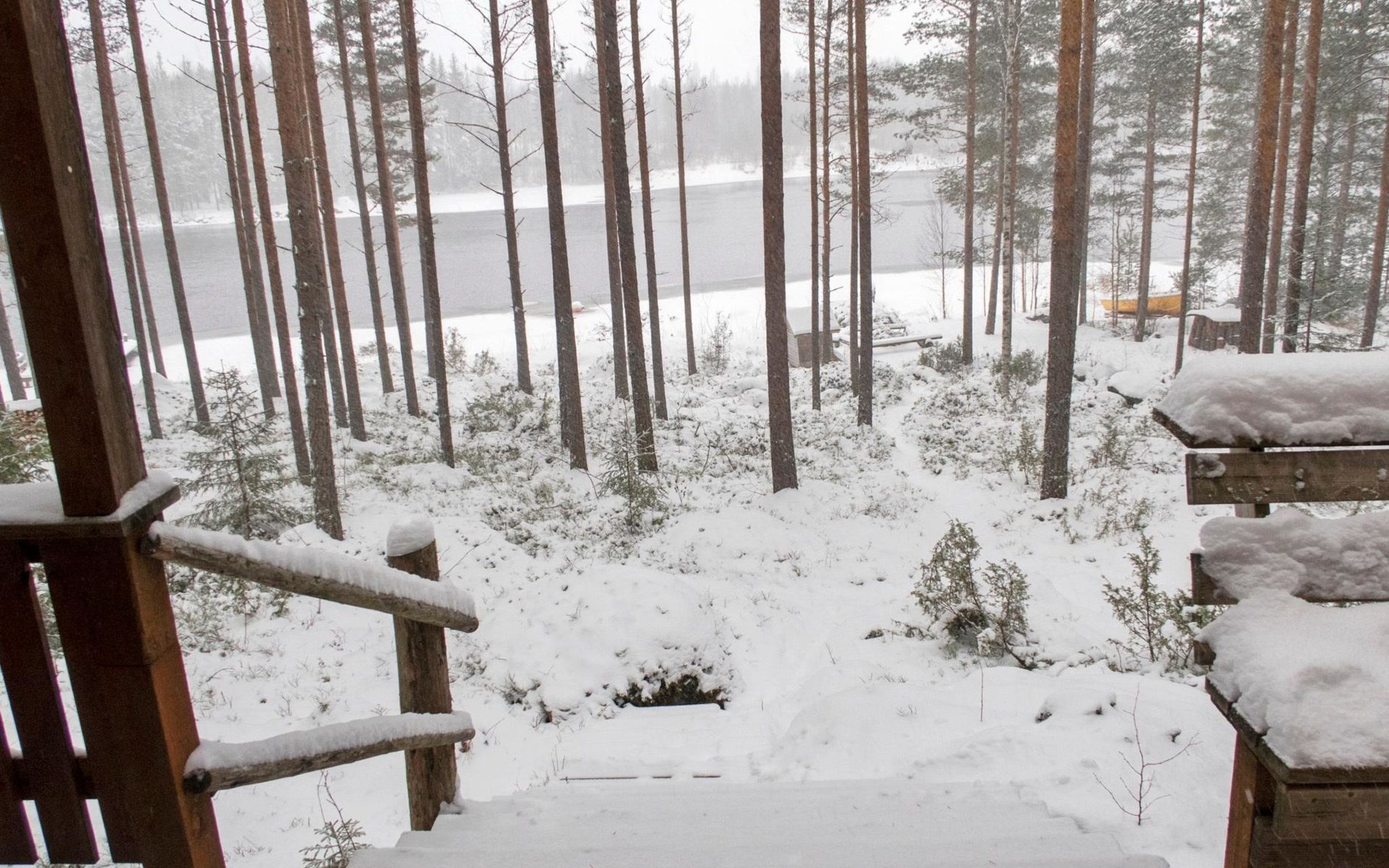 There is also a separate lakeside sauna with a wood-heated stove and cauldron. In connection with the sauna building, a small living area /dressing room. Sauna has electricity. Water to the sauna must be brought by using a bucket; in summer from the river, in winter from the cabin. Access to the sauna along a narrow path, no winter maintenance.