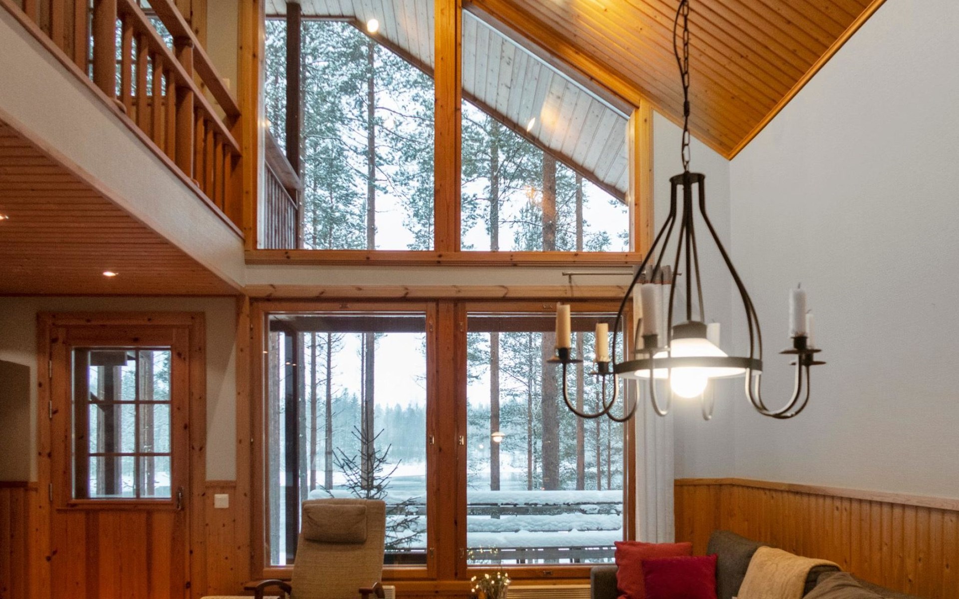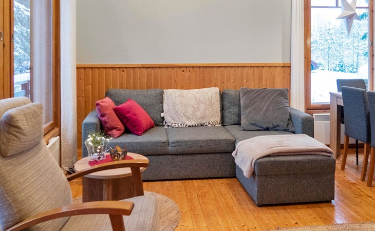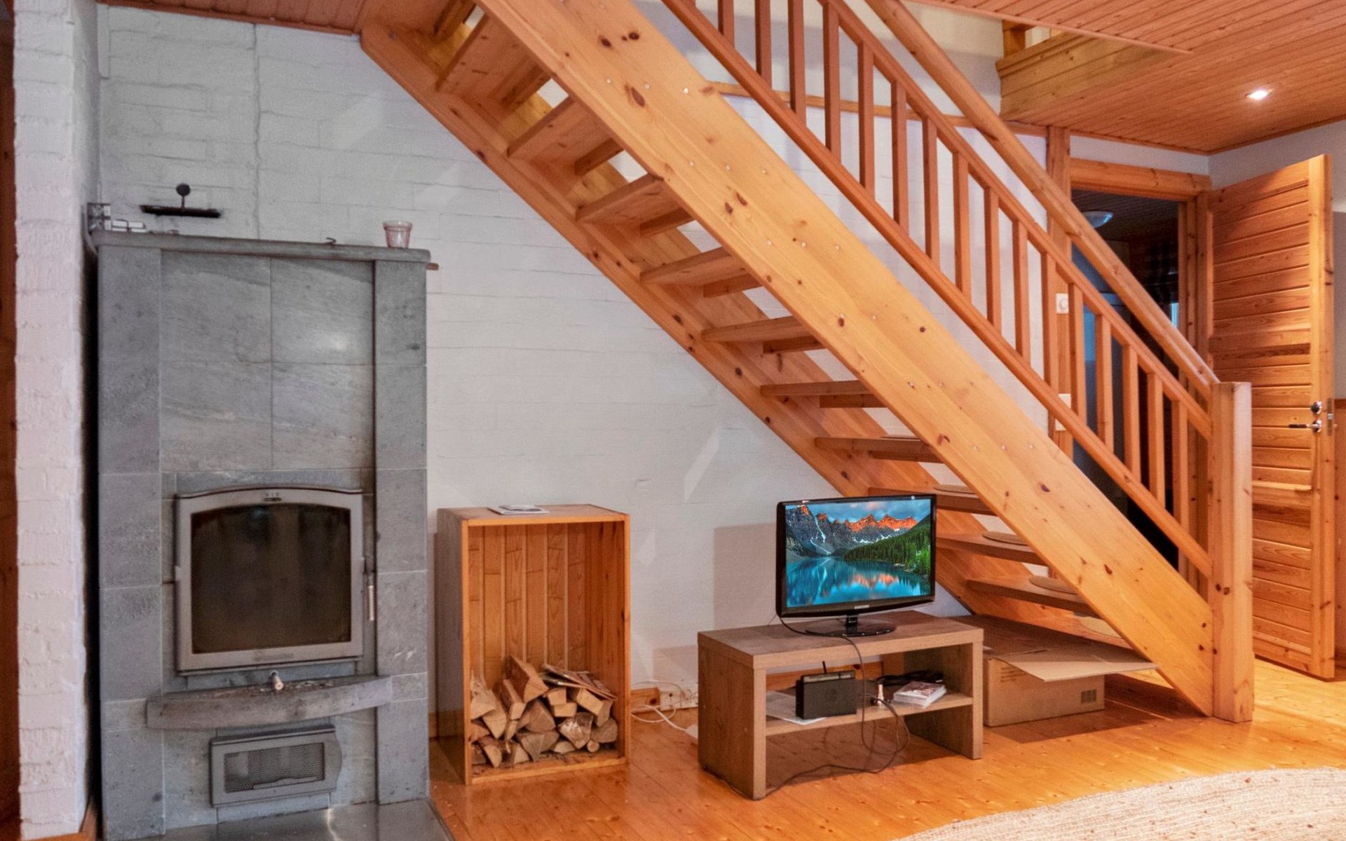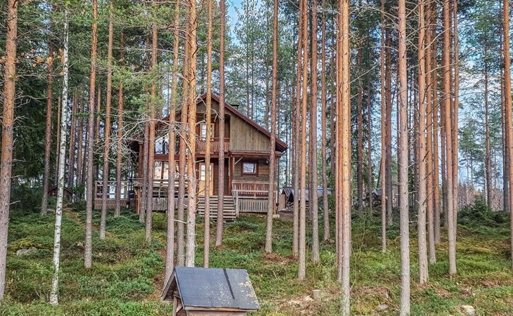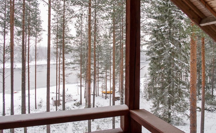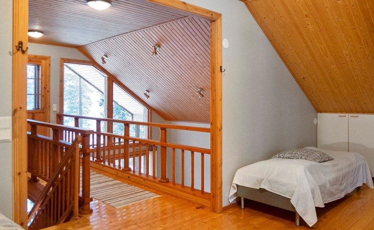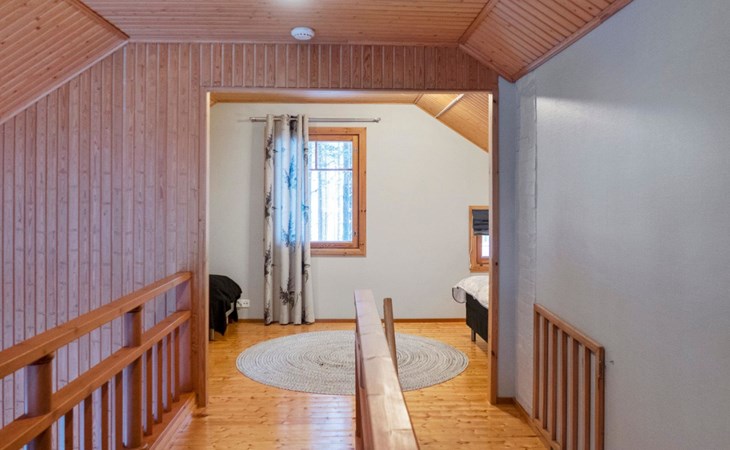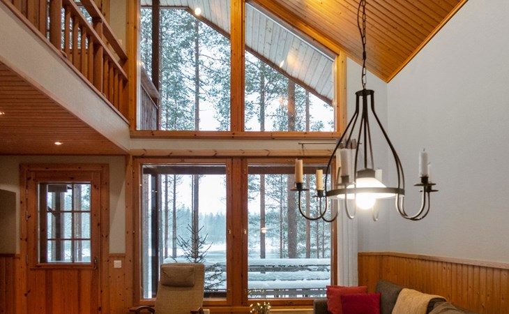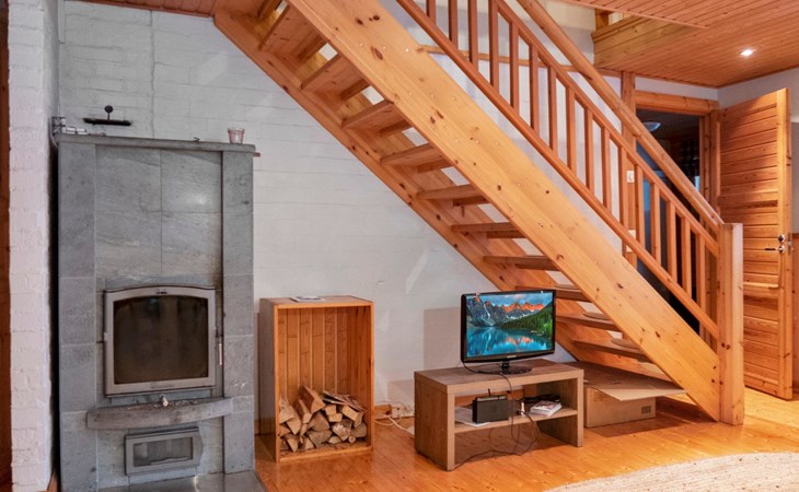 The cabin has 2 floors, total area is 74 m². On the ground floor, a bright living room/kitchen with high windows facing the river, heat reserving fireplace, a small bedroom with a sofa bed for 1-2, sauna (wood-burning stove), shower/WC, from the utility room access to covered terrace, gas grill/furniture in the summer.