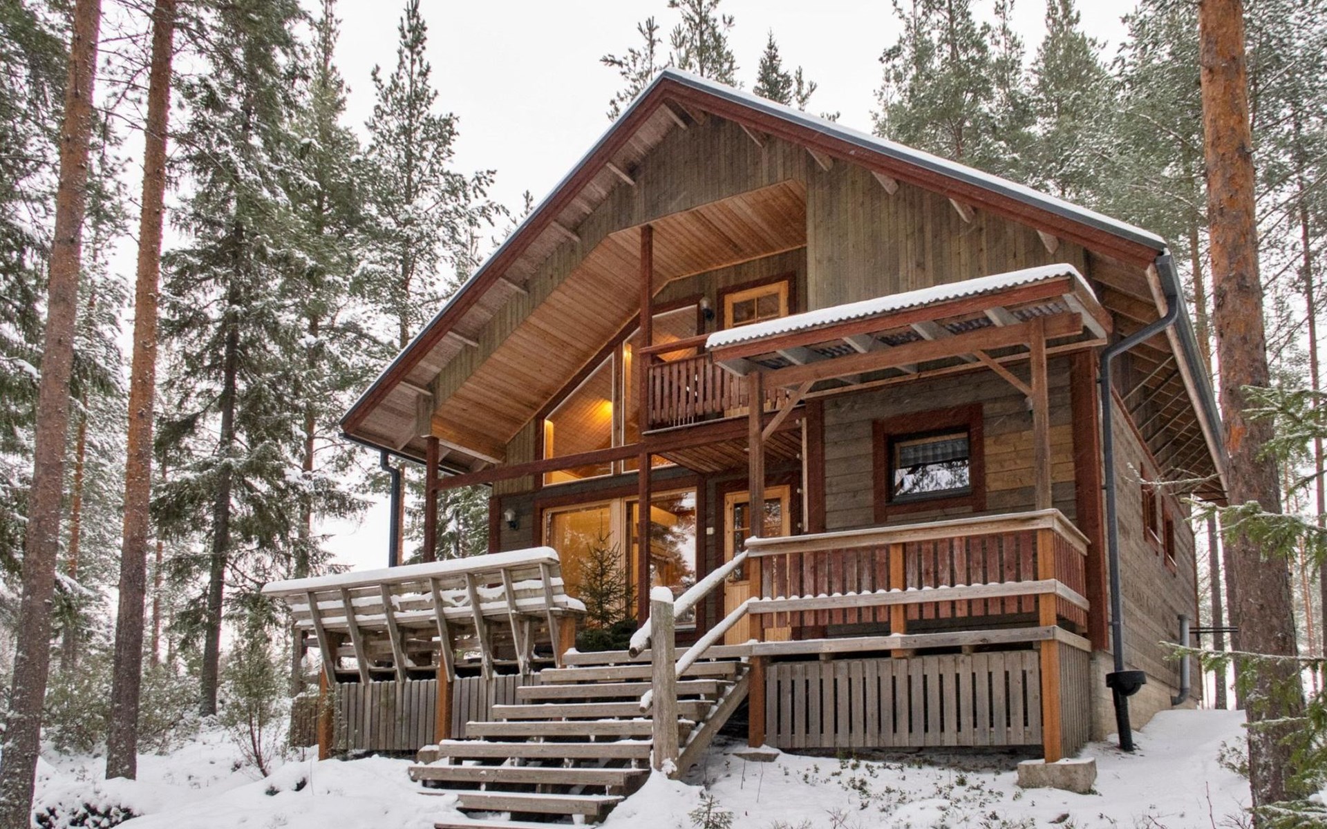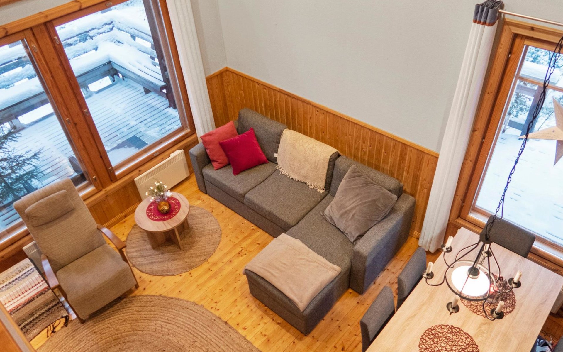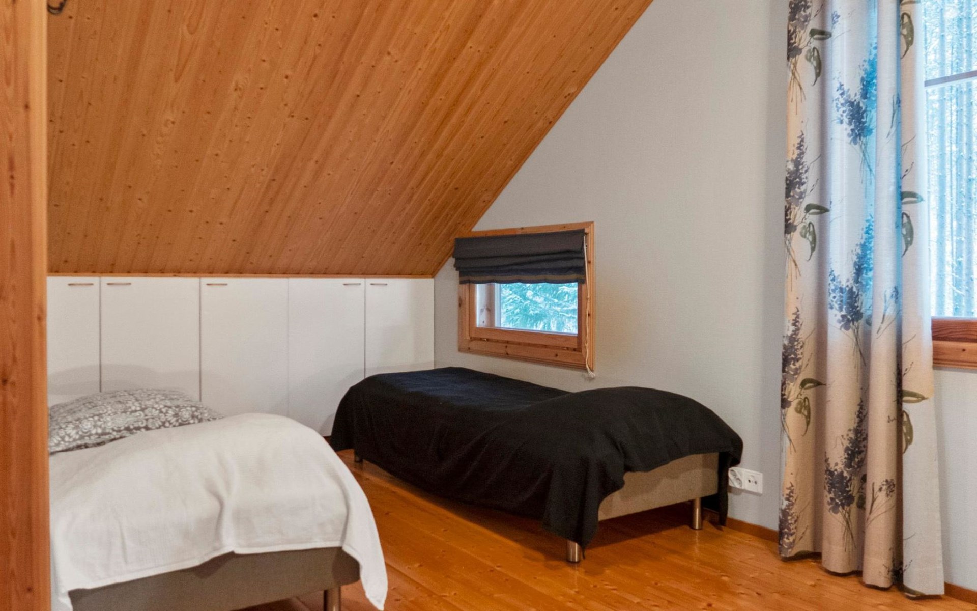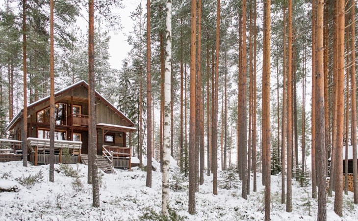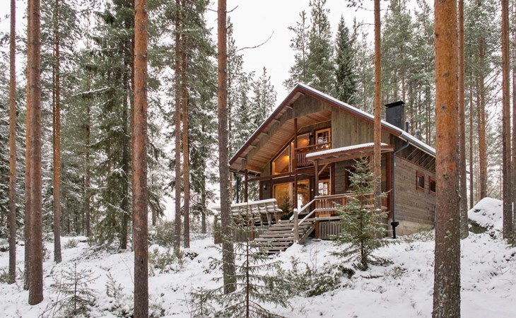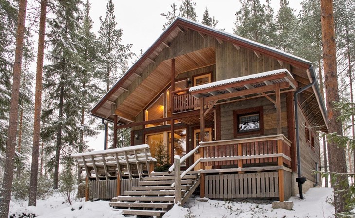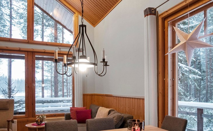 The cabin has 2 floors, total area is 74 m². On the ground floor, a bright living room/kitchen with high windows facing the river, heat reserving fireplace, a small bedroom with a sofa bed for 1-2, sauna (wood-burning stove), shower/WC, from the utility room access to covered terrace, gas grill/furniture in the summer.