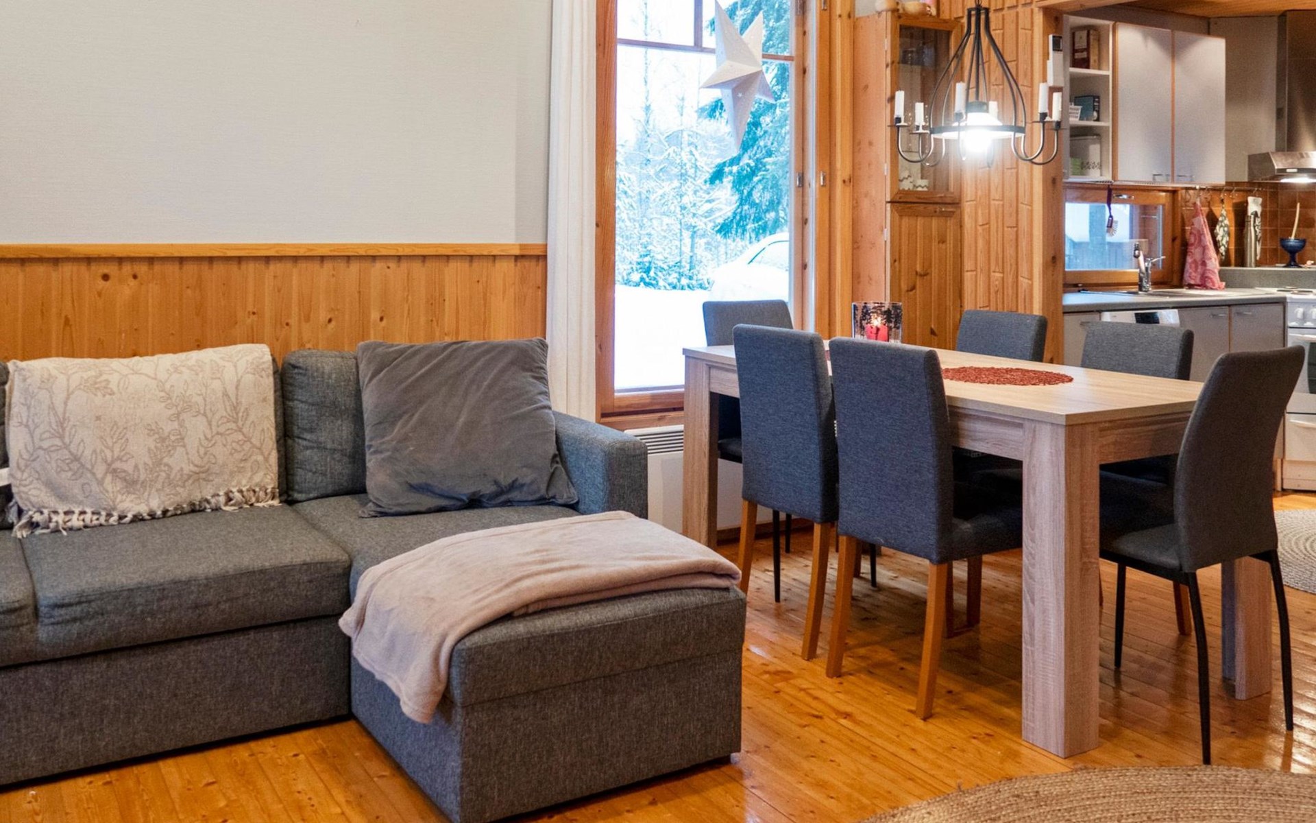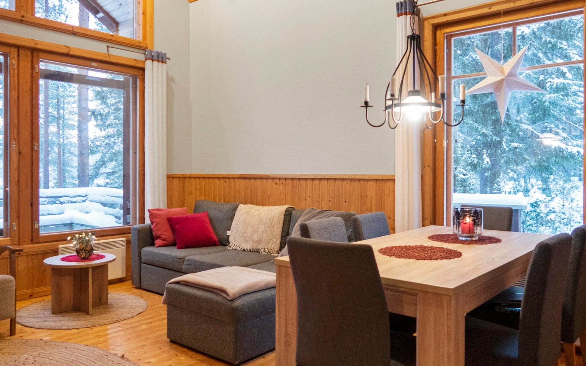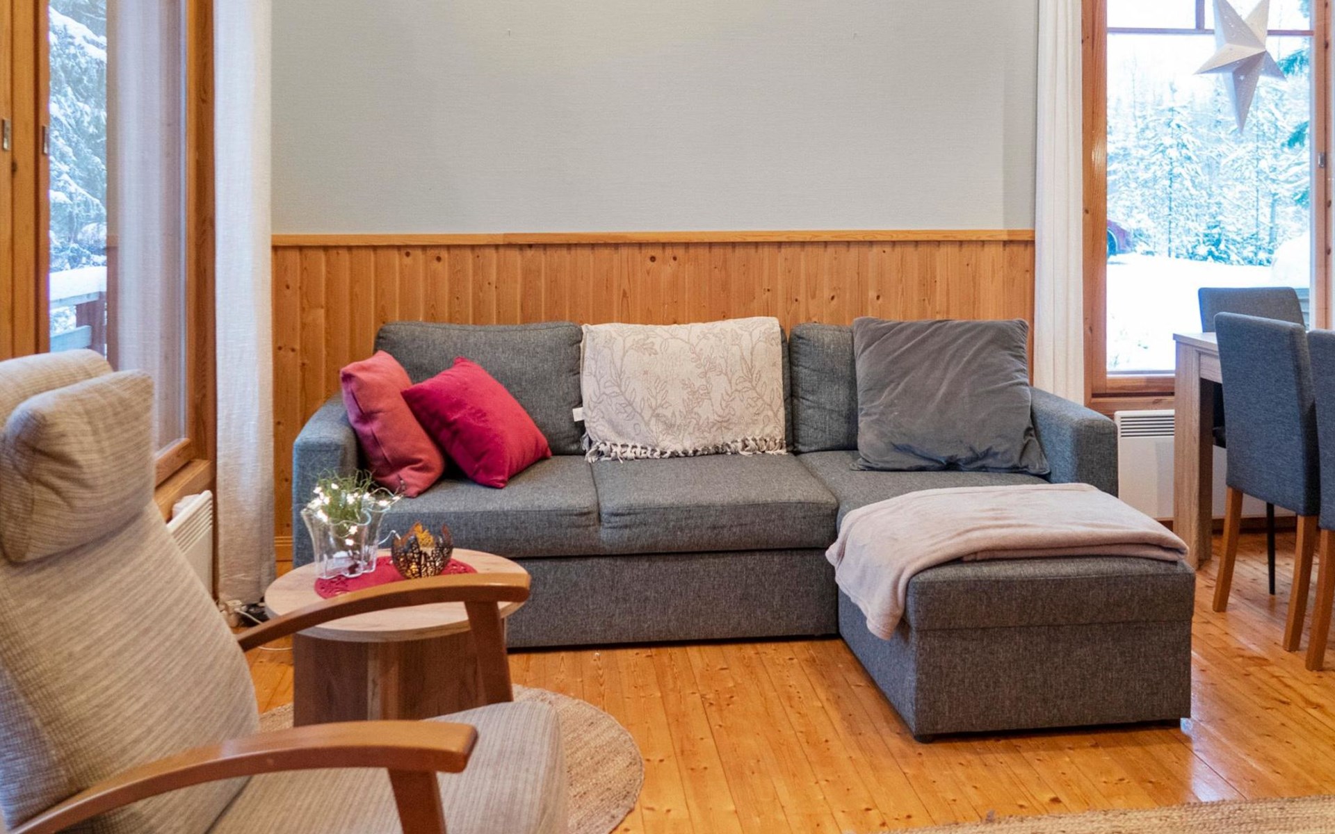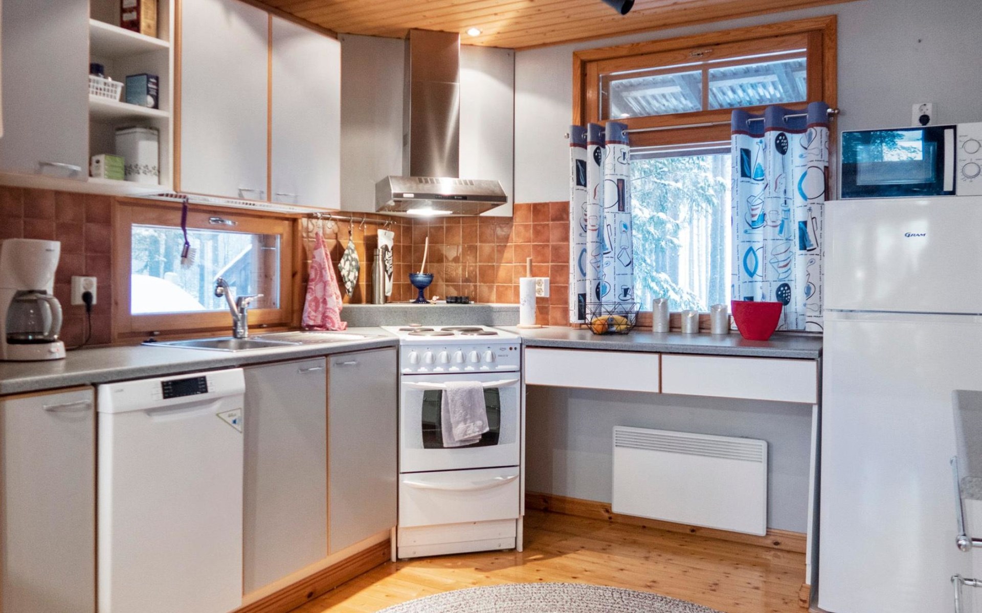 The cabin has 2 floors, total area is 74 m². On the ground floor, a bright living room/kitchen with high windows facing the river, heat reserving fireplace, a small bedroom with a sofa bed for 1-2, sauna (wood-burning stove), shower/WC, from the utility room access to covered terrace, gas grill/furniture in the summer.